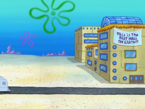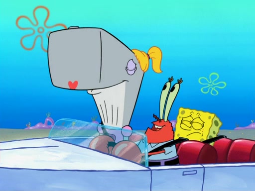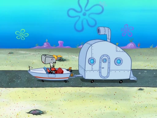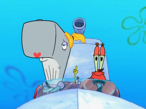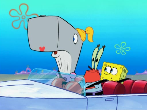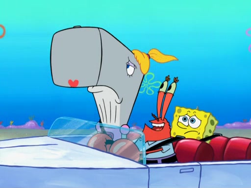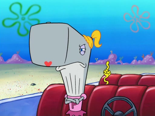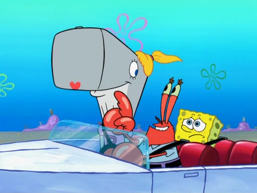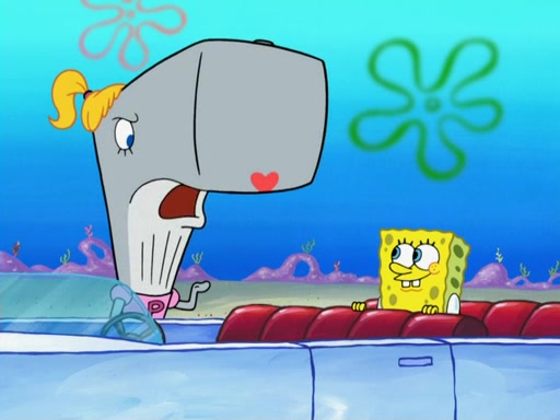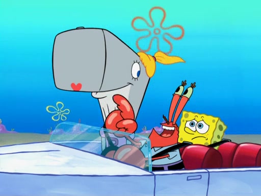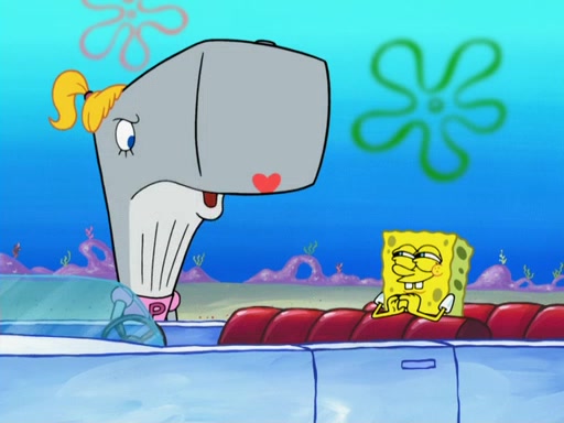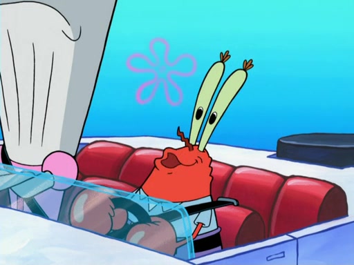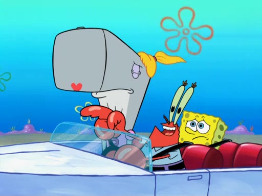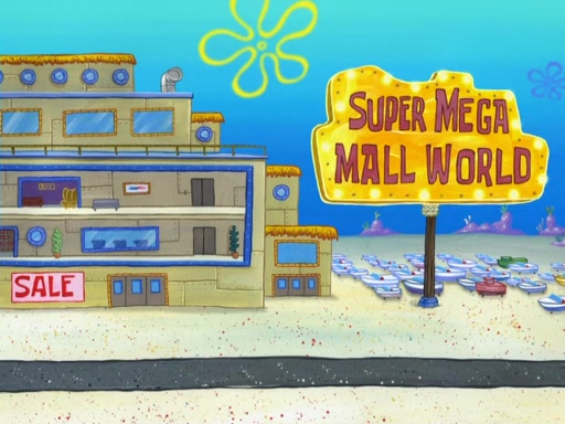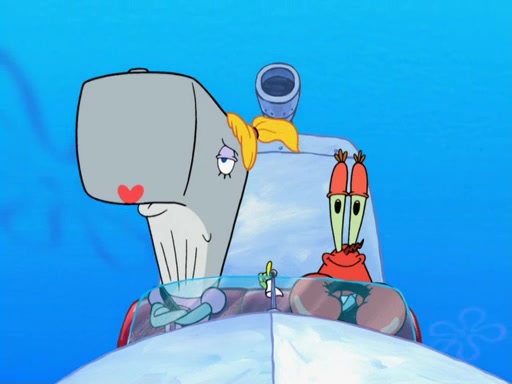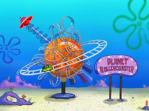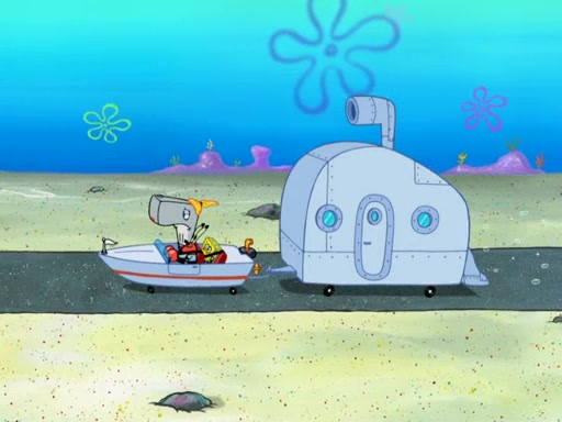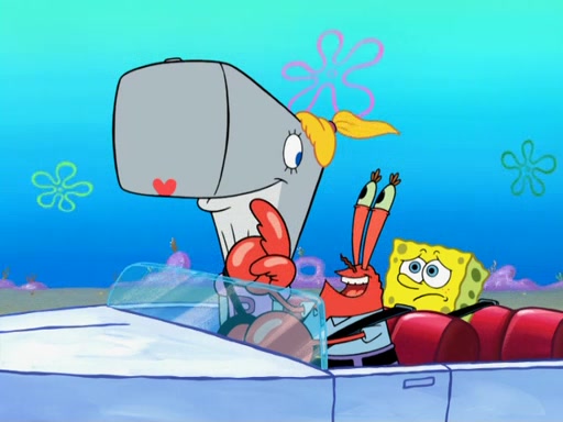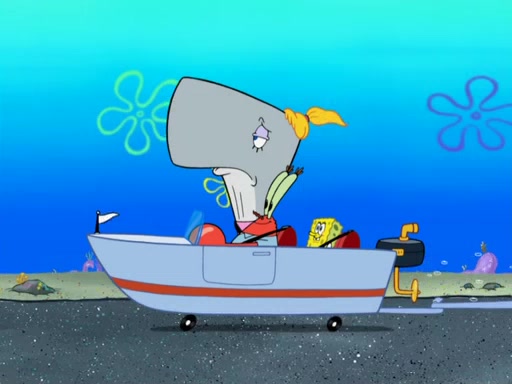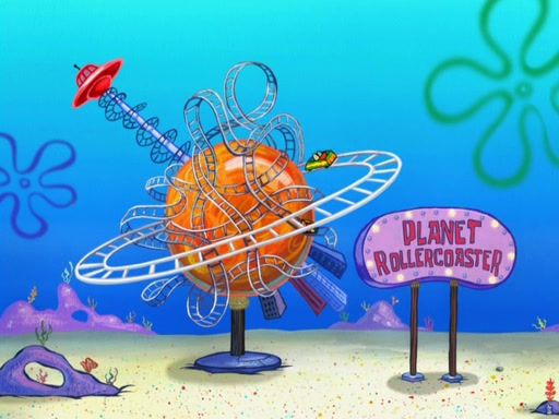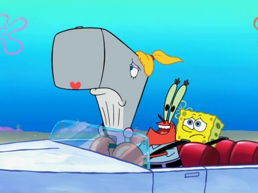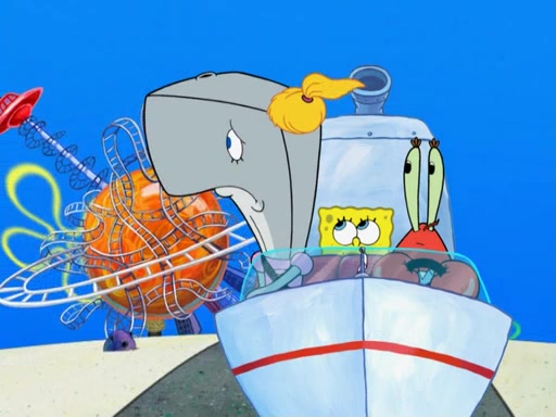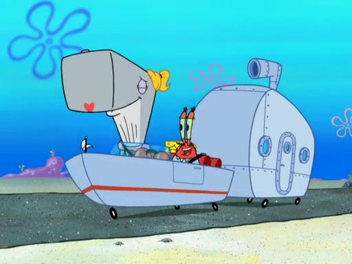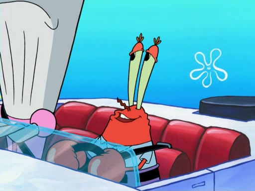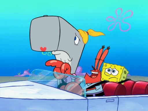 Cuts to flashback, Squidward is about to give out change to a customer but suddenly, Mr. Krabs calls all his employees into his office. In his office, Mr. Krabs says that he will take either Squidward or SpongeBob with him and Pearl on a roadtrip, but then Squidward gets up and leaves (glad that he's closing it down), leaving Mr. Krabs to choose SpongeBob for the trip. Pearl isn't happy, throwing a suitcase on to SpongeBob, telling him not to get up until they leave town. After they leave, SpongeBob asks if he can get up and Pearl says "sure." They pass Super Mega Mall World and Pearl thinks that they are going there, but Mr. Krabs promises where they are going is way better. They then pass Planet Rollercoaster and once again, Pearl thinks that they are going there and Mr. Krabs says where they are going is a hundred times better.
