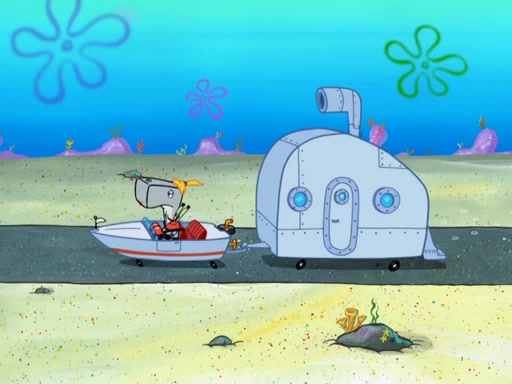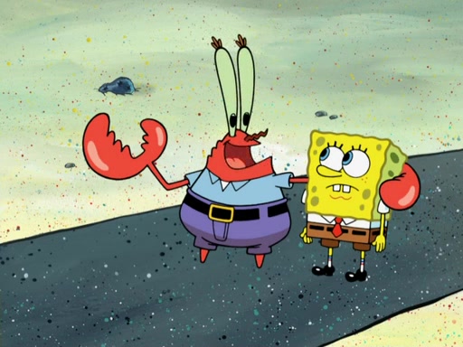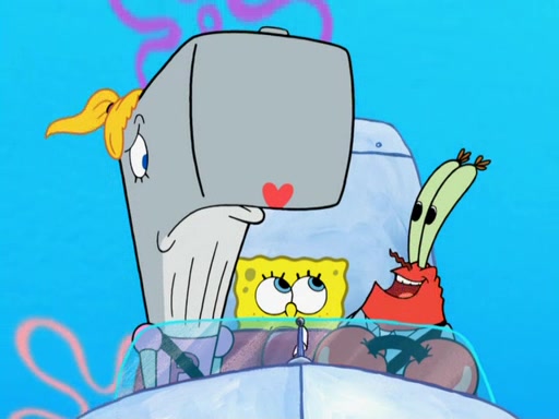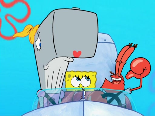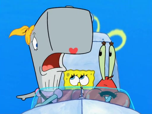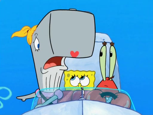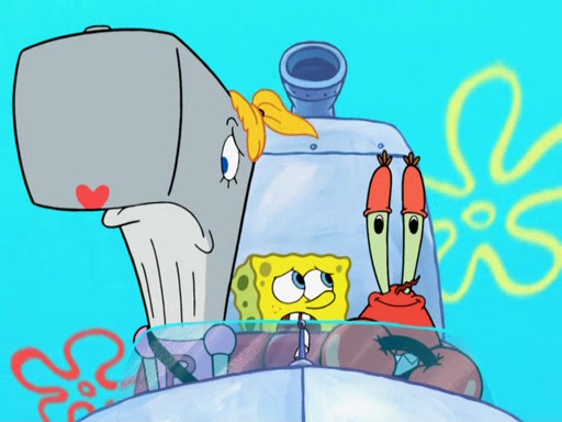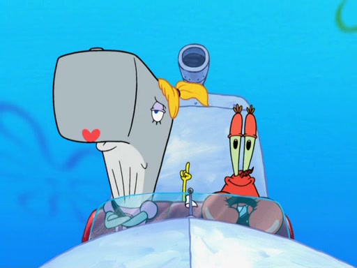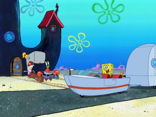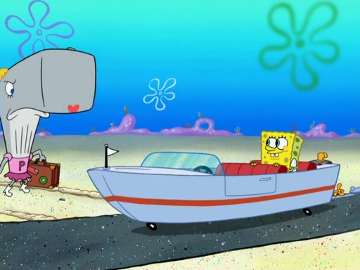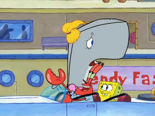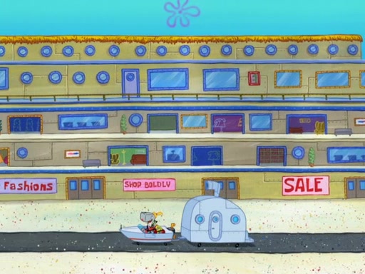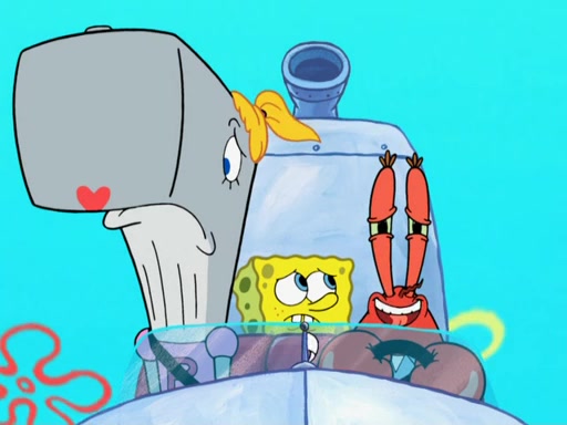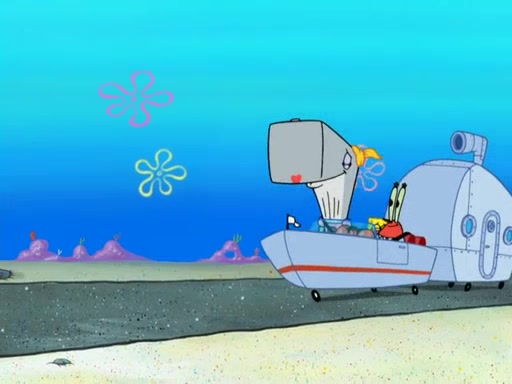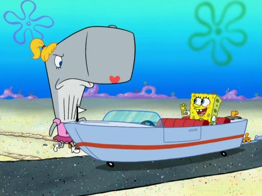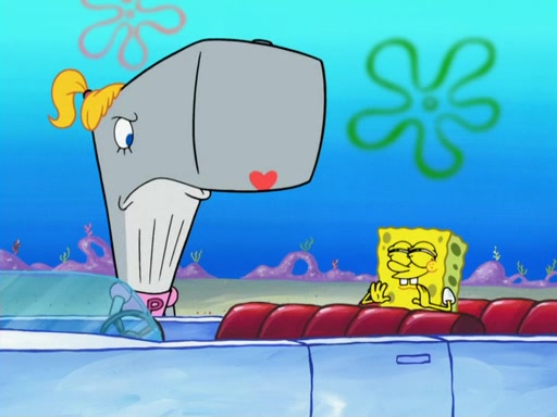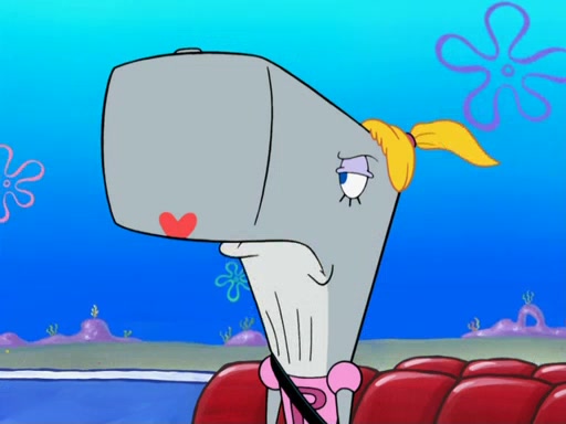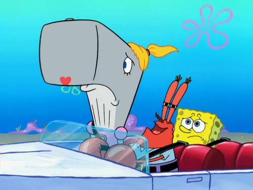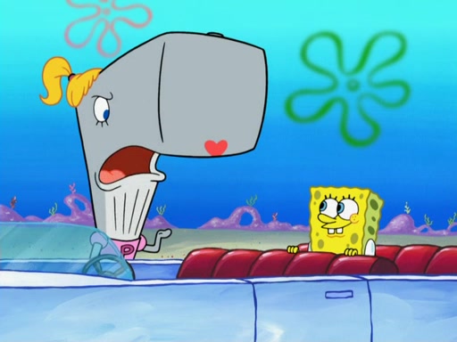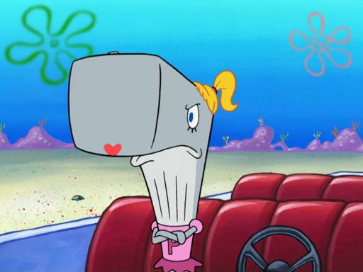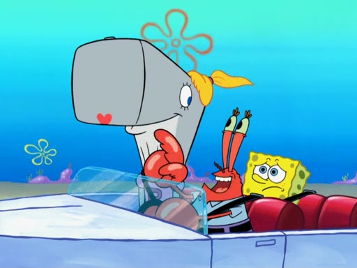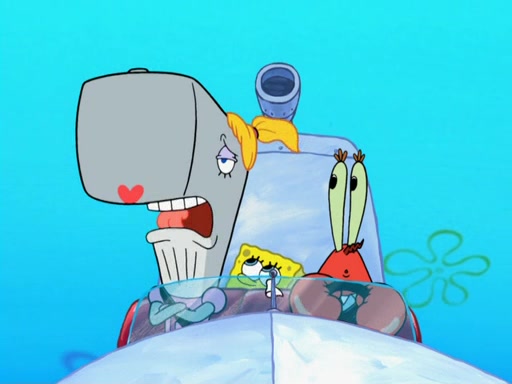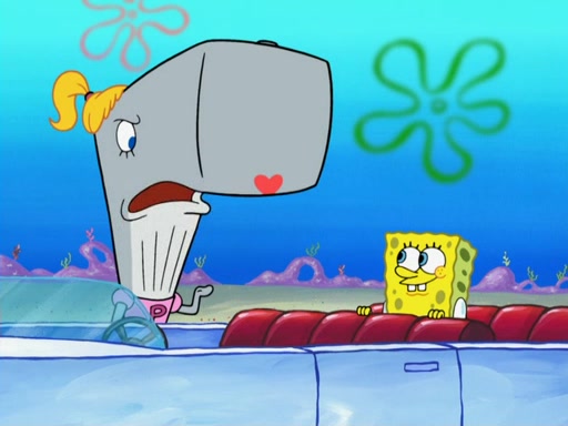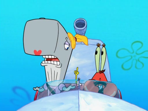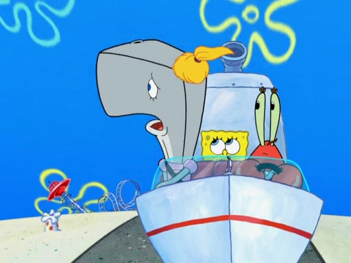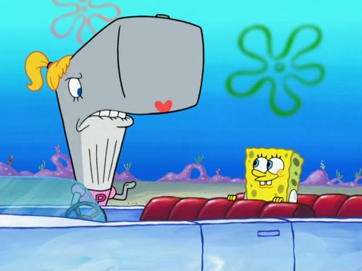 Cuts to flashback, Squidward is about to give out change to a customer but suddenly, Mr. Krabs calls all his employees into his office. In his office, Mr. Krabs says that he will take either Squidward or SpongeBob with him and Pearl on a roadtrip, but then Squidward gets up and leaves (glad that he's closing it down), leaving Mr. Krabs to choose SpongeBob for the trip. Pearl isn't happy, throwing a suitcase on to SpongeBob, telling him not to get up until they leave town. After they leave, SpongeBob asks if he can get up and Pearl says "sure." They pass Super Mega Mall World and Pearl thinks that they are going there, but Mr. Krabs promises where they are going is way better. They then pass Planet Rollercoaster and once again, Pearl thinks that they are going there and Mr. Krabs says where they are going is a hundred times better.