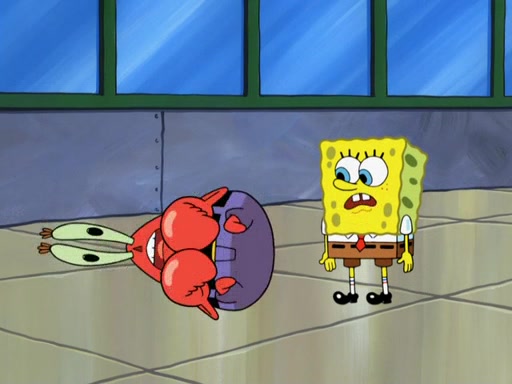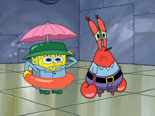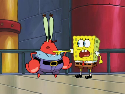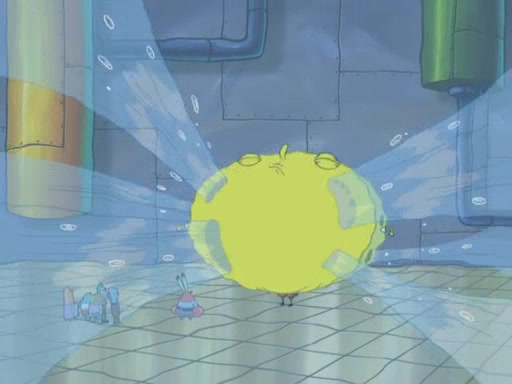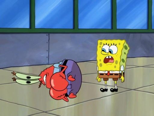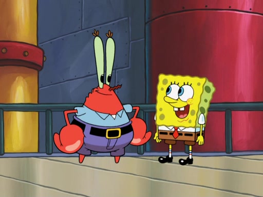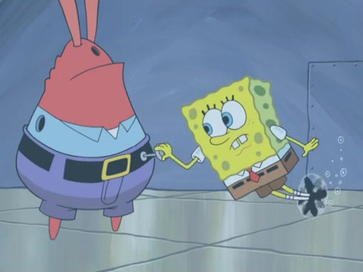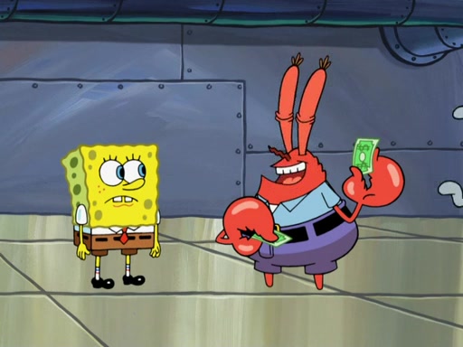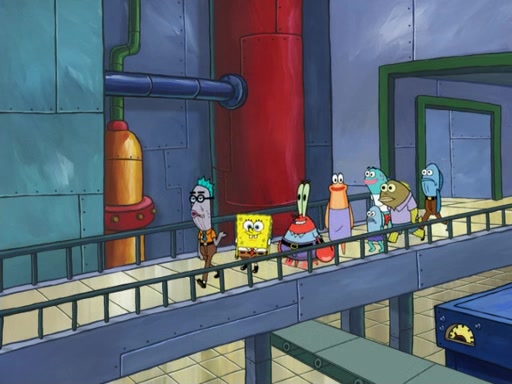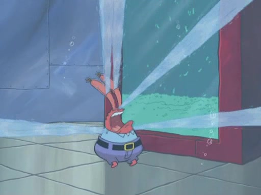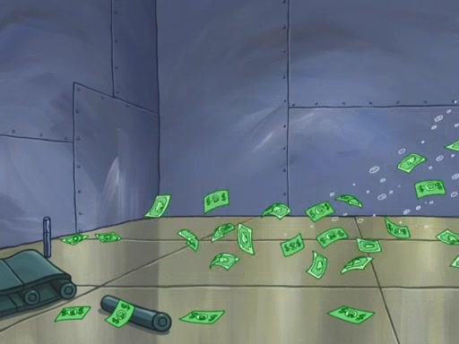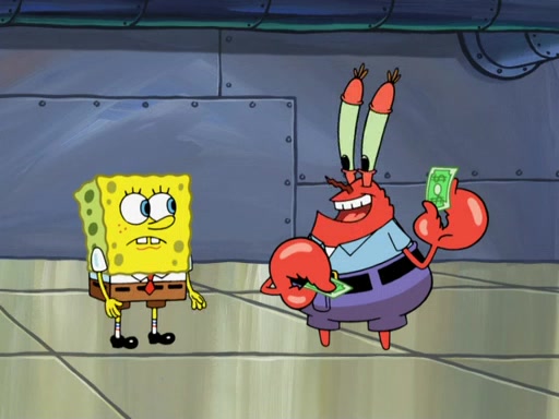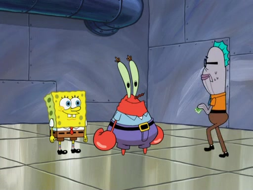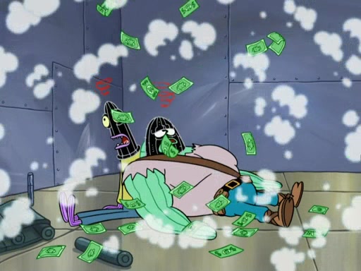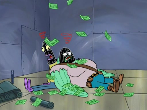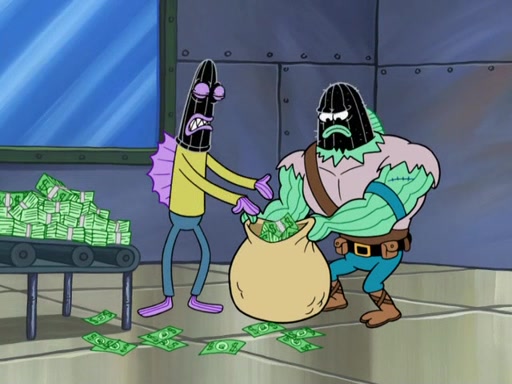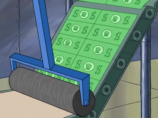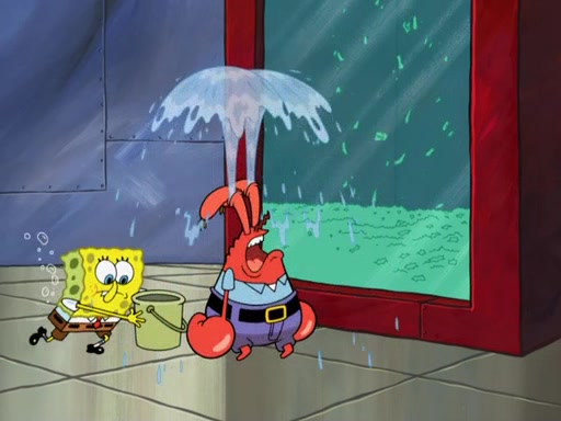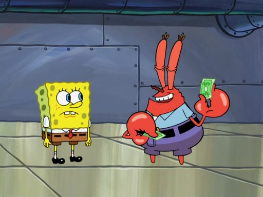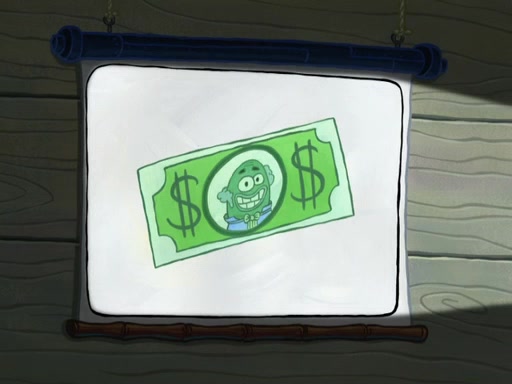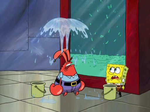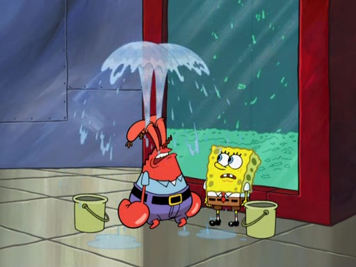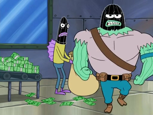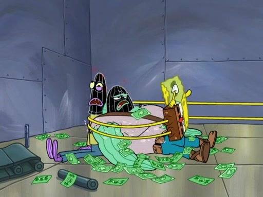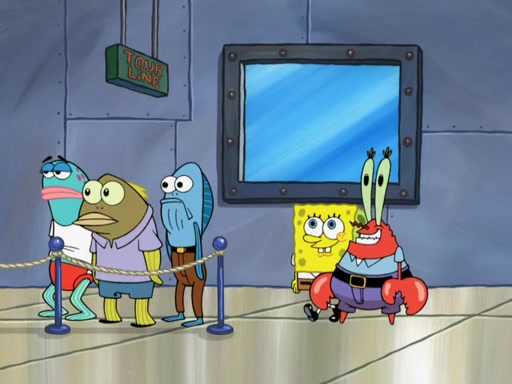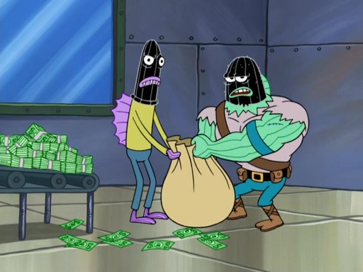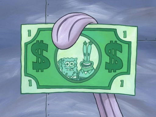 He starts crying, which floods the factory. SpongeBob absorbs the water and shoots it out the wall, destroying the autographed photo that Pearl finds. Bill is tired of SpongeBob and Mr. Krabs constantly interrupting the tour, so he then calls security to escort SpongeBob and Mr. Krabs out, but sees them tied up and gagged by two bank robbers. SpongeBob and Mr. Krabs stop them and are each rewarded with a Special Edition 1 dollar bill with their faces on it. Mr. Krabs then takes the bill from SpongeBob, saying that "he hasn't charged him yet for bringing him on this trip."