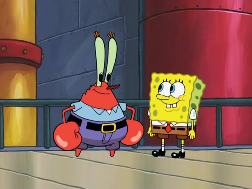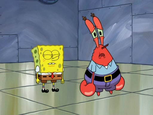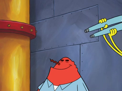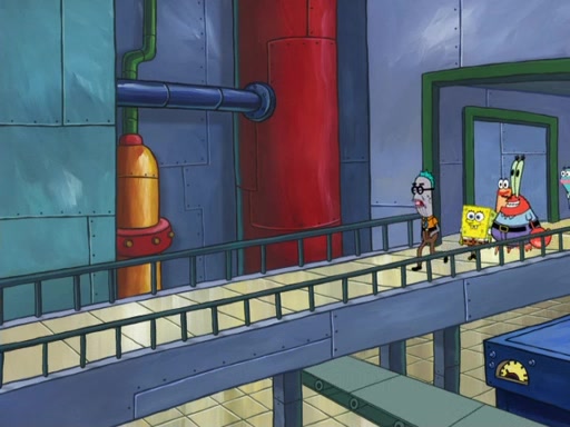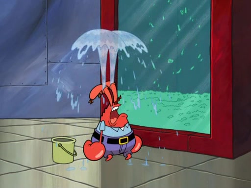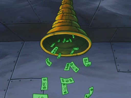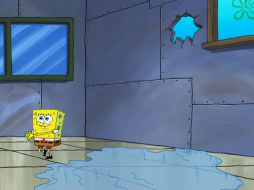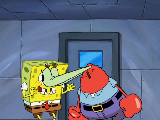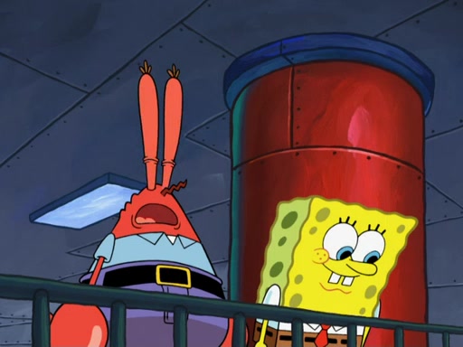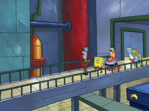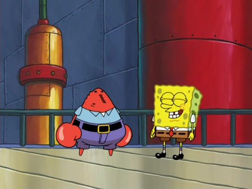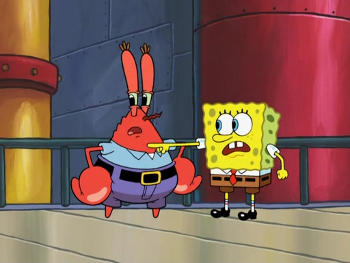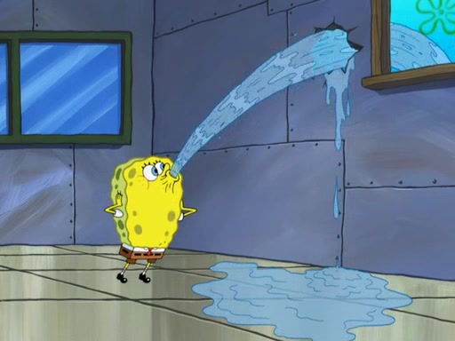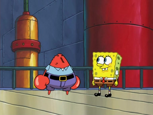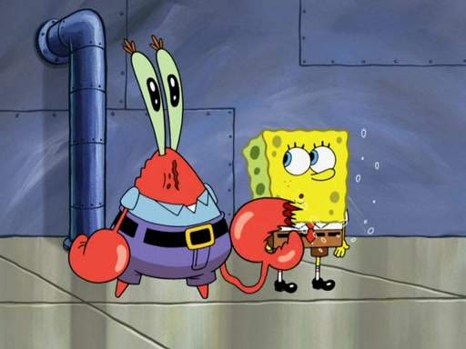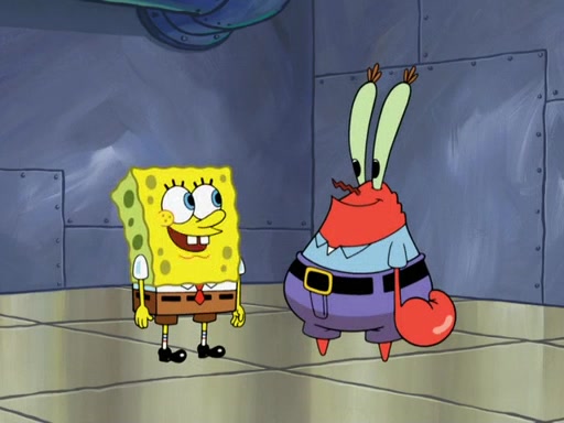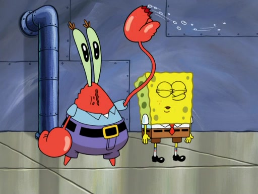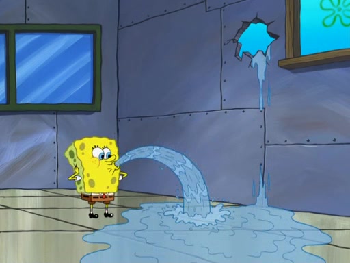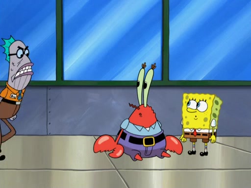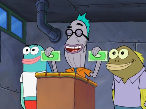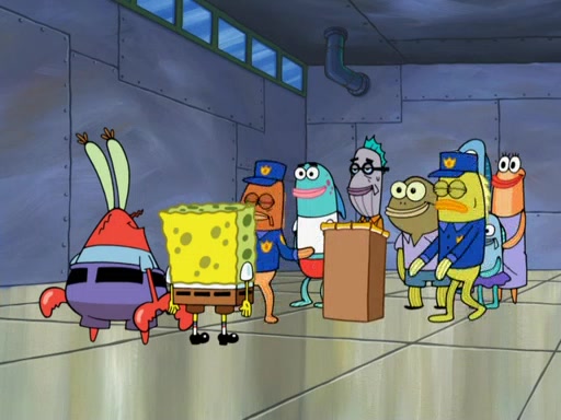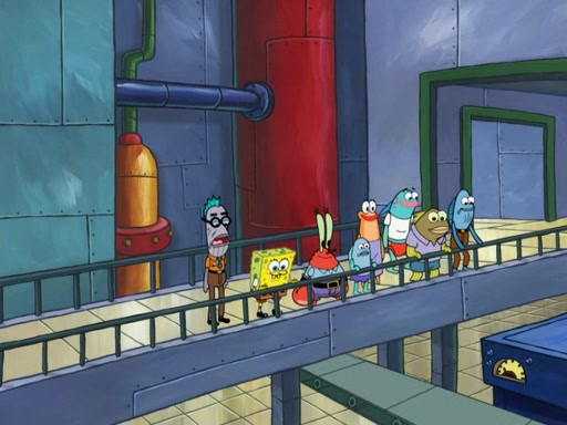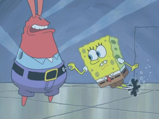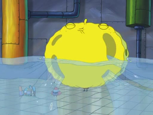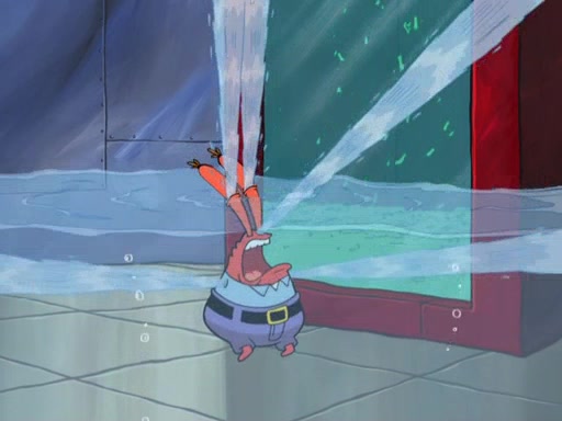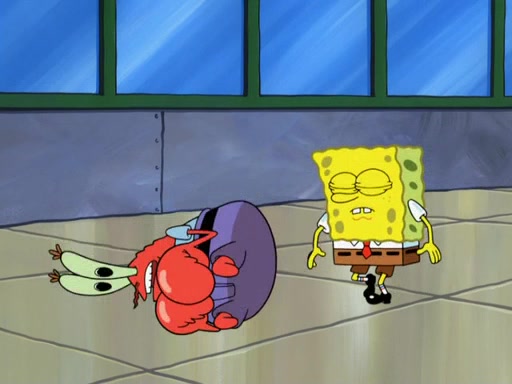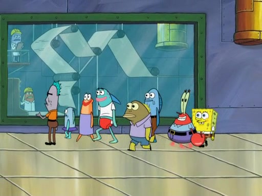 He starts crying, which floods the factory. SpongeBob absorbs the water and shoots it out the wall, destroying the autographed photo that Pearl finds. Bill is tired of SpongeBob and Mr. Krabs constantly interrupting the tour, so he then calls security to escort SpongeBob and Mr. Krabs out, but sees them tied up and gagged by two bank robbers. SpongeBob and Mr. Krabs stop them and are each rewarded with a Special Edition 1 dollar bill with their faces on it. Mr. Krabs then takes the bill from SpongeBob, saying that "he hasn't charged him yet for bringing him on this trip."