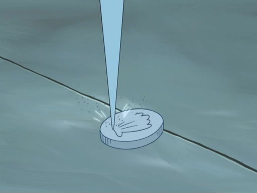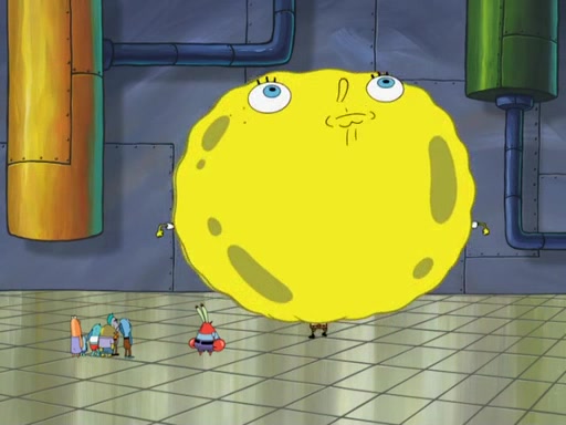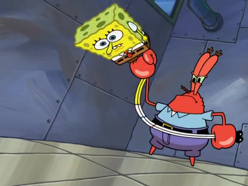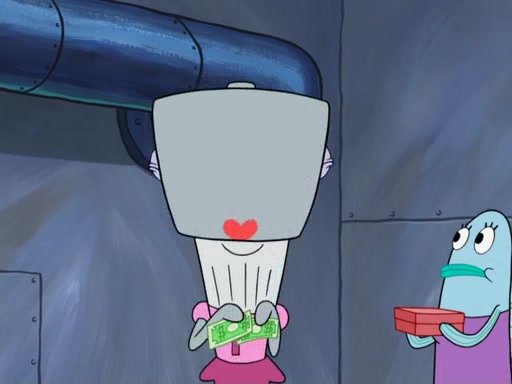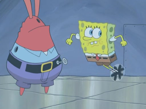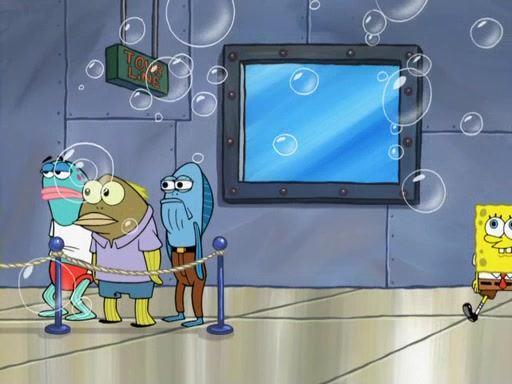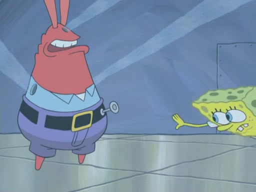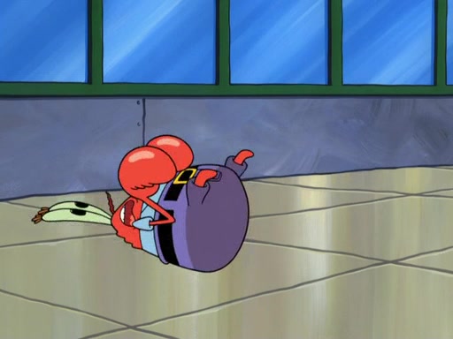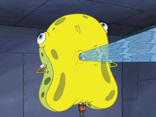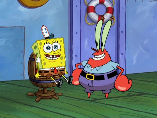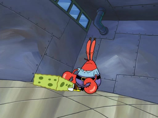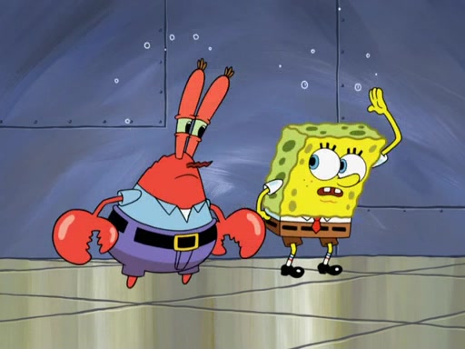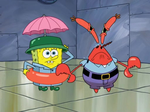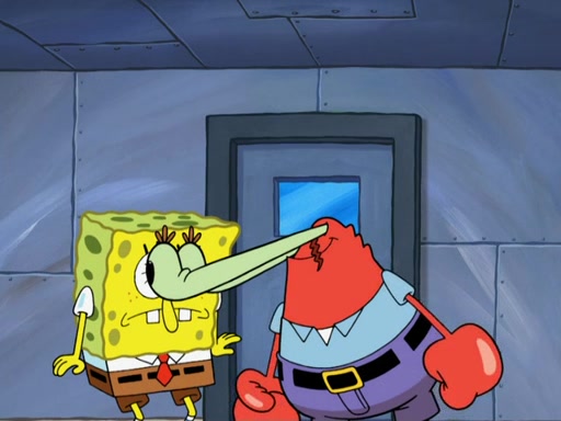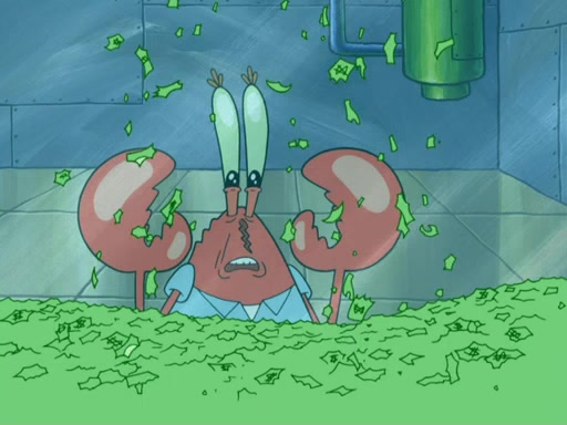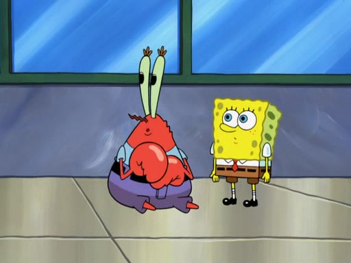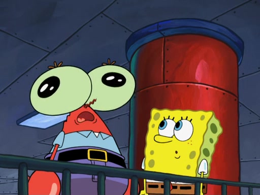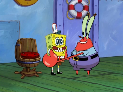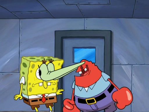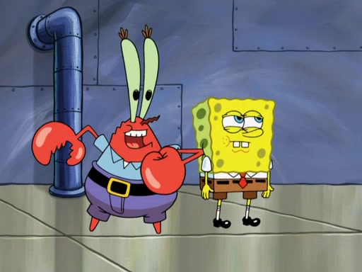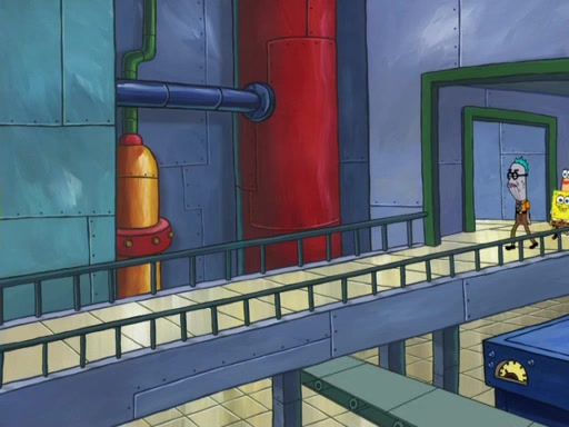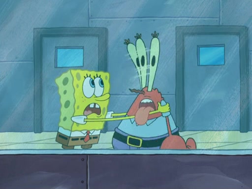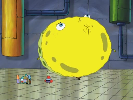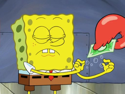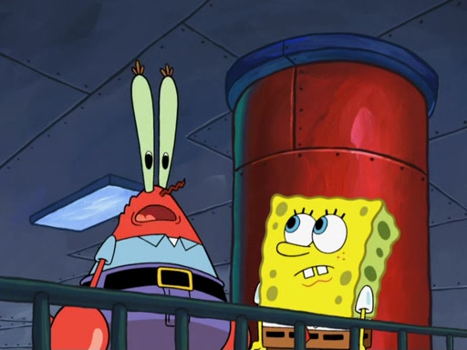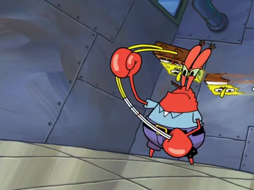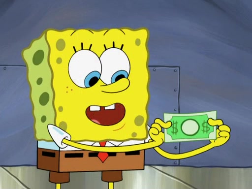He starts crying, which floods the factory. SpongeBob absorbs the water and shoots it out the wall, destroying the autographed photo that Pearl finds. Bill is tired of SpongeBob and Mr. Krabs constantly interrupting the tour, so he then calls security to escort SpongeBob and Mr. Krabs out, but sees them tied up and gagged by two bank robbers. SpongeBob and Mr. Krabs stop them and are each rewarded with a Special Edition 1 dollar bill with their faces on it. Mr. Krabs then takes the bill from SpongeBob, saying that "he hasn't charged him yet for bringing him on this trip."