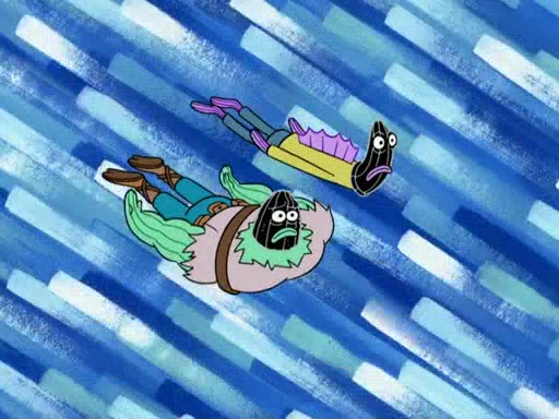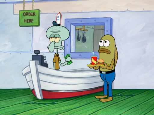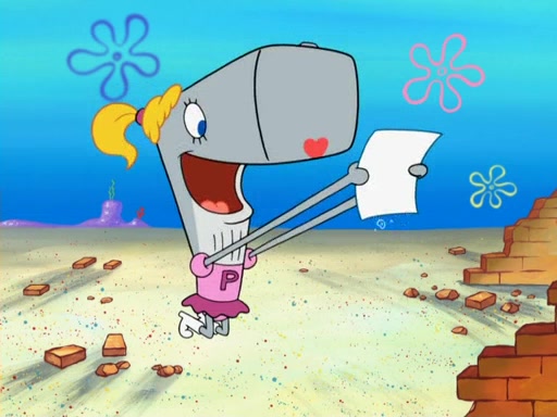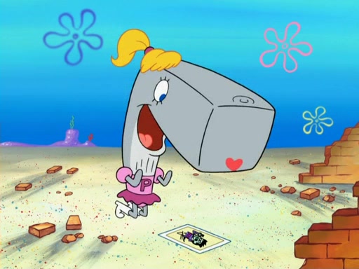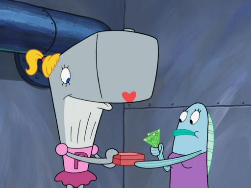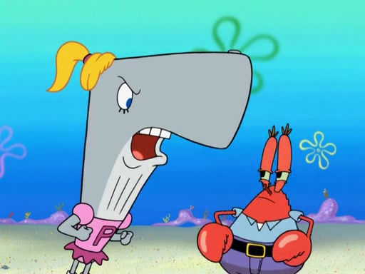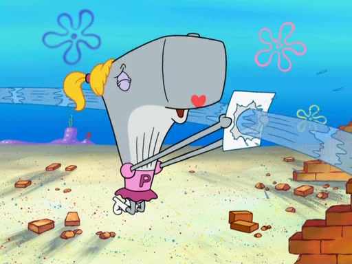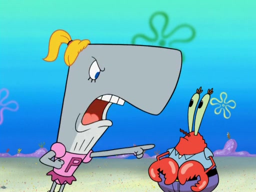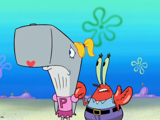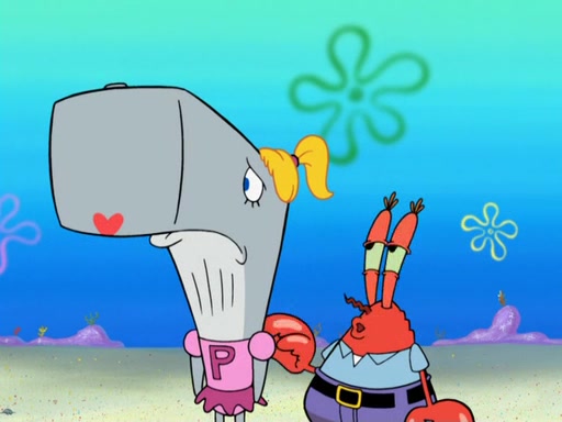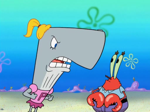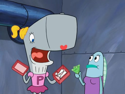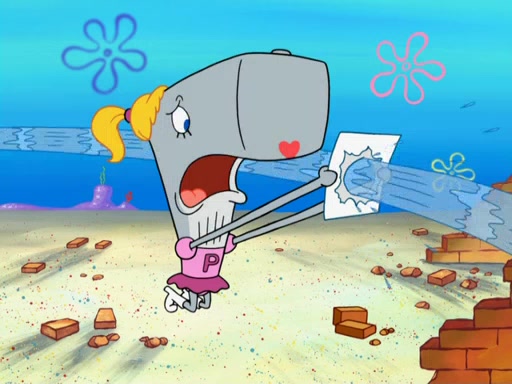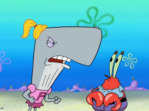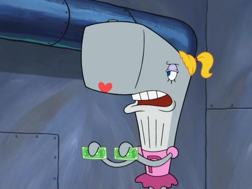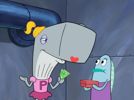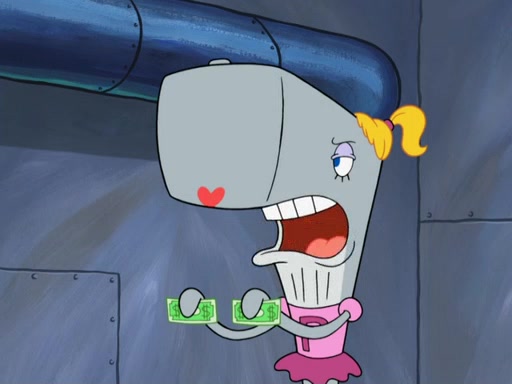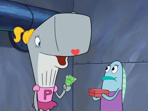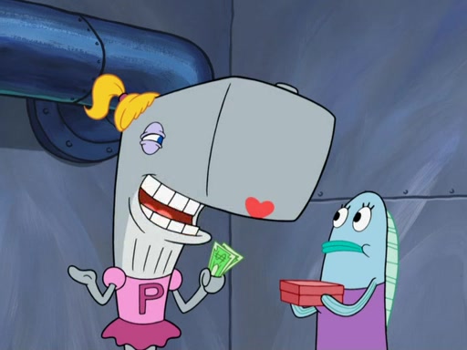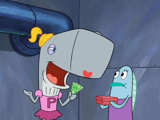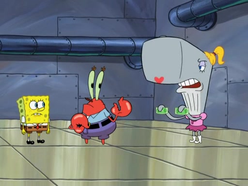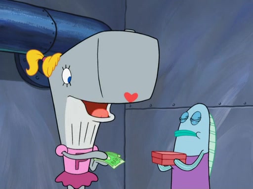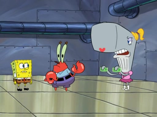 Pearl then shows up and says that "she hasn`t charged him for taking her on this terrible trip" and takes the two bills from him. Her friend then shows up and Pearl hands her the two dollars that she owes her for the shoes, saying that she must have maxed out her father's (Mr. Krabs) credit card. With the two bills gone, SpongeBob says "Oh no" and Mr. Krabs starts crying, flooding the factory.