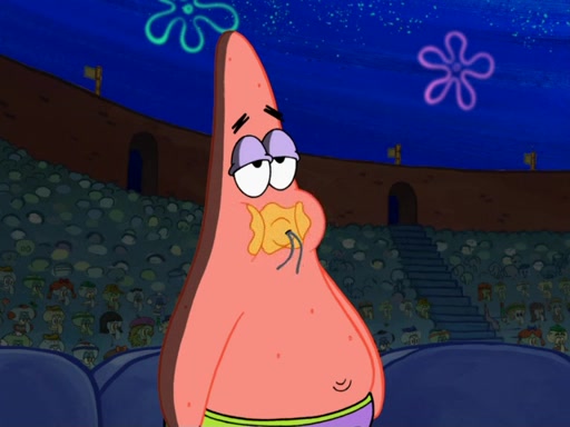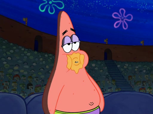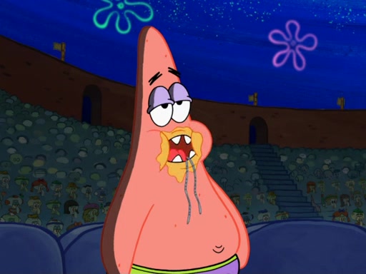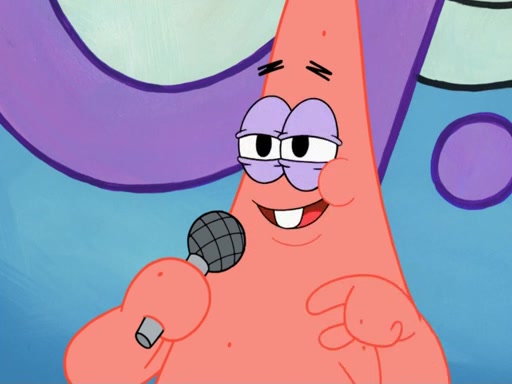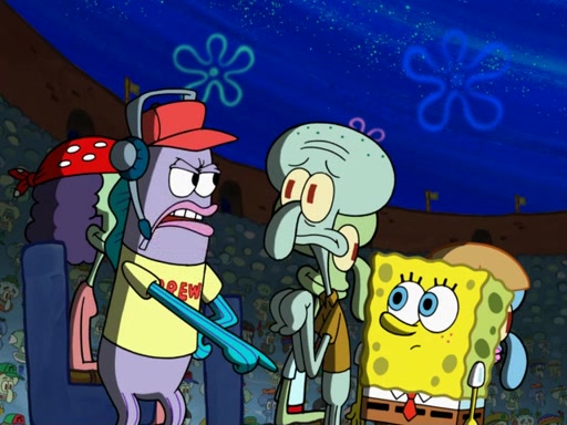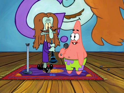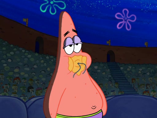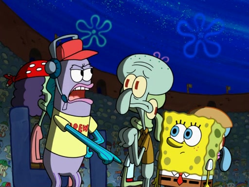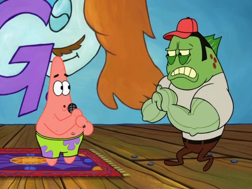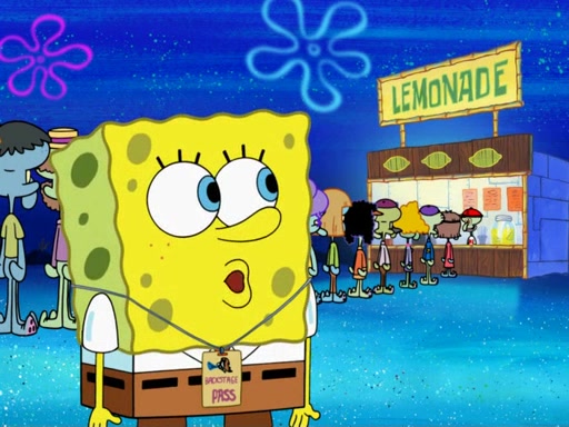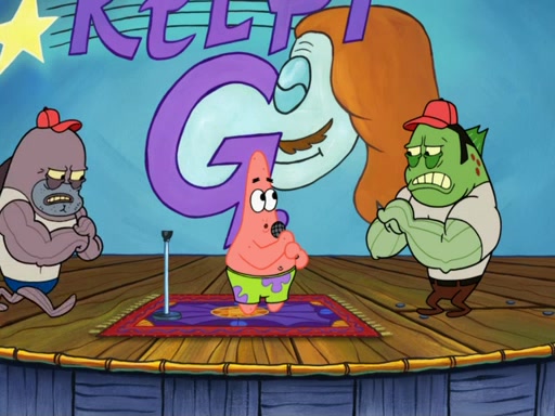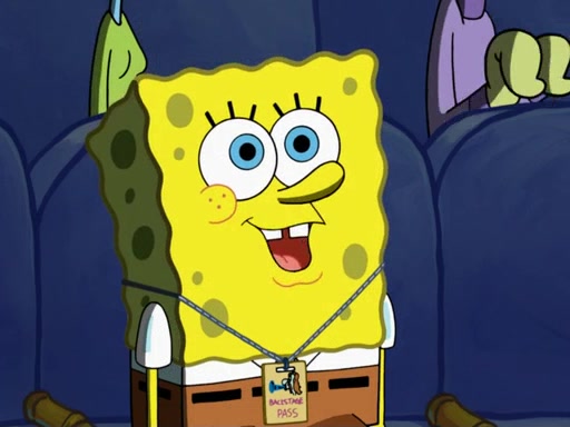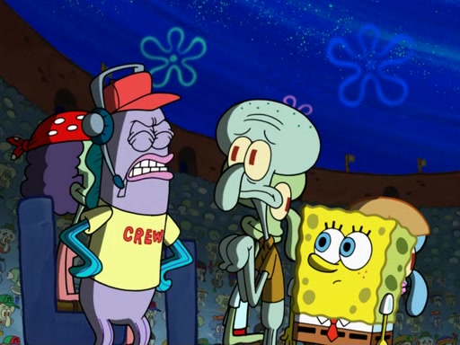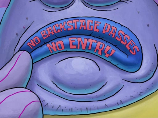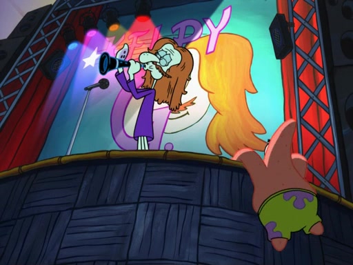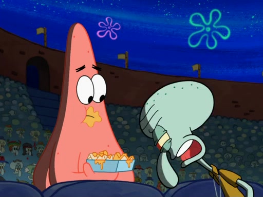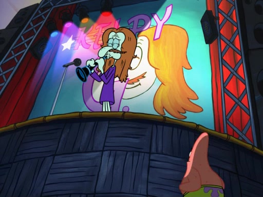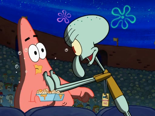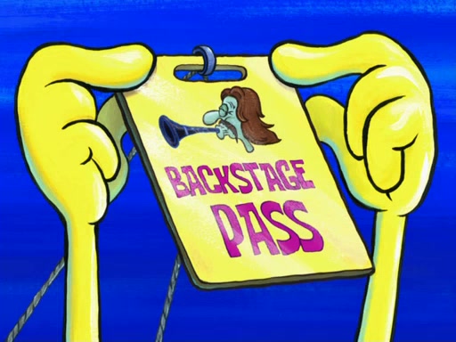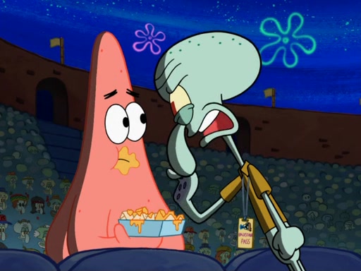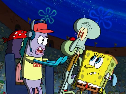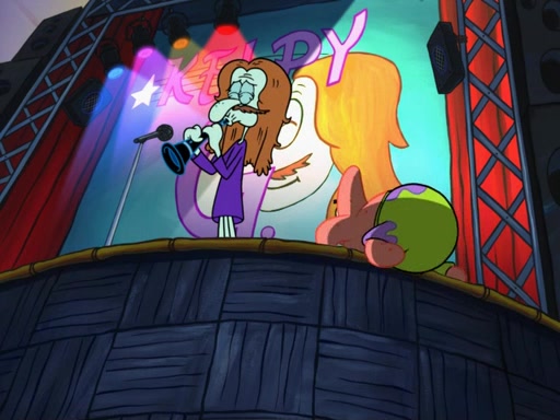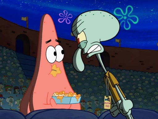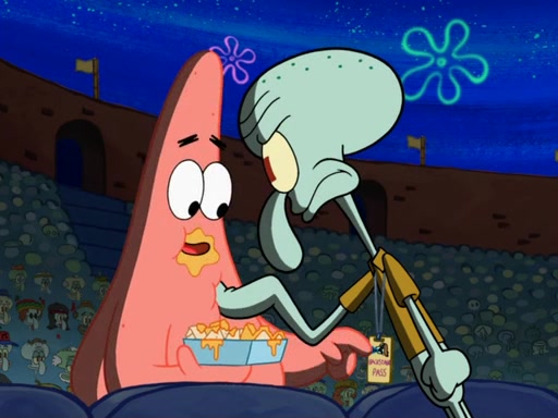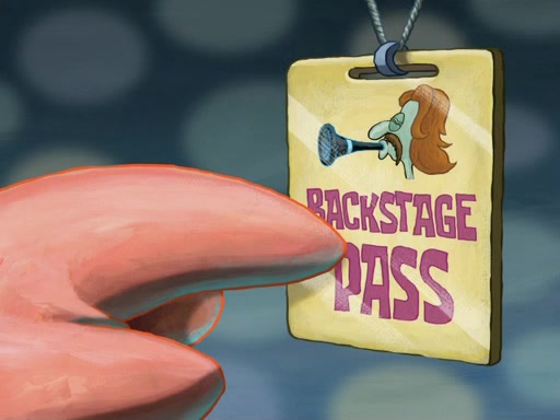 Patrick comes along and said he wanted the nachos. Squidward gets angrier. Patrick eats Squidward's backstage pass, so SpongeBob compassionately gives Squidward his backstage pass, but Patrick eats his too. Patrick wants more nachos. He interrupts Kelpy G's performance, which makes him stop playing, and says what he wants to eat through the microphone and then when he sees his guards try to hurt him, he jumps off the stage and is then carried away by the fans. SpongeBob and Squidward sneak away, but the guards tell them to go back to their seats. When the two get there, they find that some other people took them. Squidward angrily yells at them, which makes Kelpy G stop playing again.