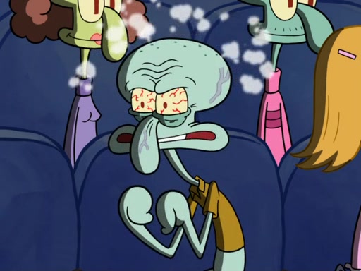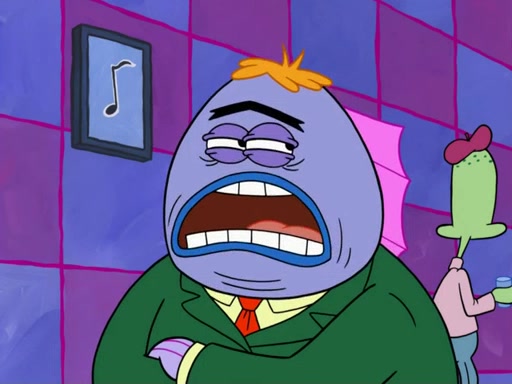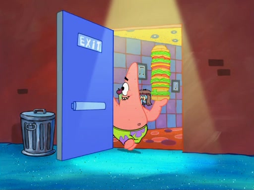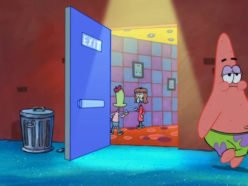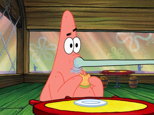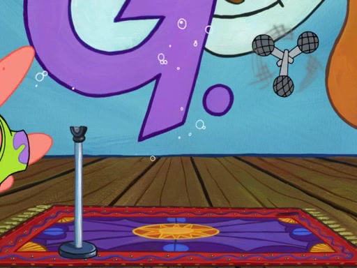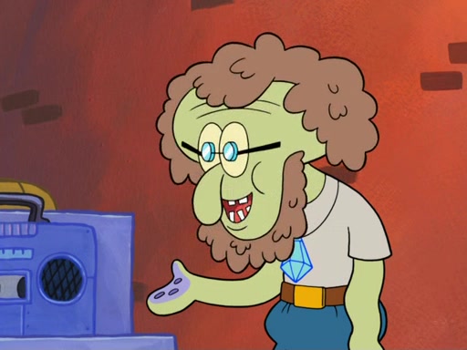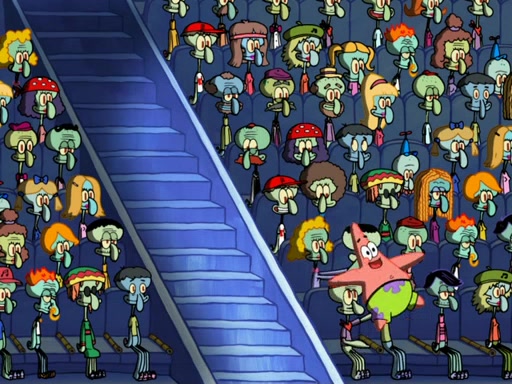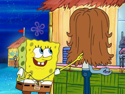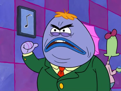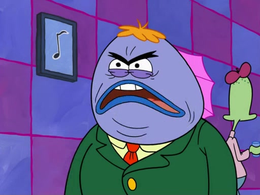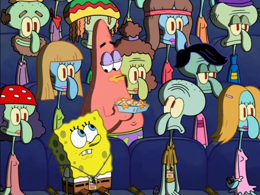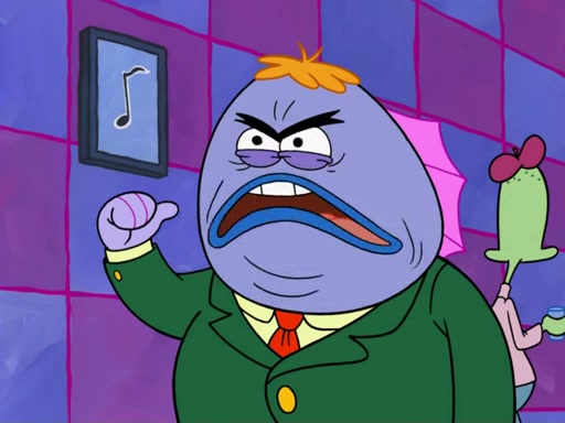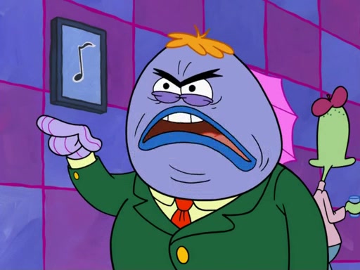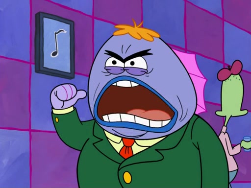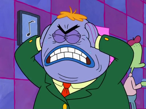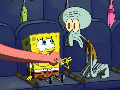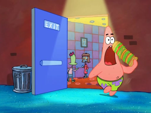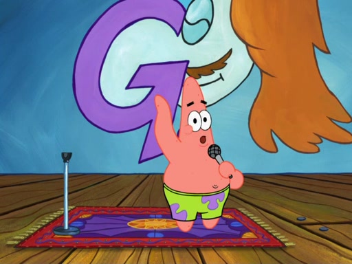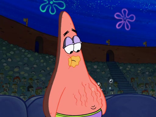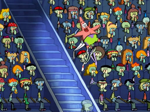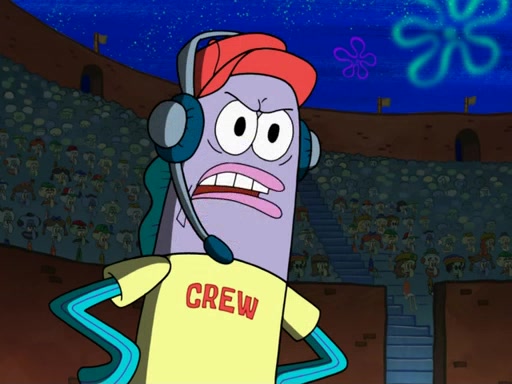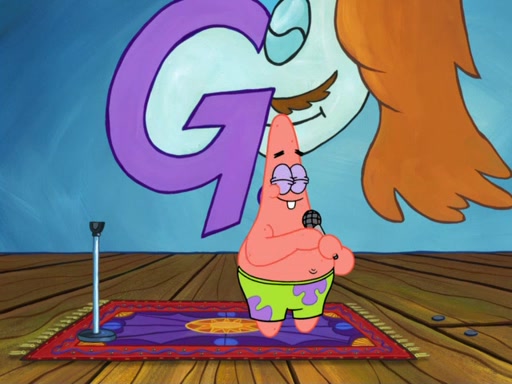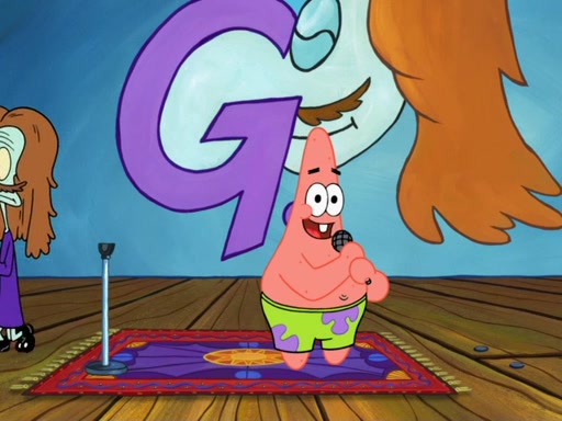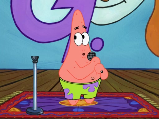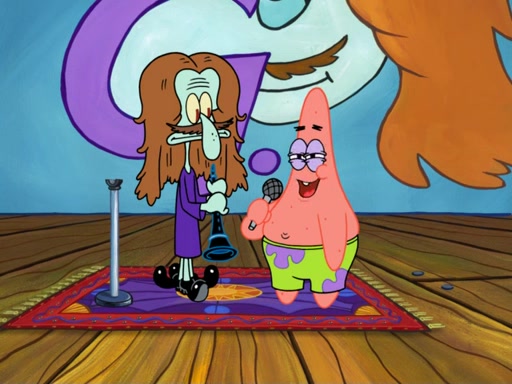 Patrick comes along and said he wanted the nachos. Squidward gets angrier. Patrick eats Squidward's backstage pass, so SpongeBob compassionately gives Squidward his backstage pass, but Patrick eats his too. Patrick wants more nachos. He interrupts Kelpy G's performance, which makes him stop playing, and says what he wants to eat through the microphone and then when he sees his guards try to hurt him, he jumps off the stage and is then carried away by the fans. SpongeBob and Squidward sneak away, but the guards tell them to go back to their seats. When the two get there, they find that some other people took them. Squidward angrily yells at them, which makes Kelpy G stop playing again.