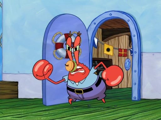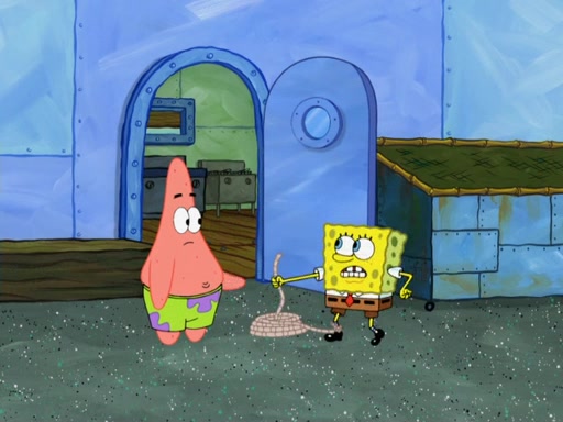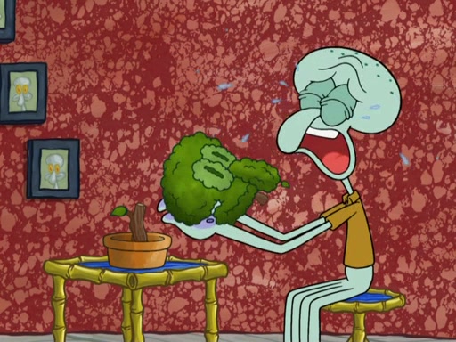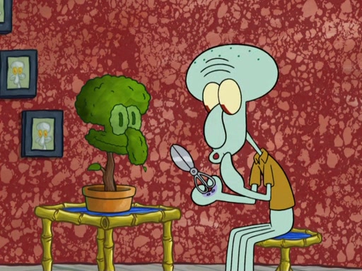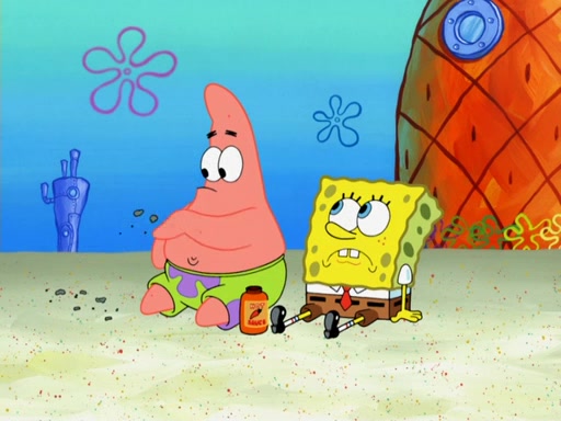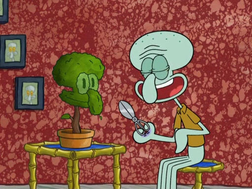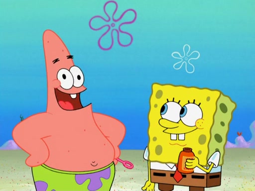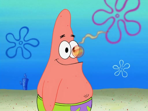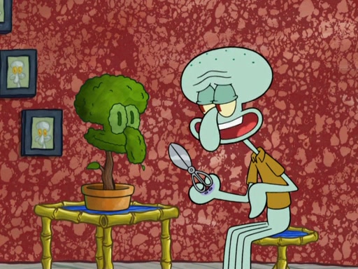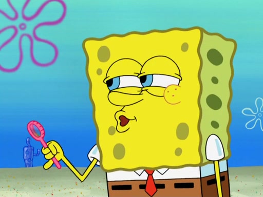 SpongeBob and Patrick blow bubbles, and they soon get bored. SpongeBob suggests they "spice up" their bubble blowing. Patrick is struck with an idea, and takes out a bottle of hot sauce. He dunks his bubble wand into the bottle and blows a spicy bubble into SpongeBob's eyes. SpongeBob screams as his eyes glow red and disintegrate, then grow back. Then, he blows a spicy bubble into Patrick's eyes, doing the same thing to him. Patrick wonders if hot sauce is bad for their eyes. Then, they said "Nah," and laugh. They burn each others eyes repeatedly and the effect goes again. Meanwhile, in his house, Squidward is clipping his likeness into a bonsai of himself. Just as he's about to clip off a straggler leaf, they scream, and he lops off the entire head. The beheaded bonsai requests that Squidward avenge it. Squidward angrily yells at them out the window, but SpongeBob blows a big spicy bubble and it popped next to him, burning him to ashes and crippled him.