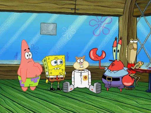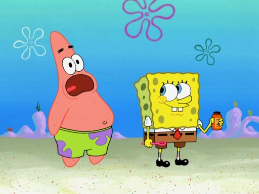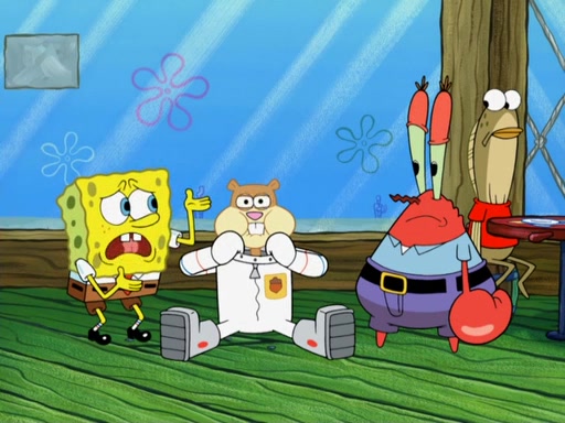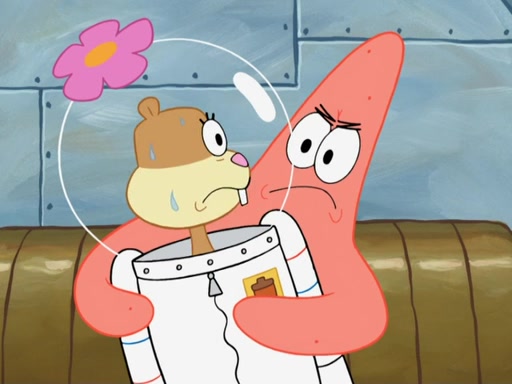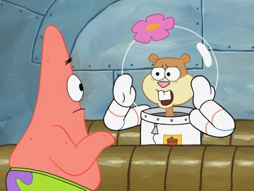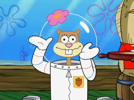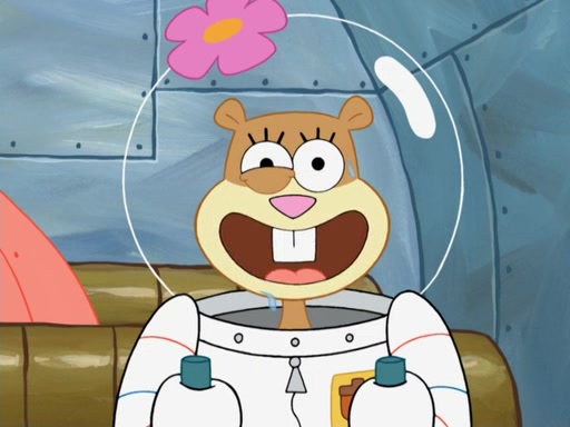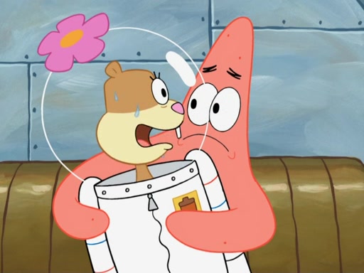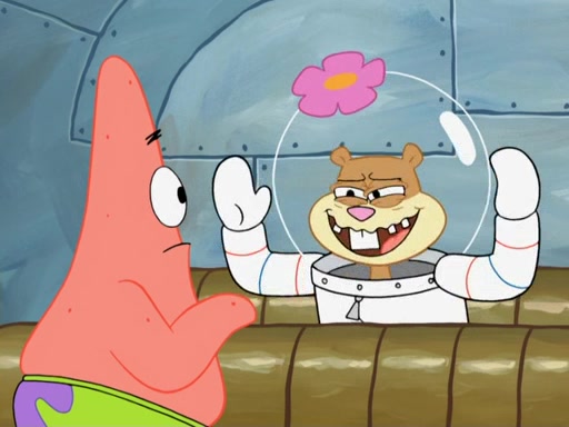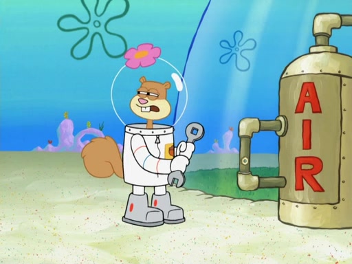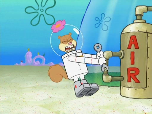 SpongeBob and Patrick go to Sandy's treedome, where she is outside fixing an airtank. They tell her about their new discovery, with Patrick convinced he's a genius for his new idea, even thinking he's smarter than Sandy. She tells them she's busy fixing a clog in the airtank. Patrick suggests she breathes water like a "smart person," and she explains land creatures need air. Patrick simply dismisses her as stupid. SpongeBob tries to help clear the blockage by blowing spicy bubbles onto the airtank, but it melts. Water rushes into the treedome, filling it completely. Sandy only has a little bit of air left in her suit, so she goes to her submarine which has enough air to go to the surface and replenish the air supply for her treedome. However, SpongeBob opens the door and water rushes in. Sandy tasks SpongeBob with driving the submarine to the surface, as the low amount of air is making her woozy. As they make their way to the surface, the lack of air in Sandy's suit causes her to act crazy and hallucinate, and doing crazy things such as licking Patrick, seeing atoms and thinking she has spider-webs on her face. When they reach the surface, a delirious Sandy suddenly gets a craving for a Krabby Patty and drives the submarine through the roof of The Krusty Krab. Her suit's air supply is finally depleted and she removes her helmet. She takes a patron's Krabby Patty and eats it, but its later spitted out by SpongeBob pulling her tail and Mr. Krabs appears, wanting to know what was going on, and SpongeBob explains everything.