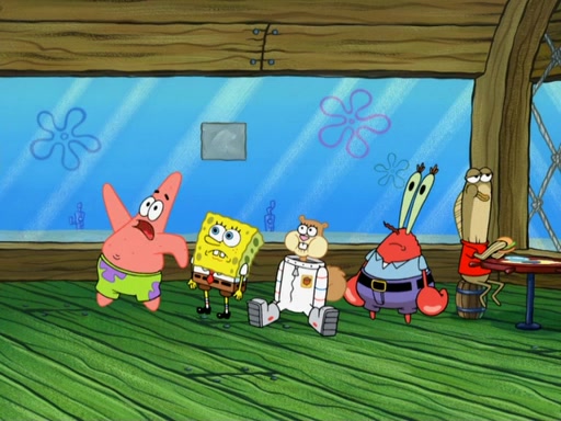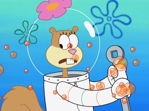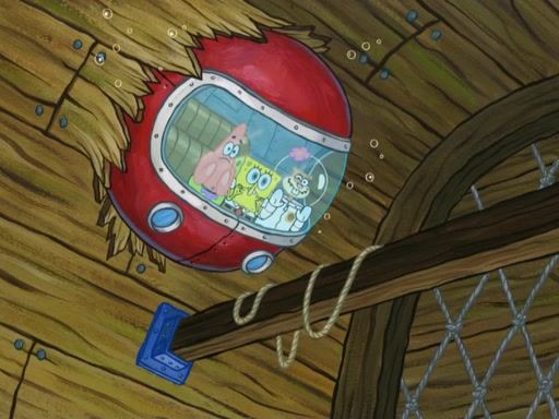 SpongeBob and Patrick try to help Sandy get air, and they notice air bubbles from the submarine on the ceiling. SpongeBob uses a line of straws to reach them. Patrick sucks them in, then blows into Sandy's mouth. SpongeBob suggests Mr. Krabs might have air in him, telling him Squidward says he's "full of hot air" (which Squidward nervously denies). Mr. Krabs says he indeed has an air bubble or two and pulls in his eyestalks so Sandy can breathe them in. Pearl comes in and SpongeBob suggests she could help give air to Sandy, because she's a mammal, just like Sandy. Pearl agrees, saying "I guess we mammals gotta stick together." Sandy puts her mouth over Pearl's blowhole, and Pearl exhales, inflating her like a balloon. SpongeBob figures he can go to the surface and fill a bubble with air. Using an oxygen tank (which neihter of them realizes could be used to help Sandy), he rockets to the surface, covers himself with bubble soap and inhales to create a giant air-filled bubble, then he puts it into the treedome.