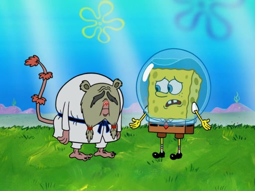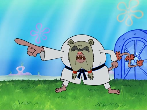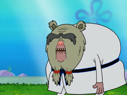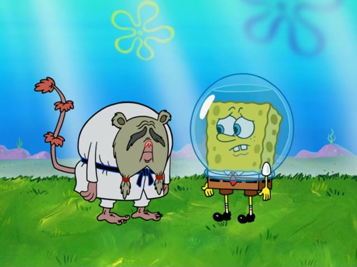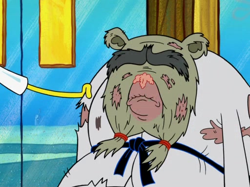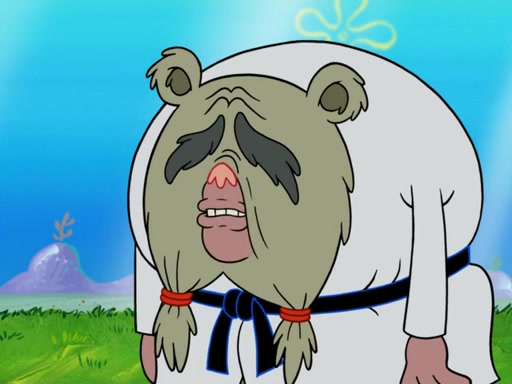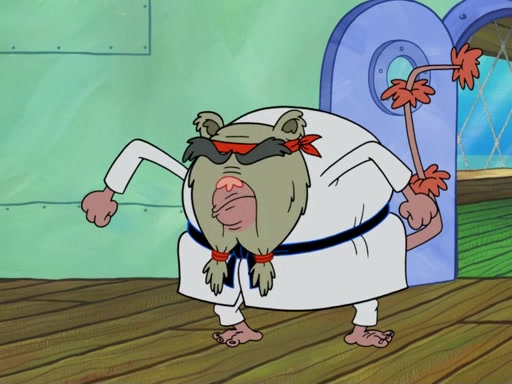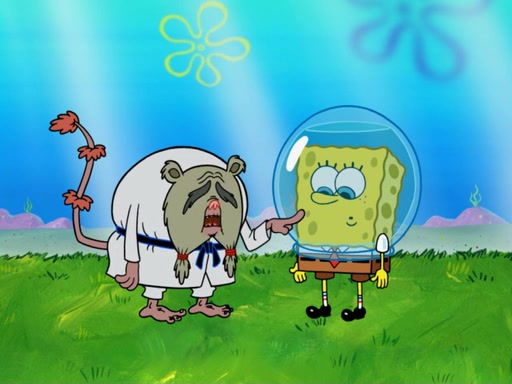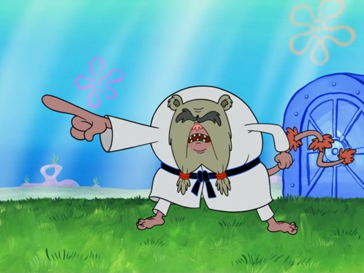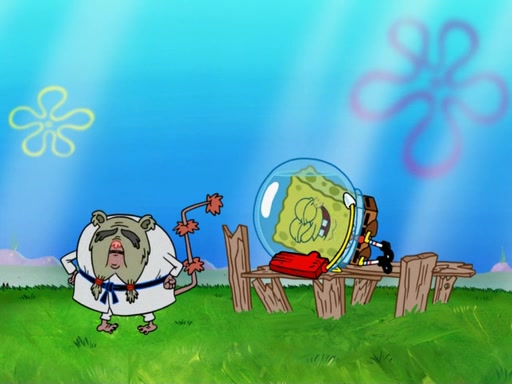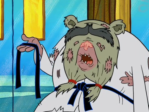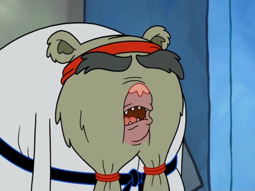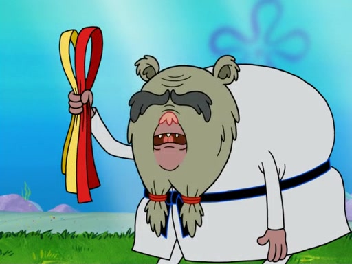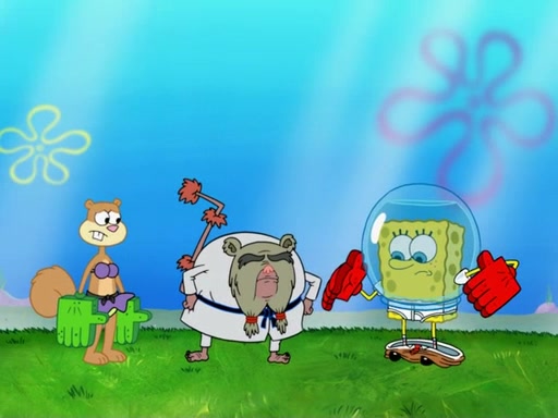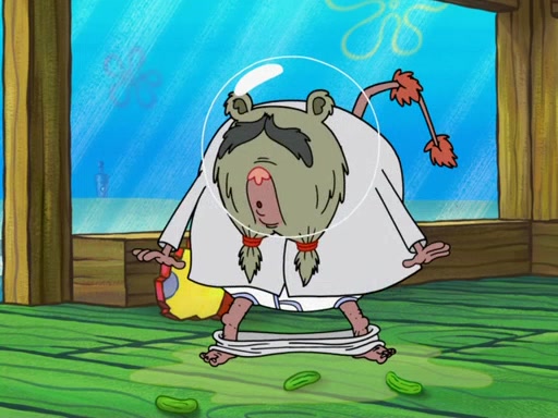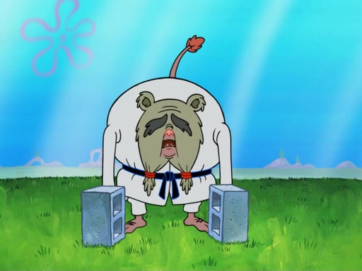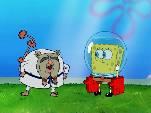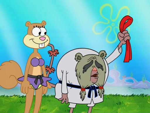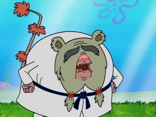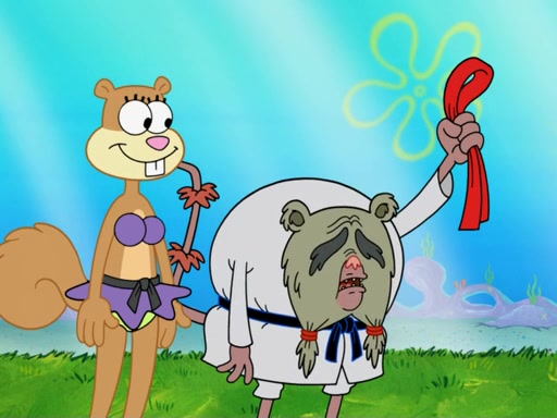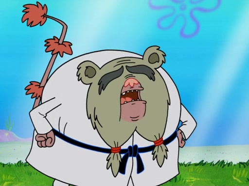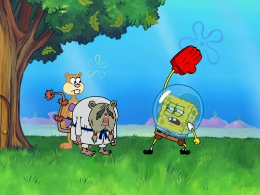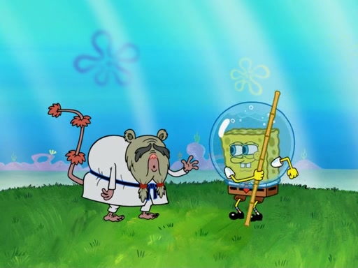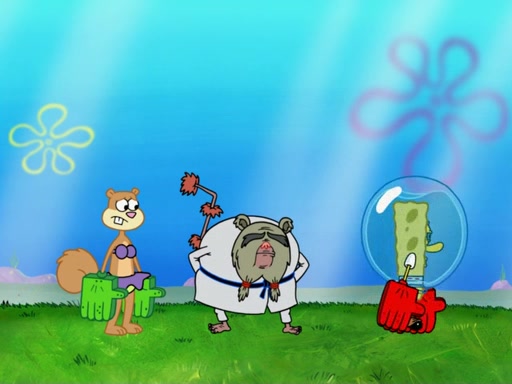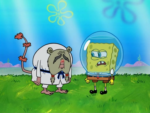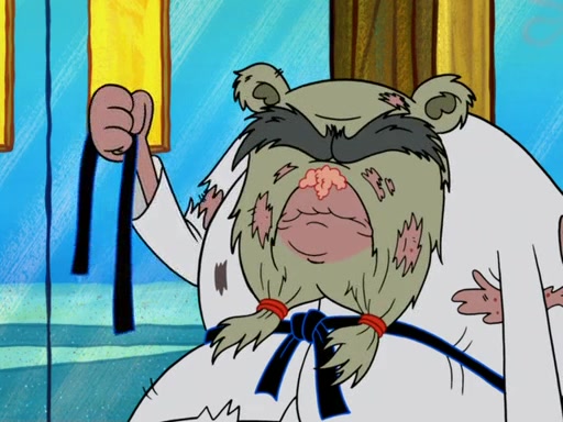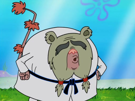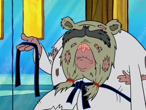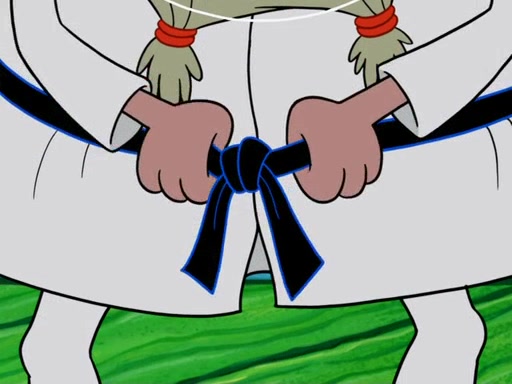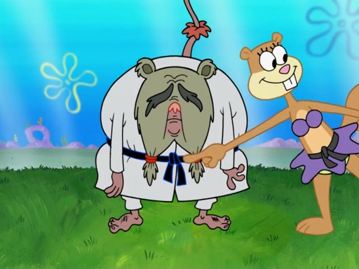 SpongeBob runs home to train himself overnight and then comes back, tired and unrested to spar with Sandy. He does very poorly, falls asleep, and is sad. Fuzzy said if he lasted longer, he would have rewarded SpongeBob with the clear belt, but says that SpongeBob is not even worthy enough to wear the belt that keeps his pants up, so he takes his belt and his pants fall. He also takes Sandy's black belt away for wasting his time with SpongeBob. He leaves and Sandy tries to talk Fuzzy into giving SpongeBob another chance, but Fuzzy never gives two chances and wishes to find food. Suddenly, Sandy then gets an idea. She convinces Fuzzy to come to the Krusty Krab to see SpongeBob in action, so he goes (without an air helmet) to see him. He watches, and is still not impressed by SpongeBob's agility. He is only amazed when SpongeBob manages to slice Sandy's burger in twelfths with his hand. Fuzzy starts to think SpongeBob is more skilled than he thought, so he tries to attack SpongeBob, but SpongeBob is so busy that he doesn't notice Fuzzy sneaking up on him and dodges Fuzzy. Fuzzy decides he has had enough and tries to finish it, but SpongeBob bends over to get a dropped ketchup bottle, dodging Fuzzy's kick, sending him over to the door of the Krusty Krab. He looks terrible, but Sandy says Fuzzy just needs an air helmet. She gives him one, and he admits that SpongeBob is a worthy karate fighter, and so, he gives SpongeBob a black belt. As well, he gives Sandy his blacker belt for proving that SpongeBob does know karate. Without his belt, Fuzzy's pants fall down, revealing his underwear. The whole crowd cheers with laughter.