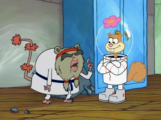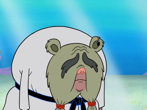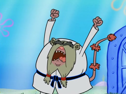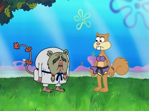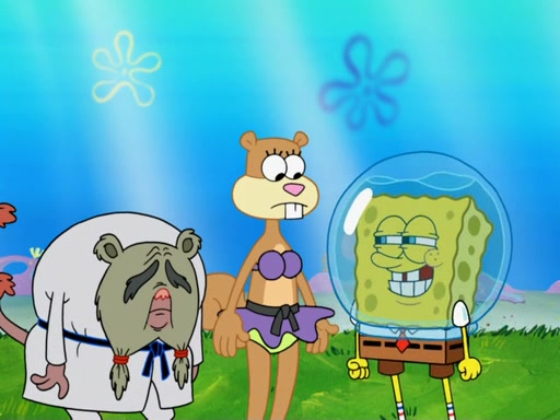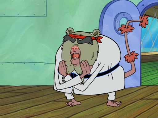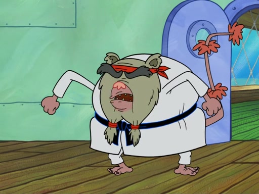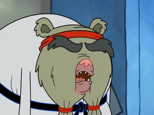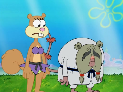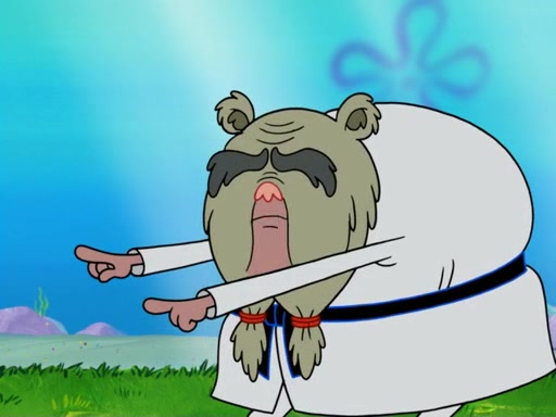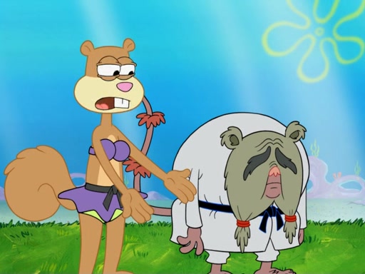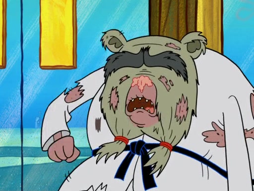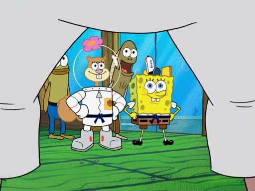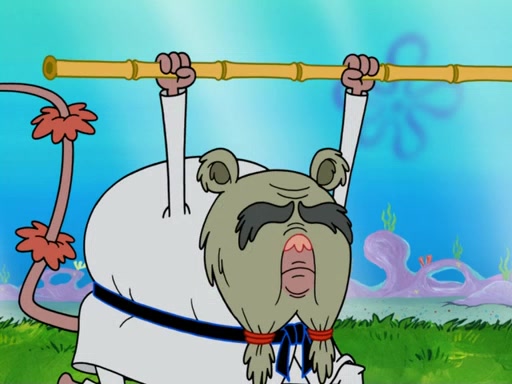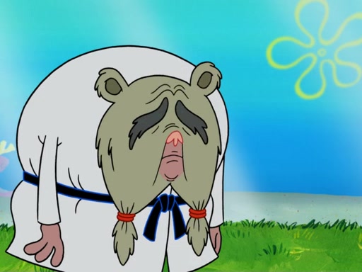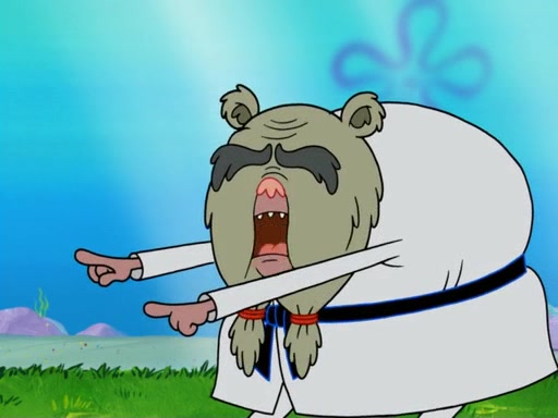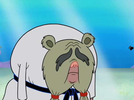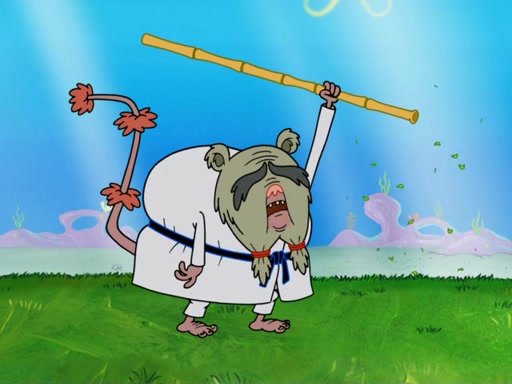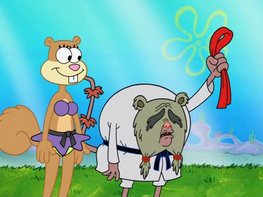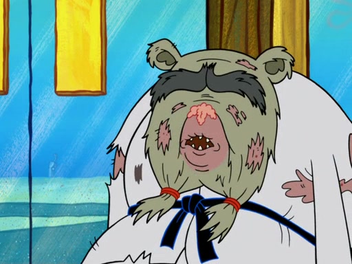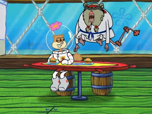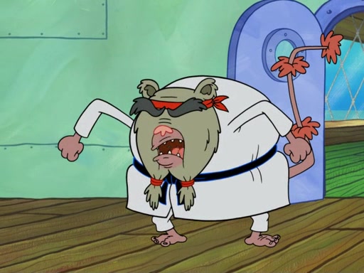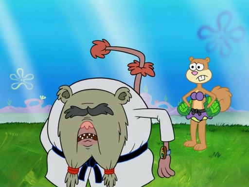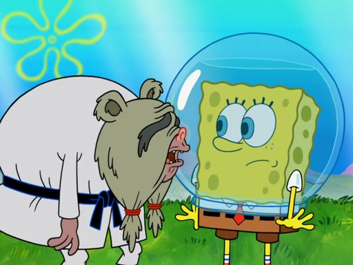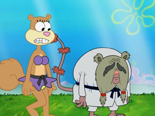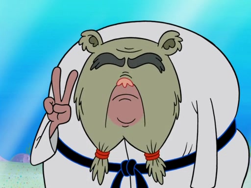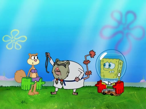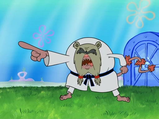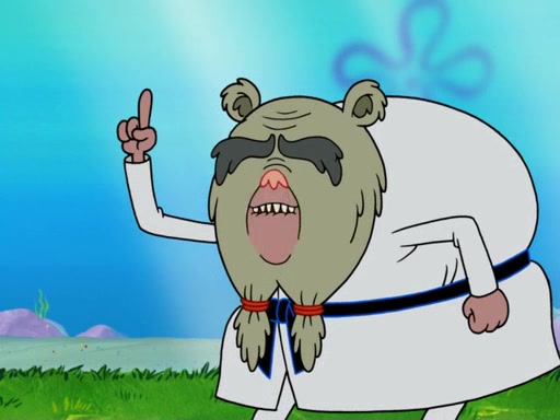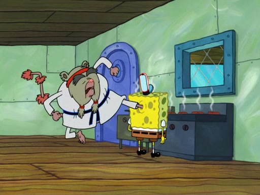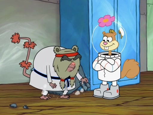 SpongeBob runs home to train himself overnight and then comes back, tired and unrested to spar with Sandy. He does very poorly, falls asleep, and is sad. Fuzzy said if he lasted longer, he would have rewarded SpongeBob with the clear belt, but says that SpongeBob is not even worthy enough to wear the belt that keeps his pants up, so he takes his belt and his pants fall. He also takes Sandy's black belt away for wasting his time with SpongeBob. He leaves and Sandy tries to talk Fuzzy into giving SpongeBob another chance, but Fuzzy never gives two chances and wishes to find food. Suddenly, Sandy then gets an idea. She convinces Fuzzy to come to the Krusty Krab to see SpongeBob in action, so he goes (without an air helmet) to see him. He watches, and is still not impressed by SpongeBob's agility. He is only amazed when SpongeBob manages to slice Sandy's burger in twelfths with his hand. Fuzzy starts to think SpongeBob is more skilled than he thought, so he tries to attack SpongeBob, but SpongeBob is so busy that he doesn't notice Fuzzy sneaking up on him and dodges Fuzzy. Fuzzy decides he has had enough and tries to finish it, but SpongeBob bends over to get a dropped ketchup bottle, dodging Fuzzy's kick, sending him over to the door of the Krusty Krab. He looks terrible, but Sandy says Fuzzy just needs an air helmet. She gives him one, and he admits that SpongeBob is a worthy karate fighter, and so, he gives SpongeBob a black belt. As well, he gives Sandy his blacker belt for proving that SpongeBob does know karate. Without his belt, Fuzzy's pants fall down, revealing his underwear. The whole crowd cheers with laughter.