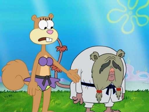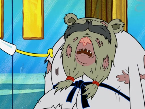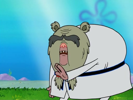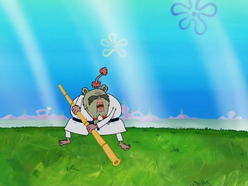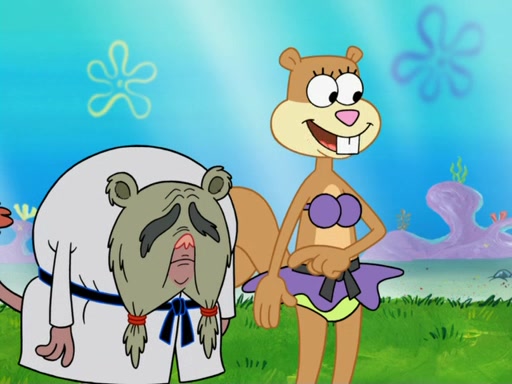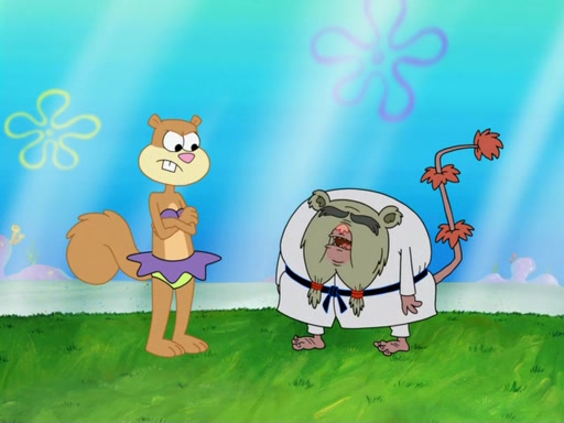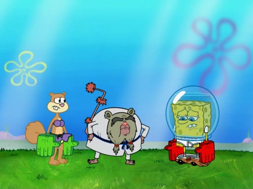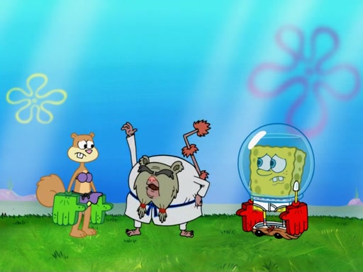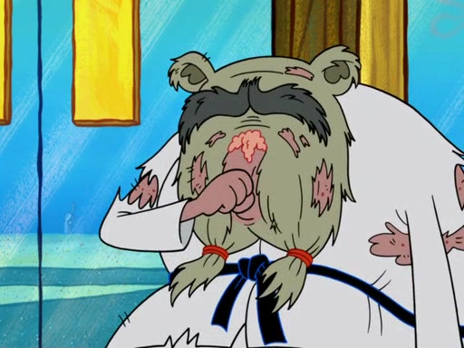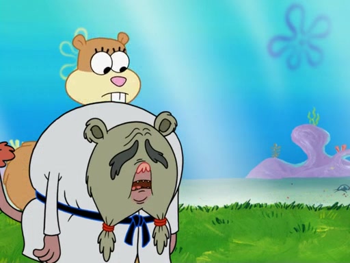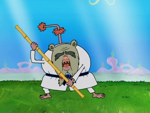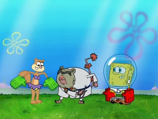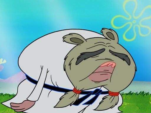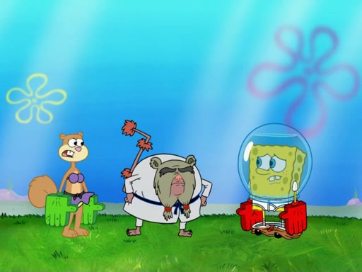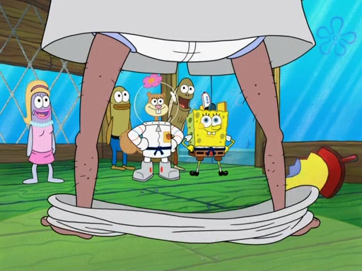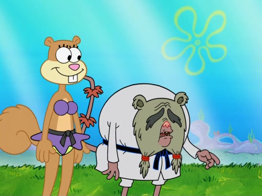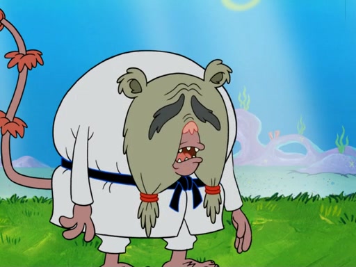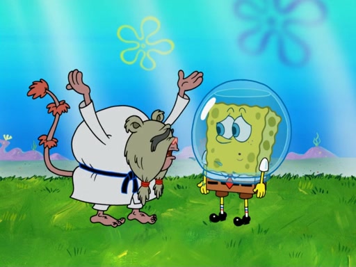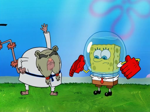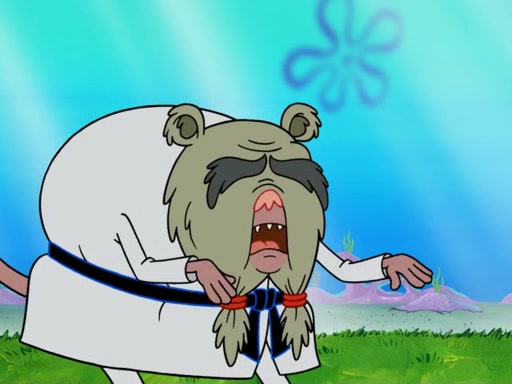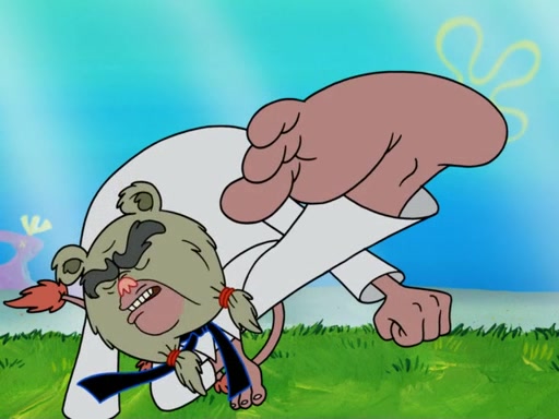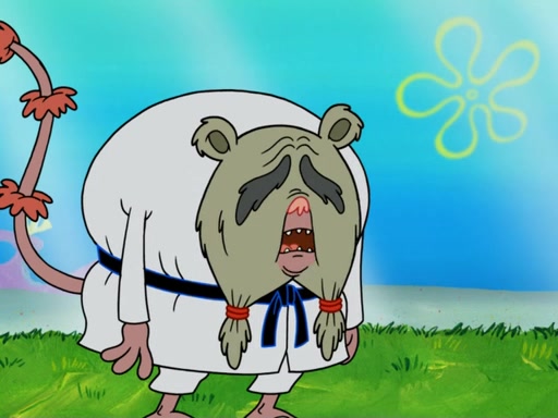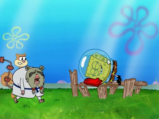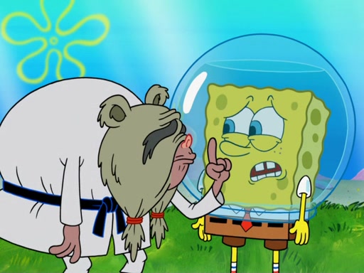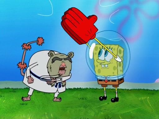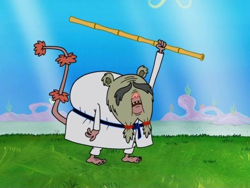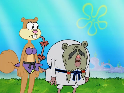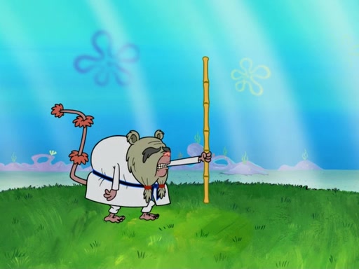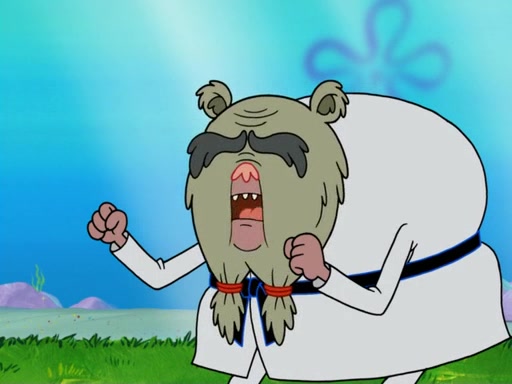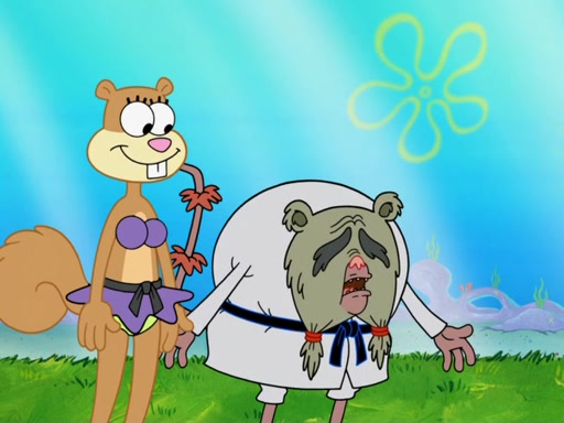 SpongeBob runs home to train himself overnight and then comes back, tired and unrested to spar with Sandy. He does very poorly, falls asleep, and is sad. Fuzzy said if he lasted longer, he would have rewarded SpongeBob with the clear belt, but says that SpongeBob is not even worthy enough to wear the belt that keeps his pants up, so he takes his belt and his pants fall. He also takes Sandy's black belt away for wasting his time with SpongeBob. He leaves and Sandy tries to talk Fuzzy into giving SpongeBob another chance, but Fuzzy never gives two chances and wishes to find food. Suddenly, Sandy then gets an idea. She convinces Fuzzy to come to the Krusty Krab to see SpongeBob in action, so he goes (without an air helmet) to see him. He watches, and is still not impressed by SpongeBob's agility. He is only amazed when SpongeBob manages to slice Sandy's burger in twelfths with his hand. Fuzzy starts to think SpongeBob is more skilled than he thought, so he tries to attack SpongeBob, but SpongeBob is so busy that he doesn't notice Fuzzy sneaking up on him and dodges Fuzzy. Fuzzy decides he has had enough and tries to finish it, but SpongeBob bends over to get a dropped ketchup bottle, dodging Fuzzy's kick, sending him over to the door of the Krusty Krab. He looks terrible, but Sandy says Fuzzy just needs an air helmet. She gives him one, and he admits that SpongeBob is a worthy karate fighter, and so, he gives SpongeBob a black belt. As well, he gives Sandy his blacker belt for proving that SpongeBob does know karate. Without his belt, Fuzzy's pants fall down, revealing his underwear. The whole crowd cheers with laughter.