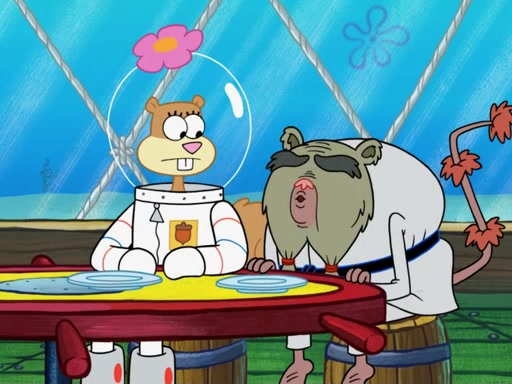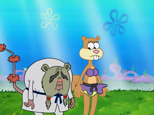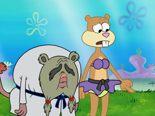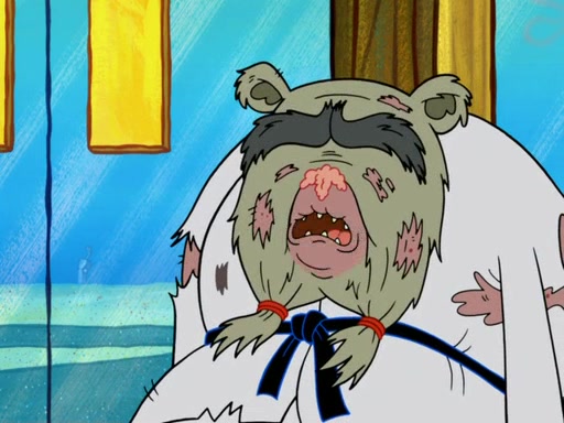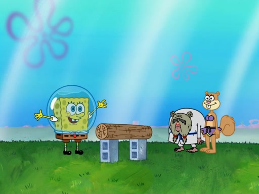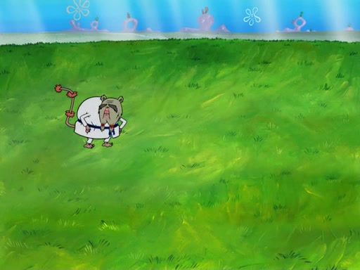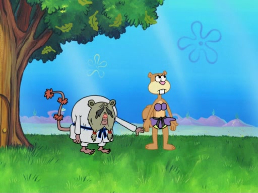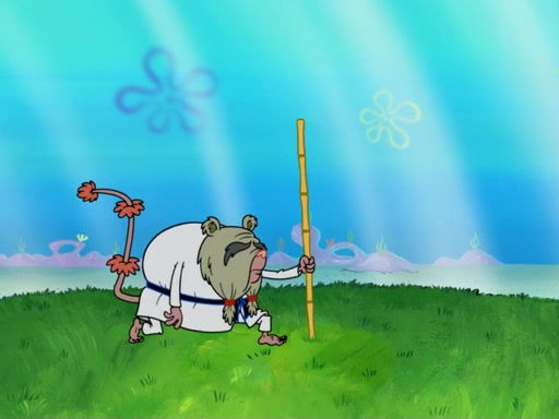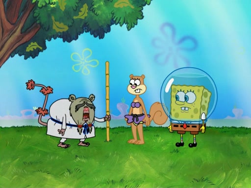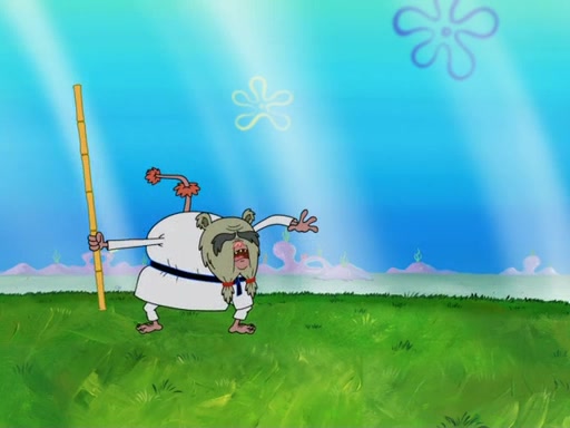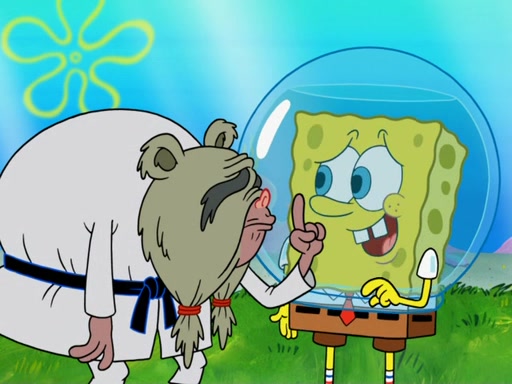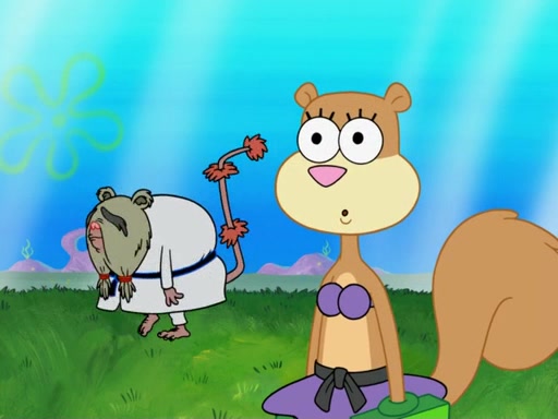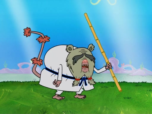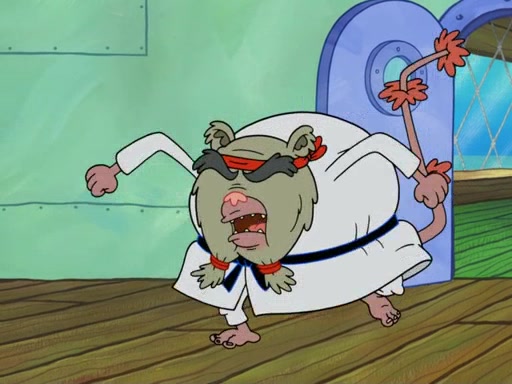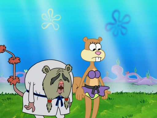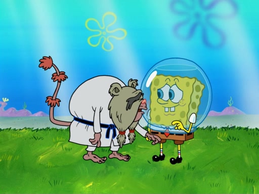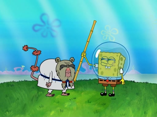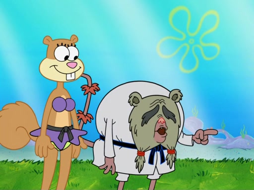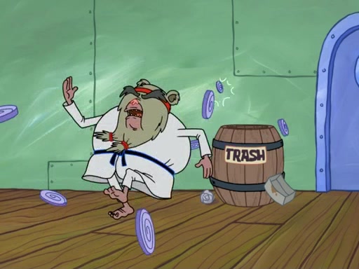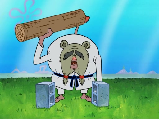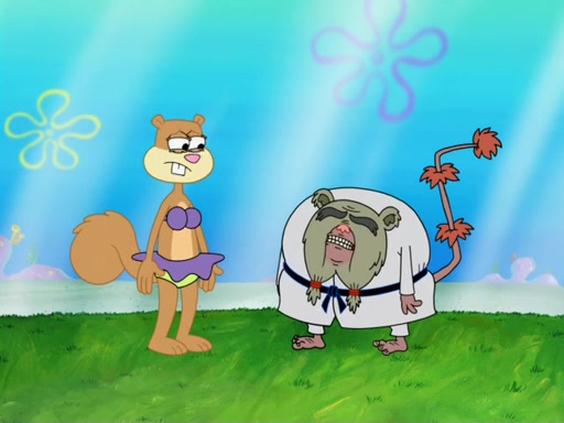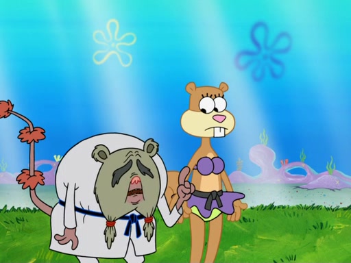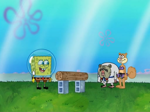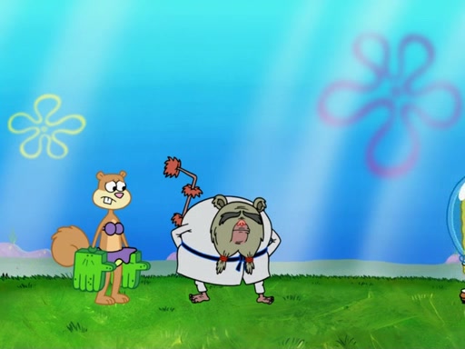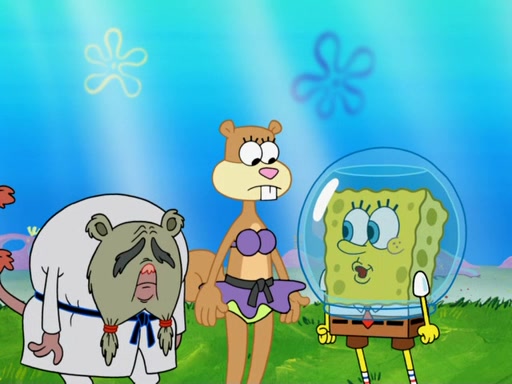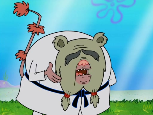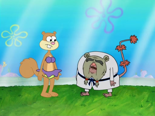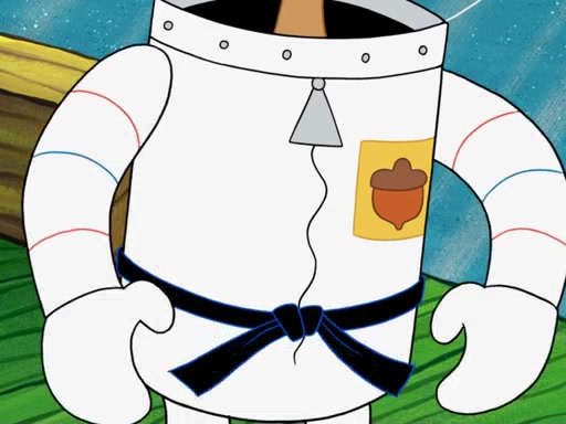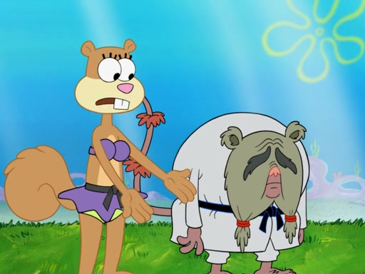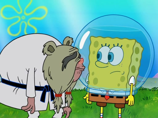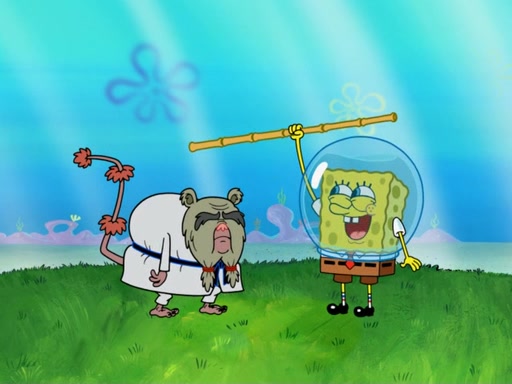 SpongeBob runs home to train himself overnight and then comes back, tired and unrested to spar with Sandy. He does very poorly, falls asleep, and is sad. Fuzzy said if he lasted longer, he would have rewarded SpongeBob with the clear belt, but says that SpongeBob is not even worthy enough to wear the belt that keeps his pants up, so he takes his belt and his pants fall. He also takes Sandy's black belt away for wasting his time with SpongeBob. He leaves and Sandy tries to talk Fuzzy into giving SpongeBob another chance, but Fuzzy never gives two chances and wishes to find food. Suddenly, Sandy then gets an idea. She convinces Fuzzy to come to the Krusty Krab to see SpongeBob in action, so he goes (without an air helmet) to see him. He watches, and is still not impressed by SpongeBob's agility. He is only amazed when SpongeBob manages to slice Sandy's burger in twelfths with his hand. Fuzzy starts to think SpongeBob is more skilled than he thought, so he tries to attack SpongeBob, but SpongeBob is so busy that he doesn't notice Fuzzy sneaking up on him and dodges Fuzzy. Fuzzy decides he has had enough and tries to finish it, but SpongeBob bends over to get a dropped ketchup bottle, dodging Fuzzy's kick, sending him over to the door of the Krusty Krab. He looks terrible, but Sandy says Fuzzy just needs an air helmet. She gives him one, and he admits that SpongeBob is a worthy karate fighter, and so, he gives SpongeBob a black belt. As well, he gives Sandy his blacker belt for proving that SpongeBob does know karate. Without his belt, Fuzzy's pants fall down, revealing his underwear. The whole crowd cheers with laughter.