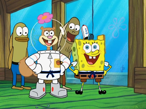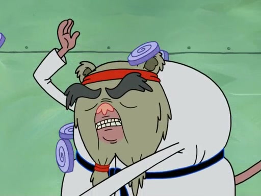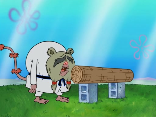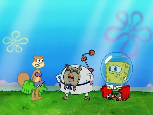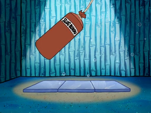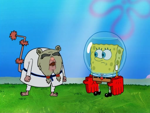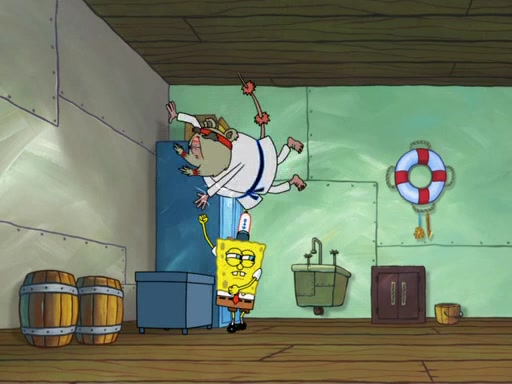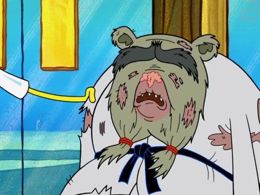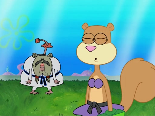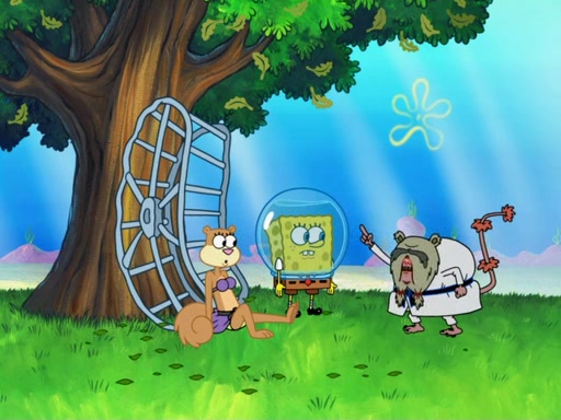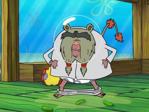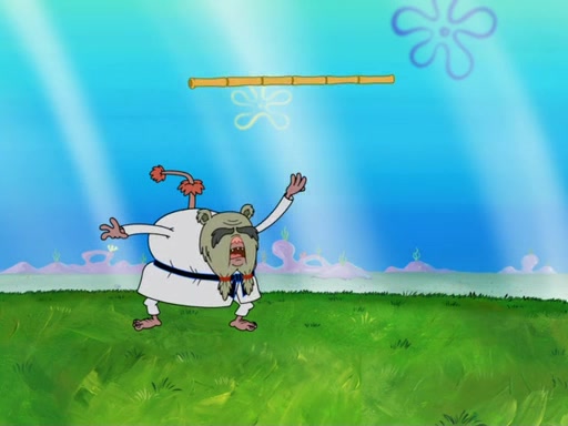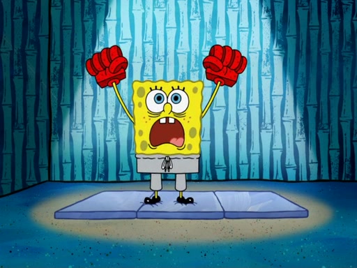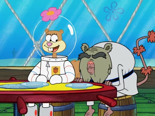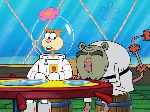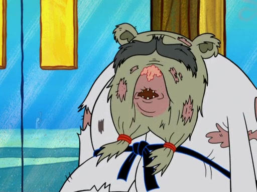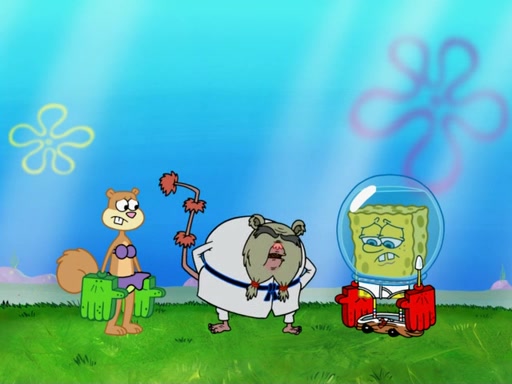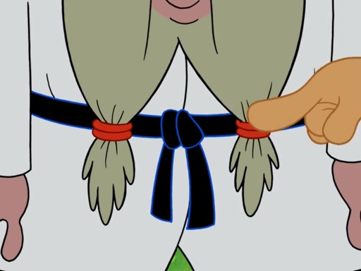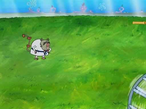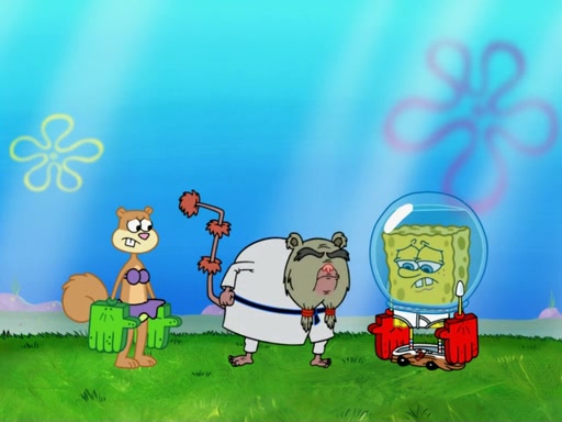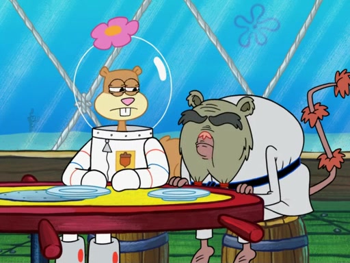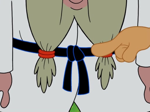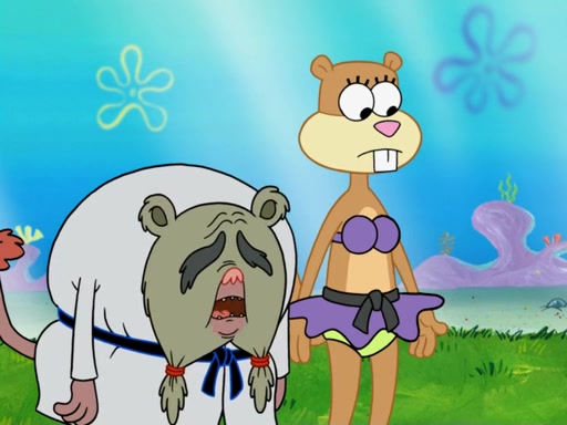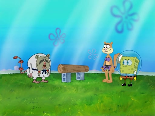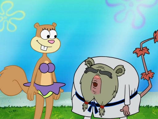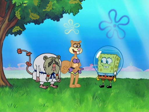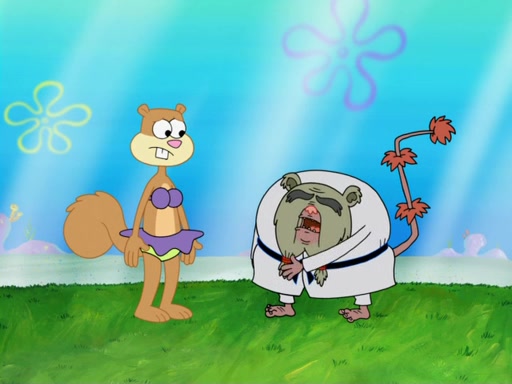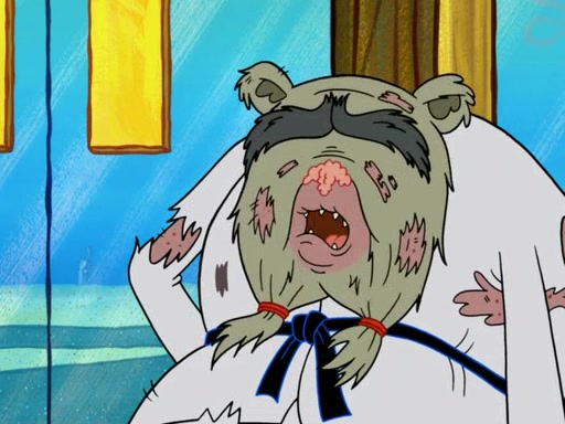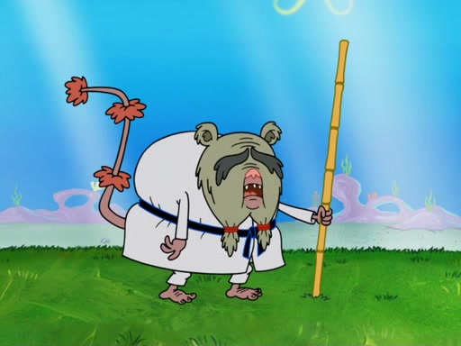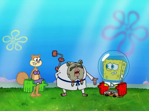 SpongeBob runs home to train himself overnight and then comes back, tired and unrested to spar with Sandy. He does very poorly, falls asleep, and is sad. Fuzzy said if he lasted longer, he would have rewarded SpongeBob with the clear belt, but says that SpongeBob is not even worthy enough to wear the belt that keeps his pants up, so he takes his belt and his pants fall. He also takes Sandy's black belt away for wasting his time with SpongeBob. He leaves and Sandy tries to talk Fuzzy into giving SpongeBob another chance, but Fuzzy never gives two chances and wishes to find food. Suddenly, Sandy then gets an idea. She convinces Fuzzy to come to the Krusty Krab to see SpongeBob in action, so he goes (without an air helmet) to see him. He watches, and is still not impressed by SpongeBob's agility. He is only amazed when SpongeBob manages to slice Sandy's burger in twelfths with his hand. Fuzzy starts to think SpongeBob is more skilled than he thought, so he tries to attack SpongeBob, but SpongeBob is so busy that he doesn't notice Fuzzy sneaking up on him and dodges Fuzzy. Fuzzy decides he has had enough and tries to finish it, but SpongeBob bends over to get a dropped ketchup bottle, dodging Fuzzy's kick, sending him over to the door of the Krusty Krab. He looks terrible, but Sandy says Fuzzy just needs an air helmet. She gives him one, and he admits that SpongeBob is a worthy karate fighter, and so, he gives SpongeBob a black belt. As well, he gives Sandy his blacker belt for proving that SpongeBob does know karate. Without his belt, Fuzzy's pants fall down, revealing his underwear. The whole crowd cheers with laughter.