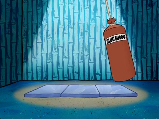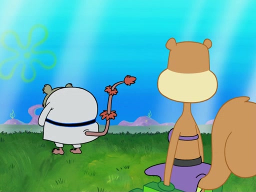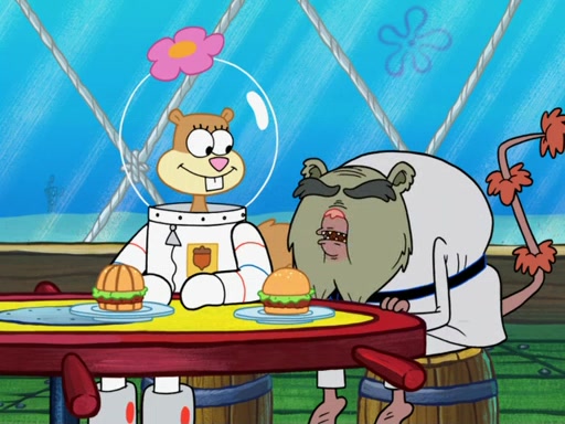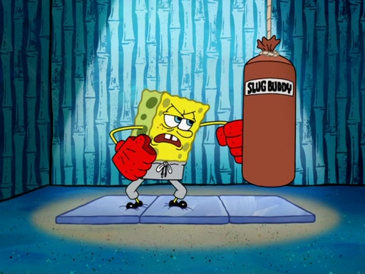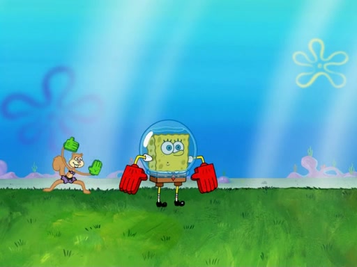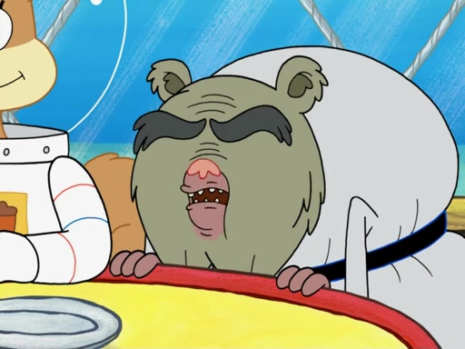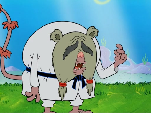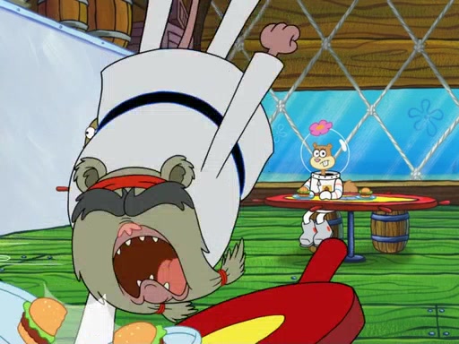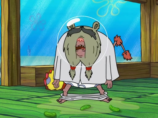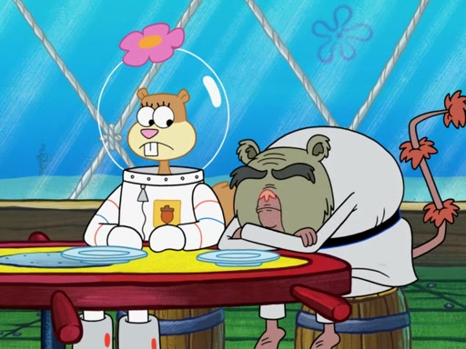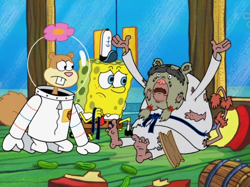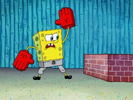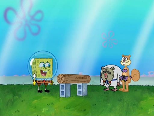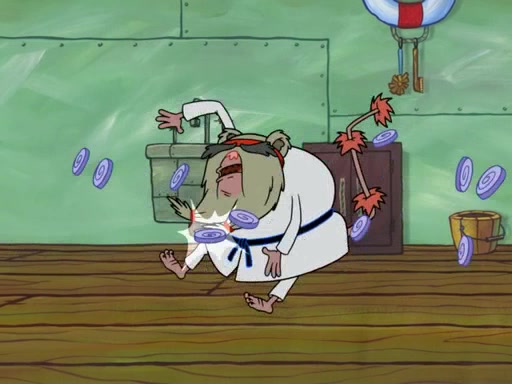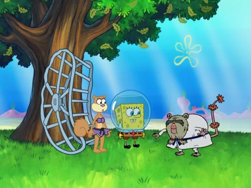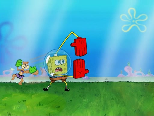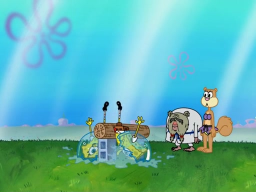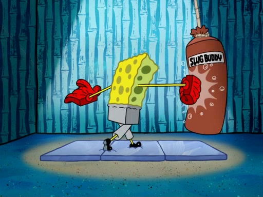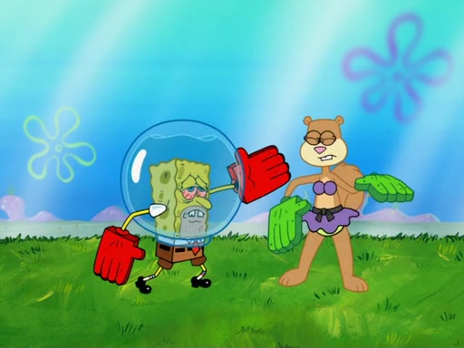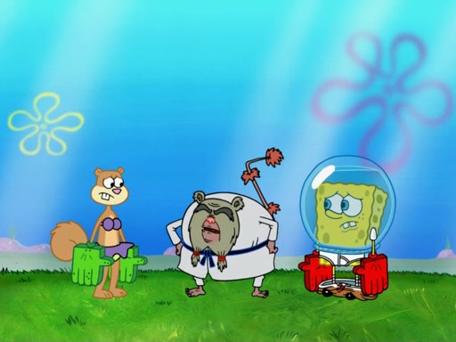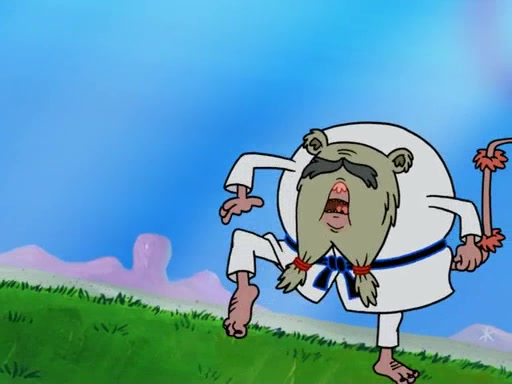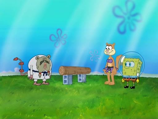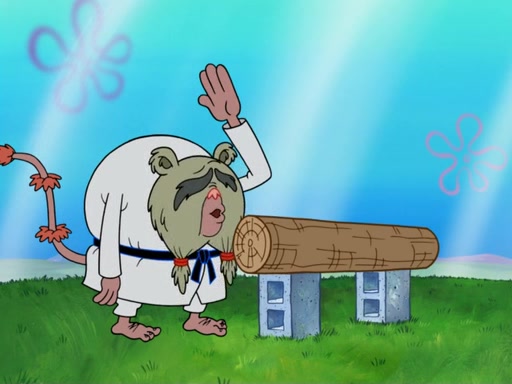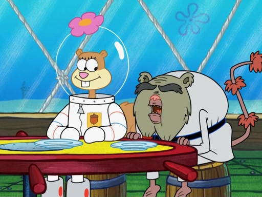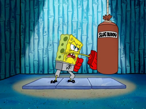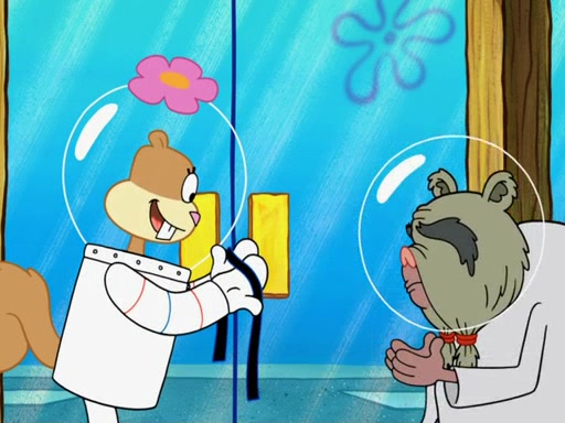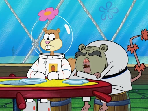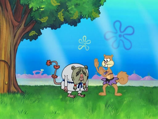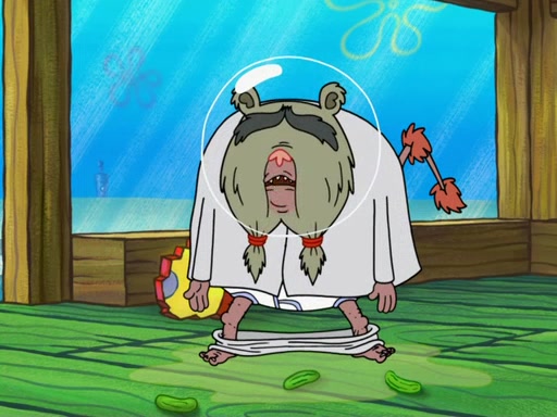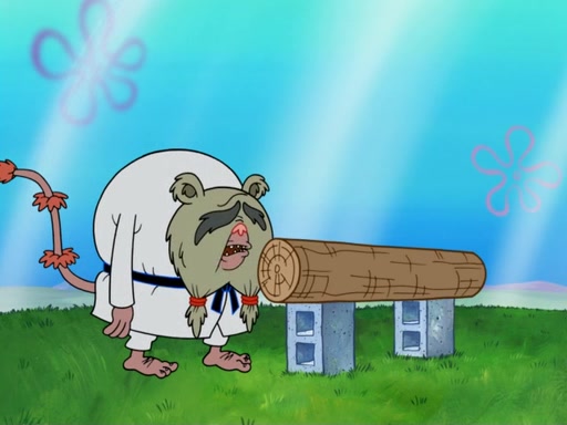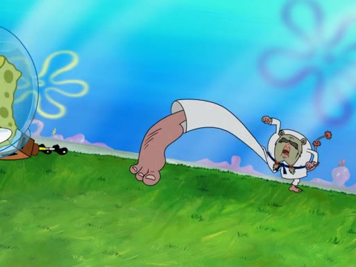 SpongeBob runs home to train himself overnight and then comes back, tired and unrested to spar with Sandy. He does very poorly, falls asleep, and is sad. Fuzzy said if he lasted longer, he would have rewarded SpongeBob with the clear belt, but says that SpongeBob is not even worthy enough to wear the belt that keeps his pants up, so he takes his belt and his pants fall. He also takes Sandy's black belt away for wasting his time with SpongeBob. He leaves and Sandy tries to talk Fuzzy into giving SpongeBob another chance, but Fuzzy never gives two chances and wishes to find food. Suddenly, Sandy then gets an idea. She convinces Fuzzy to come to the Krusty Krab to see SpongeBob in action, so he goes (without an air helmet) to see him. He watches, and is still not impressed by SpongeBob's agility. He is only amazed when SpongeBob manages to slice Sandy's burger in twelfths with his hand. Fuzzy starts to think SpongeBob is more skilled than he thought, so he tries to attack SpongeBob, but SpongeBob is so busy that he doesn't notice Fuzzy sneaking up on him and dodges Fuzzy. Fuzzy decides he has had enough and tries to finish it, but SpongeBob bends over to get a dropped ketchup bottle, dodging Fuzzy's kick, sending him over to the door of the Krusty Krab. He looks terrible, but Sandy says Fuzzy just needs an air helmet. She gives him one, and he admits that SpongeBob is a worthy karate fighter, and so, he gives SpongeBob a black belt. As well, he gives Sandy his blacker belt for proving that SpongeBob does know karate. Without his belt, Fuzzy's pants fall down, revealing his underwear. The whole crowd cheers with laughter.