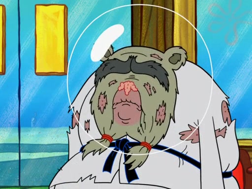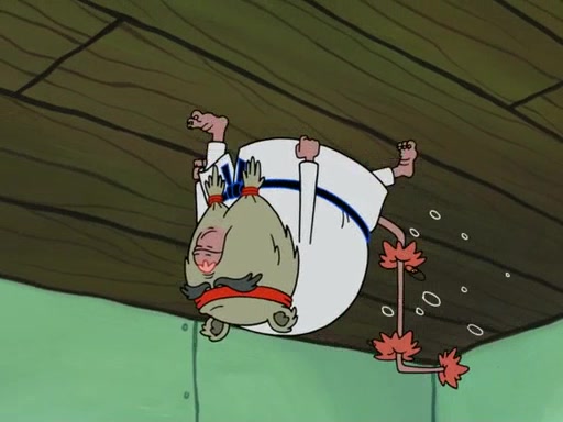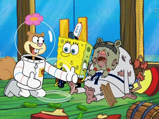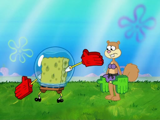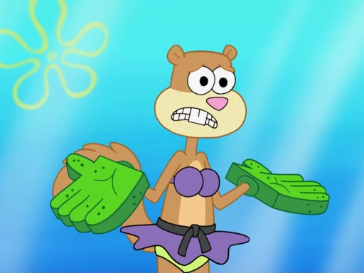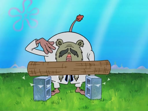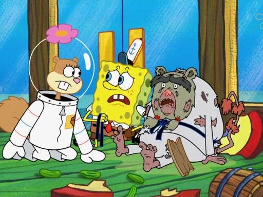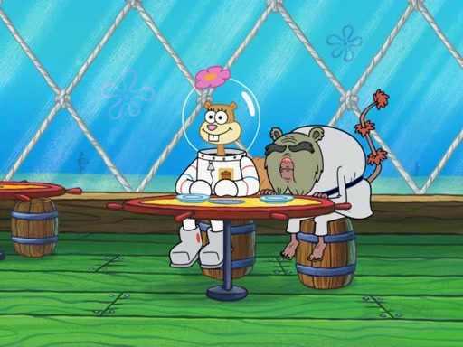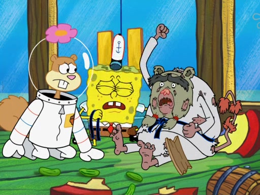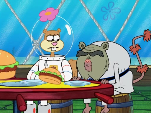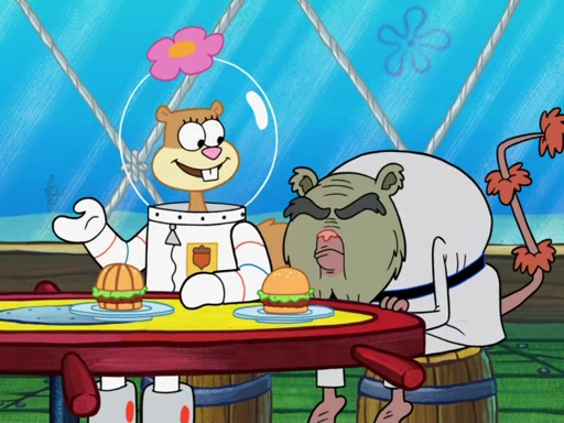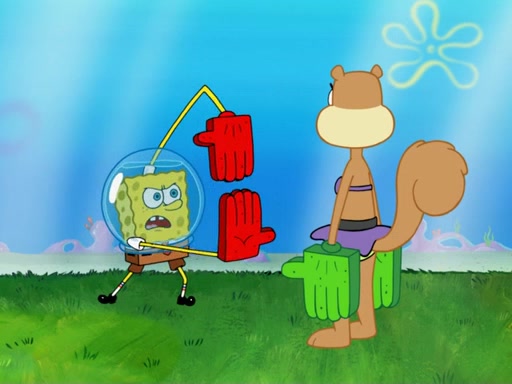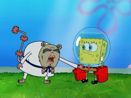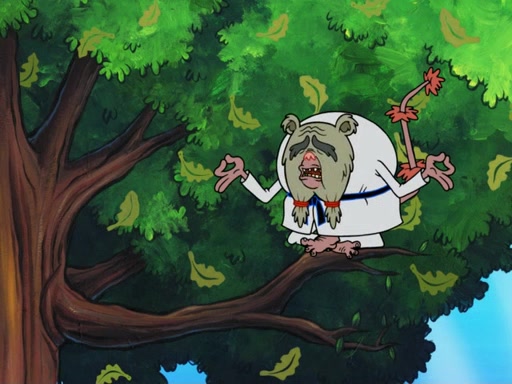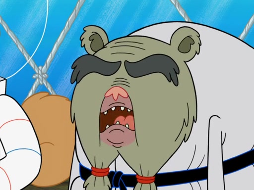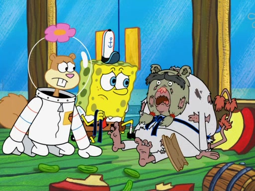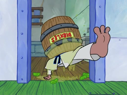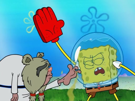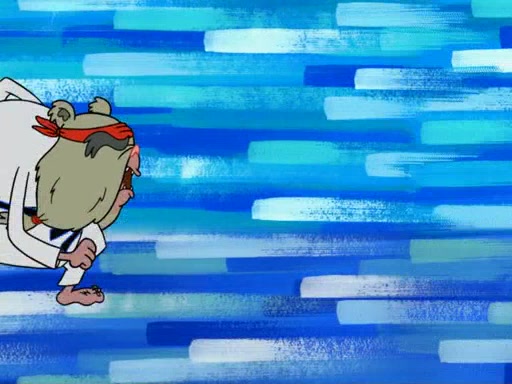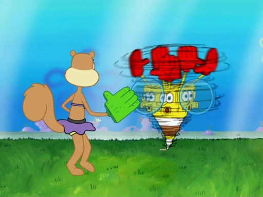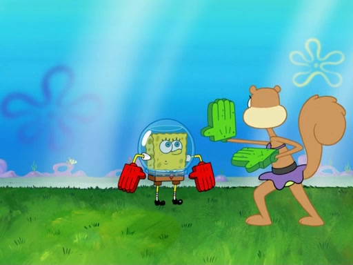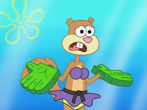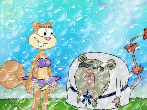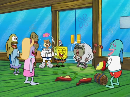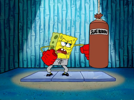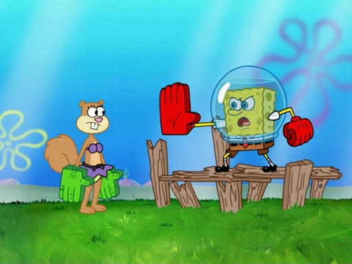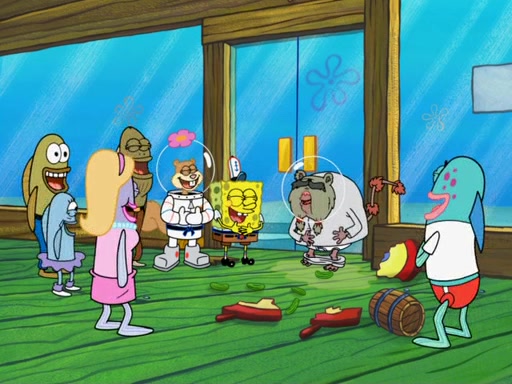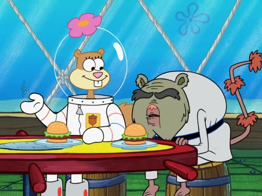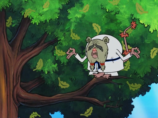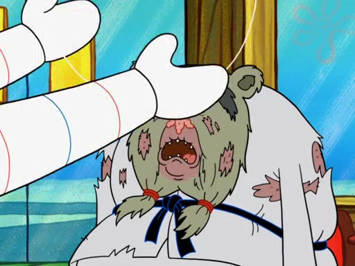 SpongeBob runs home to train himself overnight and then comes back, tired and unrested to spar with Sandy. He does very poorly, falls asleep, and is sad. Fuzzy said if he lasted longer, he would have rewarded SpongeBob with the clear belt, but says that SpongeBob is not even worthy enough to wear the belt that keeps his pants up, so he takes his belt and his pants fall. He also takes Sandy's black belt away for wasting his time with SpongeBob. He leaves and Sandy tries to talk Fuzzy into giving SpongeBob another chance, but Fuzzy never gives two chances and wishes to find food. Suddenly, Sandy then gets an idea. She convinces Fuzzy to come to the Krusty Krab to see SpongeBob in action, so he goes (without an air helmet) to see him. He watches, and is still not impressed by SpongeBob's agility. He is only amazed when SpongeBob manages to slice Sandy's burger in twelfths with his hand. Fuzzy starts to think SpongeBob is more skilled than he thought, so he tries to attack SpongeBob, but SpongeBob is so busy that he doesn't notice Fuzzy sneaking up on him and dodges Fuzzy. Fuzzy decides he has had enough and tries to finish it, but SpongeBob bends over to get a dropped ketchup bottle, dodging Fuzzy's kick, sending him over to the door of the Krusty Krab. He looks terrible, but Sandy says Fuzzy just needs an air helmet. She gives him one, and he admits that SpongeBob is a worthy karate fighter, and so, he gives SpongeBob a black belt. As well, he gives Sandy his blacker belt for proving that SpongeBob does know karate. Without his belt, Fuzzy's pants fall down, revealing his underwear. The whole crowd cheers with laughter.