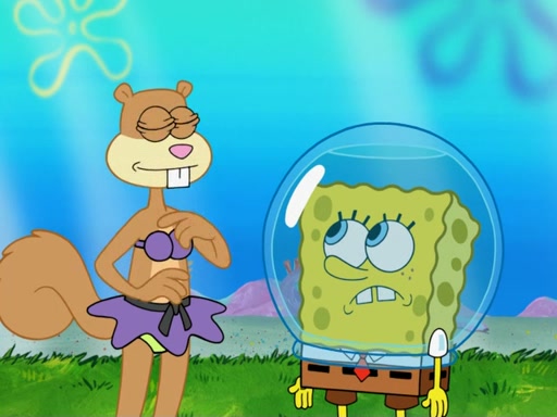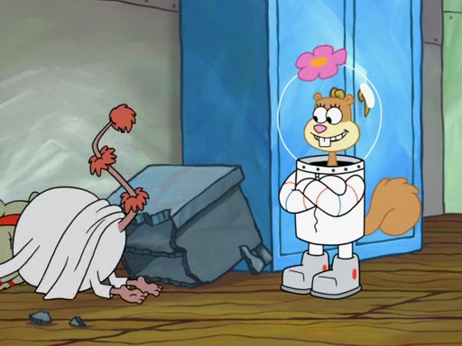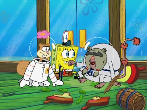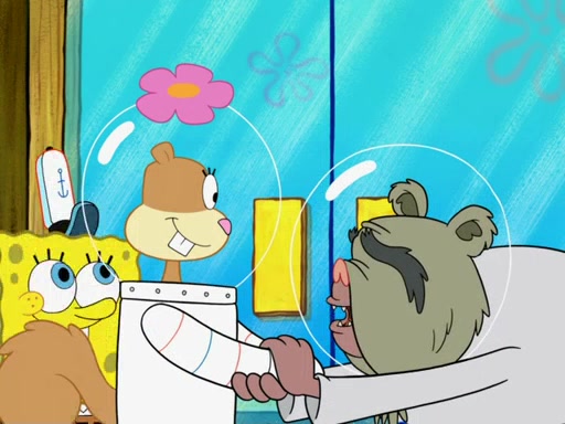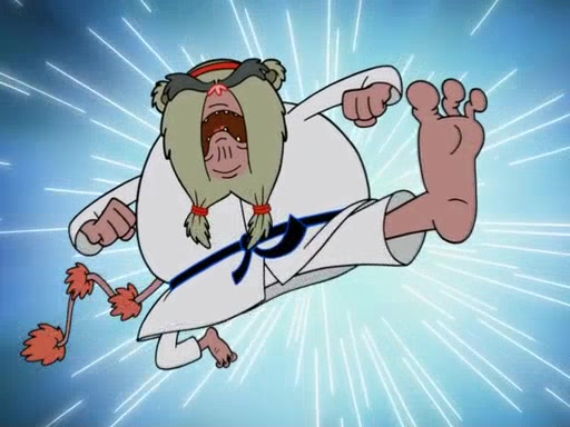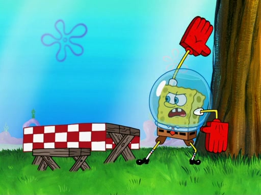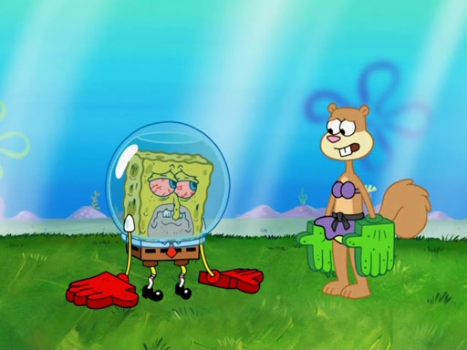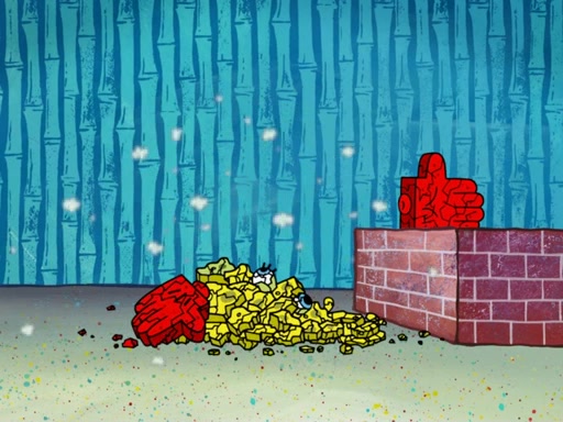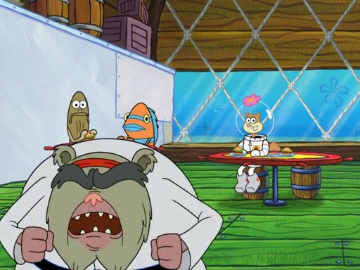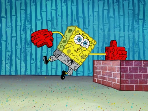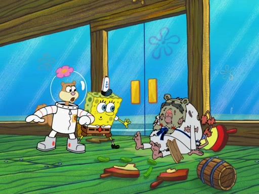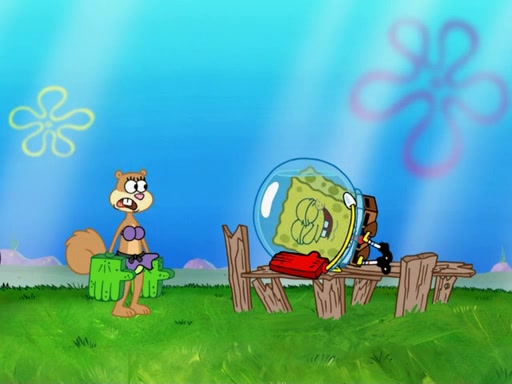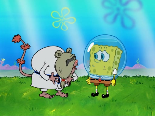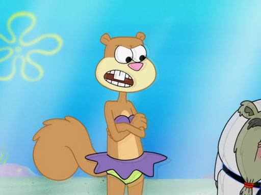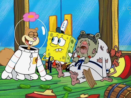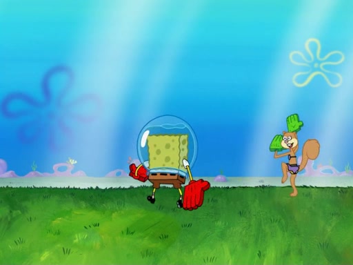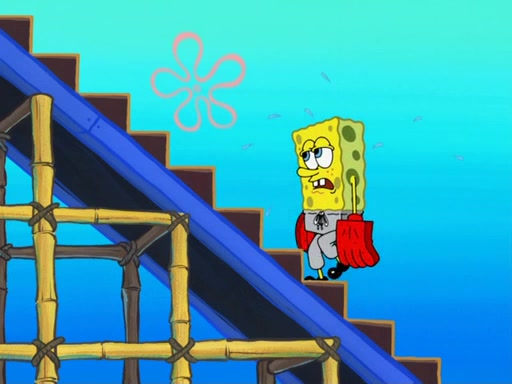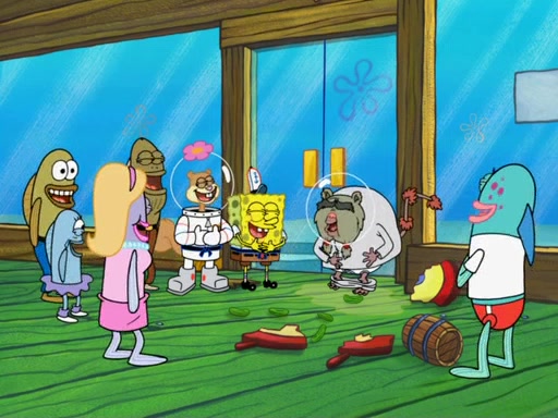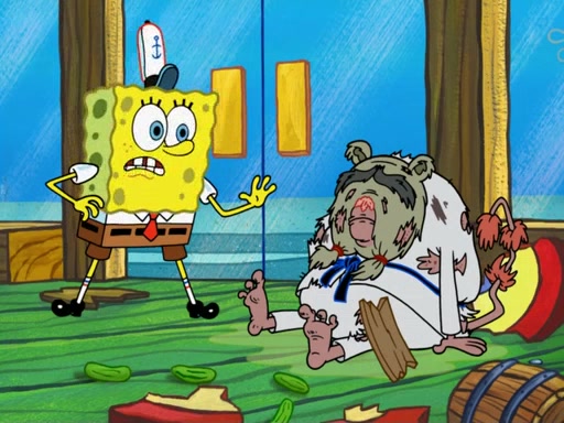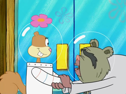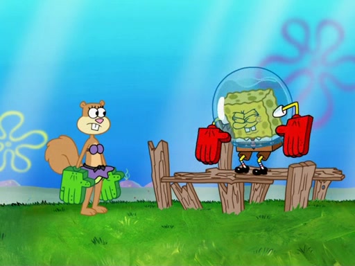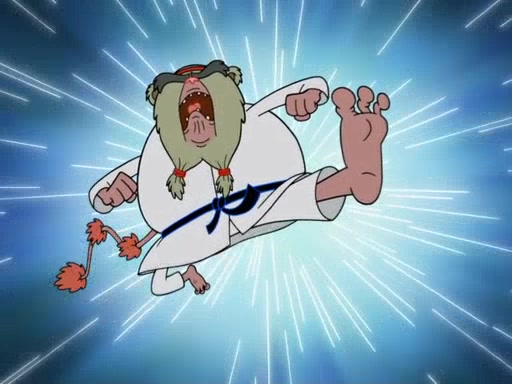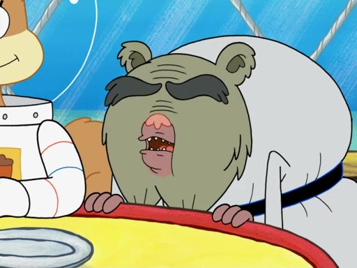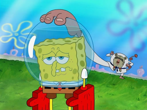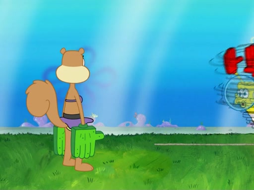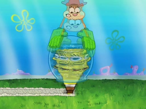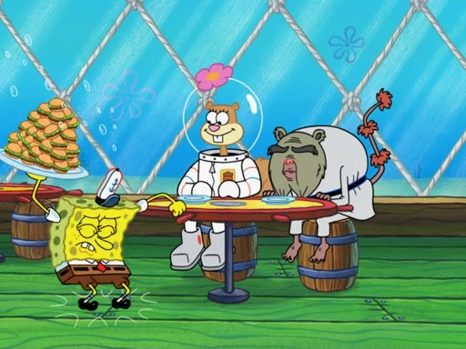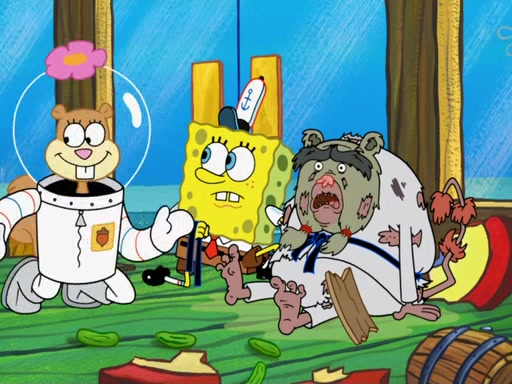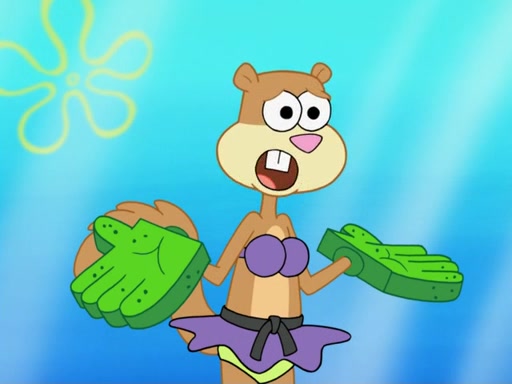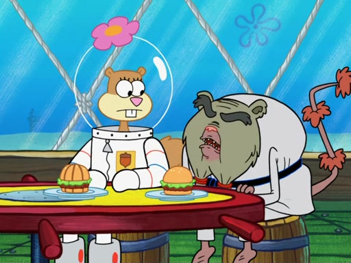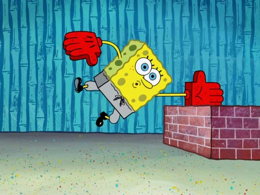 SpongeBob runs home to train himself overnight and then comes back, tired and unrested to spar with Sandy. He does very poorly, falls asleep, and is sad. Fuzzy said if he lasted longer, he would have rewarded SpongeBob with the clear belt, but says that SpongeBob is not even worthy enough to wear the belt that keeps his pants up, so he takes his belt and his pants fall. He also takes Sandy's black belt away for wasting his time with SpongeBob. He leaves and Sandy tries to talk Fuzzy into giving SpongeBob another chance, but Fuzzy never gives two chances and wishes to find food. Suddenly, Sandy then gets an idea. She convinces Fuzzy to come to the Krusty Krab to see SpongeBob in action, so he goes (without an air helmet) to see him. He watches, and is still not impressed by SpongeBob's agility. He is only amazed when SpongeBob manages to slice Sandy's burger in twelfths with his hand. Fuzzy starts to think SpongeBob is more skilled than he thought, so he tries to attack SpongeBob, but SpongeBob is so busy that he doesn't notice Fuzzy sneaking up on him and dodges Fuzzy. Fuzzy decides he has had enough and tries to finish it, but SpongeBob bends over to get a dropped ketchup bottle, dodging Fuzzy's kick, sending him over to the door of the Krusty Krab. He looks terrible, but Sandy says Fuzzy just needs an air helmet. She gives him one, and he admits that SpongeBob is a worthy karate fighter, and so, he gives SpongeBob a black belt. As well, he gives Sandy his blacker belt for proving that SpongeBob does know karate. Without his belt, Fuzzy's pants fall down, revealing his underwear. The whole crowd cheers with laughter.