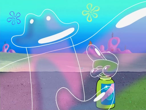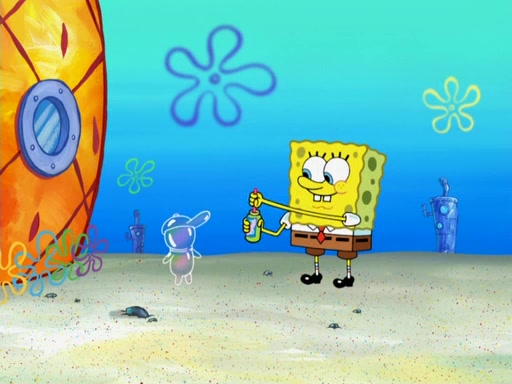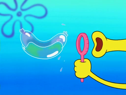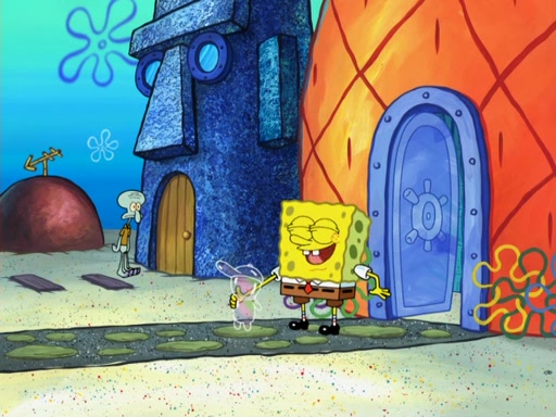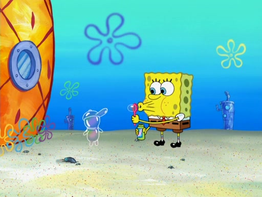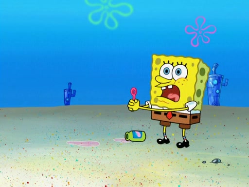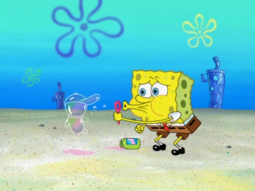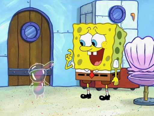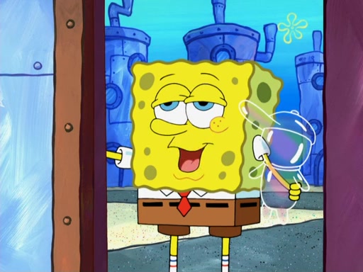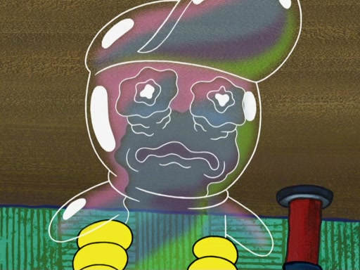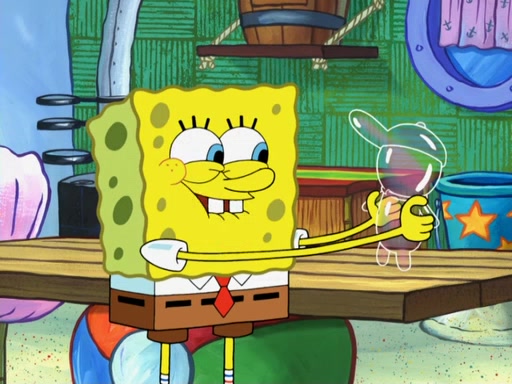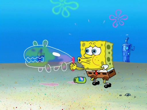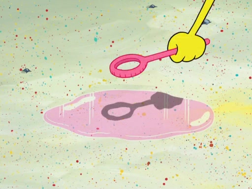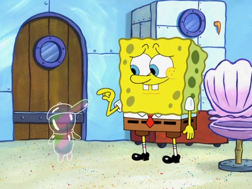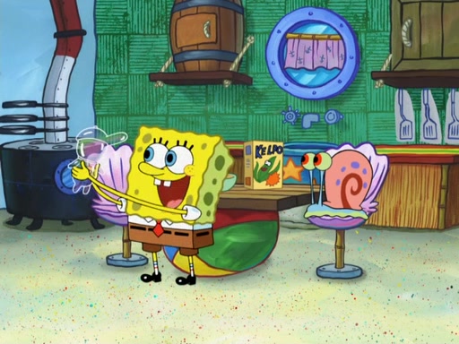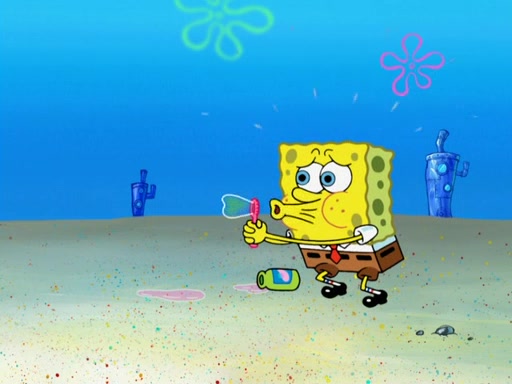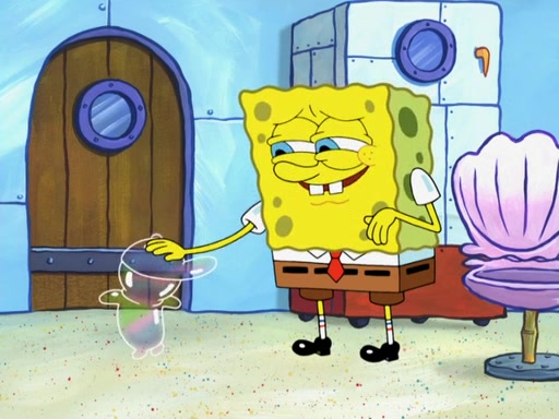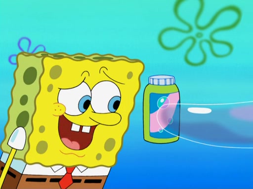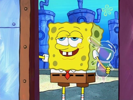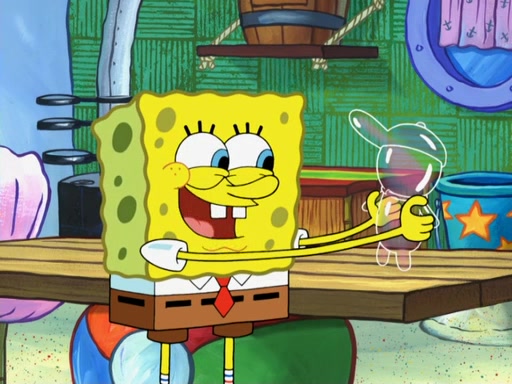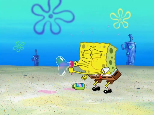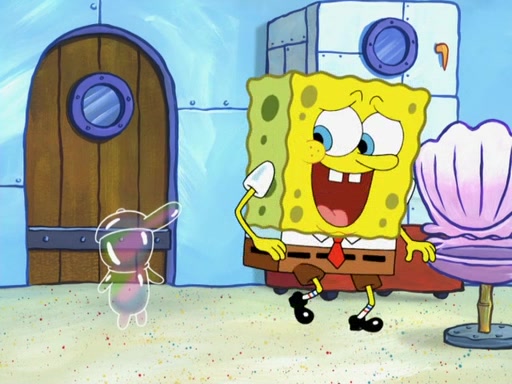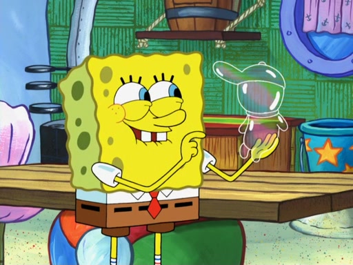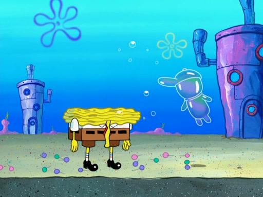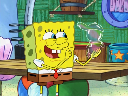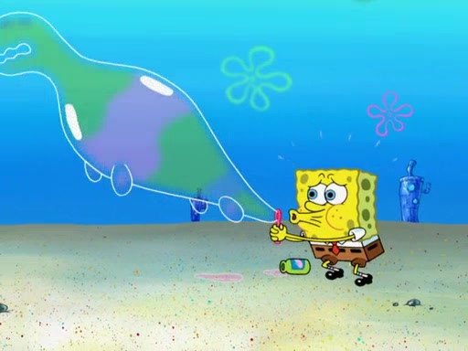 He went into the pin factory, the scissor works, and he went into the pitchfork pantry. Then, SpongeBob decided to go to the pillow foundry and he found out that was a dangerous place too. When they got home, he fed Shiny a hot dog. But then he popped, and SpongeBob had the bubble soap to repair him. Finally, when he blew another Shiny, he grew two heads. Then, Bubble Buddy came to his house to pick up Shiny. SpongeBob begins to apologize about Shiny, but Bubble Buddy says that it was okay, because sometimes, it had happened to Shiny. Then, he traps Shiny into a bottle of bubble soap. As they were leaving on a bubble plane, Shiny is normal again, blowing a raspberry out from the bottle and they went into the plane and flew away.