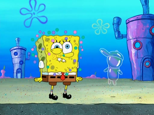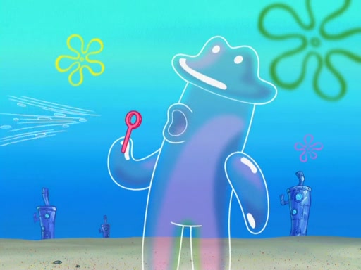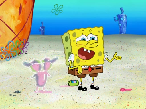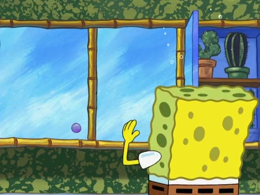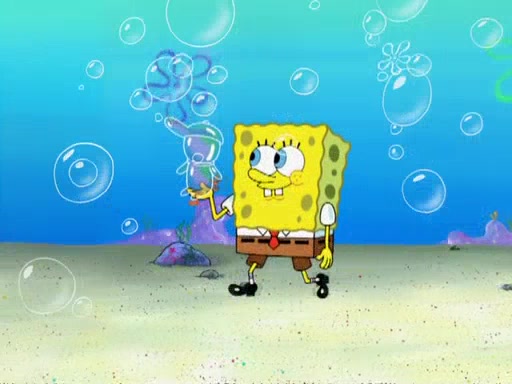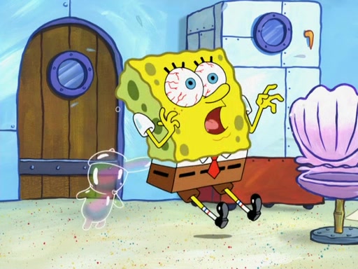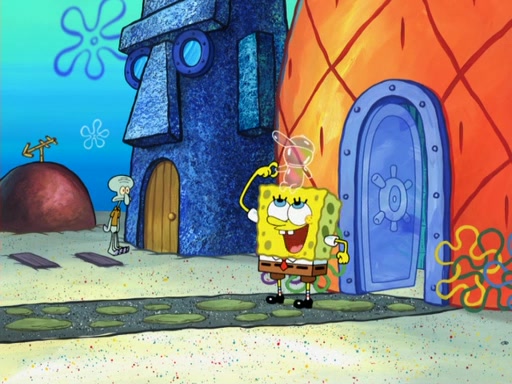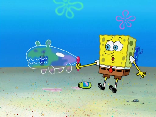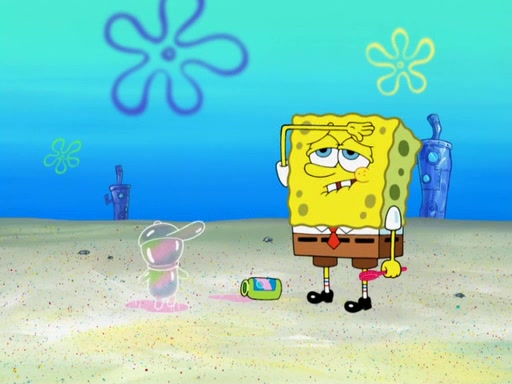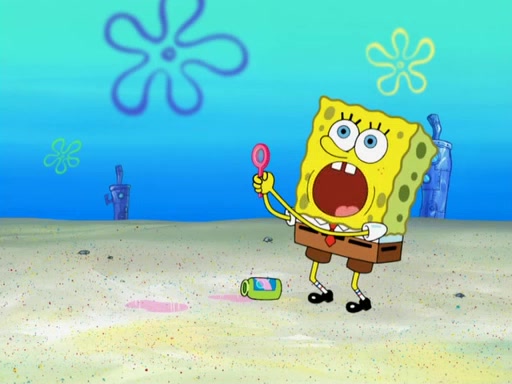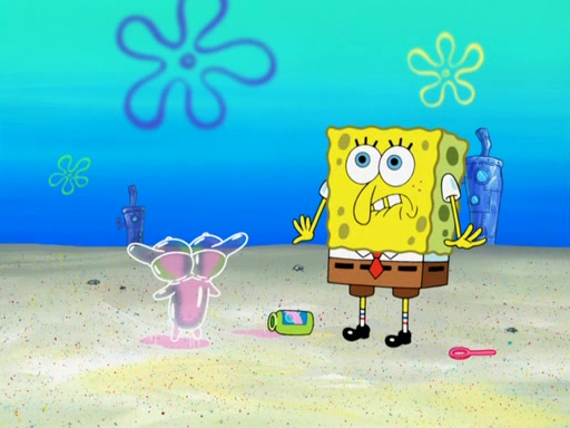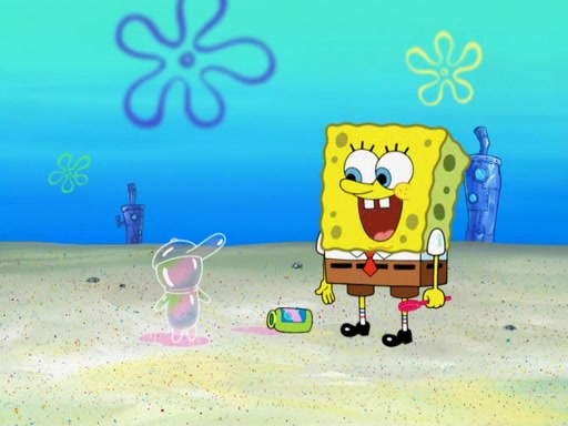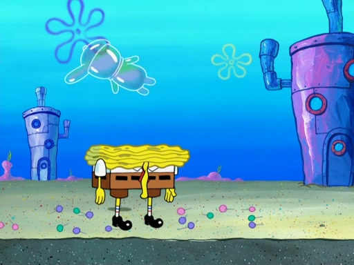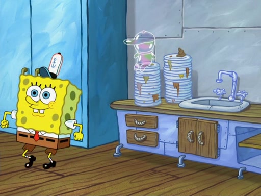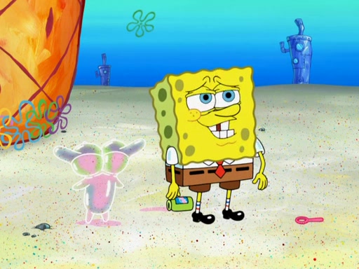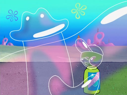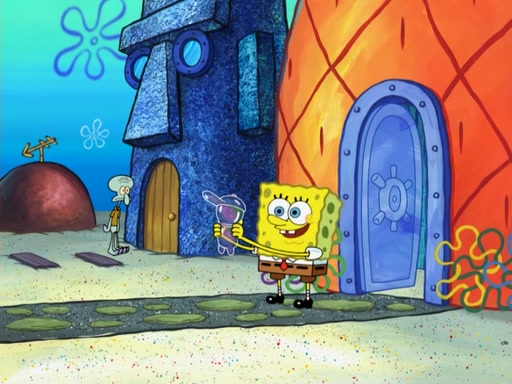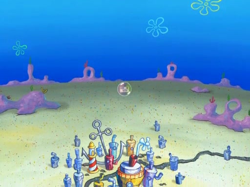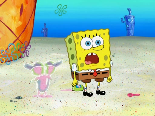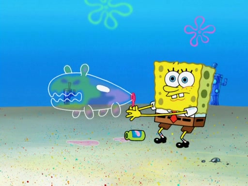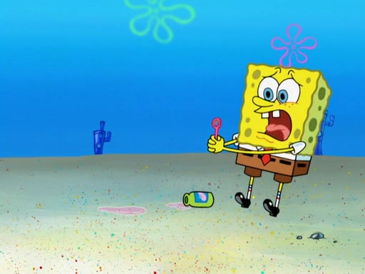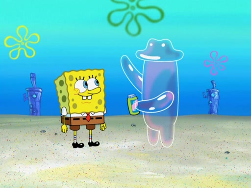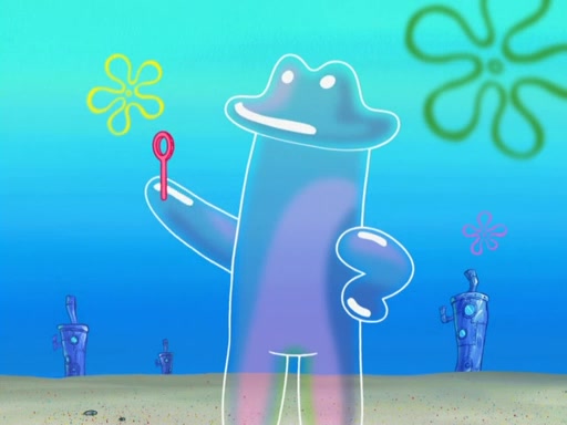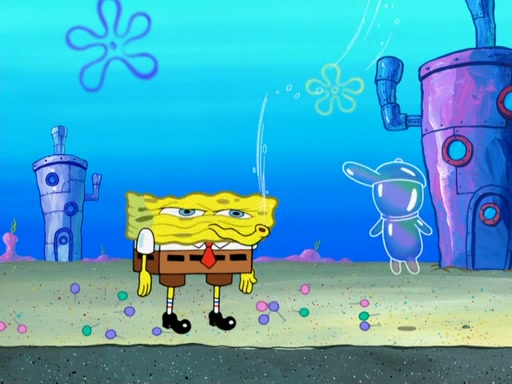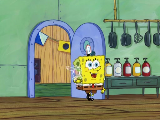 He went into the pin factory, the scissor works, and he went into the pitchfork pantry. Then, SpongeBob decided to go to the pillow foundry and he found out that was a dangerous place too. When they got home, he fed Shiny a hot dog. But then he popped, and SpongeBob had the bubble soap to repair him. Finally, when he blew another Shiny, he grew two heads. Then, Bubble Buddy came to his house to pick up Shiny. SpongeBob begins to apologize about Shiny, but Bubble Buddy says that it was okay, because sometimes, it had happened to Shiny. Then, he traps Shiny into a bottle of bubble soap. As they were leaving on a bubble plane, Shiny is normal again, blowing a raspberry out from the bottle and they went into the plane and flew away.