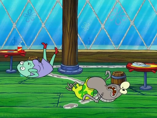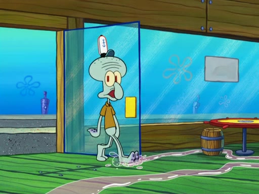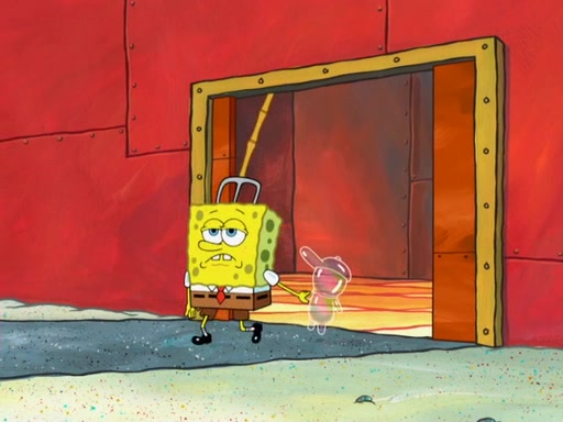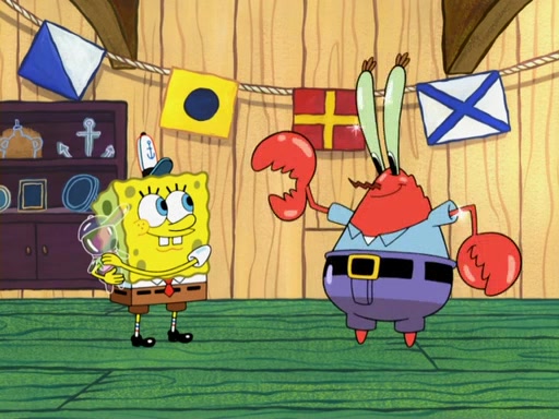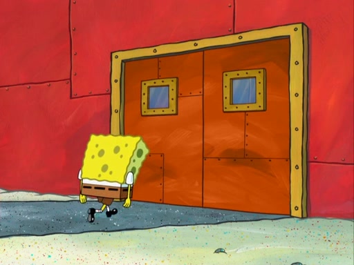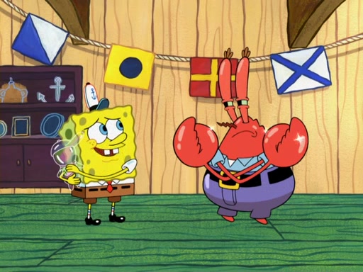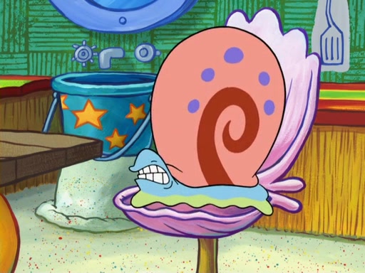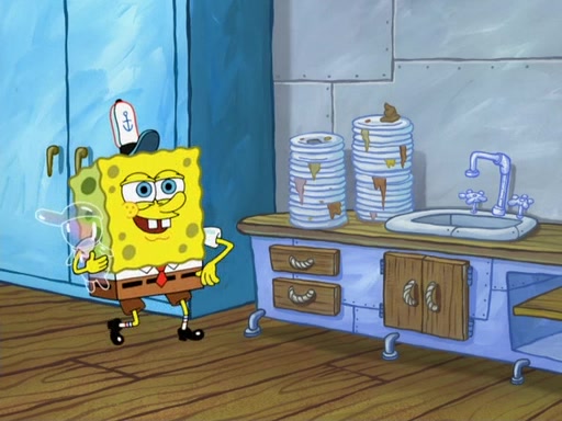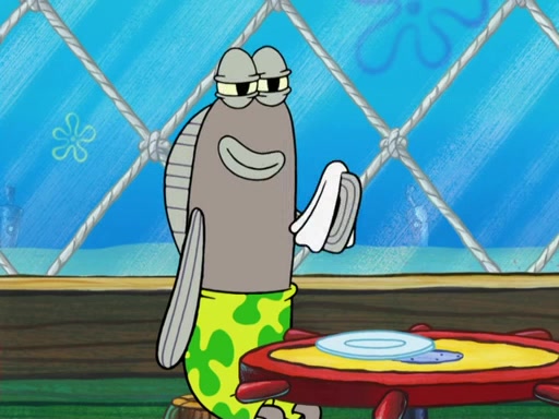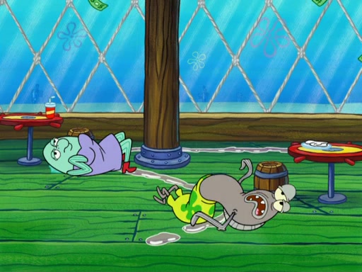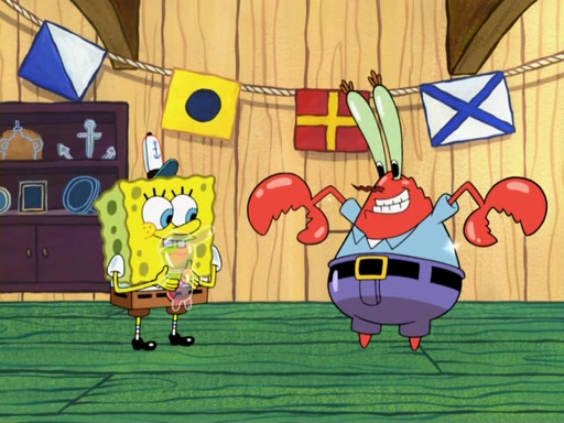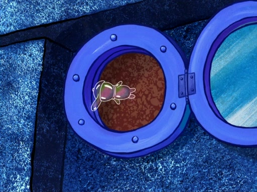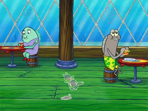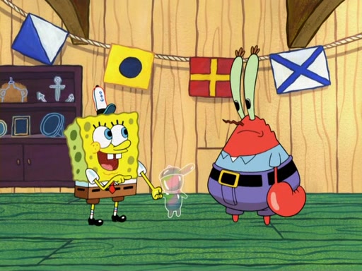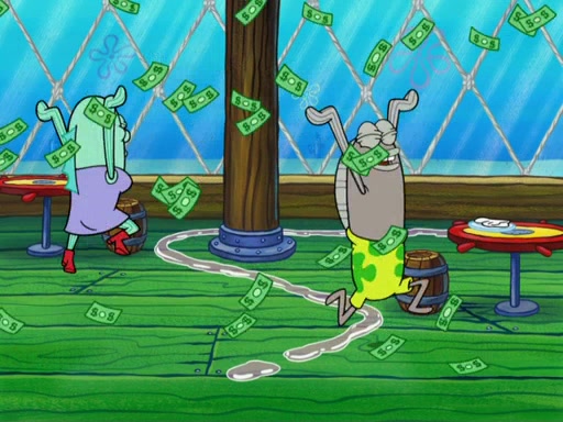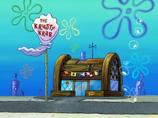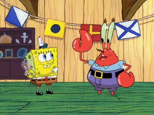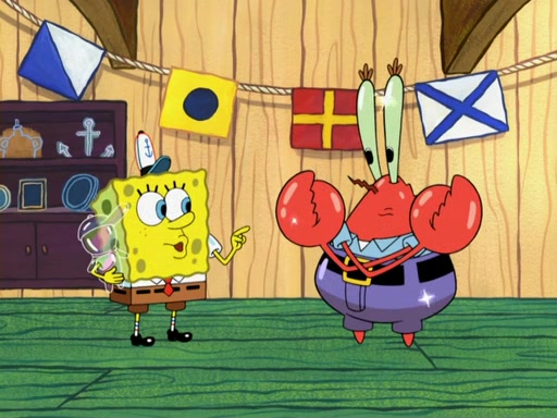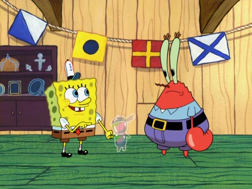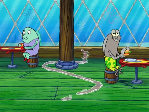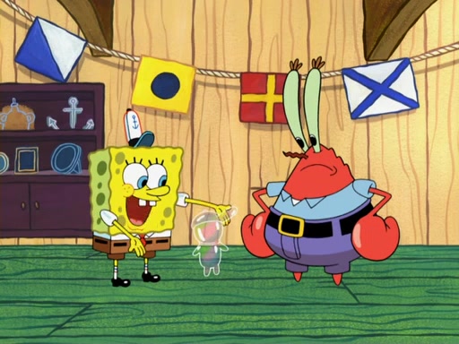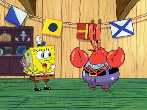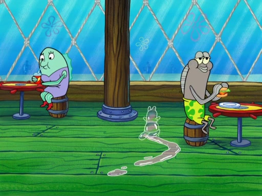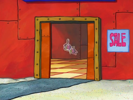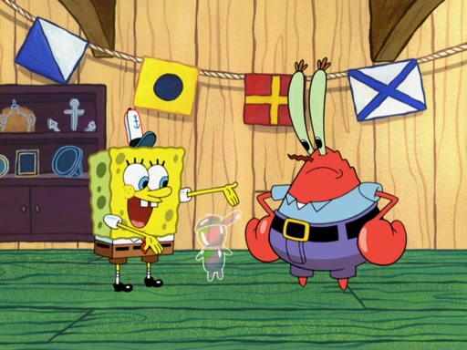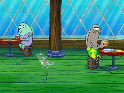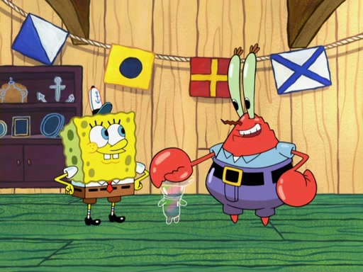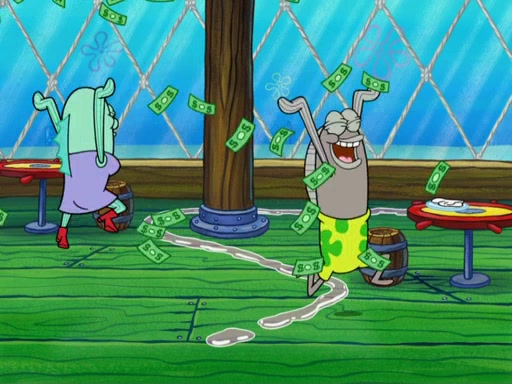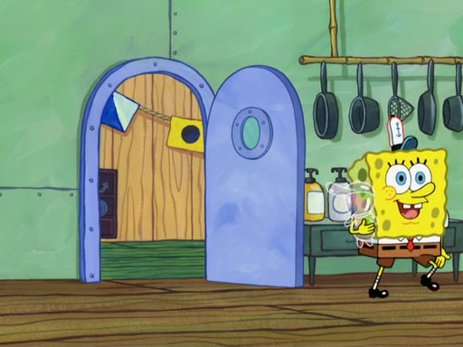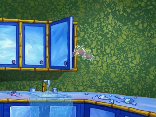 Eventually, SpongeBob catches him and takes Shiny to The Krusty Krab. Then, he went into Mr. Krabs's office and flew everywhere around him. Mr. Krabs was shiny and clean from the bubble soap and told SpongeBob to let Shiny play in the dirty dishes. Then, while SpongeBob was cooking Krabby Patties, Shiny once again gets into mischief by sliding around, and making the Krusty Krab floors slippery. All the customers kept slipping, so Mr. Krabs kicked them out. Then, Shiny flew into the city and got into lots of trouble.