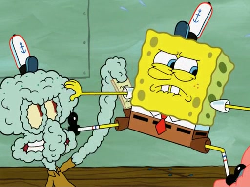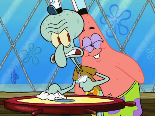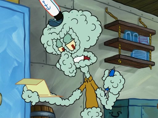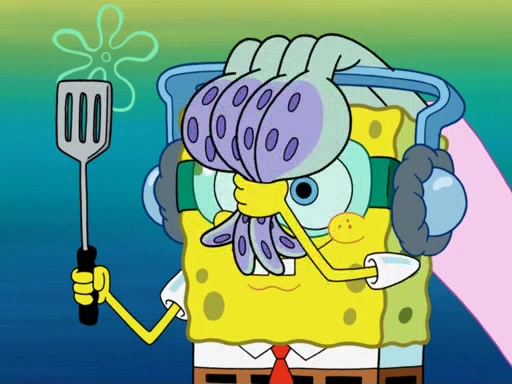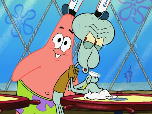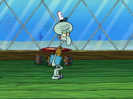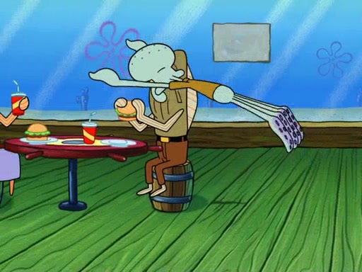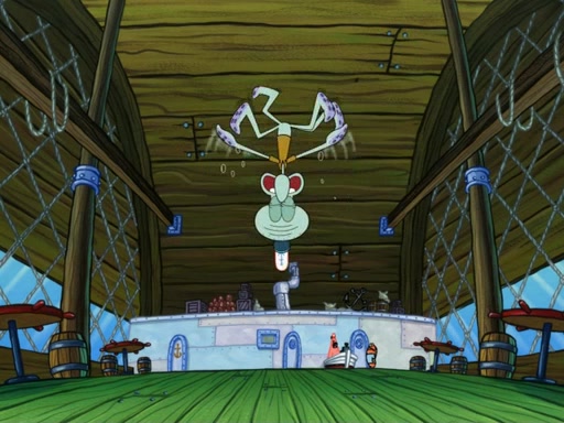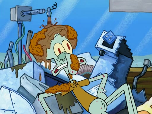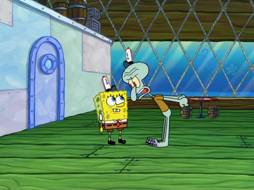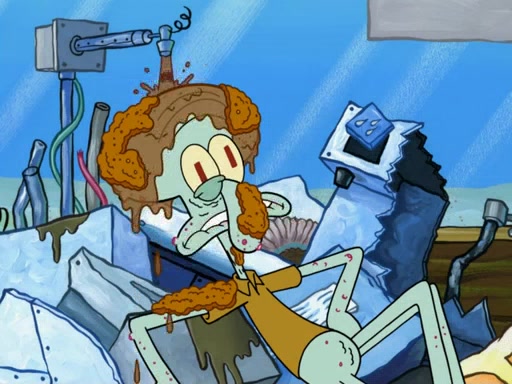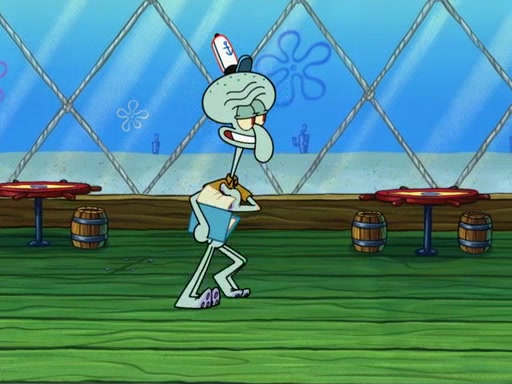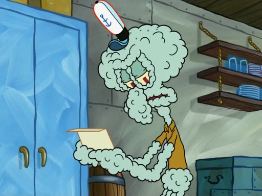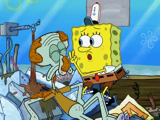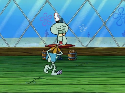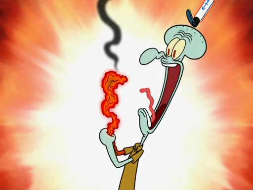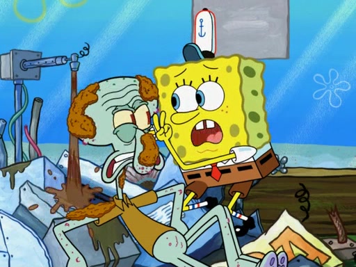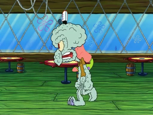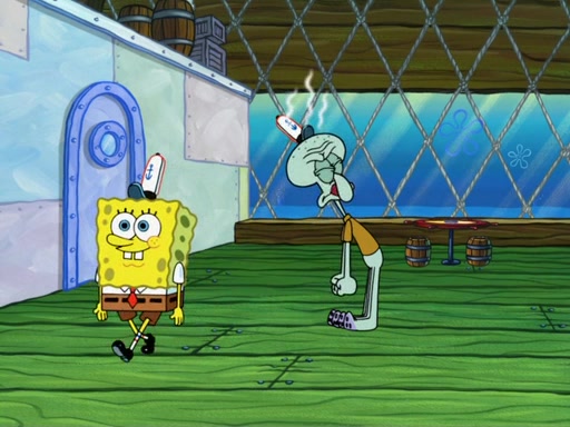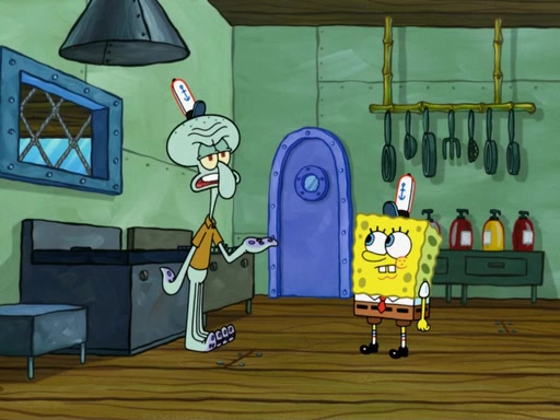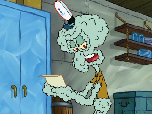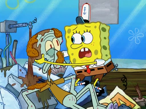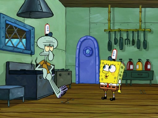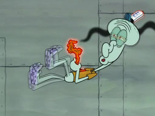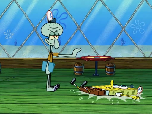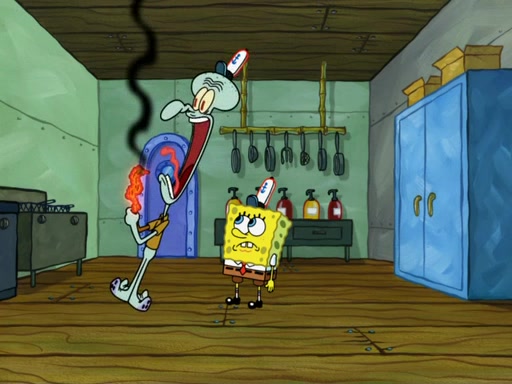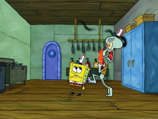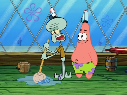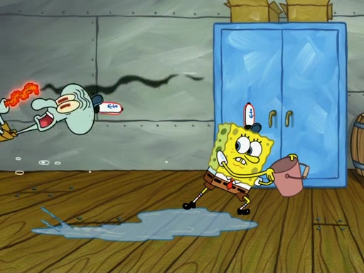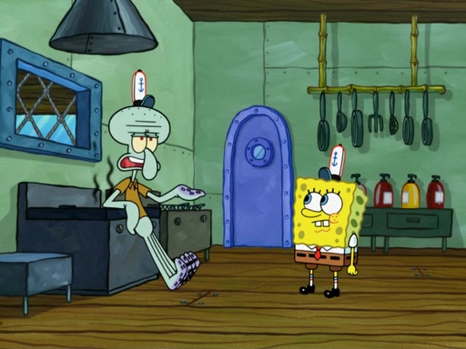 An irritated Squidward enters the kitchen to get it through to SpongeBob. Eventually, he leans on the grill, and accidentally burns his right tentacle. When SpongeBob tries to put the fire out with a bucket of water, he accidentally spills it onto the floor, causing Squidward to slip.