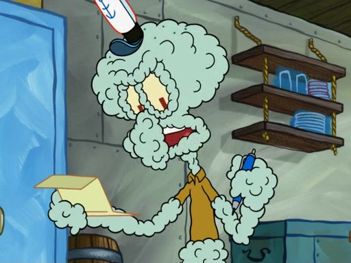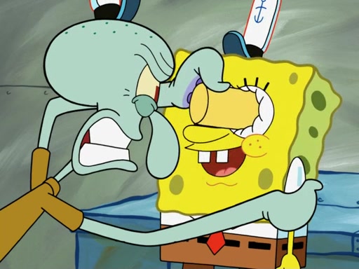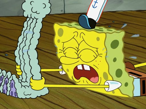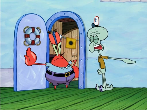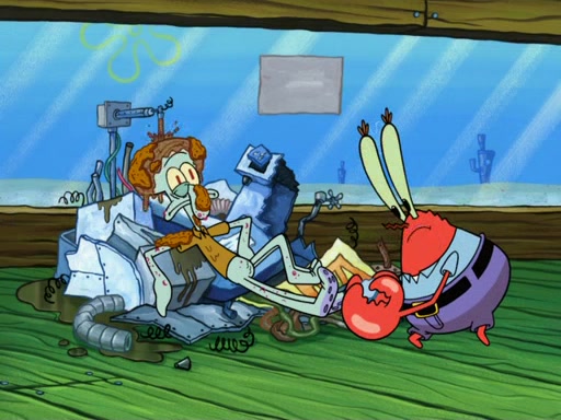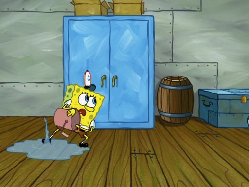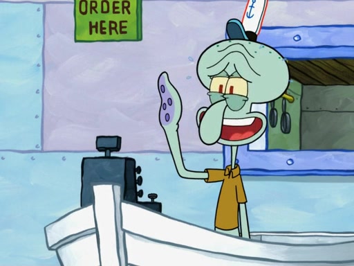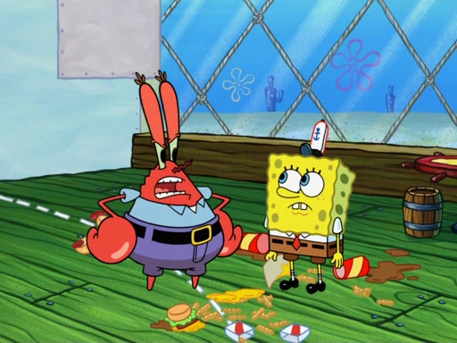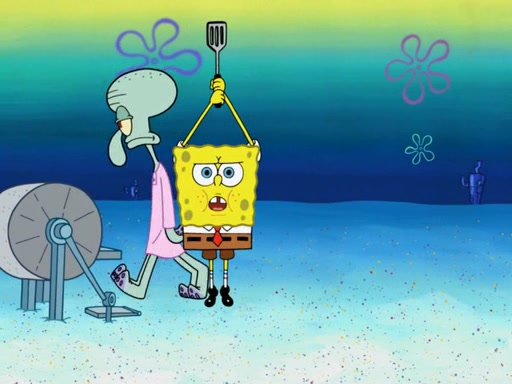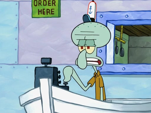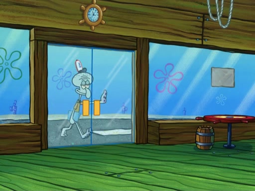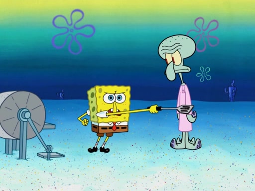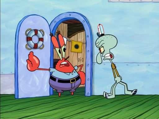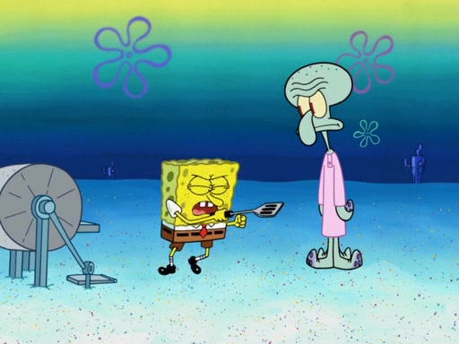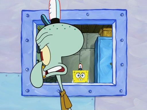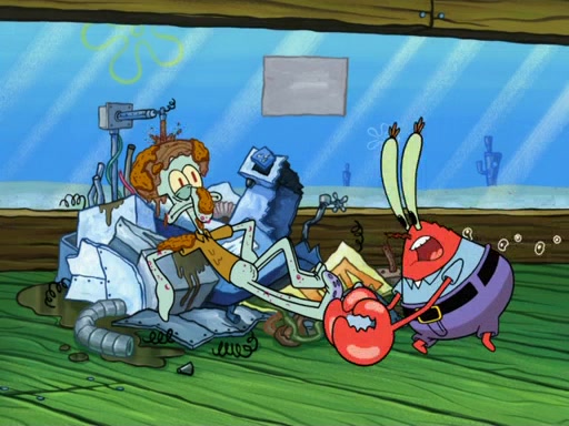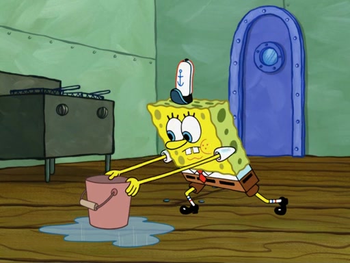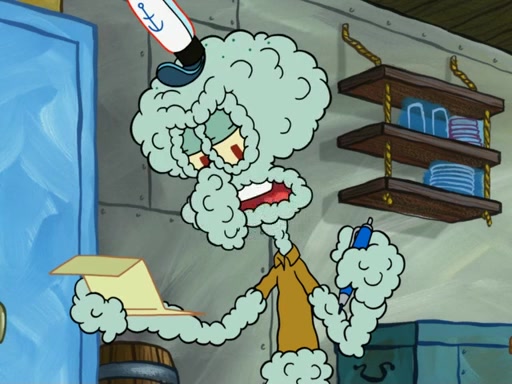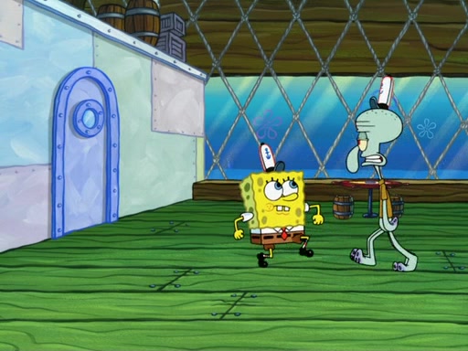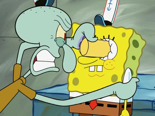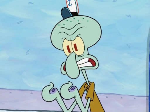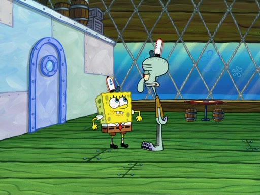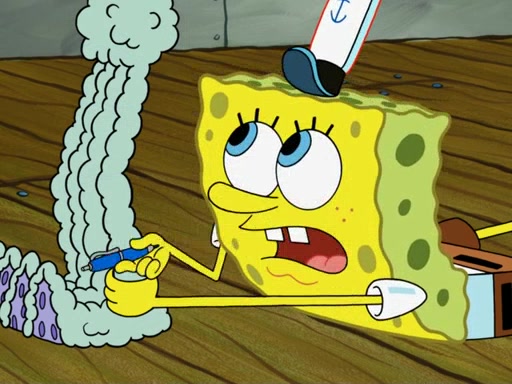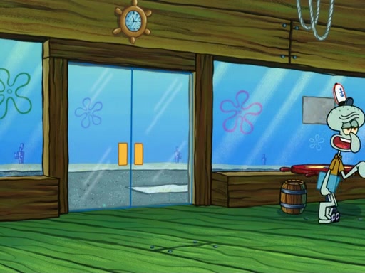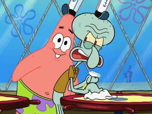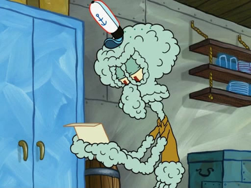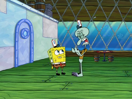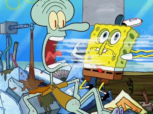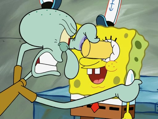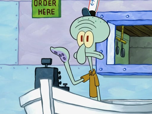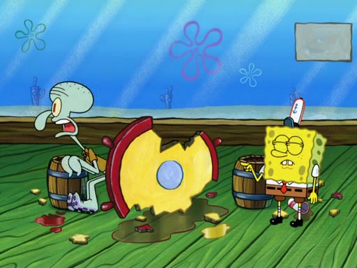 An irritated Squidward enters the kitchen to get it through to SpongeBob. Eventually, he leans on the grill, and accidentally burns his right tentacle. When SpongeBob tries to put the fire out with a bucket of water, he accidentally spills it onto the floor, causing Squidward to slip.