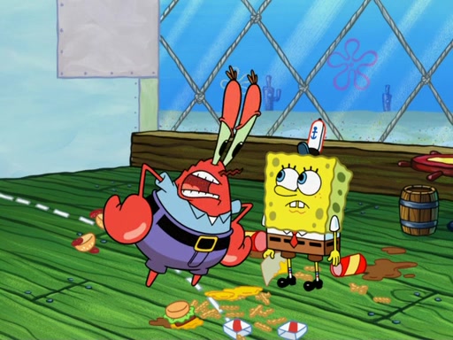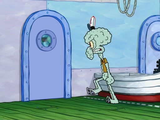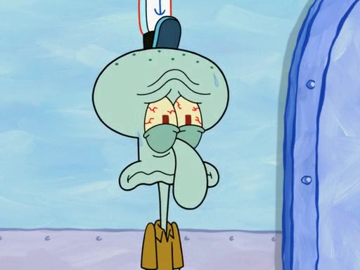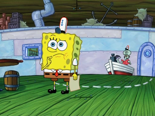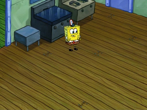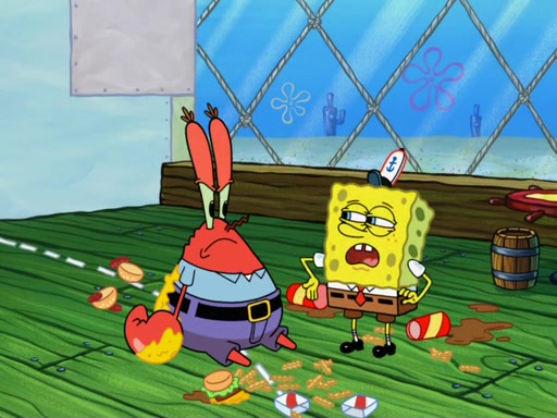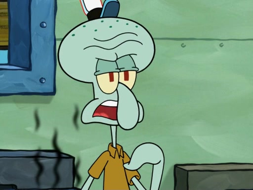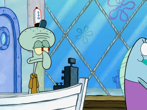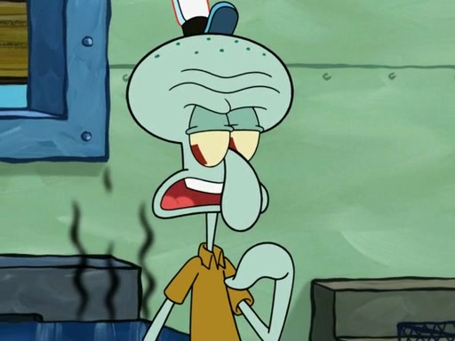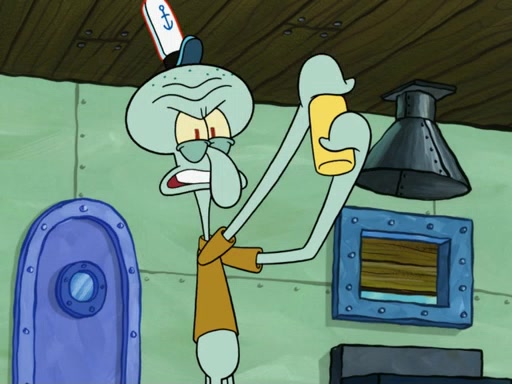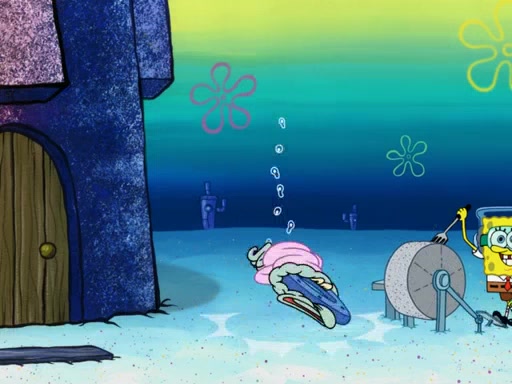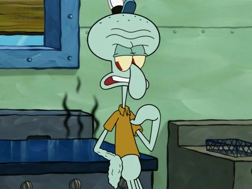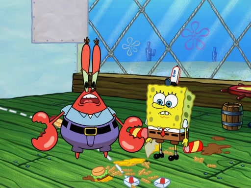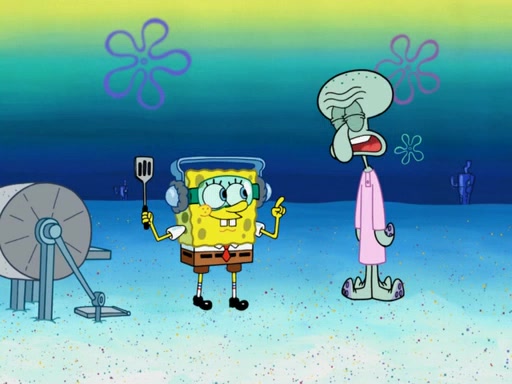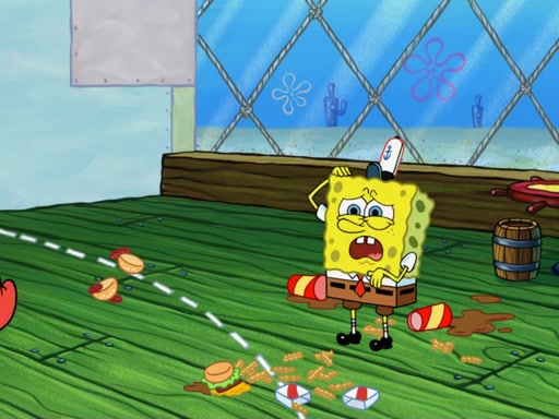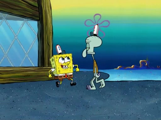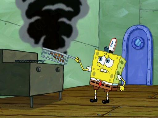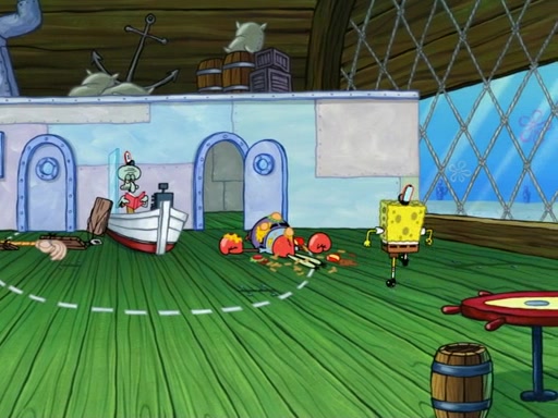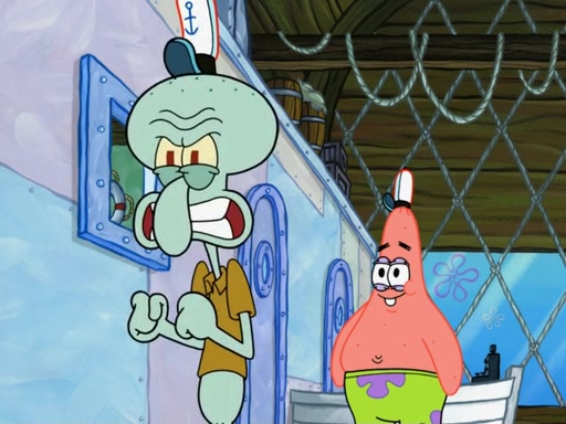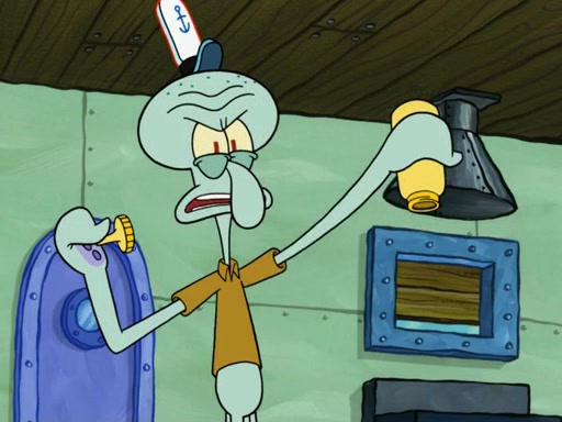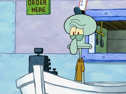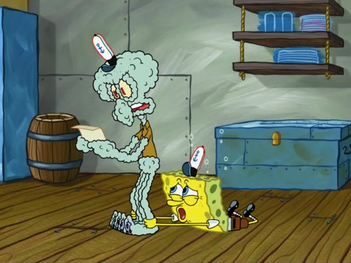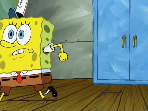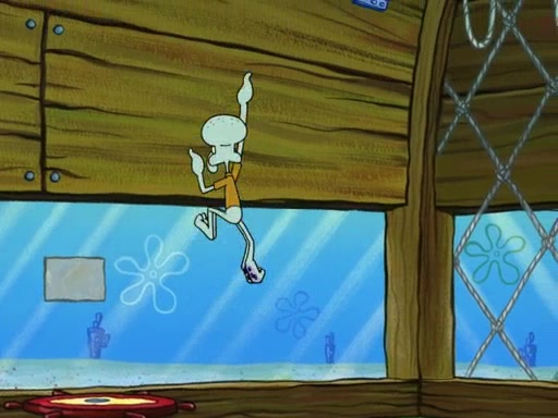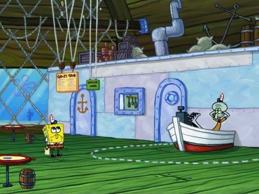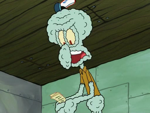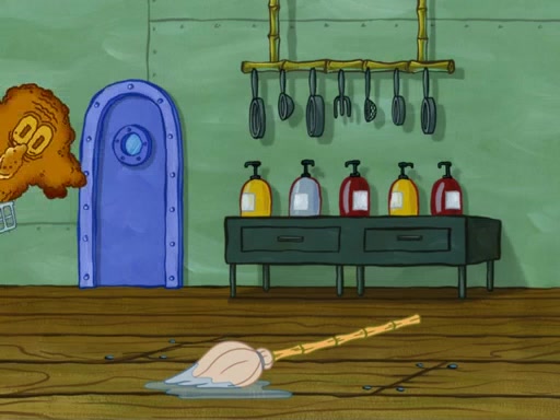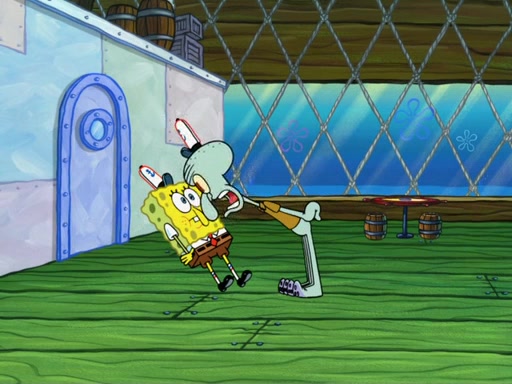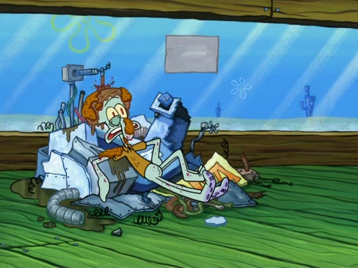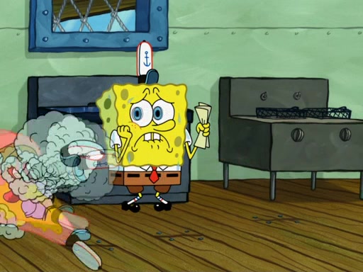 An irritated Squidward enters the kitchen to get it through to SpongeBob. Eventually, he leans on the grill, and accidentally burns his right tentacle. When SpongeBob tries to put the fire out with a bucket of water, he accidentally spills it onto the floor, causing Squidward to slip.