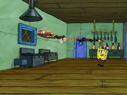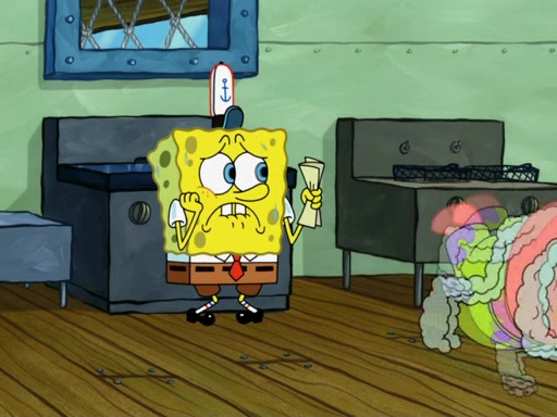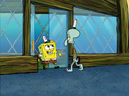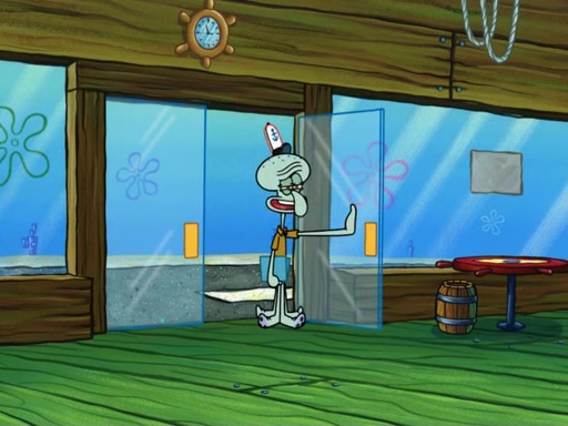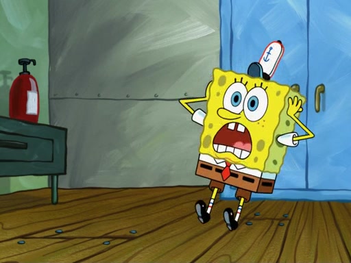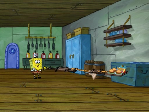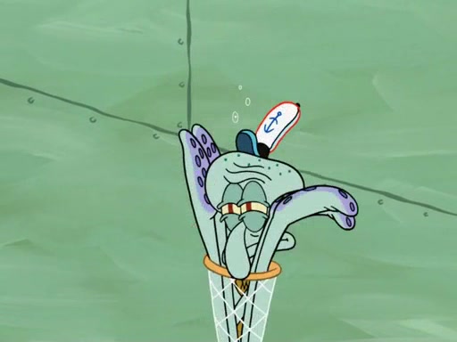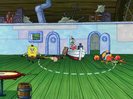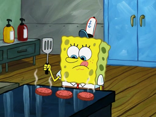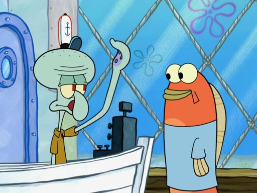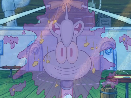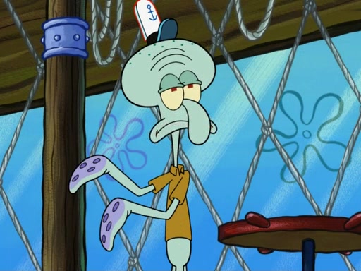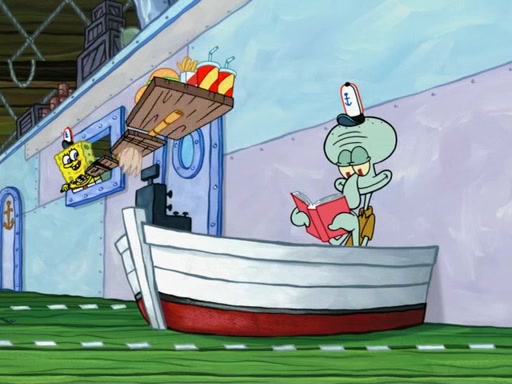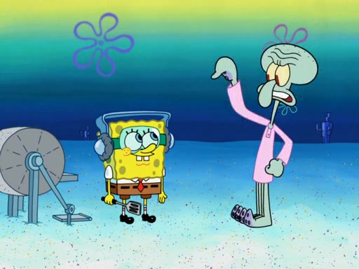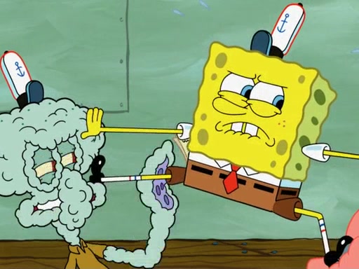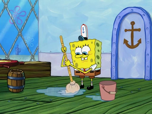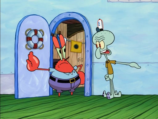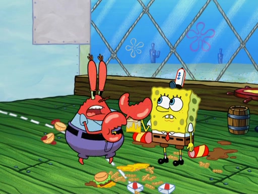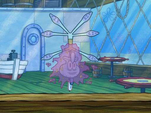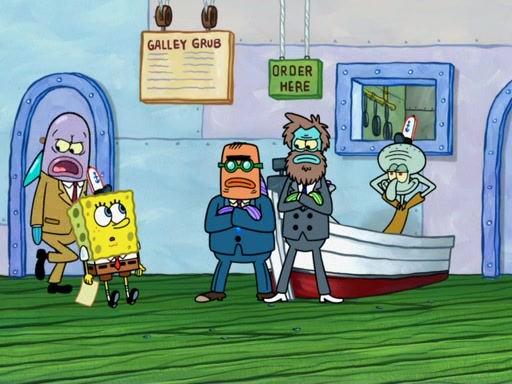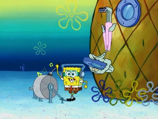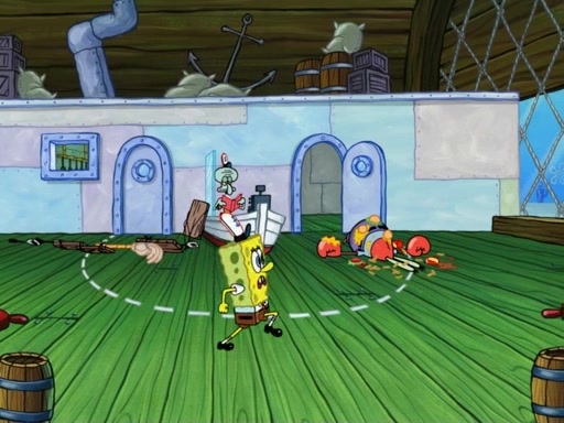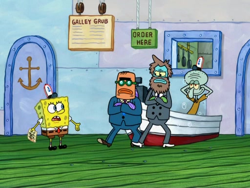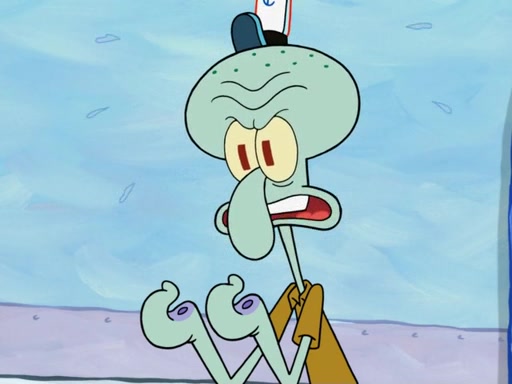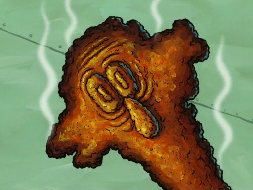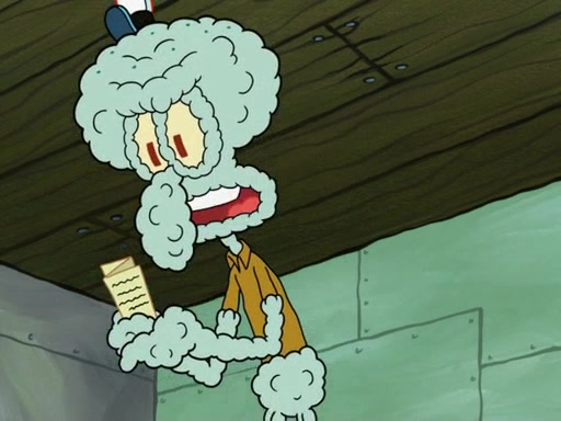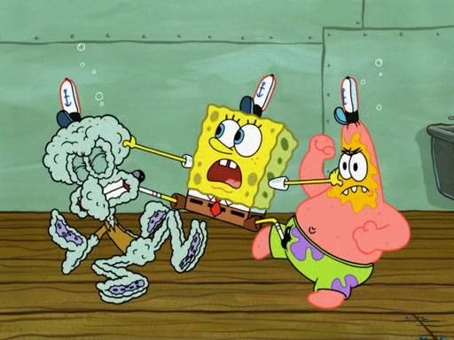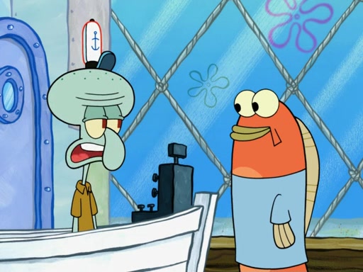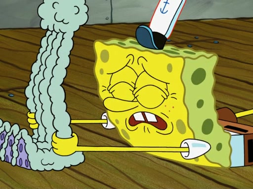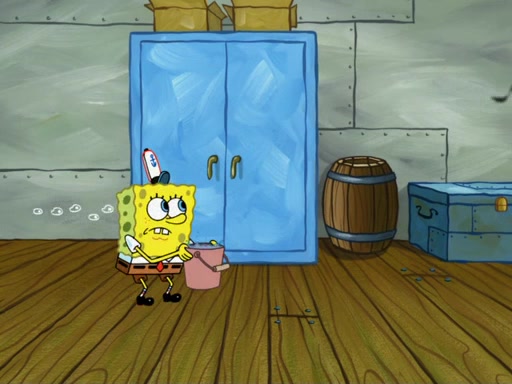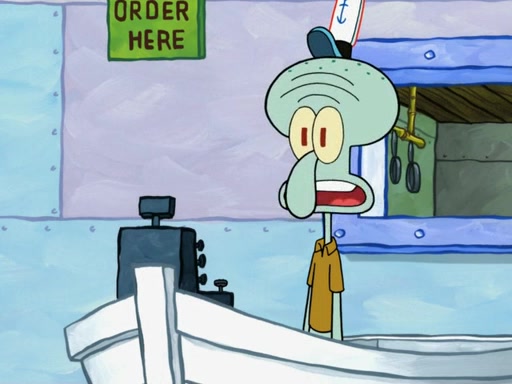 An irritated Squidward enters the kitchen to get it through to SpongeBob. Eventually, he leans on the grill, and accidentally burns his right tentacle. When SpongeBob tries to put the fire out with a bucket of water, he accidentally spills it onto the floor, causing Squidward to slip.