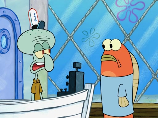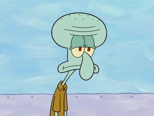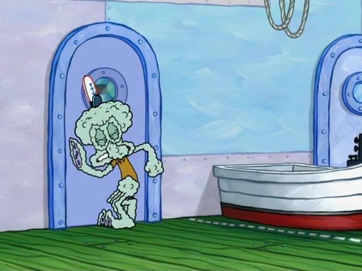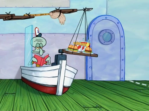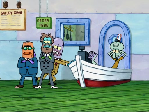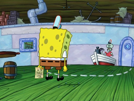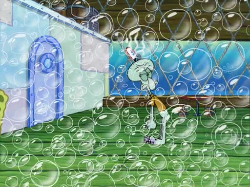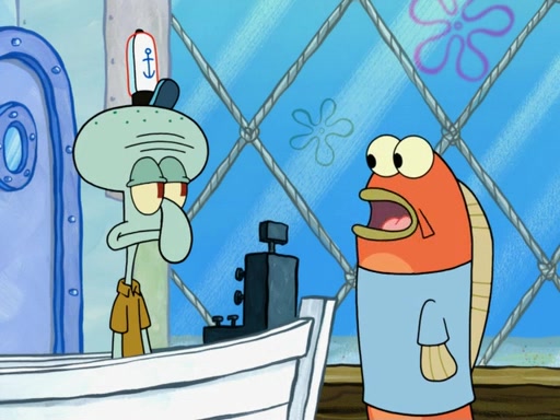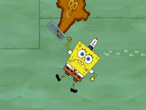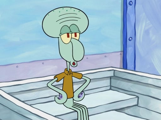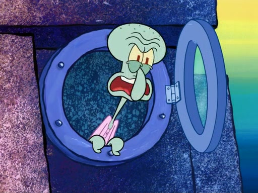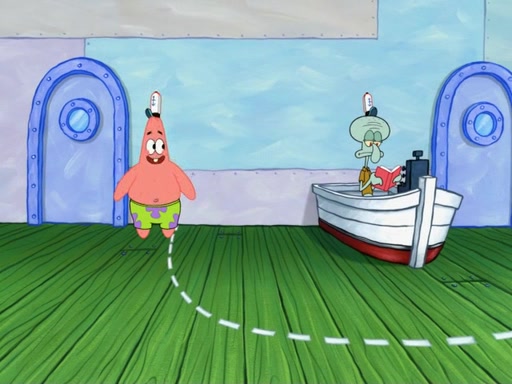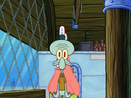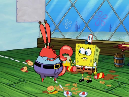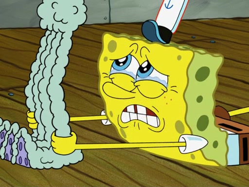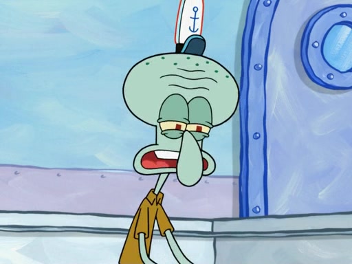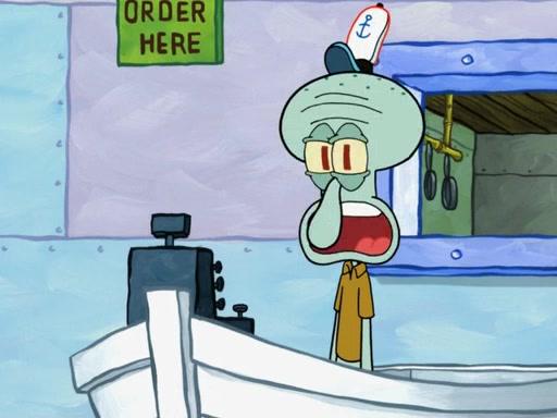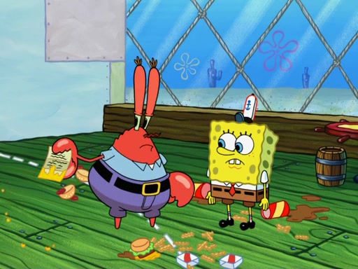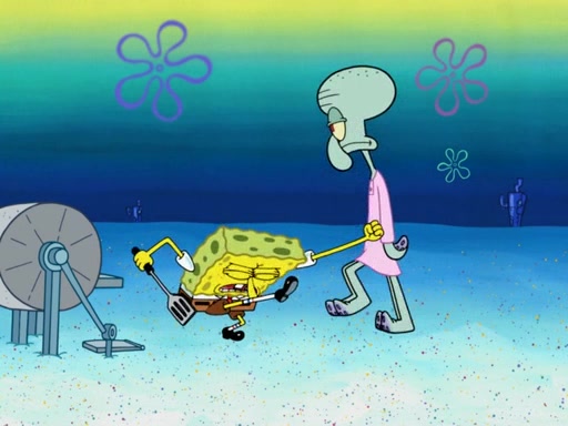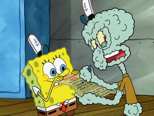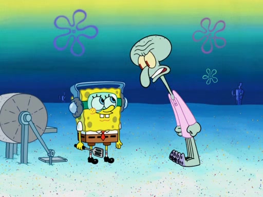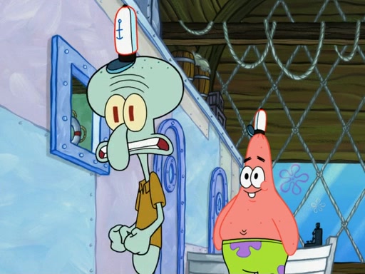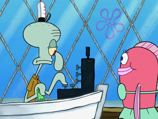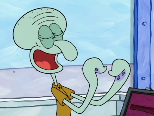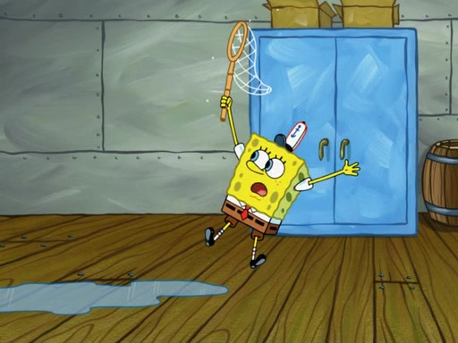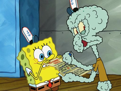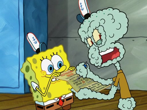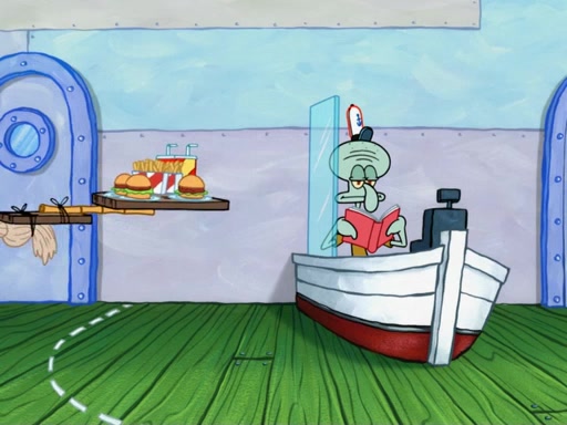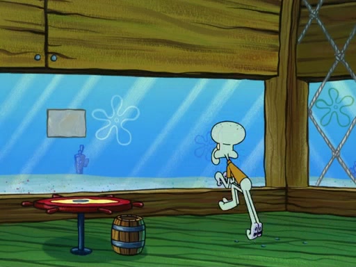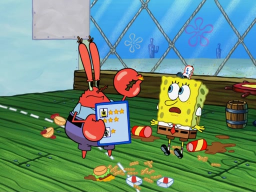 An irritated Squidward enters the kitchen to get it through to SpongeBob. Eventually, he leans on the grill, and accidentally burns his right tentacle. When SpongeBob tries to put the fire out with a bucket of water, he accidentally spills it onto the floor, causing Squidward to slip.