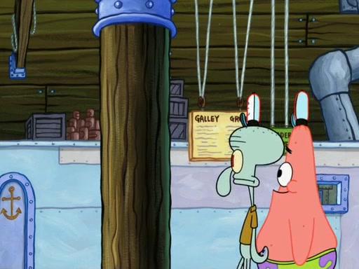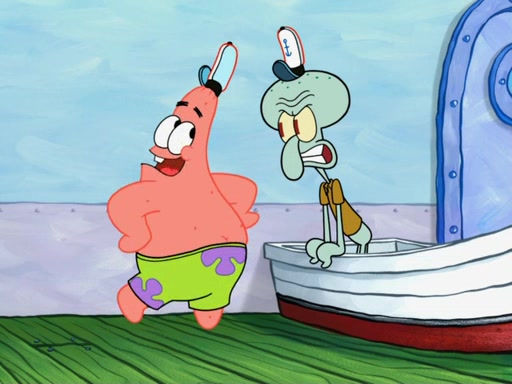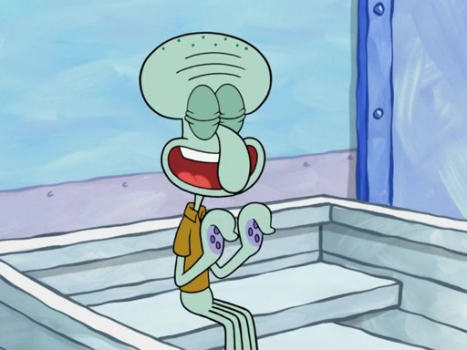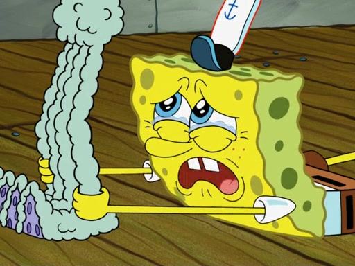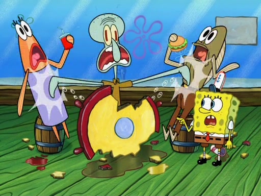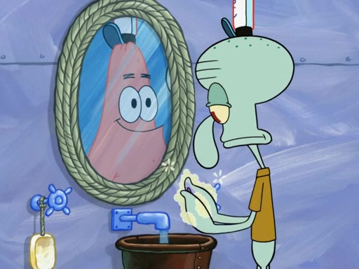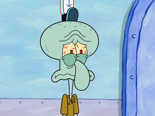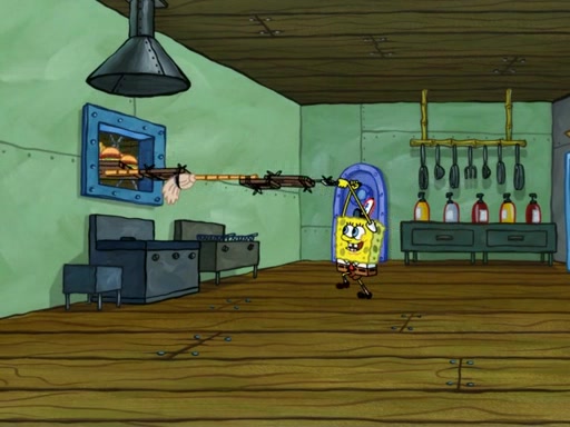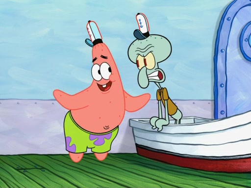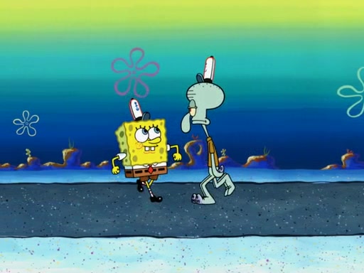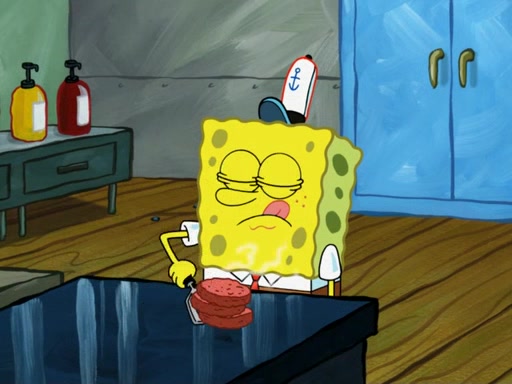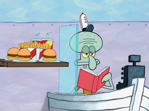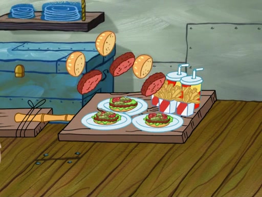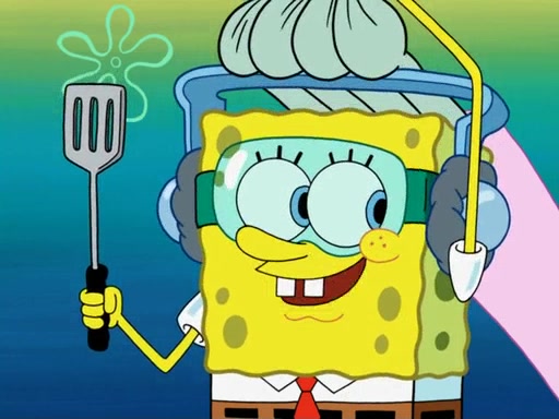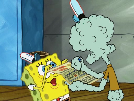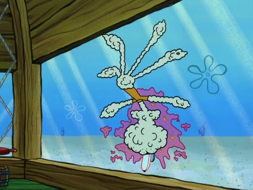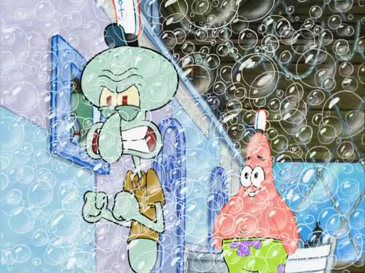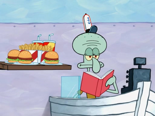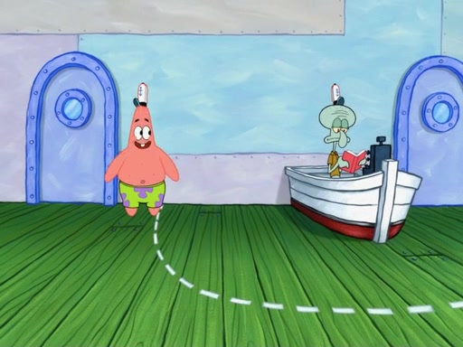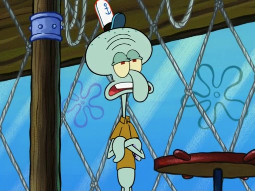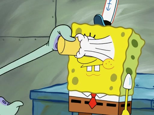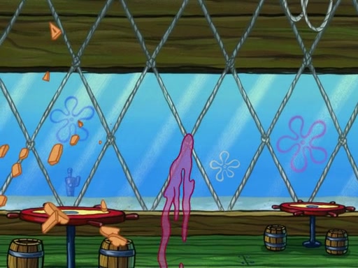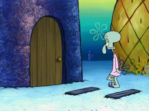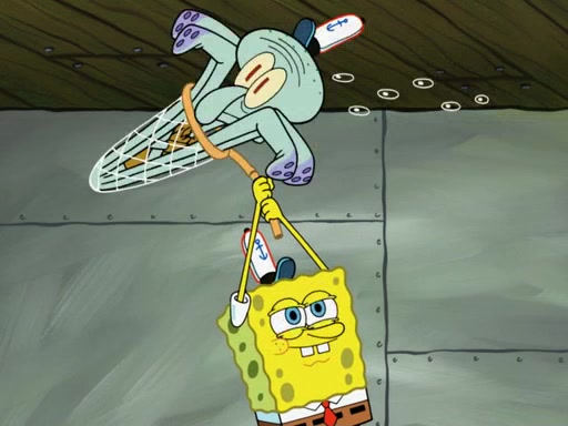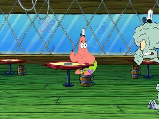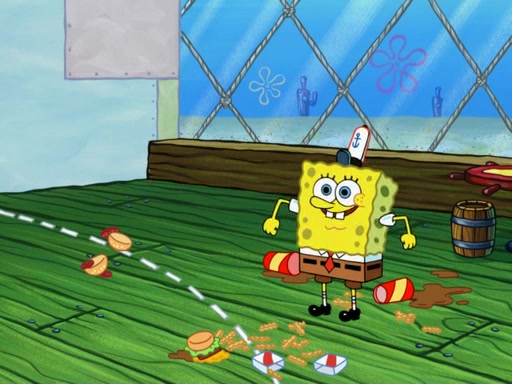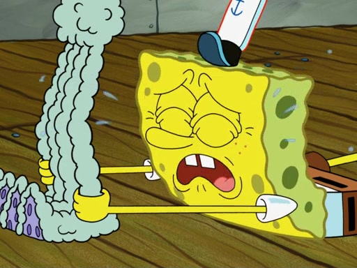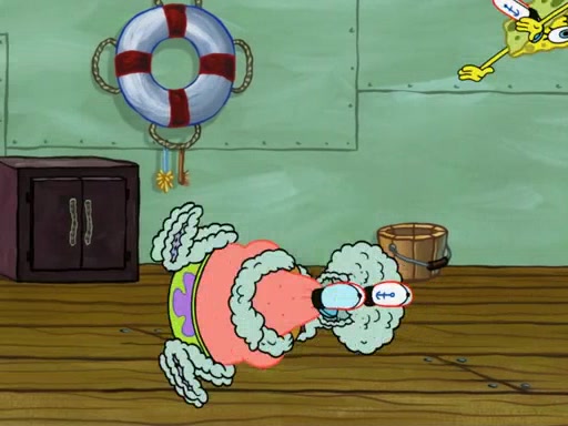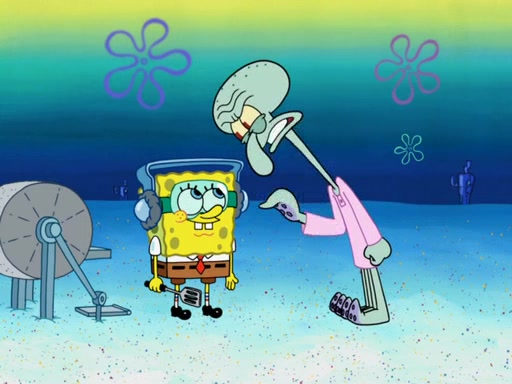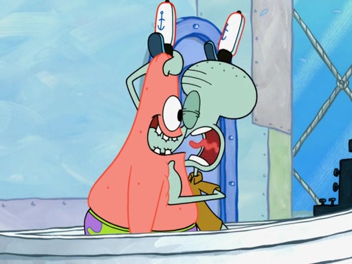 An irritated Squidward enters the kitchen to get it through to SpongeBob. Eventually, he leans on the grill, and accidentally burns his right tentacle. When SpongeBob tries to put the fire out with a bucket of water, he accidentally spills it onto the floor, causing Squidward to slip.