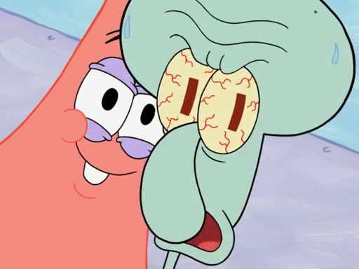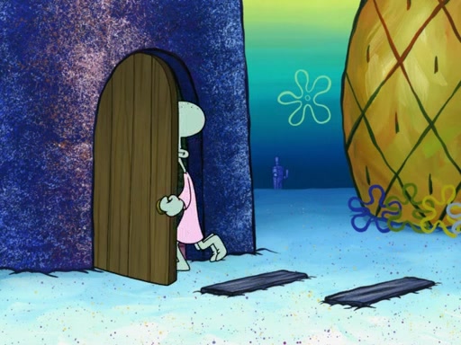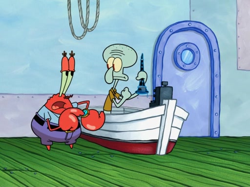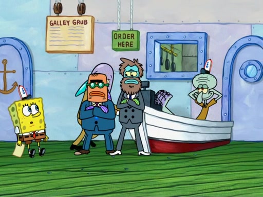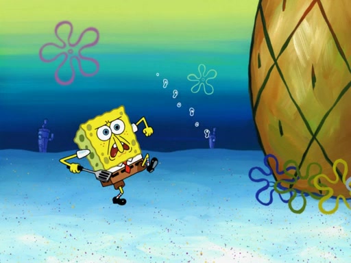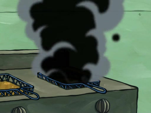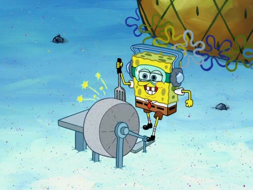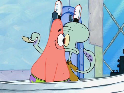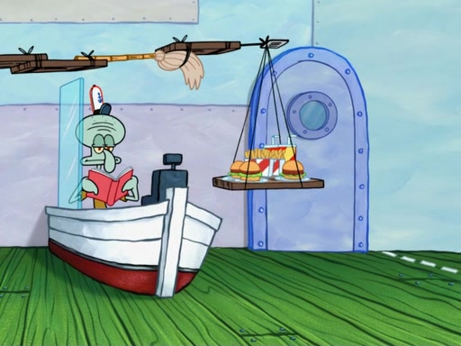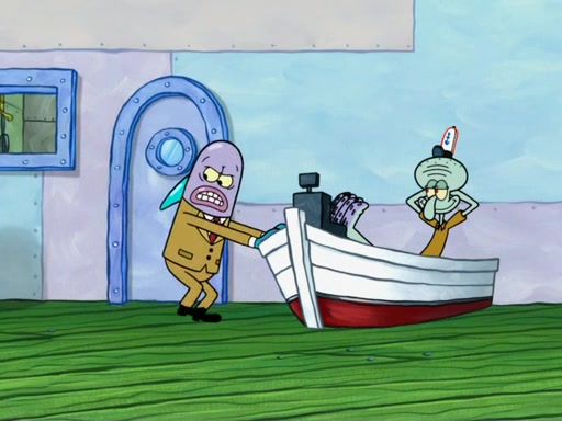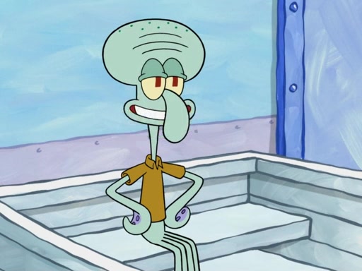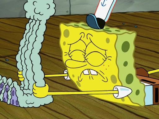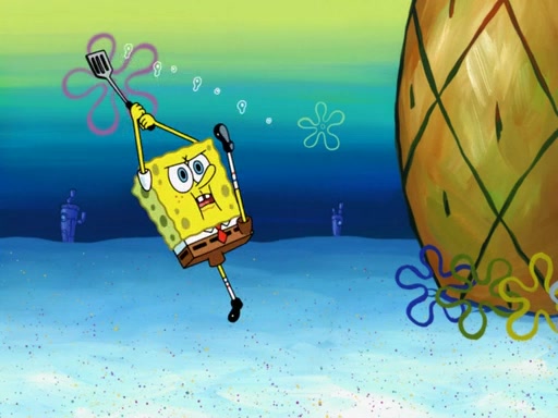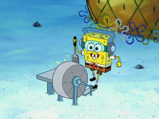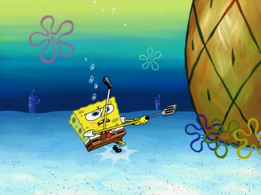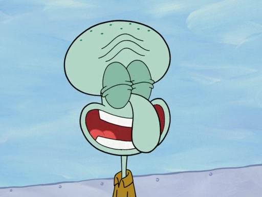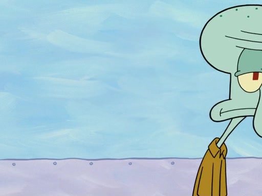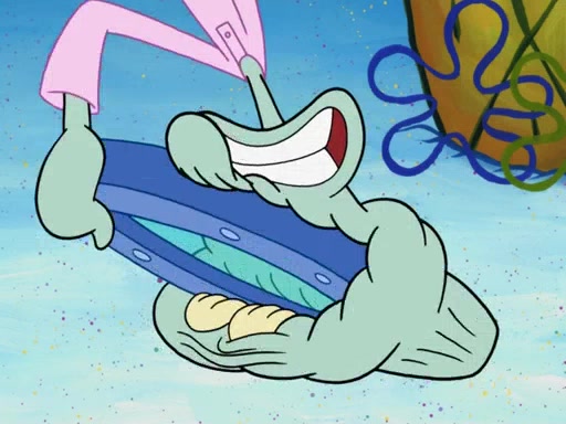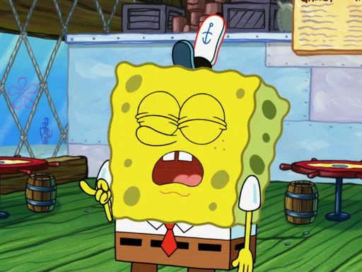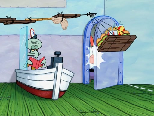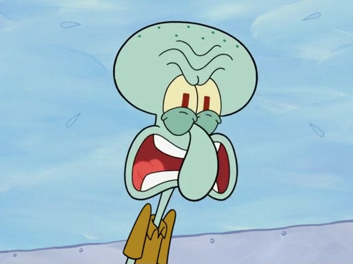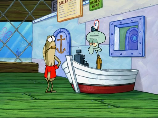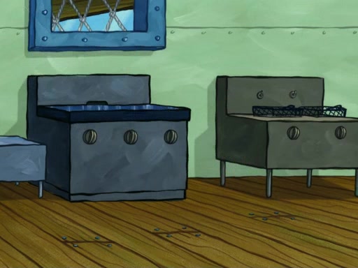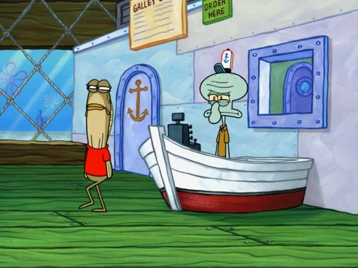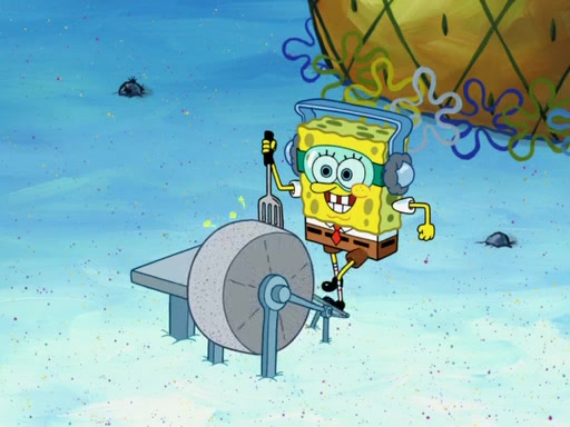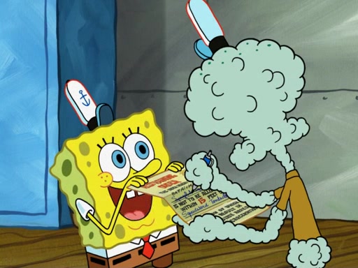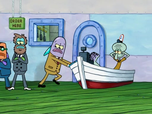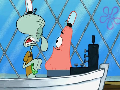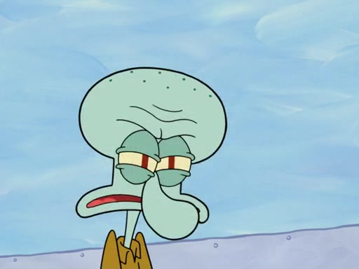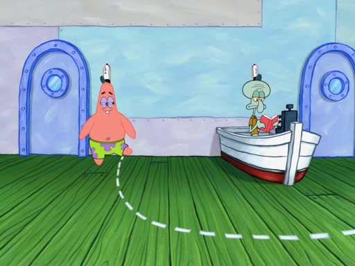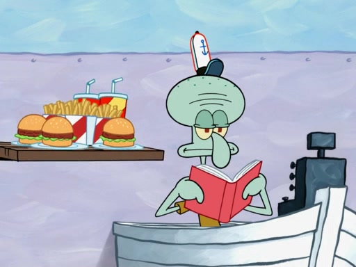 An irritated Squidward enters the kitchen to get it through to SpongeBob. Eventually, he leans on the grill, and accidentally burns his right tentacle. When SpongeBob tries to put the fire out with a bucket of water, he accidentally spills it onto the floor, causing Squidward to slip.