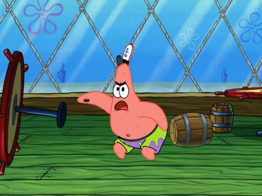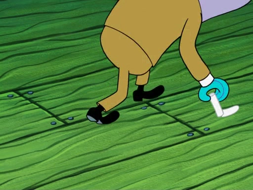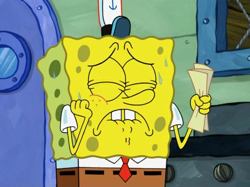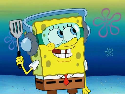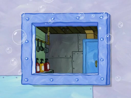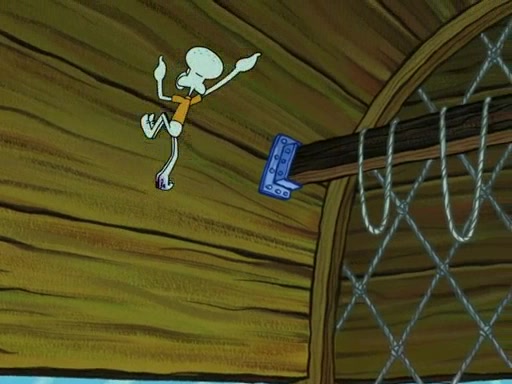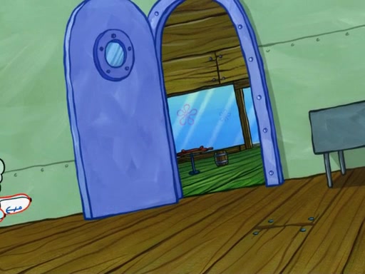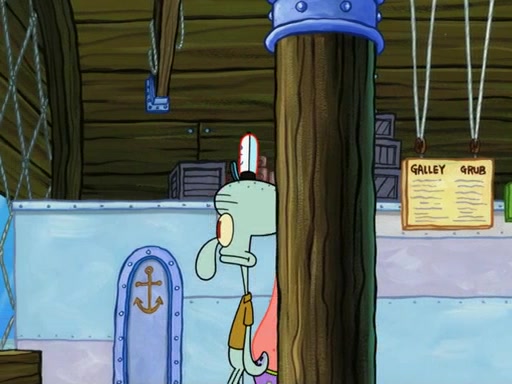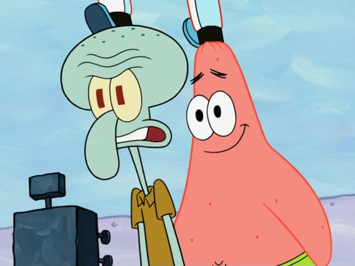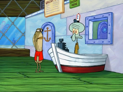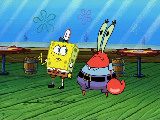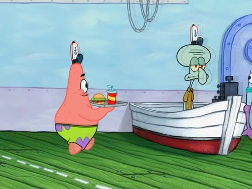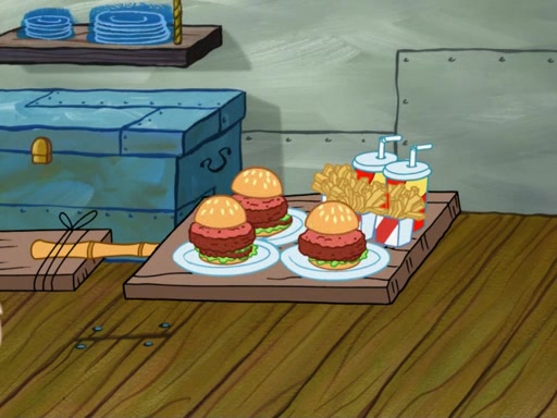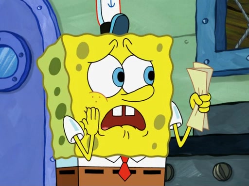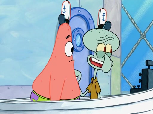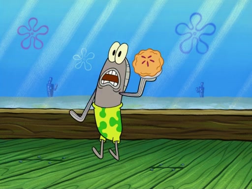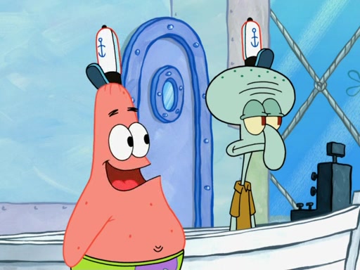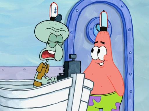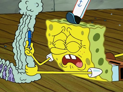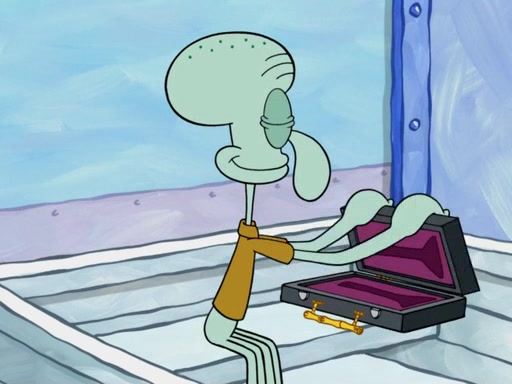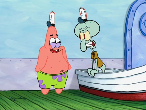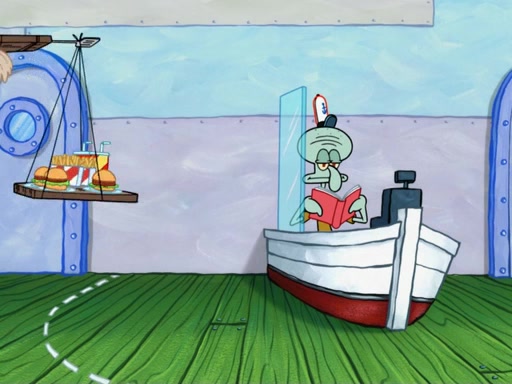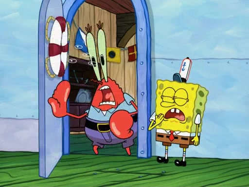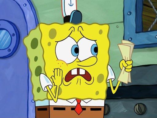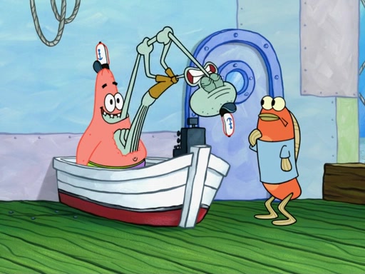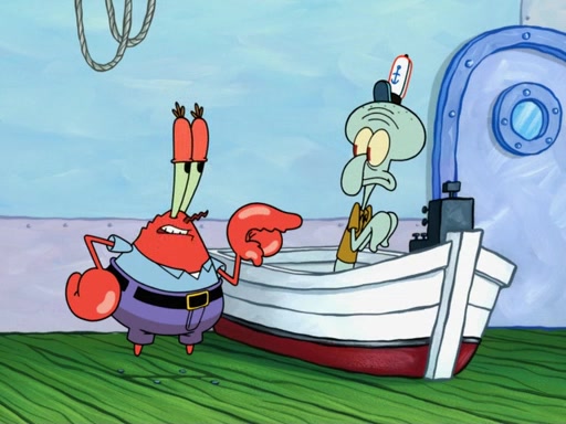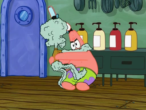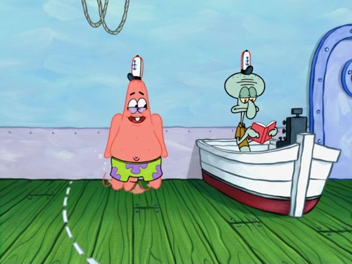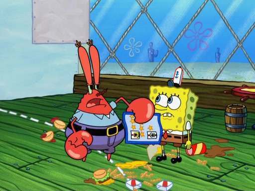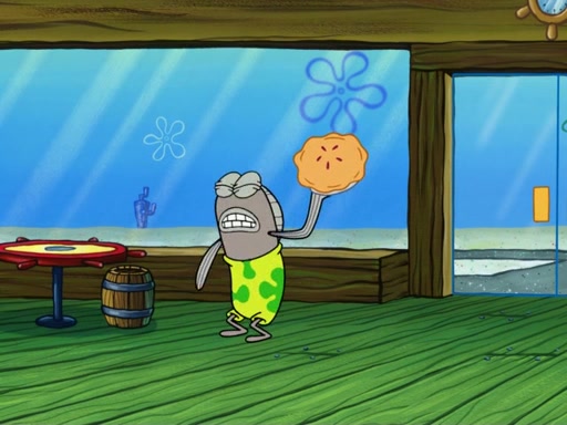 An irritated Squidward enters the kitchen to get it through to SpongeBob. Eventually, he leans on the grill, and accidentally burns his right tentacle. When SpongeBob tries to put the fire out with a bucket of water, he accidentally spills it onto the floor, causing Squidward to slip.