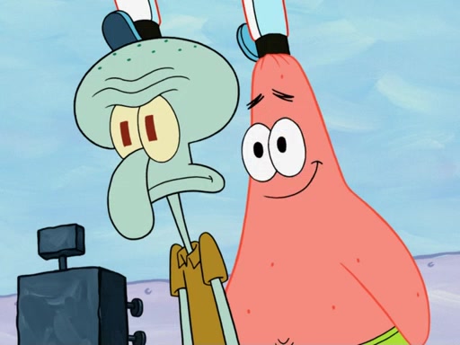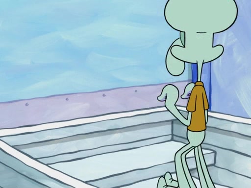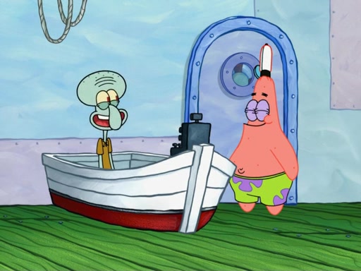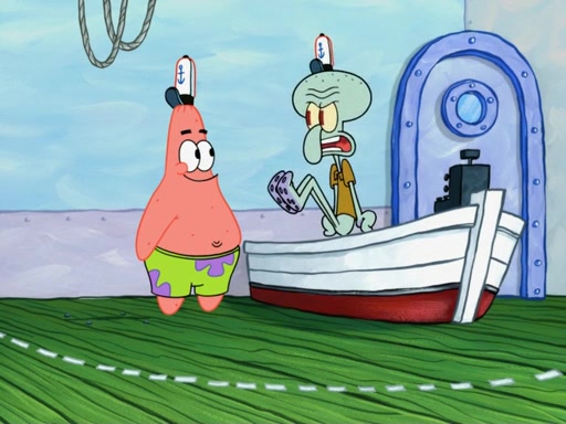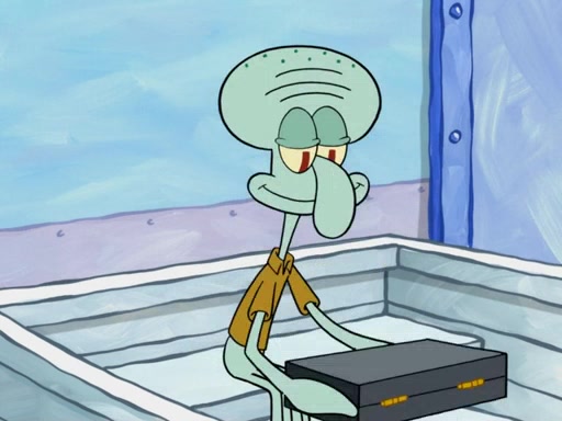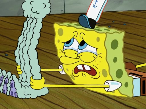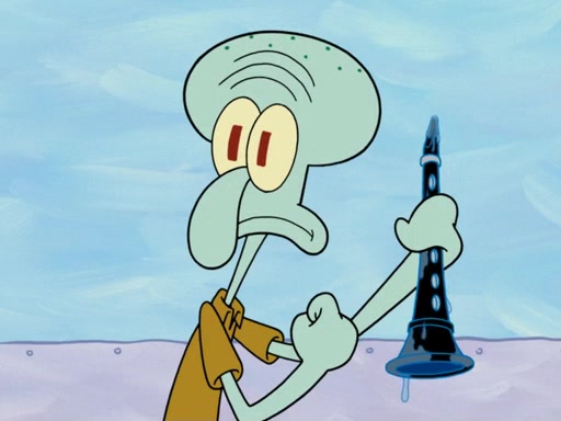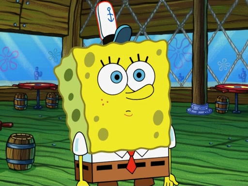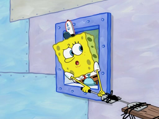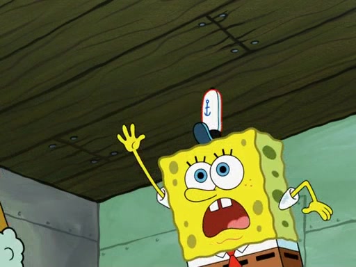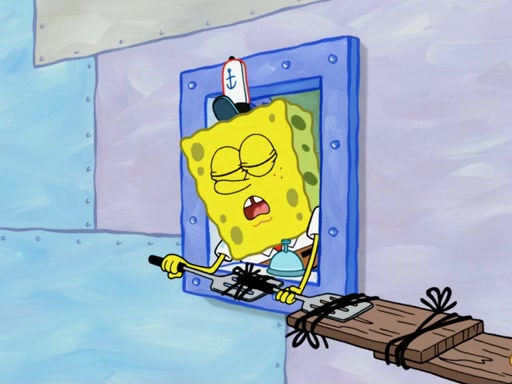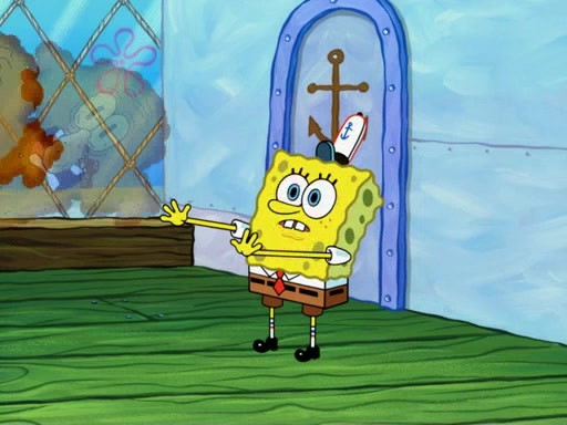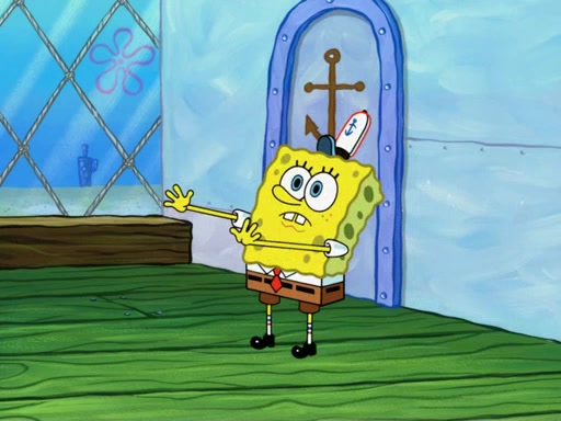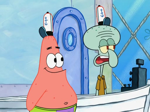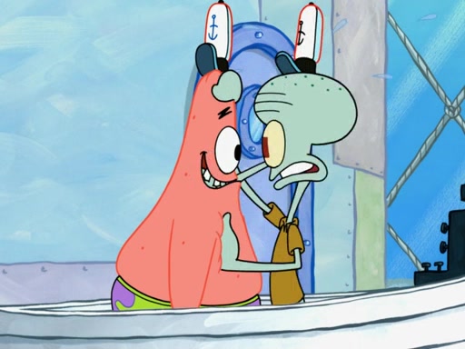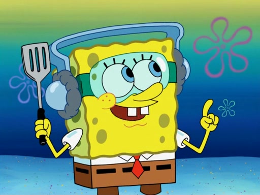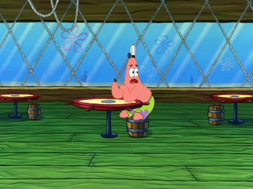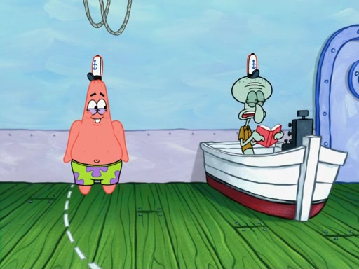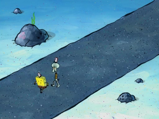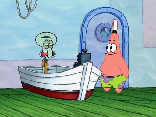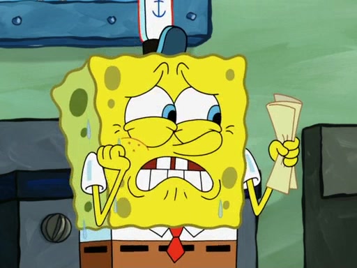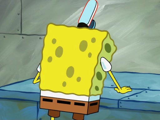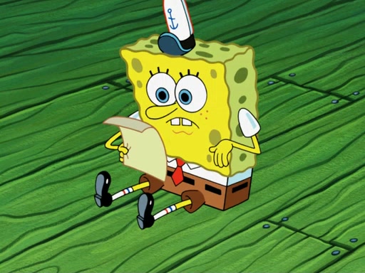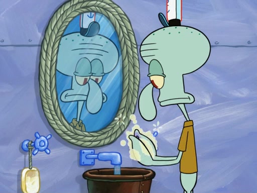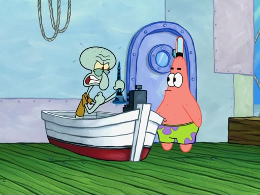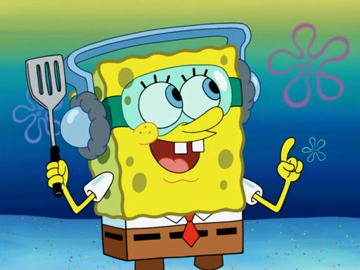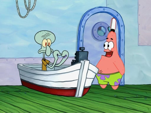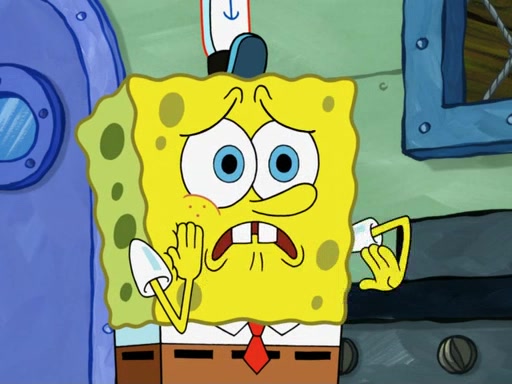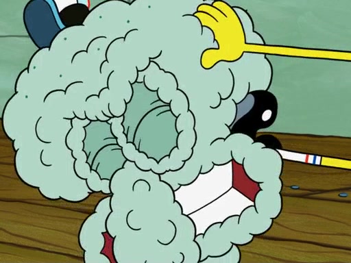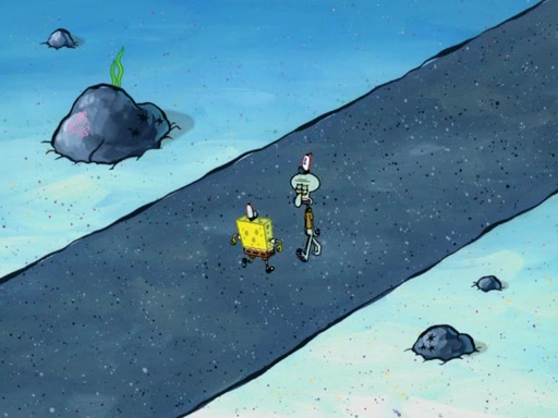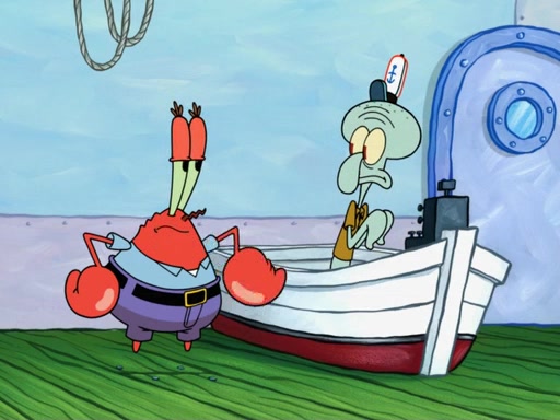 An irritated Squidward enters the kitchen to get it through to SpongeBob. Eventually, he leans on the grill, and accidentally burns his right tentacle. When SpongeBob tries to put the fire out with a bucket of water, he accidentally spills it onto the floor, causing Squidward to slip.