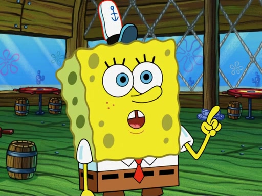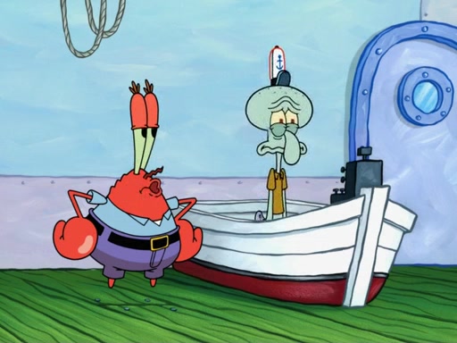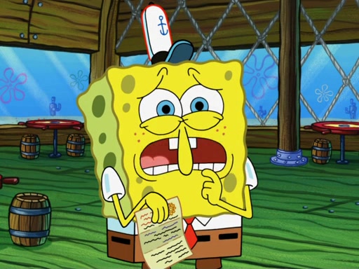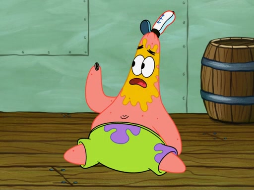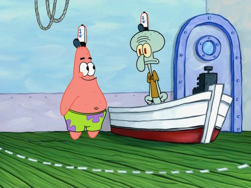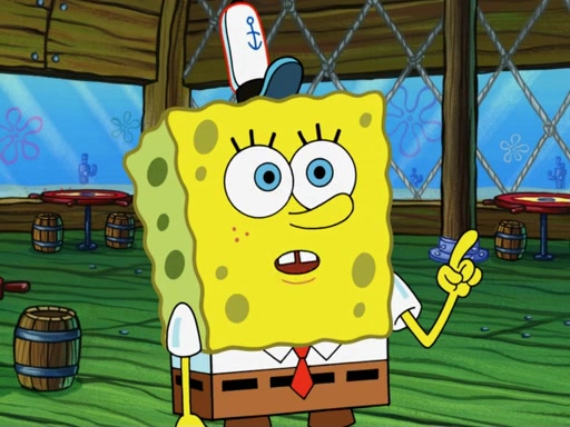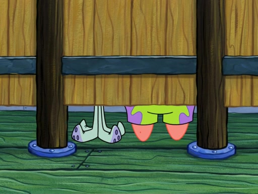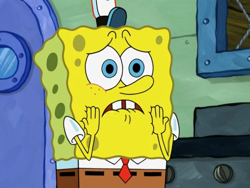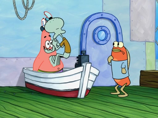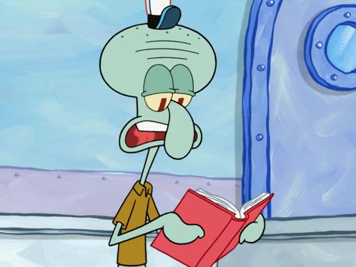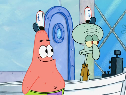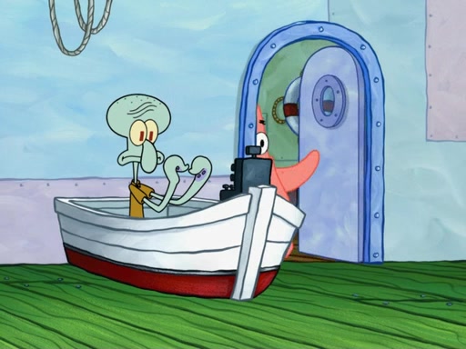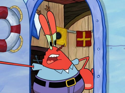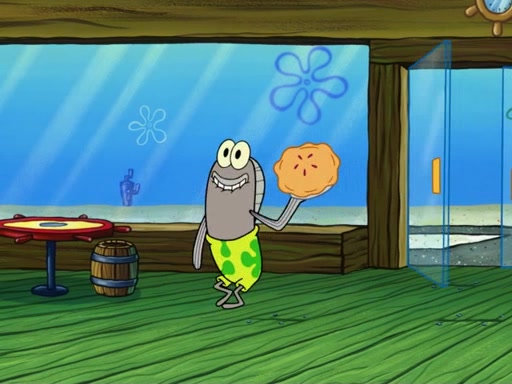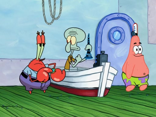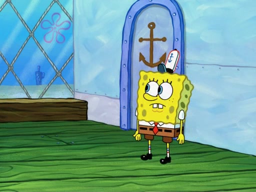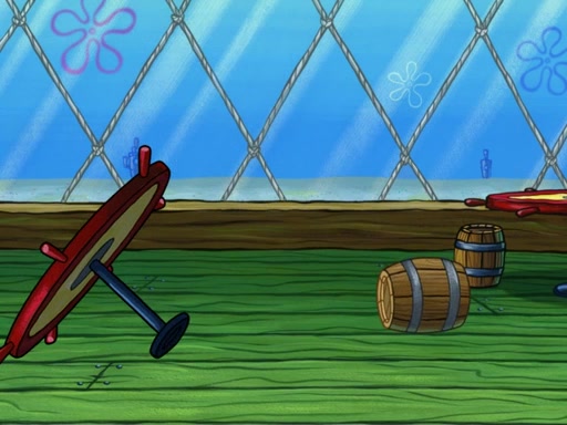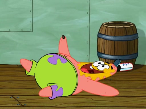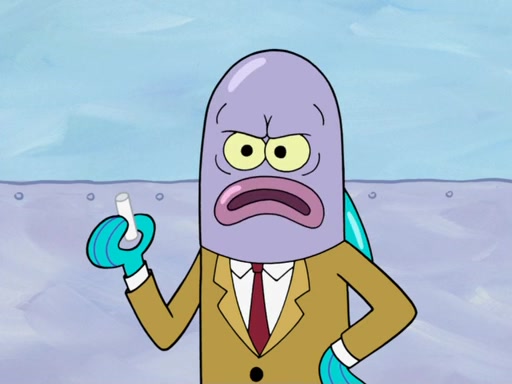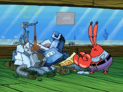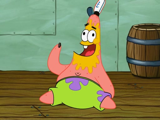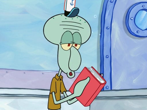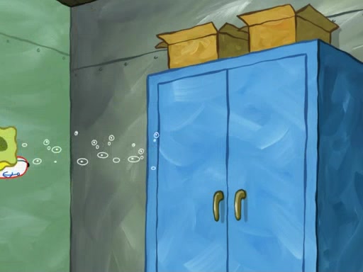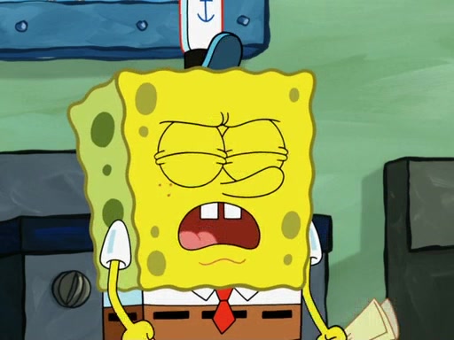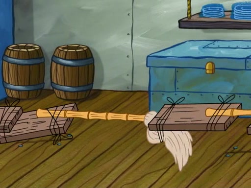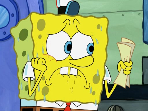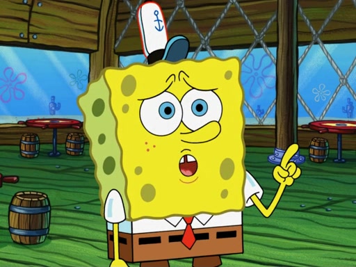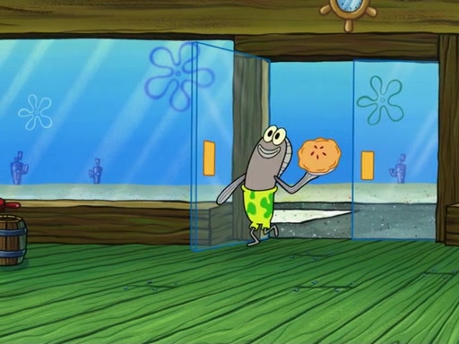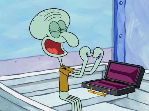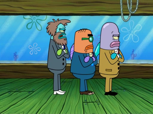 An irritated Squidward enters the kitchen to get it through to SpongeBob. Eventually, he leans on the grill, and accidentally burns his right tentacle. When SpongeBob tries to put the fire out with a bucket of water, he accidentally spills it onto the floor, causing Squidward to slip.