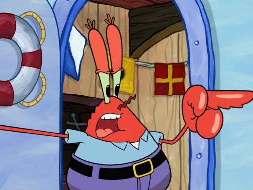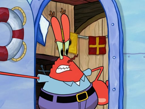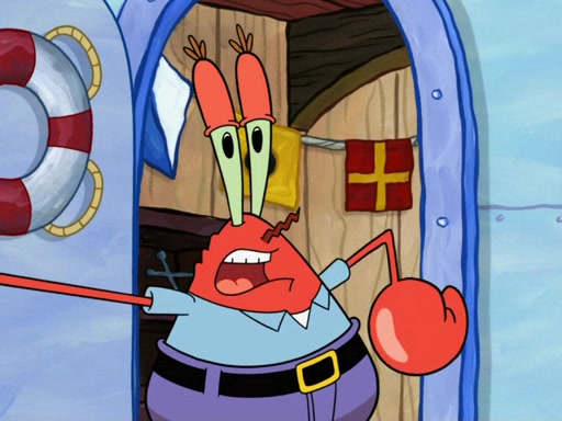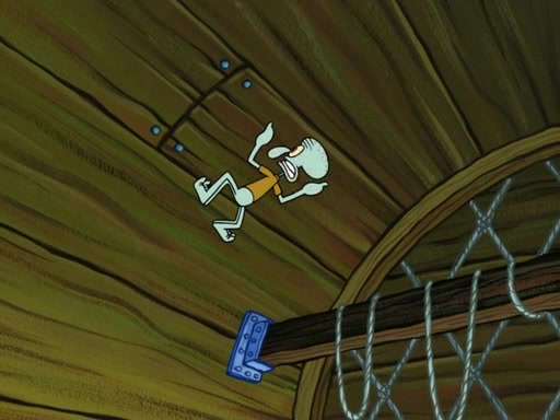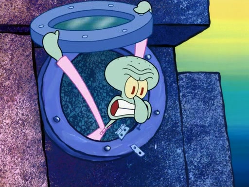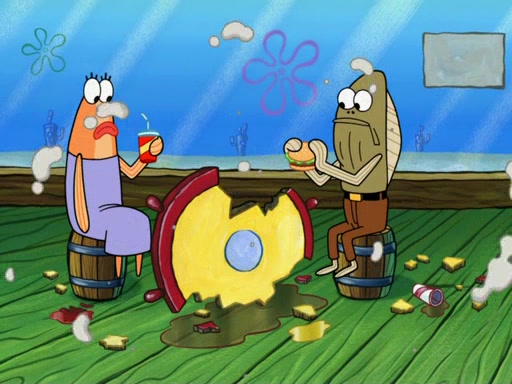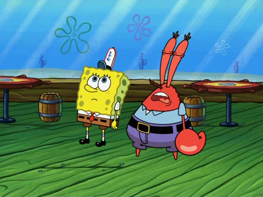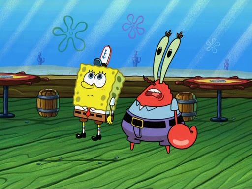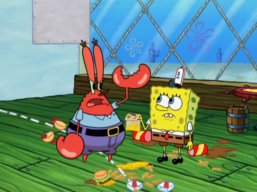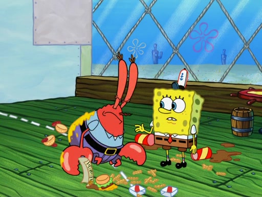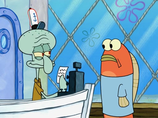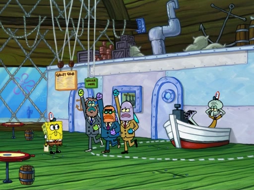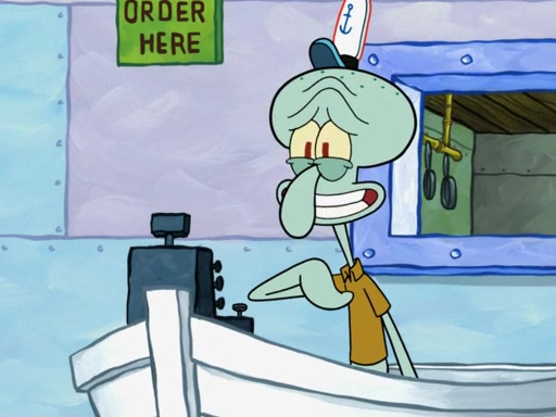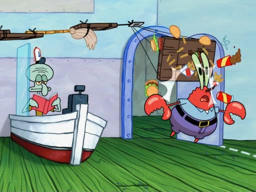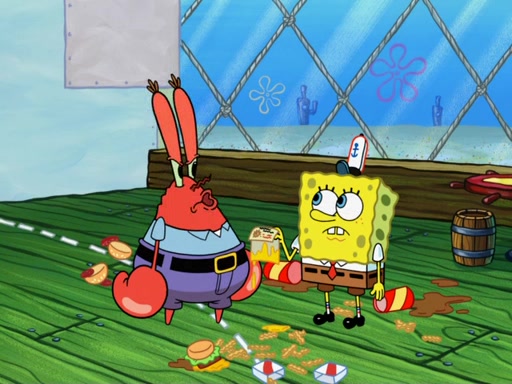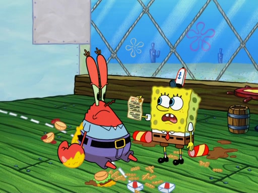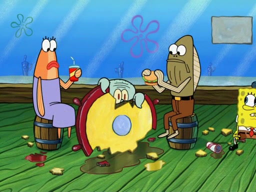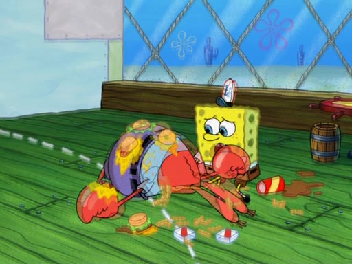 The customer now throws Squidward back to SpongeBob, and lands into the mouth by bouncing right off. When Squidward crashes into a soda machine, breaking it, Mr. Krabs now comes out of the office crying, and SpongeBob goes over to him and asks if he's all right. Squidward screams and runs from him, hiding behind a table. When SpongeBob gets closer, Squidward resorts to climbing the walls and ceiling of The Krusty Krab to get away from him.