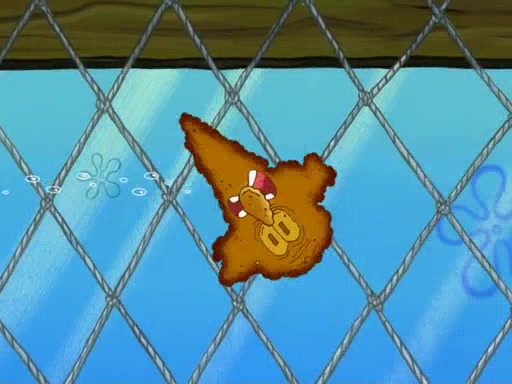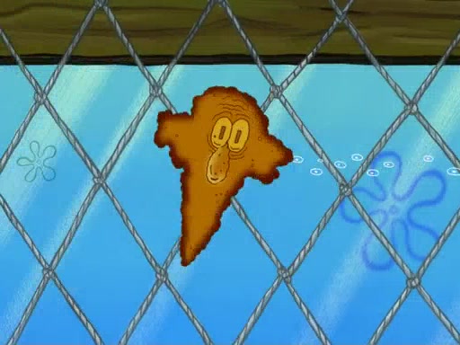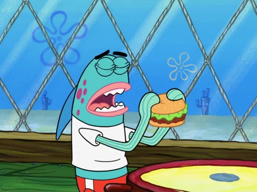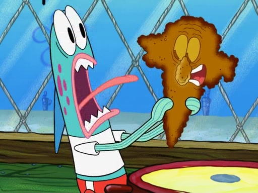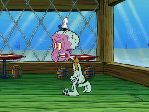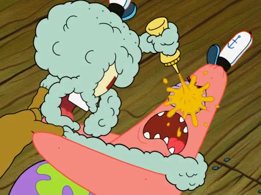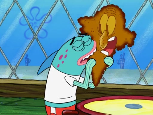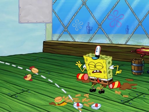 As Squidward flies through the air, SpongeBob tries to catch him in a jellyfishing net, but it breaks, and accidentally dropping Squidward into the deep fryer. The more SpongeBob tries to help him by running over to the deep fryer, by pulling out a fried Squidward, the more he accidentally bungles things, and further injures Squidward by tripping over a mop. After accidentally tripping over the mop, SpongeBob now lands into the order window, causing Squidward to flip right out of the basket, and knocking out a customer's Krabby Patty. The customer now accidentally bites into Squidward's own flesh, results in causing a scream, and now freaks out.
