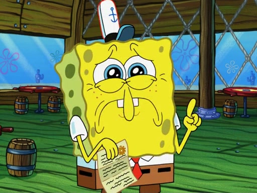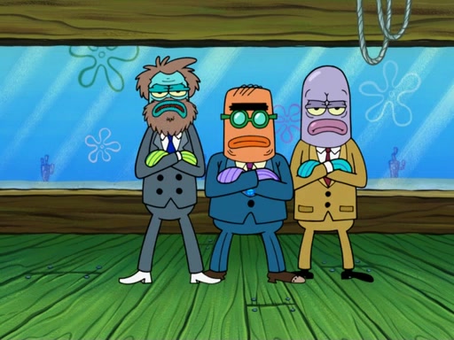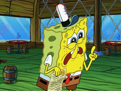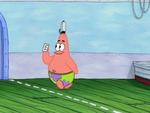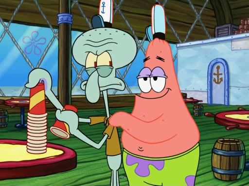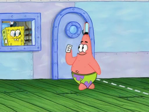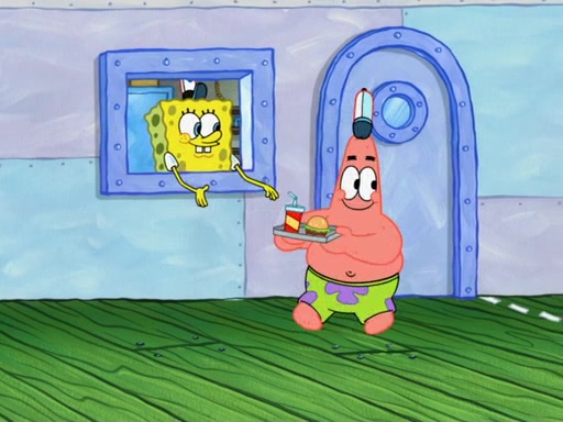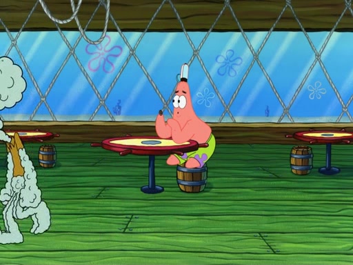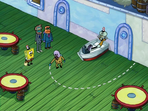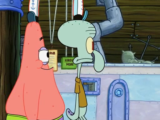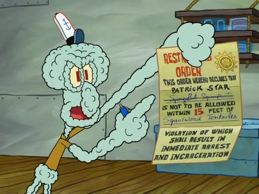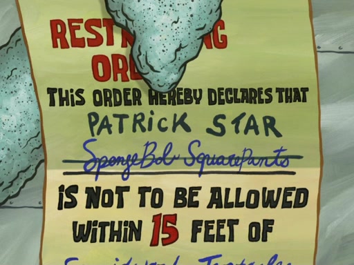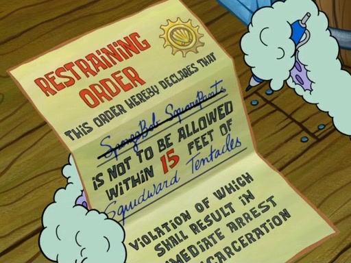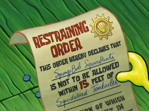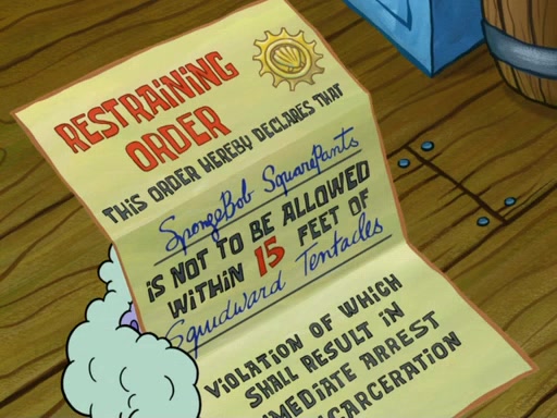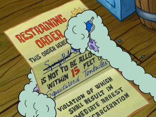 The next day, Squidward gives SpongeBob a "gift": a restraining order, which his three lawyers from the law offices of Harry, Combover, and Bald, explain to him. SpongeBob is not to come within 15 feet of Squidward or he'll go to jail. SpongeBob is confused at first, but when he realizes that he can't prepare Krabby Patties if he's in jail, he is struck with fear and does everything he can to avoid coming within 15 feet of Squidward. Unfortunately, the window from which SpongeBob gives orders to Squidward is within the 15 feet range, so the cash register and the counter are moved to the right, by the restroom door. SpongeBob tries to give the orders to Squidward by means of a pole, but Squidward ignores it. Mr. Krabs sees the restraining order is hindering business, so he tells SpongeBob he has to think of another way. Patrick is tiptoeing to Squidward. Squidward tries to ignore him, but it doesn't work. Patrick tries to tell Squidward he now has a hat. Mr. Krabs reveals that he hired Patrick as a middle man: SpongeBob prepares the food, then Patrick gives the order to Squidward. Squidward won't stand it so he marches over to Mr. Krabs and complains to him that this will not stand. Mr. Krabs tells Squidward to get used to Patrick working at the Krusty Krab; unless he wants to talk to SpongeBob, which annoys Squidward.
