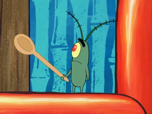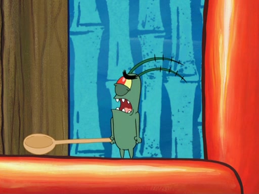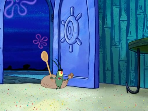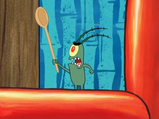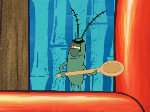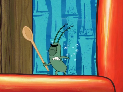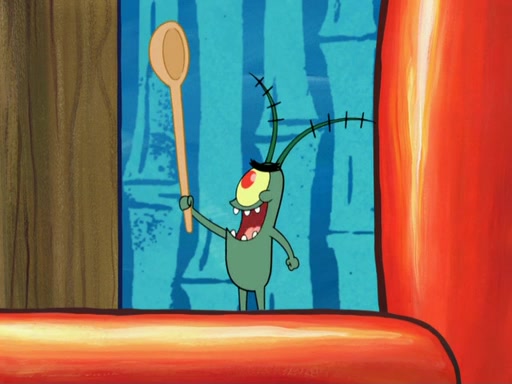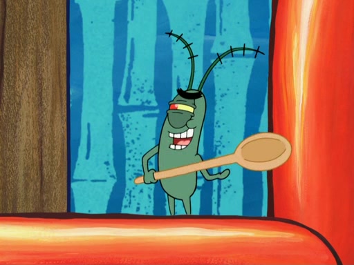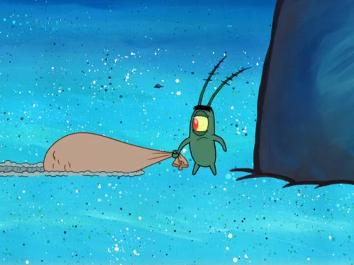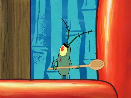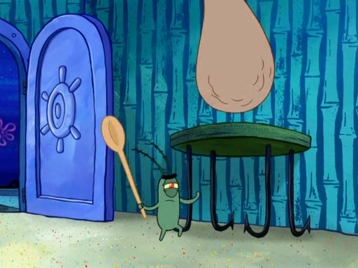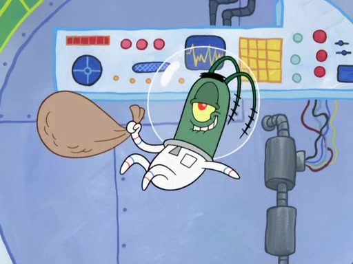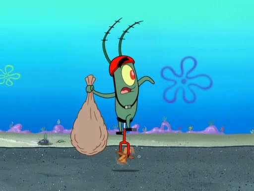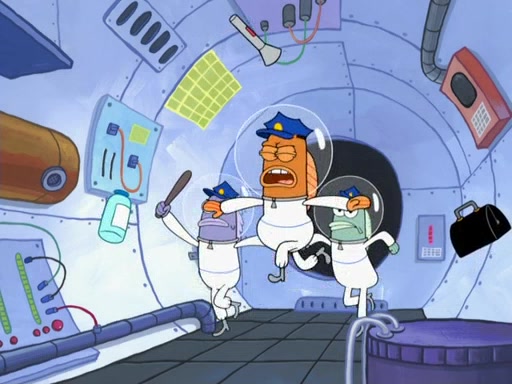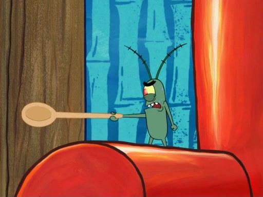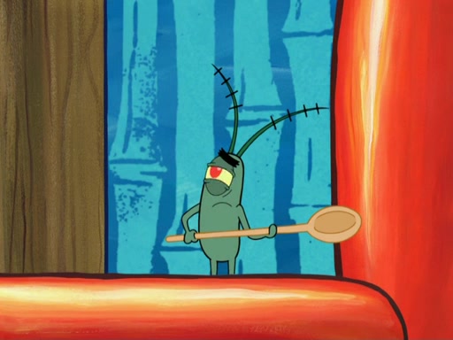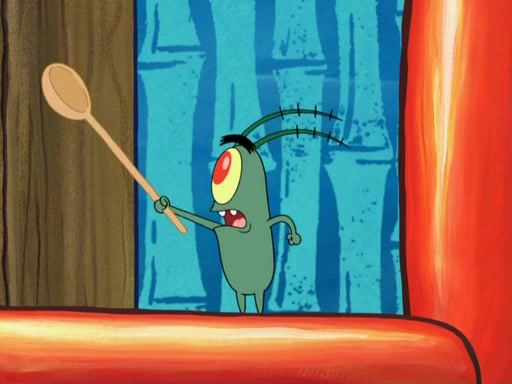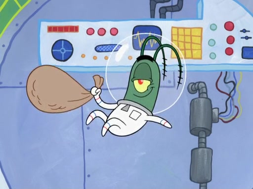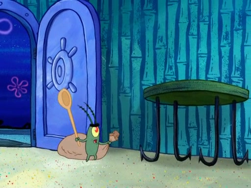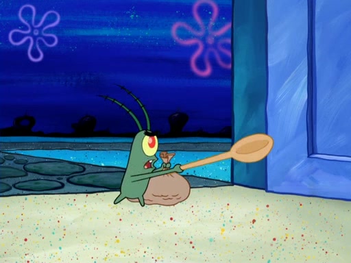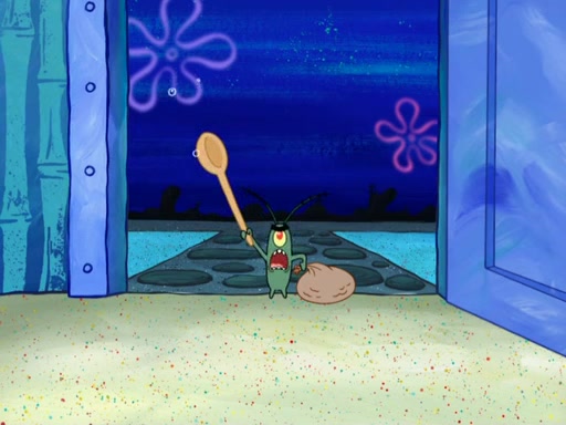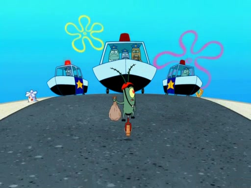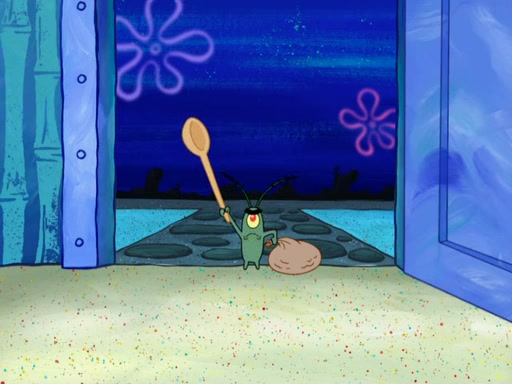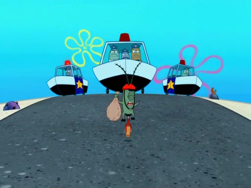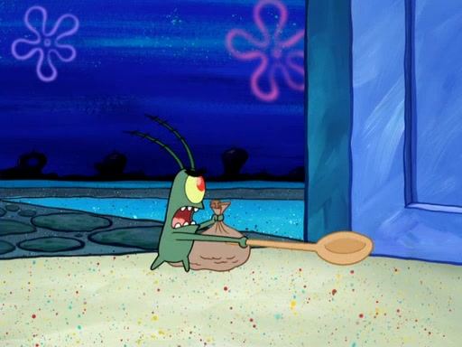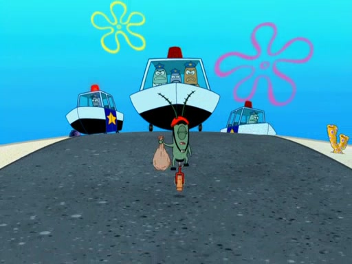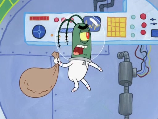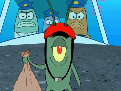 Later, Plankton sees the artwork, and mistakes it for garbage. Planning to reverse-engineer the recipe, he steals it. Police officers immediately chased him. They dog him every step of the way, from a movie theater, a grocery store, and a satellite in space. When he loses them, he is baffled as to why the police are chasing him, rather than Mr. Krabs. At night, he knocks on Patrick's rock, but when Patrick answers, he angrily tells him that he has a busy day of doing nothing tomorrow. Plankton goes to SpongeBob's house, using a spoon to hold SpongeBob and Gary hostage, and demands an explanation as to why the police are after him. SpongeBob explains that what he has stolen is in fact a priceless work of art. Plankton gets the idea to sell the artwork, and declared SpongeBob and Gary to be accomplices to his crime. Patrick comes in, and yells at everyone for making so much noise as to keep him awake, while eating something.