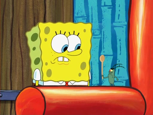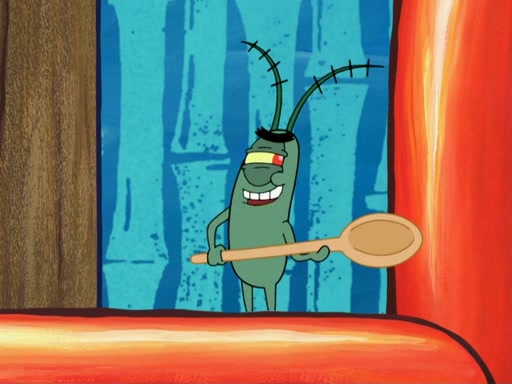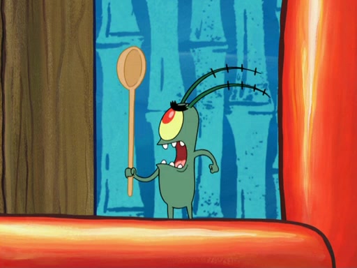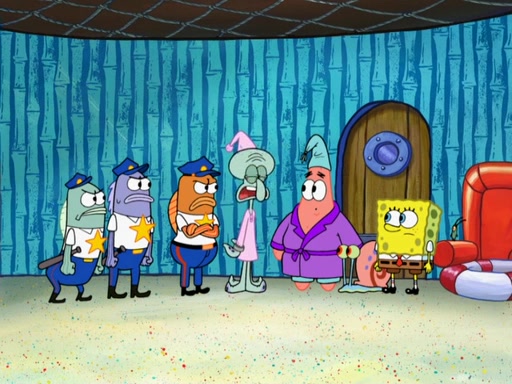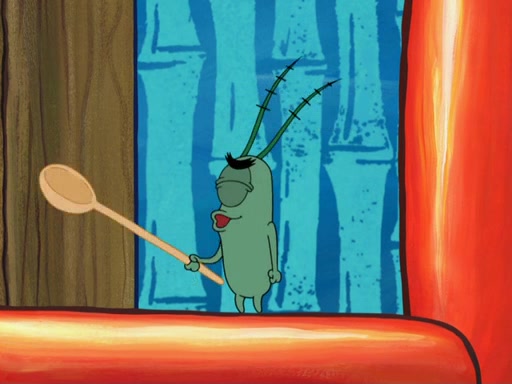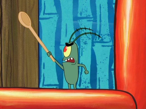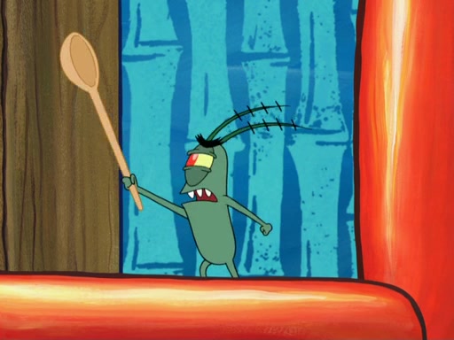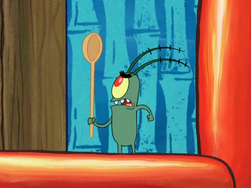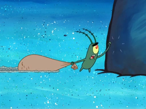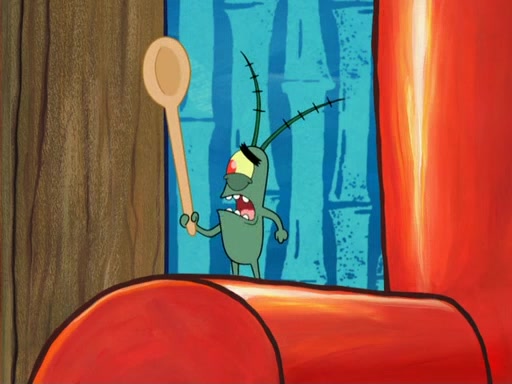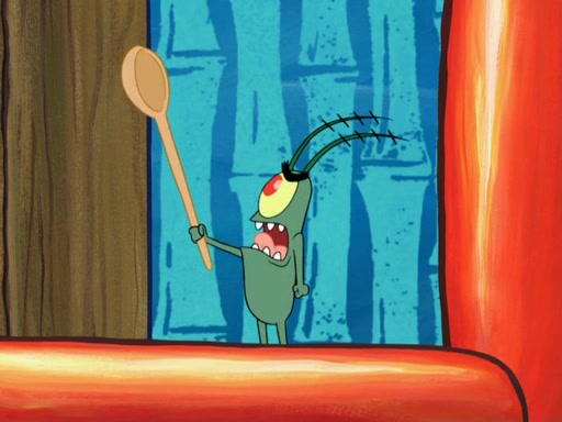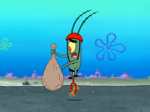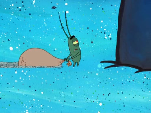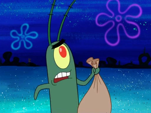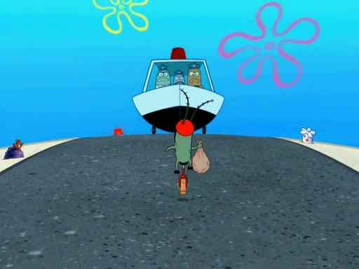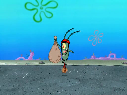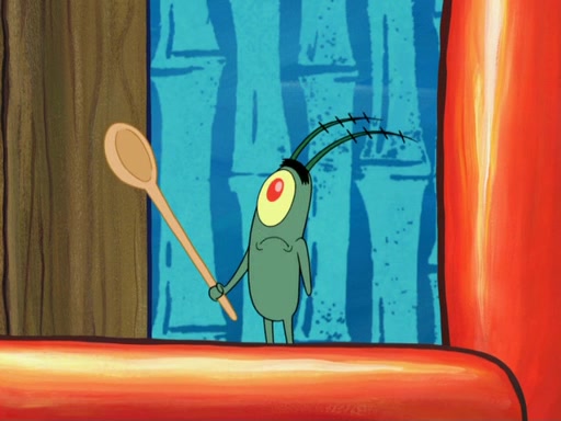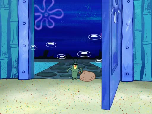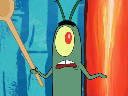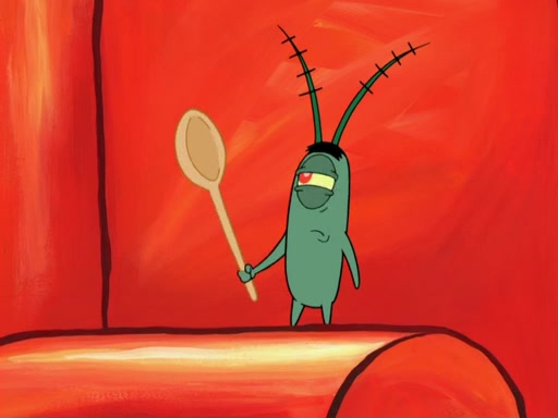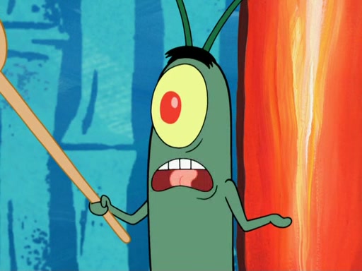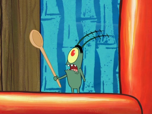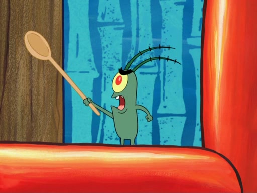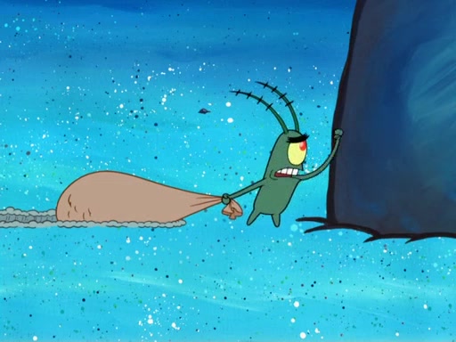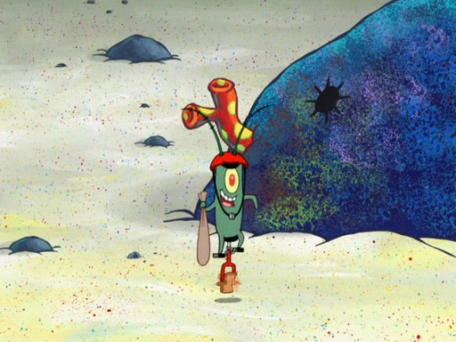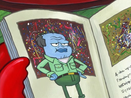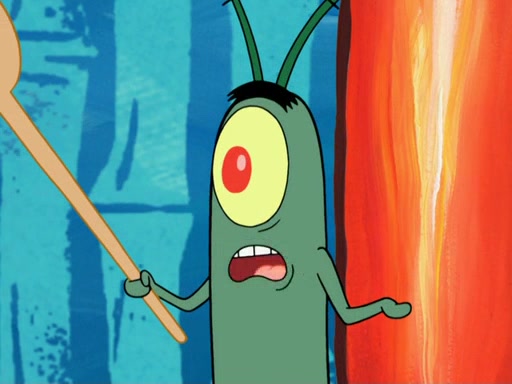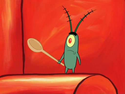 Later, Plankton sees the artwork, and mistakes it for garbage. Planning to reverse-engineer the recipe, he steals it. Police officers immediately chased him. They dog him every step of the way, from a movie theater, a grocery store, and a satellite in space. When he loses them, he is baffled as to why the police are chasing him, rather than Mr. Krabs. At night, he knocks on Patrick's rock, but when Patrick answers, he angrily tells him that he has a busy day of doing nothing tomorrow. Plankton goes to SpongeBob's house, using a spoon to hold SpongeBob and Gary hostage, and demands an explanation as to why the police are after him. SpongeBob explains that what he has stolen is in fact a priceless work of art. Plankton gets the idea to sell the artwork, and declared SpongeBob and Gary to be accomplices to his crime. Patrick comes in, and yells at everyone for making so much noise as to keep him awake, while eating something.