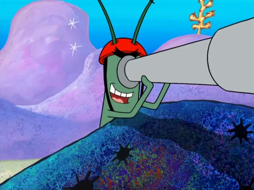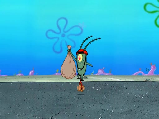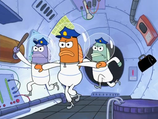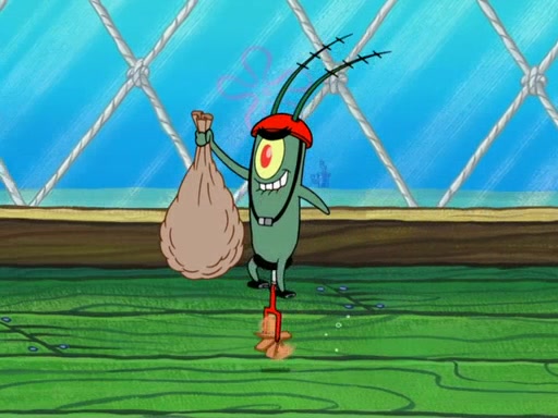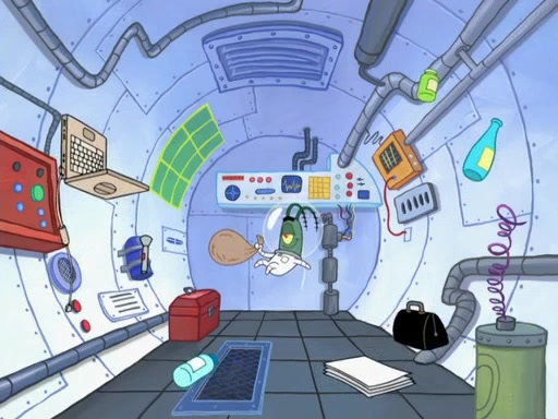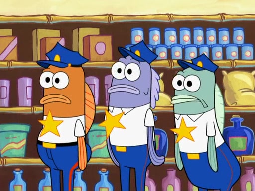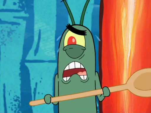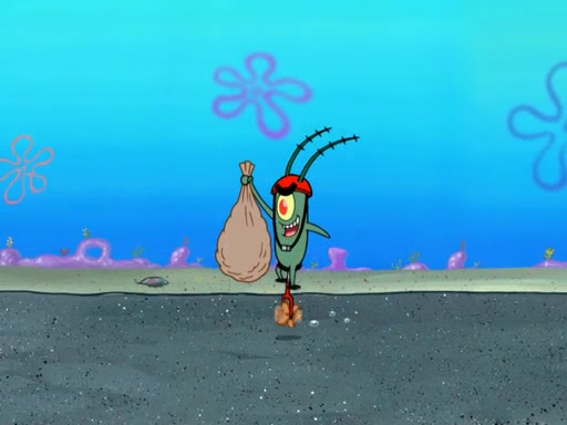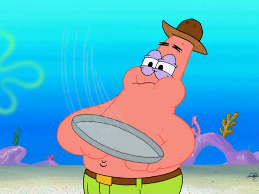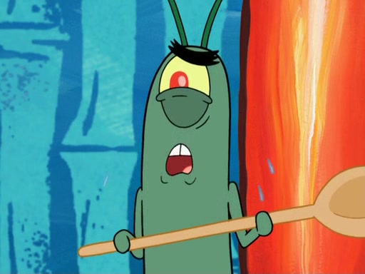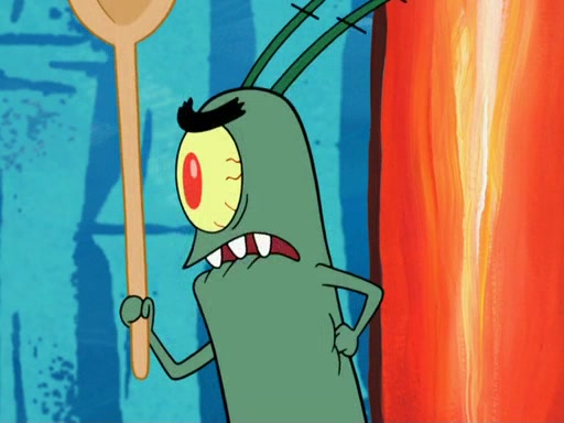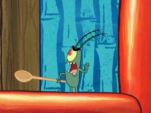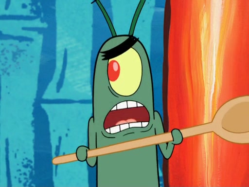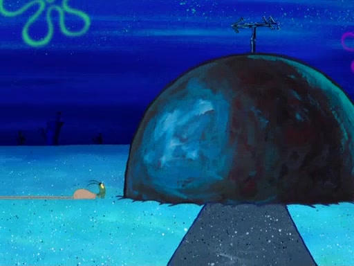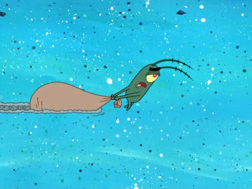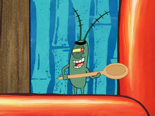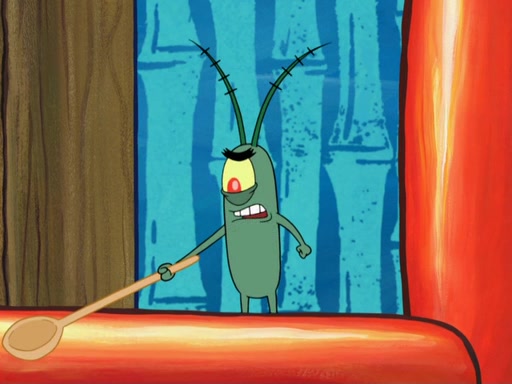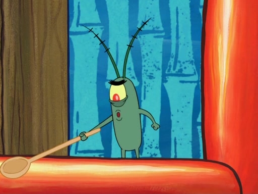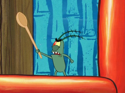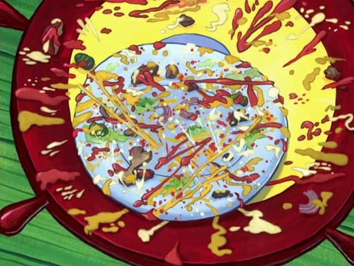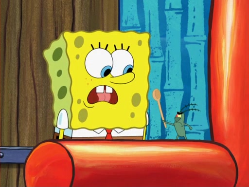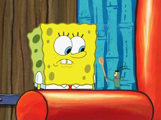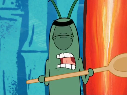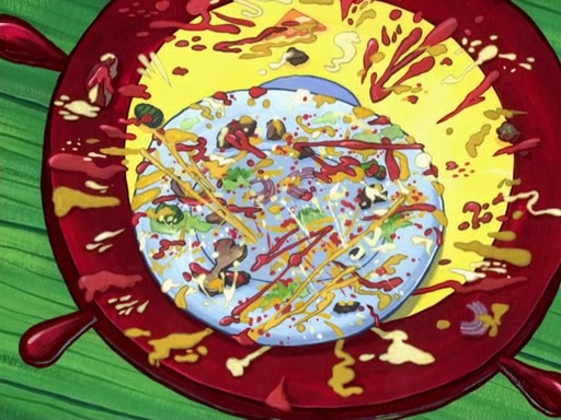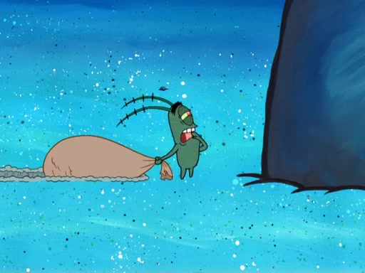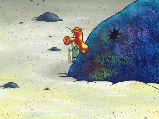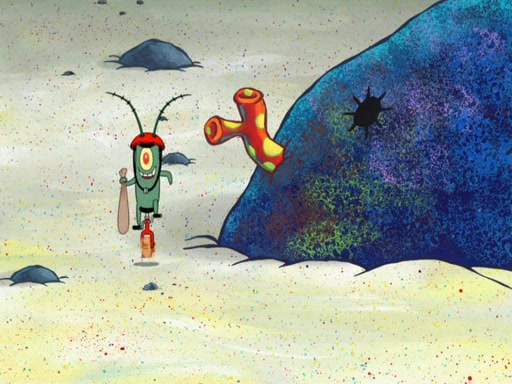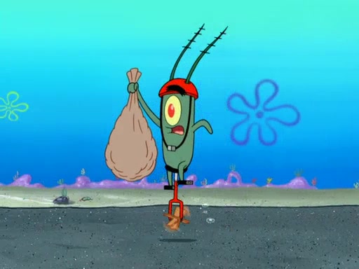 Later, Plankton sees the artwork, and mistakes it for garbage. Planning to reverse-engineer the recipe, he steals it. Police officers immediately chased him. They dog him every step of the way, from a movie theater, a grocery store, and a satellite in space. When he loses them, he is baffled as to why the police are chasing him, rather than Mr. Krabs. At night, he knocks on Patrick's rock, but when Patrick answers, he angrily tells him that he has a busy day of doing nothing tomorrow. Plankton goes to SpongeBob's house, using a spoon to hold SpongeBob and Gary hostage, and demands an explanation as to why the police are after him. SpongeBob explains that what he has stolen is in fact a priceless work of art. Plankton gets the idea to sell the artwork, and declared SpongeBob and Gary to be accomplices to his crime. Patrick comes in, and yells at everyone for making so much noise as to keep him awake, while eating something.