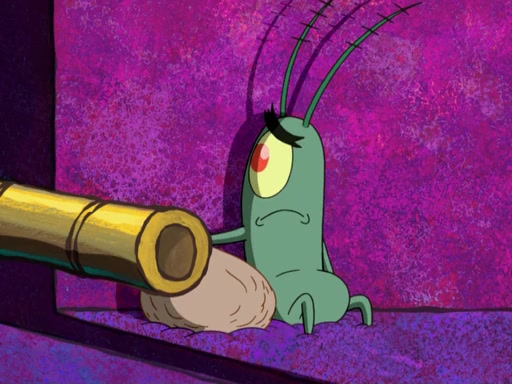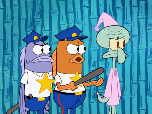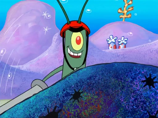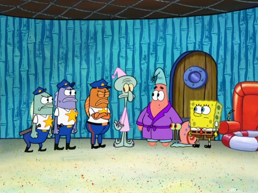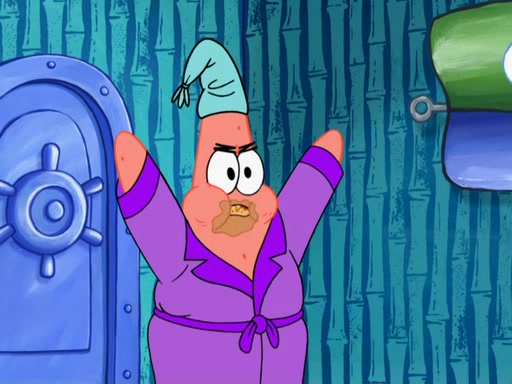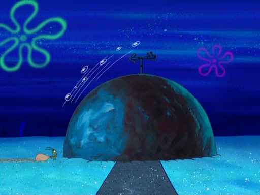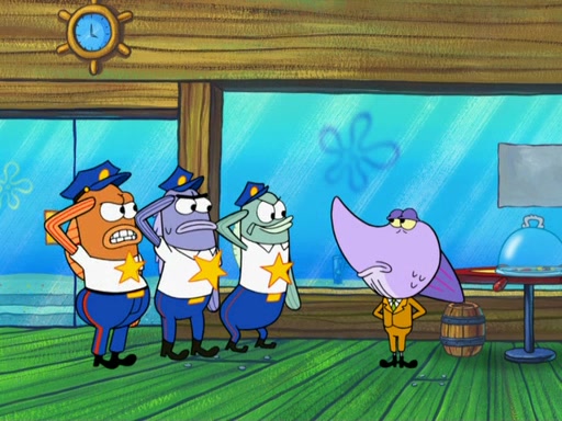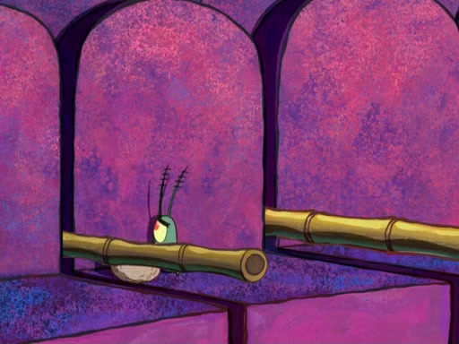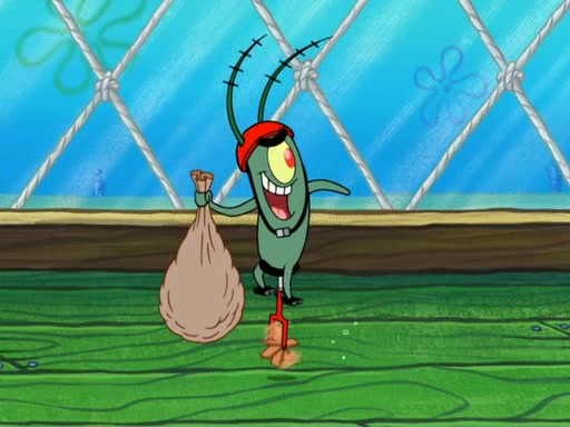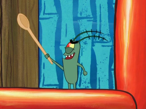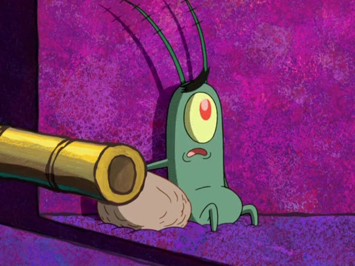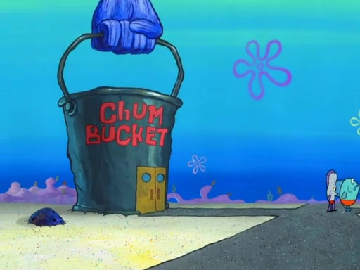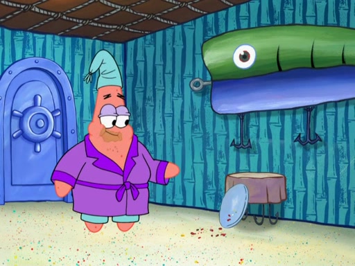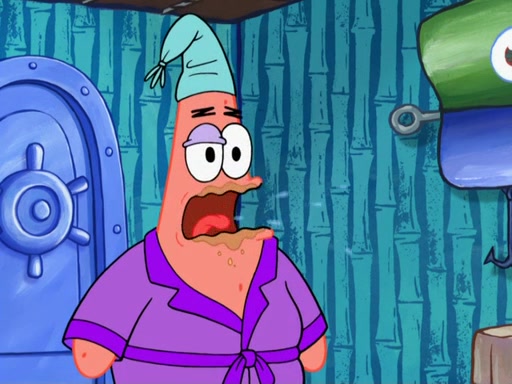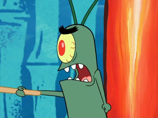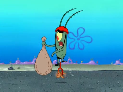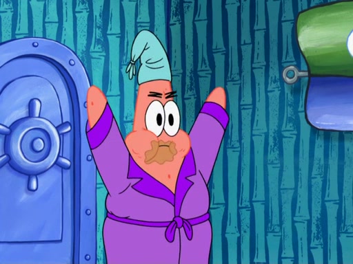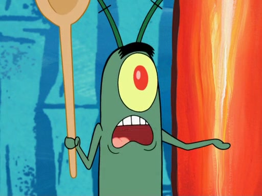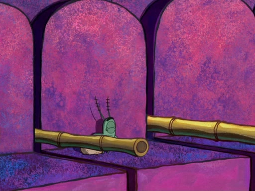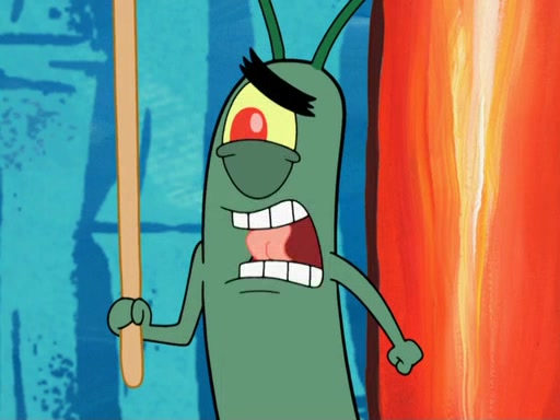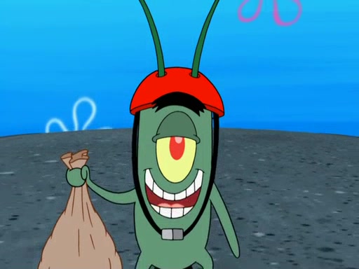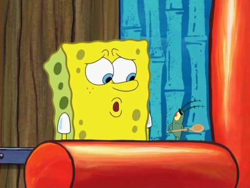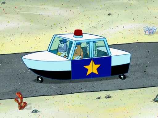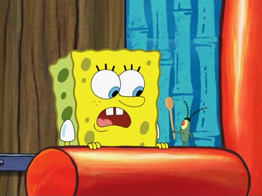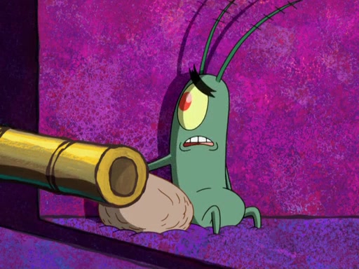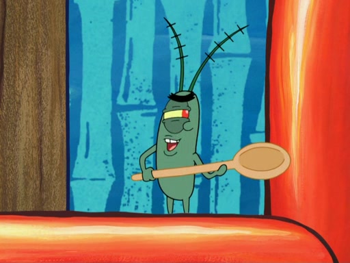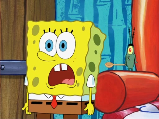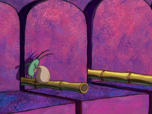 Later, Plankton sees the artwork, and mistakes it for garbage. Planning to reverse-engineer the recipe, he steals it. Police officers immediately chased him. They dog him every step of the way, from a movie theater, a grocery store, and a satellite in space. When he loses them, he is baffled as to why the police are chasing him, rather than Mr. Krabs. At night, he knocks on Patrick's rock, but when Patrick answers, he angrily tells him that he has a busy day of doing nothing tomorrow. Plankton goes to SpongeBob's house, using a spoon to hold SpongeBob and Gary hostage, and demands an explanation as to why the police are after him. SpongeBob explains that what he has stolen is in fact a priceless work of art. Plankton gets the idea to sell the artwork, and declared SpongeBob and Gary to be accomplices to his crime. Patrick comes in, and yells at everyone for making so much noise as to keep him awake, while eating something.