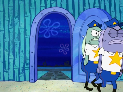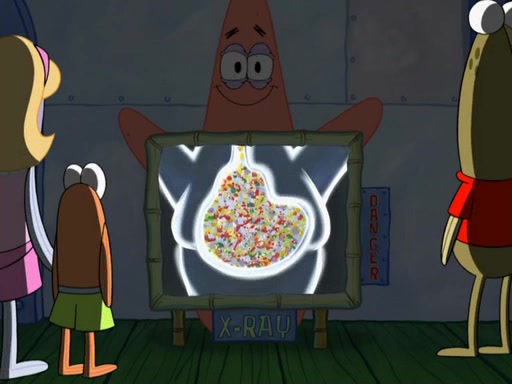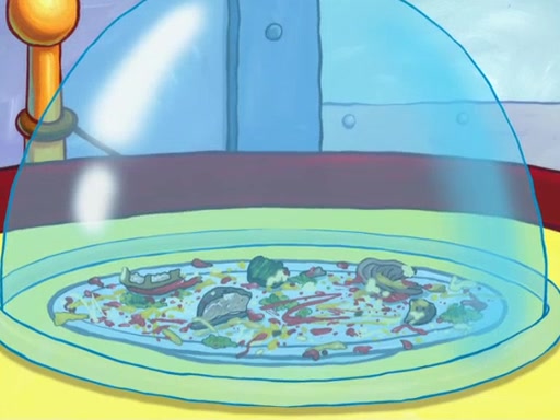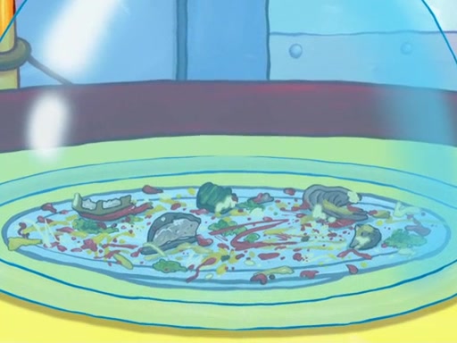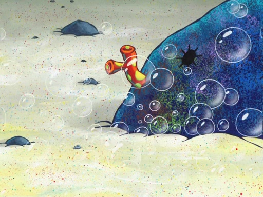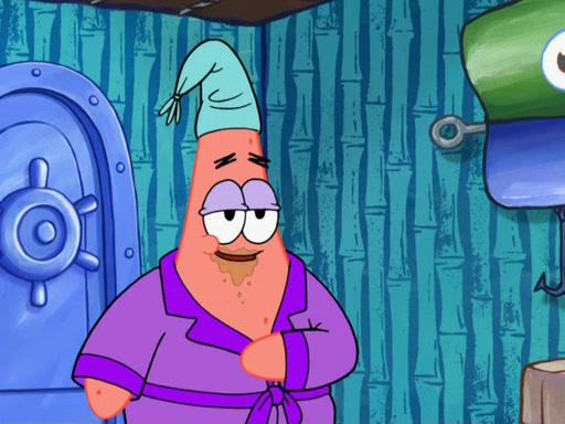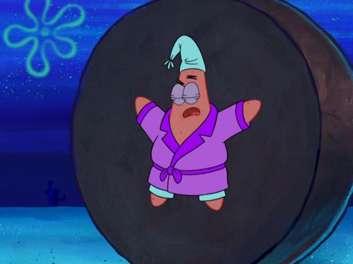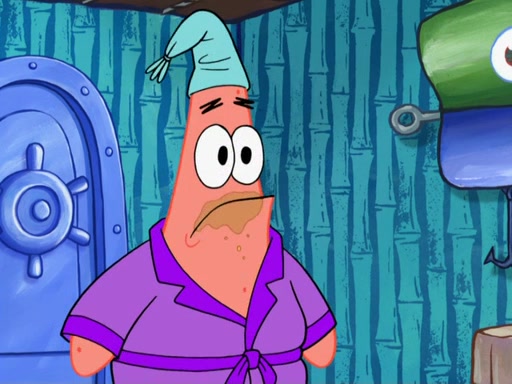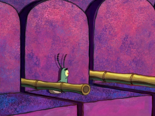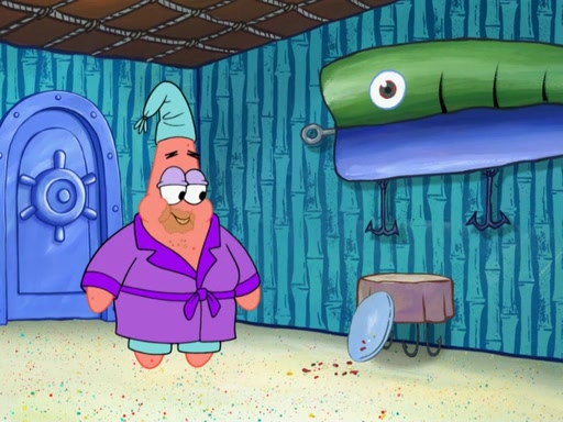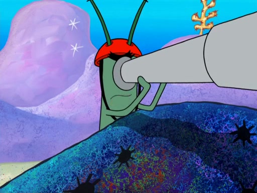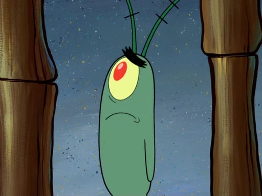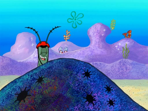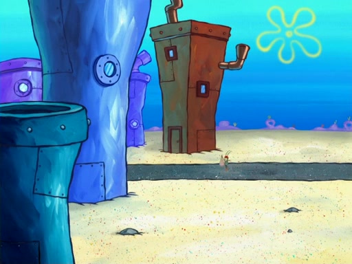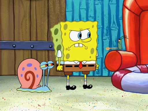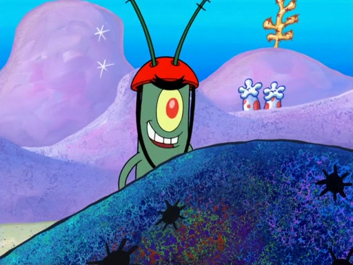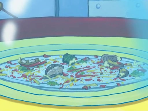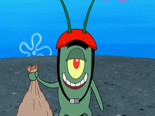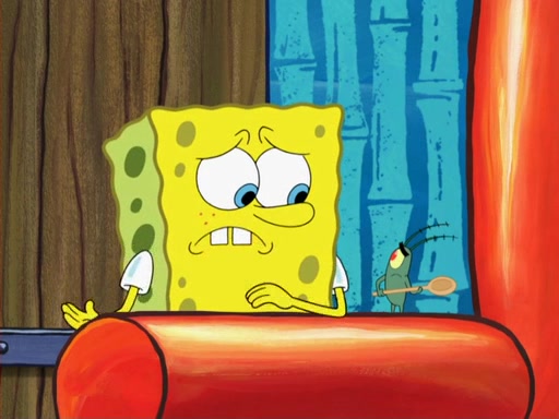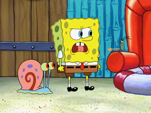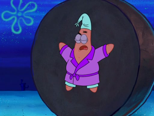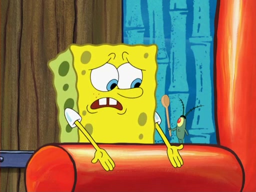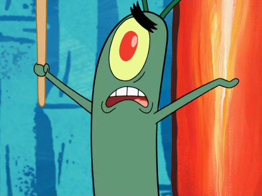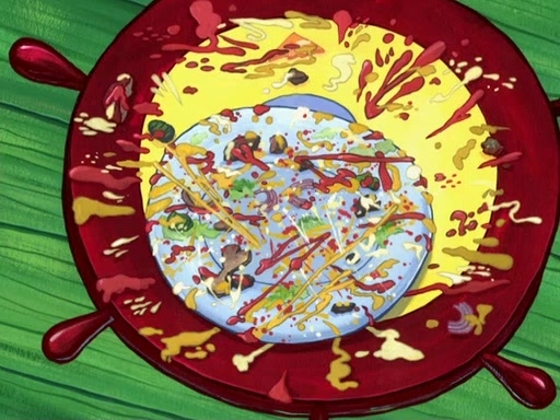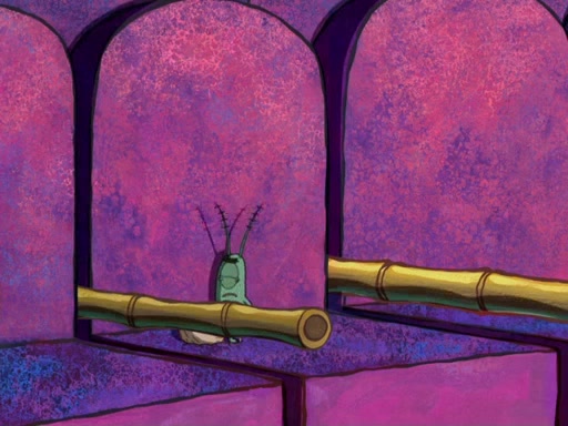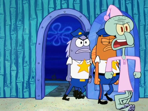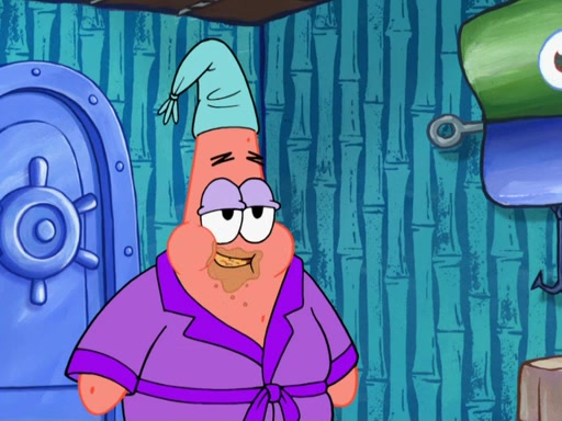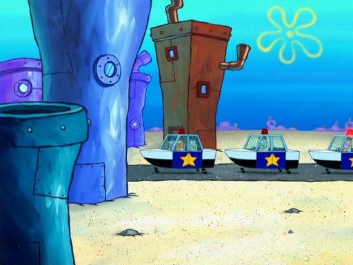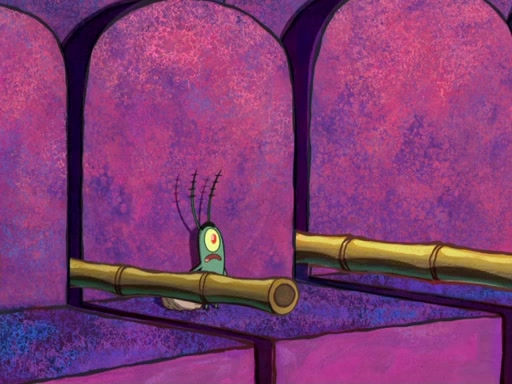 Later, Plankton sees the artwork, and mistakes it for garbage. Planning to reverse-engineer the recipe, he steals it. Police officers immediately chased him. They dog him every step of the way, from a movie theater, a grocery store, and a satellite in space. When he loses them, he is baffled as to why the police are chasing him, rather than Mr. Krabs. At night, he knocks on Patrick's rock, but when Patrick answers, he angrily tells him that he has a busy day of doing nothing tomorrow. Plankton goes to SpongeBob's house, using a spoon to hold SpongeBob and Gary hostage, and demands an explanation as to why the police are after him. SpongeBob explains that what he has stolen is in fact a priceless work of art. Plankton gets the idea to sell the artwork, and declared SpongeBob and Gary to be accomplices to his crime. Patrick comes in, and yells at everyone for making so much noise as to keep him awake, while eating something.