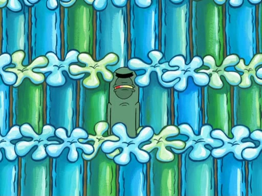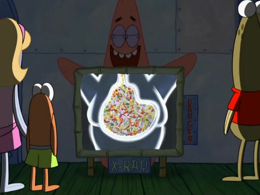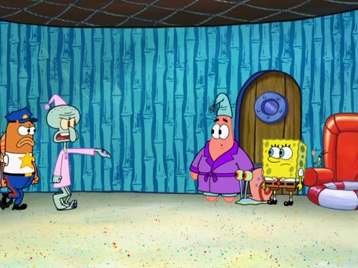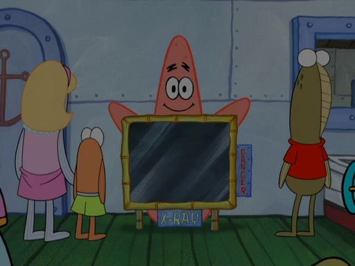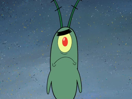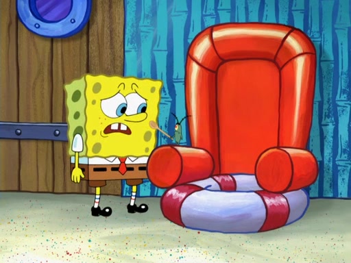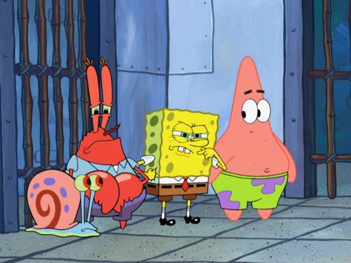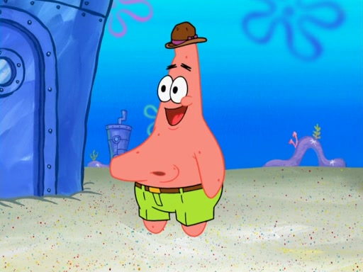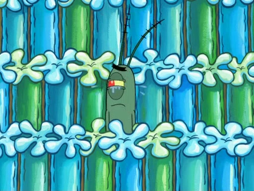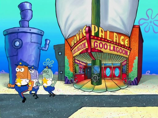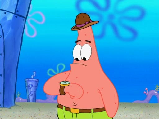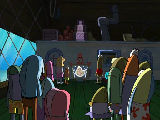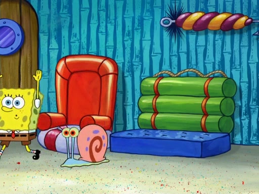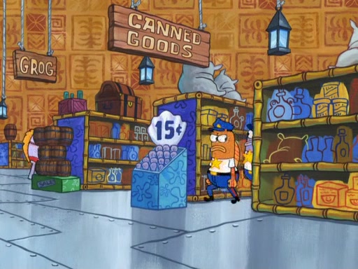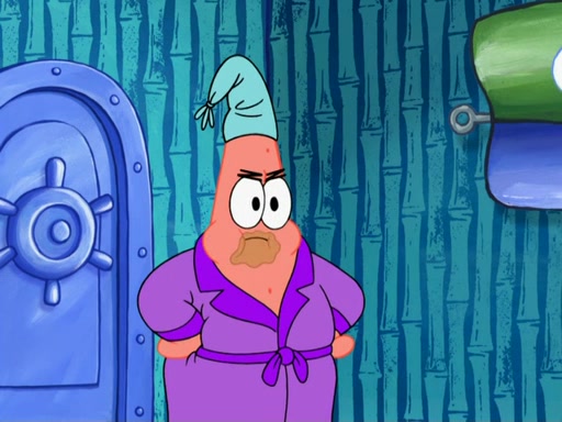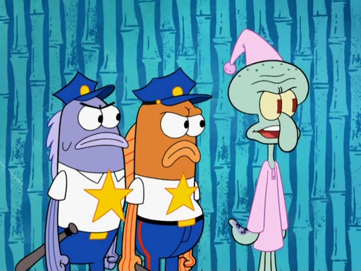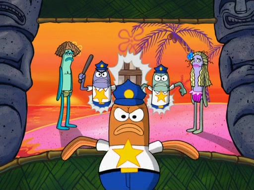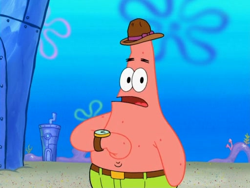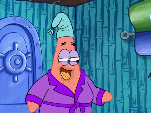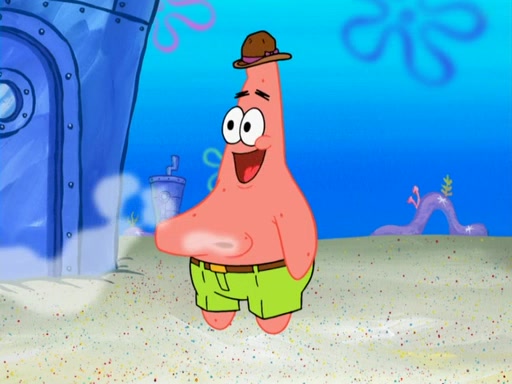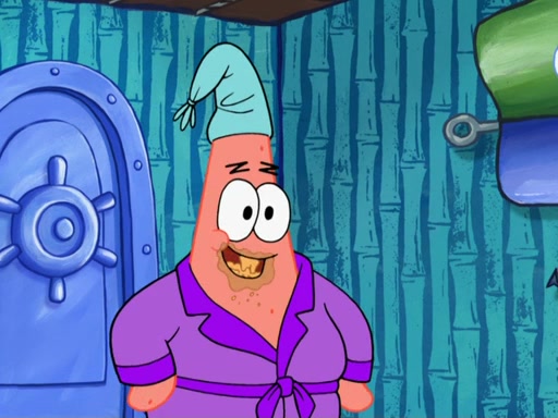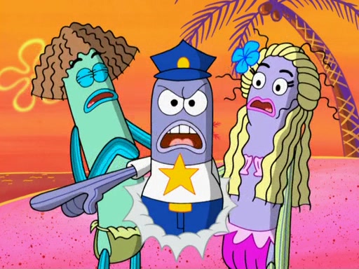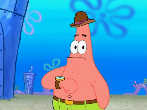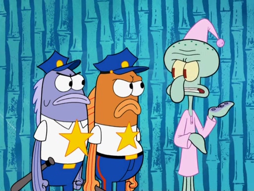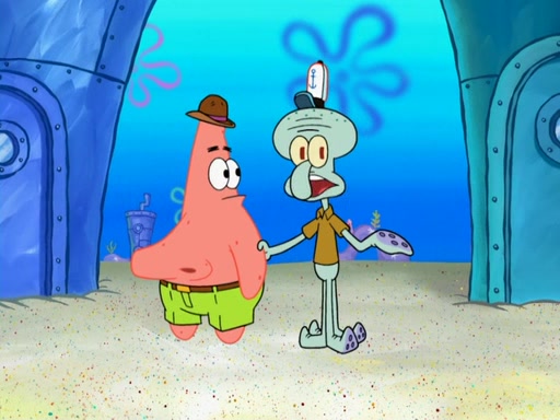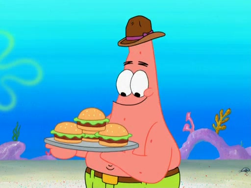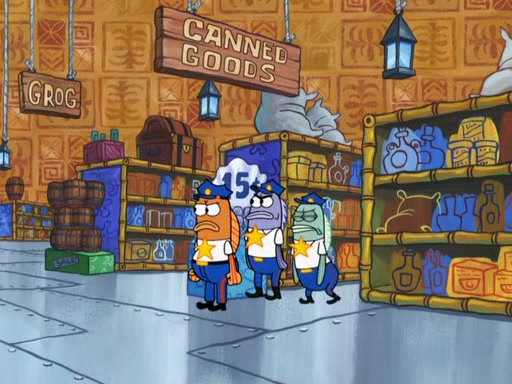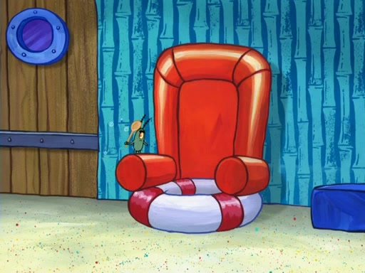 Later, Plankton sees the artwork, and mistakes it for garbage. Planning to reverse-engineer the recipe, he steals it. Police officers immediately chased him. They dog him every step of the way, from a movie theater, a grocery store, and a satellite in space. When he loses them, he is baffled as to why the police are chasing him, rather than Mr. Krabs. At night, he knocks on Patrick's rock, but when Patrick answers, he angrily tells him that he has a busy day of doing nothing tomorrow. Plankton goes to SpongeBob's house, using a spoon to hold SpongeBob and Gary hostage, and demands an explanation as to why the police are after him. SpongeBob explains that what he has stolen is in fact a priceless work of art. Plankton gets the idea to sell the artwork, and declared SpongeBob and Gary to be accomplices to his crime. Patrick comes in, and yells at everyone for making so much noise as to keep him awake, while eating something.