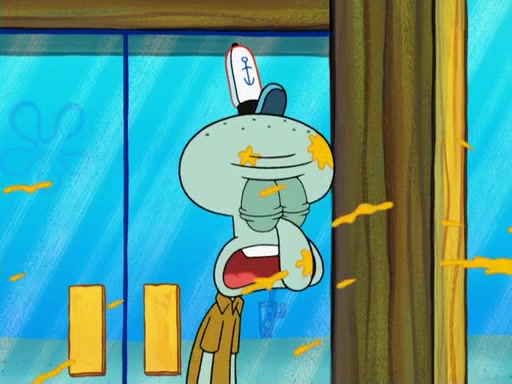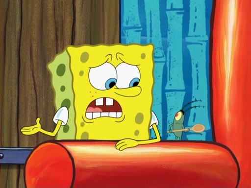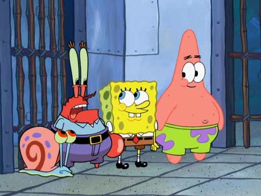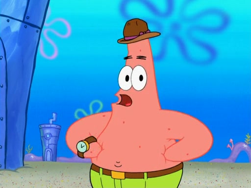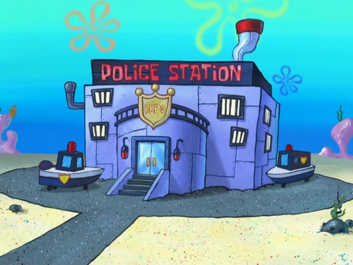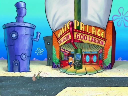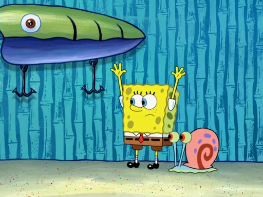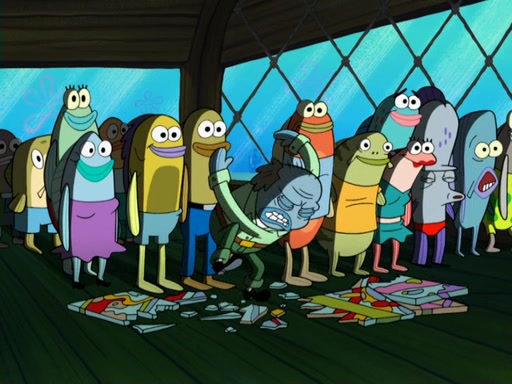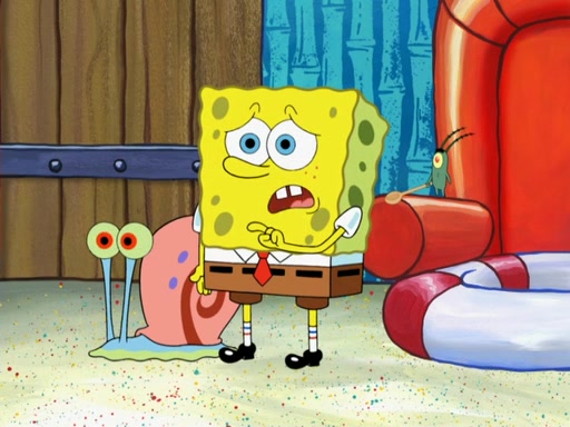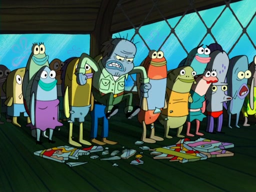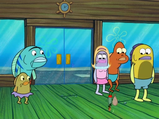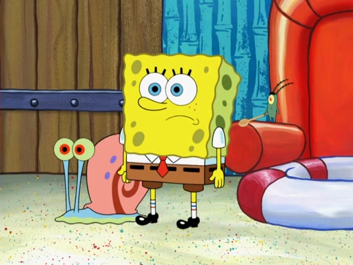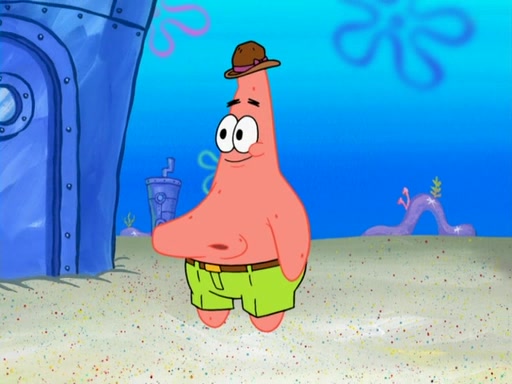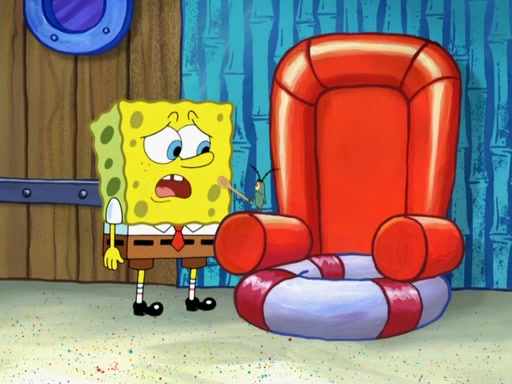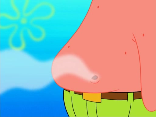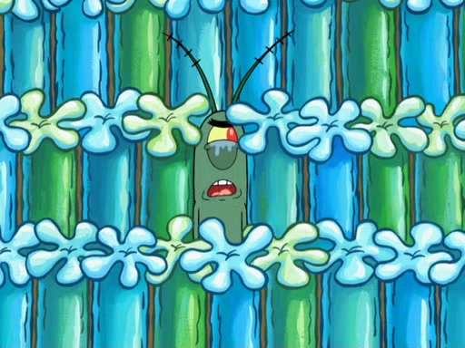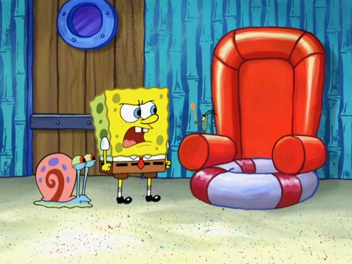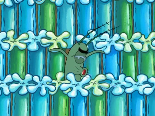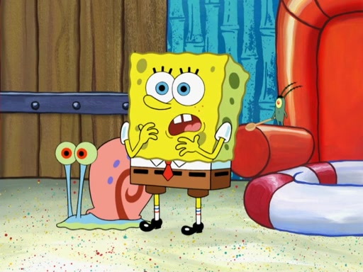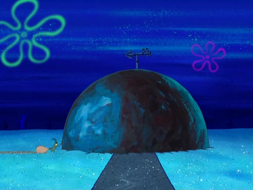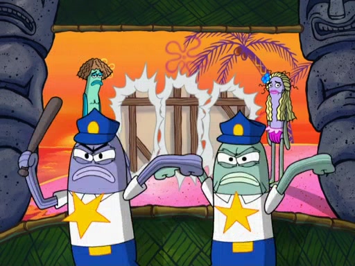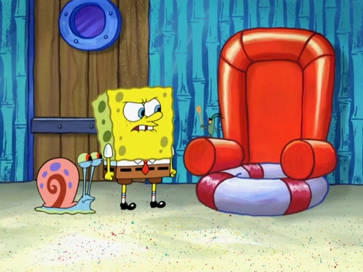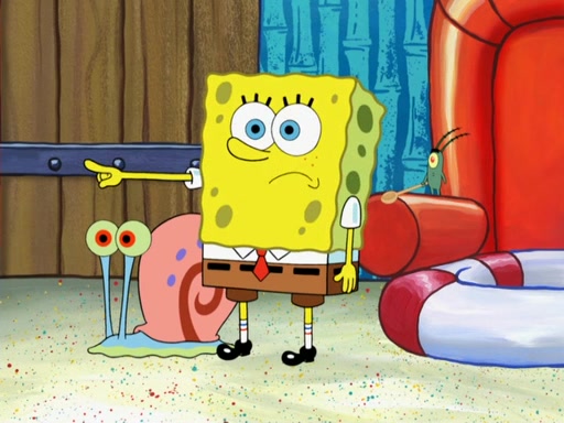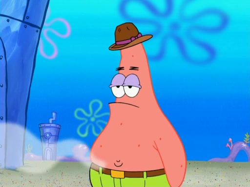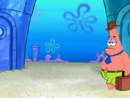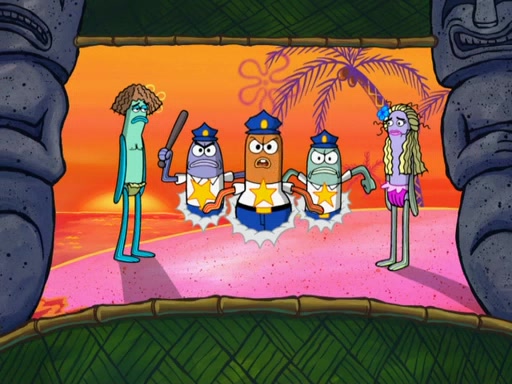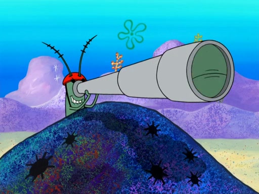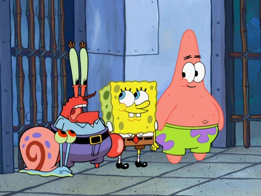 Later, Plankton sees the artwork, and mistakes it for garbage. Planning to reverse-engineer the recipe, he steals it. Police officers immediately chased him. They dog him every step of the way, from a movie theater, a grocery store, and a satellite in space. When he loses them, he is baffled as to why the police are chasing him, rather than Mr. Krabs. At night, he knocks on Patrick's rock, but when Patrick answers, he angrily tells him that he has a busy day of doing nothing tomorrow. Plankton goes to SpongeBob's house, using a spoon to hold SpongeBob and Gary hostage, and demands an explanation as to why the police are after him. SpongeBob explains that what he has stolen is in fact a priceless work of art. Plankton gets the idea to sell the artwork, and declared SpongeBob and Gary to be accomplices to his crime. Patrick comes in, and yells at everyone for making so much noise as to keep him awake, while eating something.