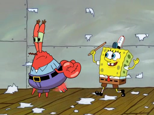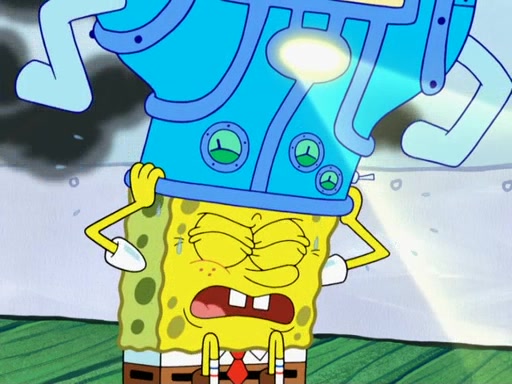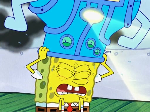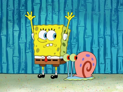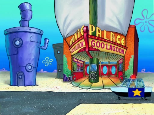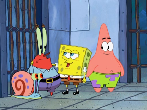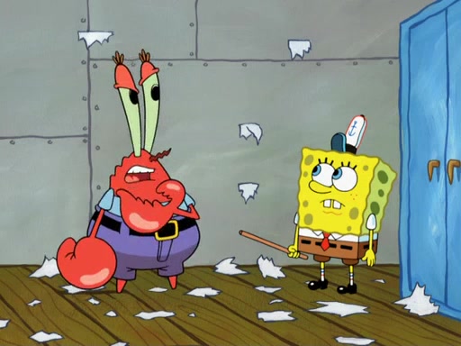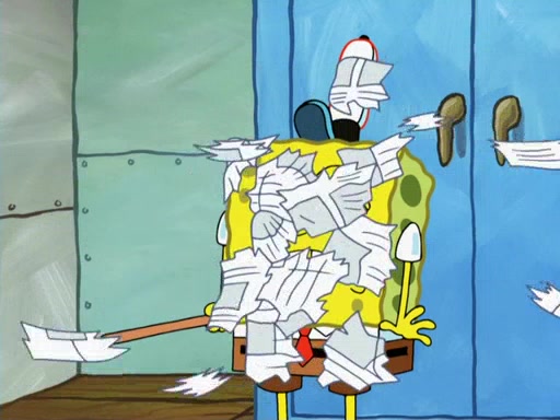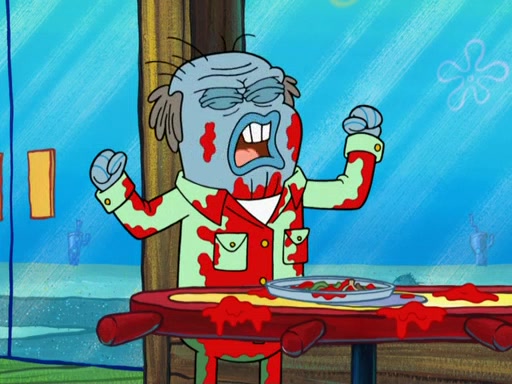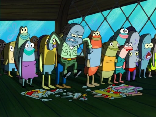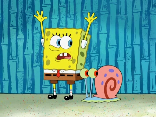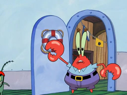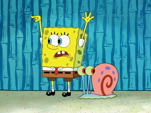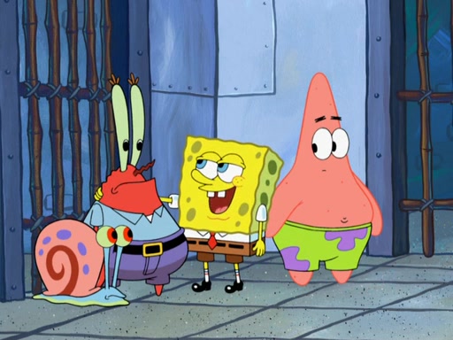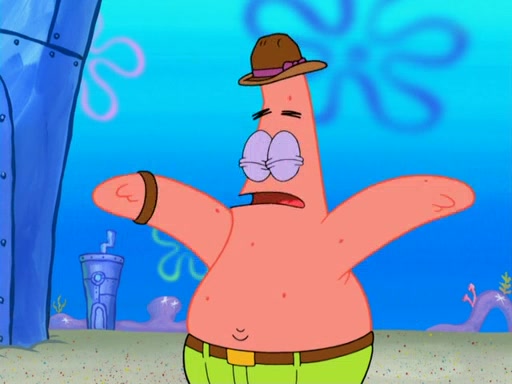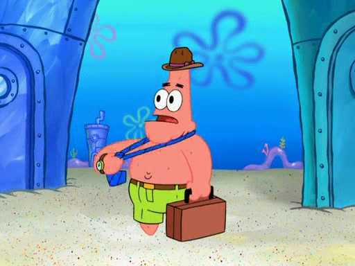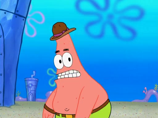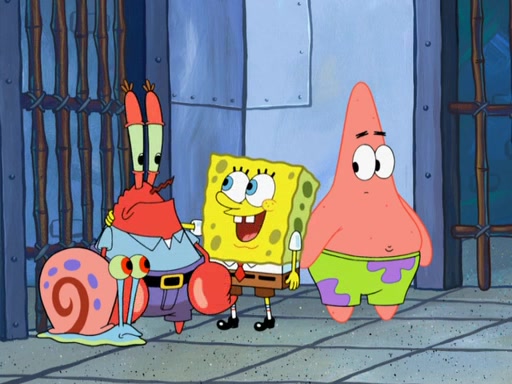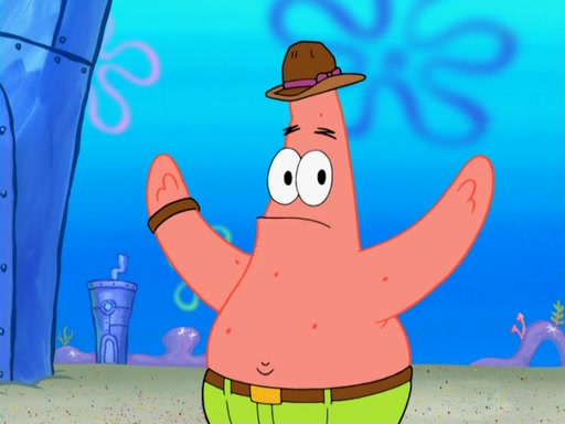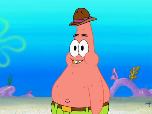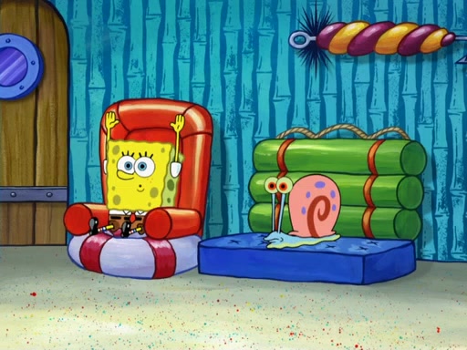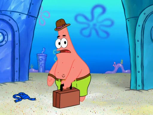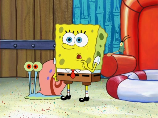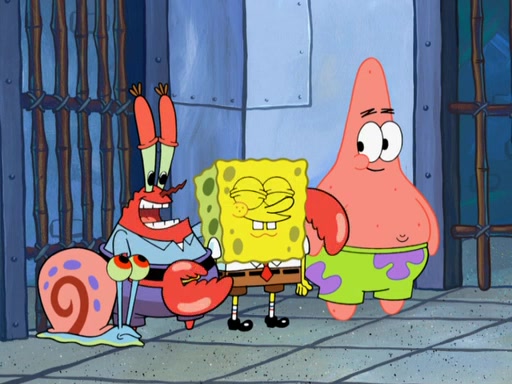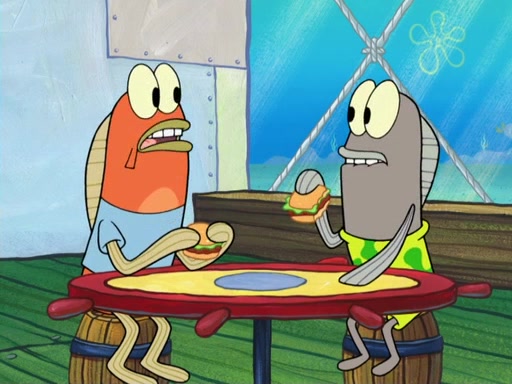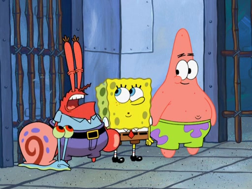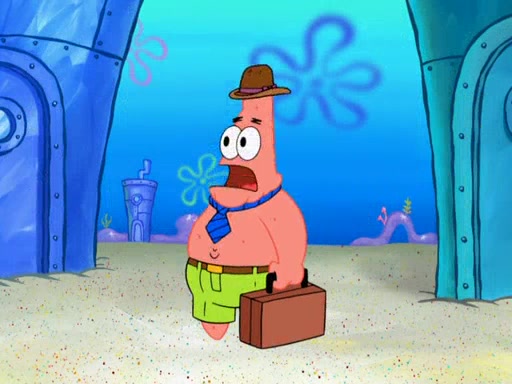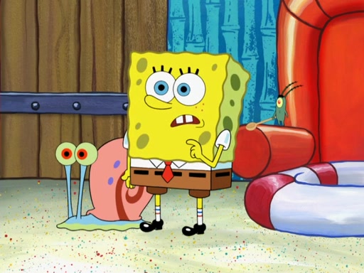 Later, Plankton sees the artwork, and mistakes it for garbage. Planning to reverse-engineer the recipe, he steals it. Police officers immediately chased him. They dog him every step of the way, from a movie theater, a grocery store, and a satellite in space. When he loses them, he is baffled as to why the police are chasing him, rather than Mr. Krabs. At night, he knocks on Patrick's rock, but when Patrick answers, he angrily tells him that he has a busy day of doing nothing tomorrow. Plankton goes to SpongeBob's house, using a spoon to hold SpongeBob and Gary hostage, and demands an explanation as to why the police are after him. SpongeBob explains that what he has stolen is in fact a priceless work of art. Plankton gets the idea to sell the artwork, and declared SpongeBob and Gary to be accomplices to his crime. Patrick comes in, and yells at everyone for making so much noise as to keep him awake, while eating something.