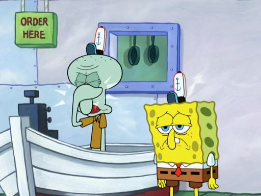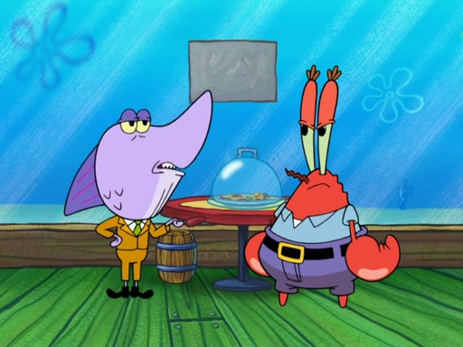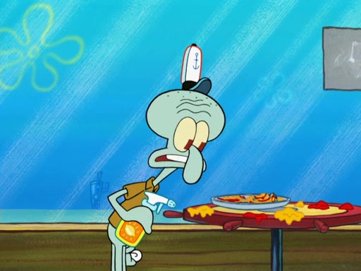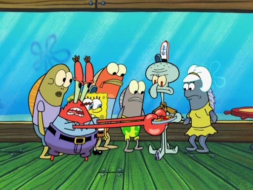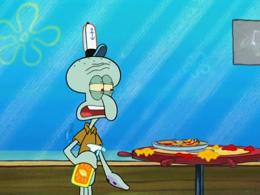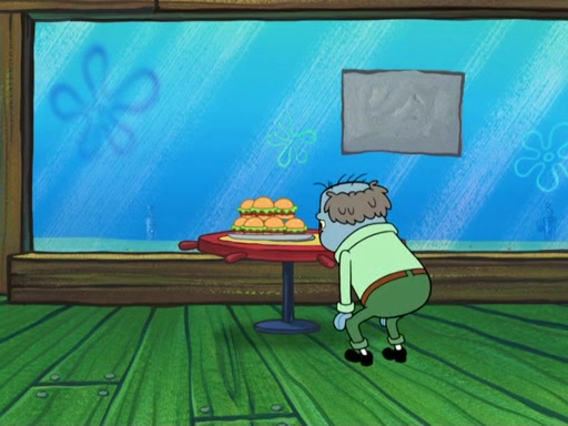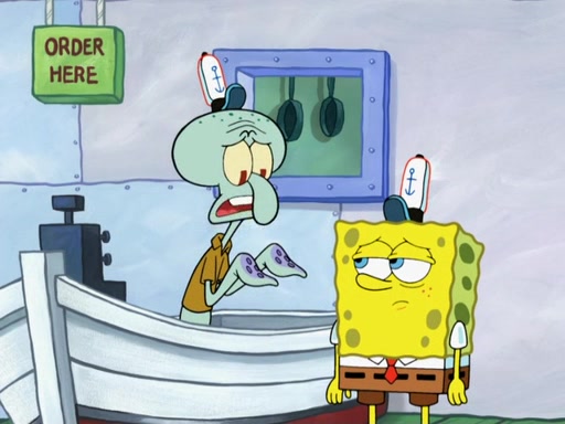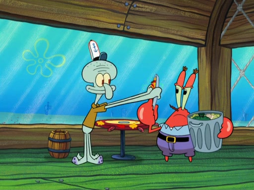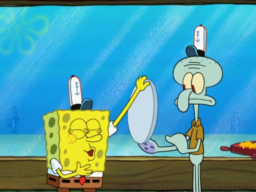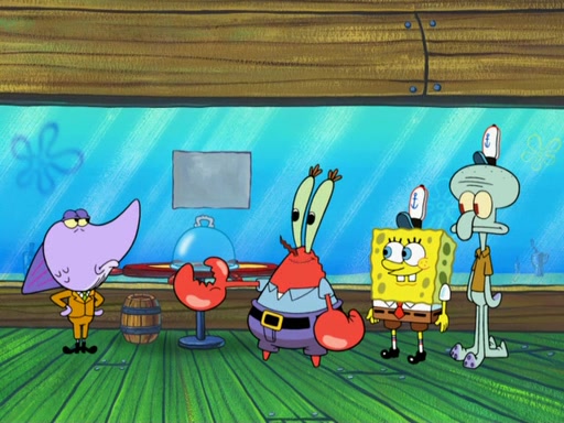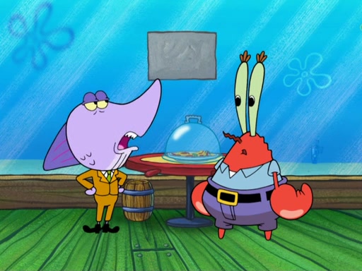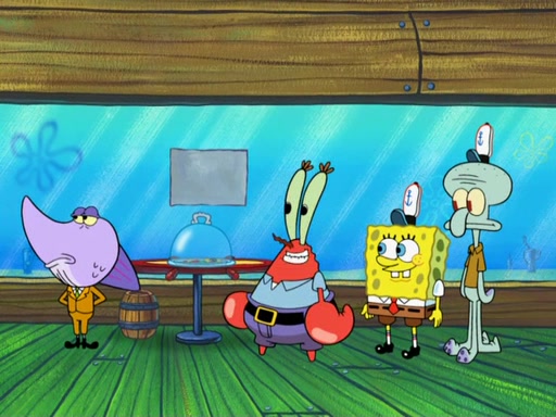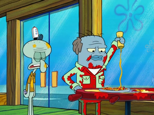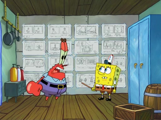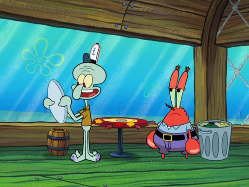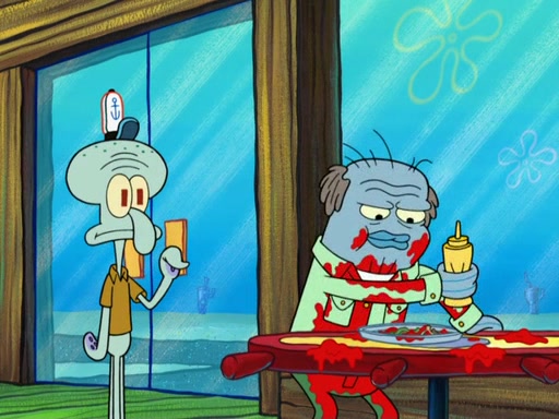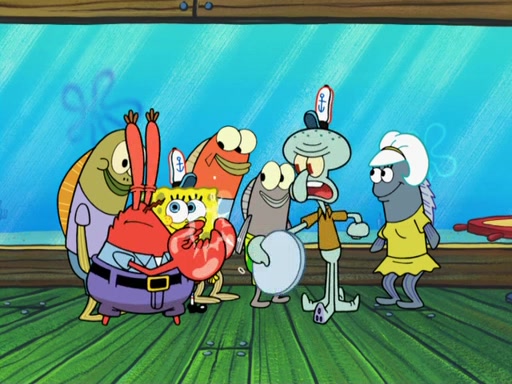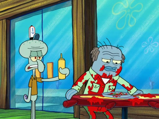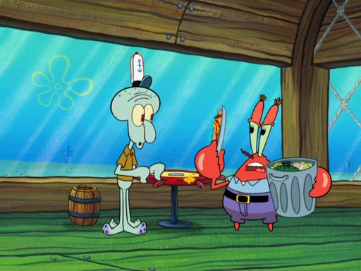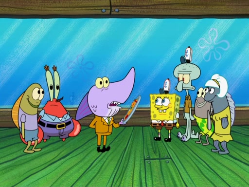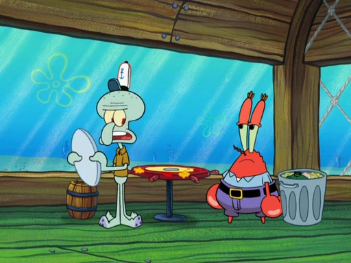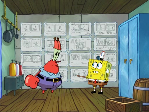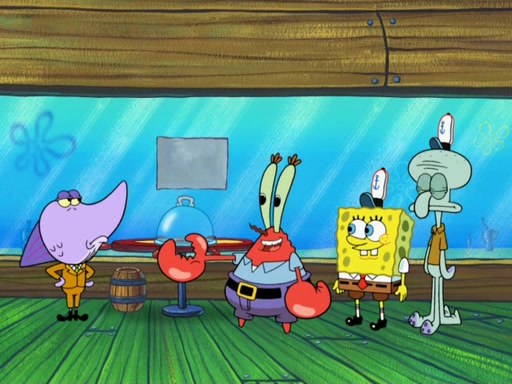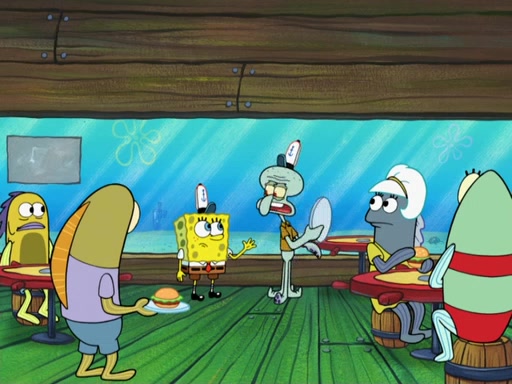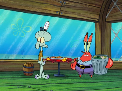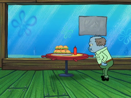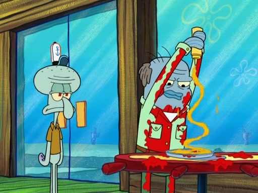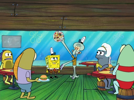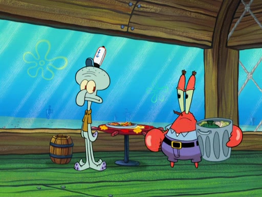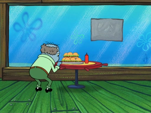 The scene opens up with Patrick, dressed in a business suit, asking where he can get something to eat. Squidward walks in, and tells him the answer is before him: the Krusty Krab. Mr. Krabs, dressed in a leotard, jumps out of the Krusty Krab, and SpongeBob slides down a rainbow to his side, and Squidward, who rides a dolphin while holding a plate with Krabby Patties, which Patrick eats. Suddenly, SpongeBob describes Patrick's actions, then the scene turns to him and Mr. Krabs in front of a storyboard planned for a commercial. Mr. Krabs asks why he is in a leotard, and he says it is because he is the mascot. Mr. Krabs does not like this, so he tears up the storyboard, telling him he needs a "masterpiece". Sad, SpongeBob walks to Squidward's counter, sighing. When Squidward ignores him, he sighs repeatedly, each sigh more drawn-out than the one before, until Squidward gets so annoyed that he asks what is troubling him. He tells him about his problems, but Squidward does not care. As he walks into the dining area, Squidward notices a patron squirting ketchup onto a pile of Krabby Patties.