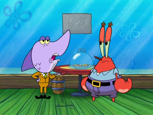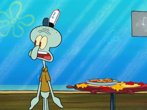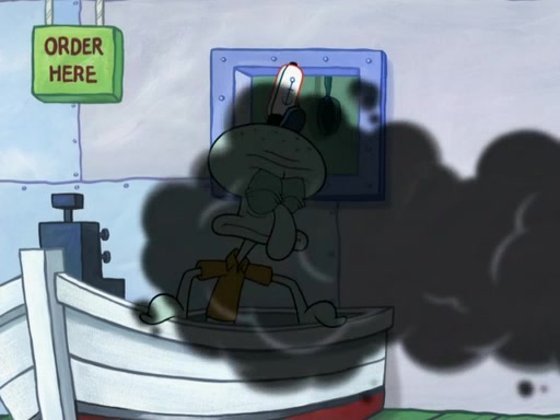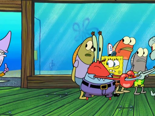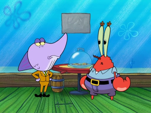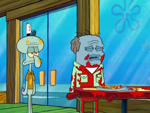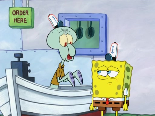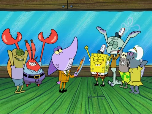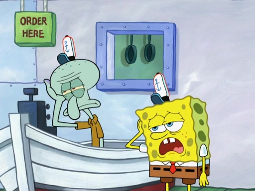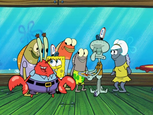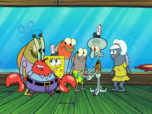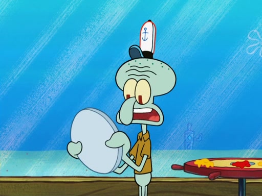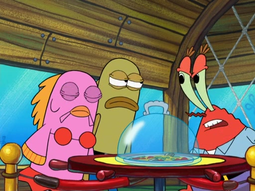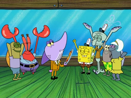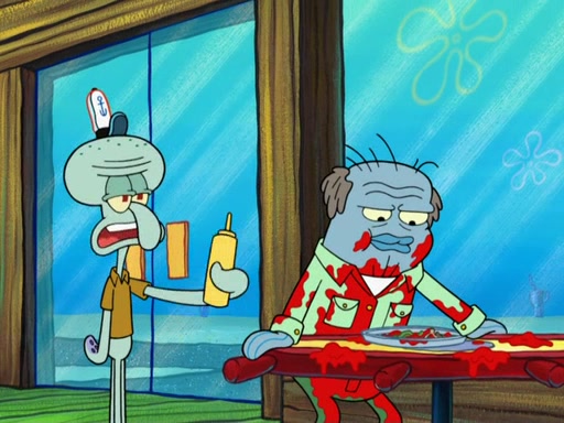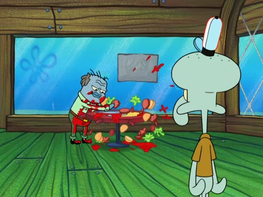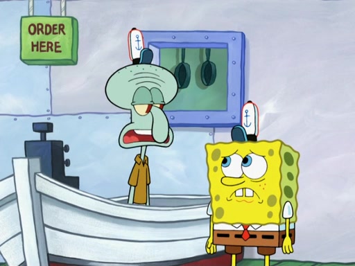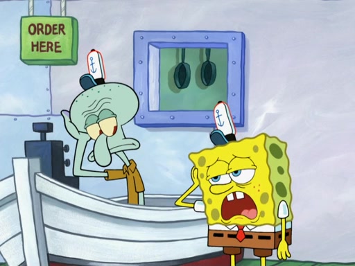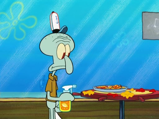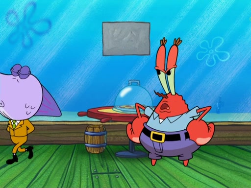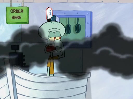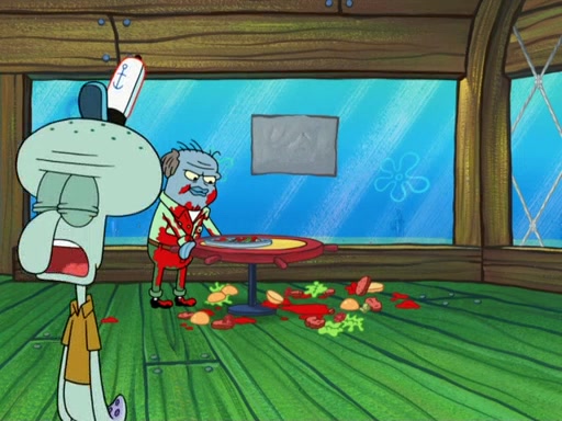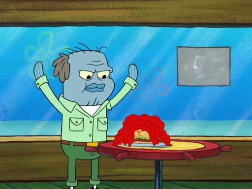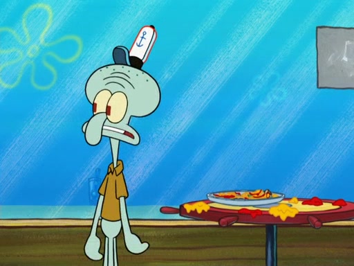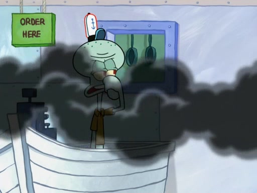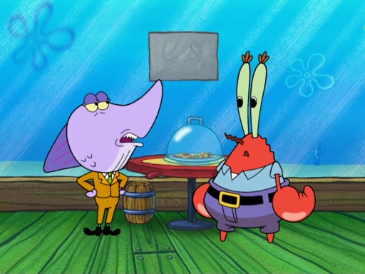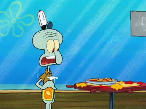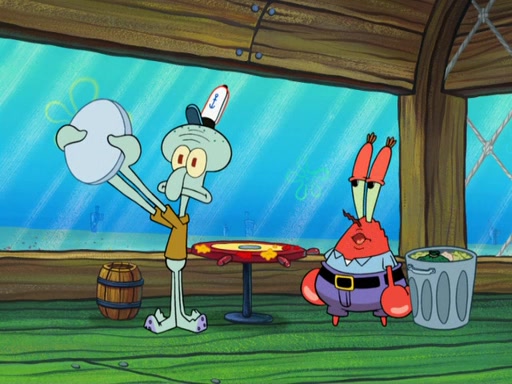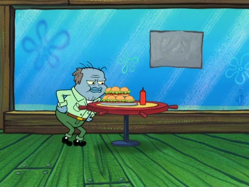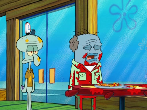 The scene opens up with Patrick, dressed in a business suit, asking where he can get something to eat. Squidward walks in, and tells him the answer is before him: the Krusty Krab. Mr. Krabs, dressed in a leotard, jumps out of the Krusty Krab, and SpongeBob slides down a rainbow to his side, and Squidward, who rides a dolphin while holding a plate with Krabby Patties, which Patrick eats. Suddenly, SpongeBob describes Patrick's actions, then the scene turns to him and Mr. Krabs in front of a storyboard planned for a commercial. Mr. Krabs asks why he is in a leotard, and he says it is because he is the mascot. Mr. Krabs does not like this, so he tears up the storyboard, telling him he needs a "masterpiece". Sad, SpongeBob walks to Squidward's counter, sighing. When Squidward ignores him, he sighs repeatedly, each sigh more drawn-out than the one before, until Squidward gets so annoyed that he asks what is troubling him. He tells him about his problems, but Squidward does not care. As he walks into the dining area, Squidward notices a patron squirting ketchup onto a pile of Krabby Patties.