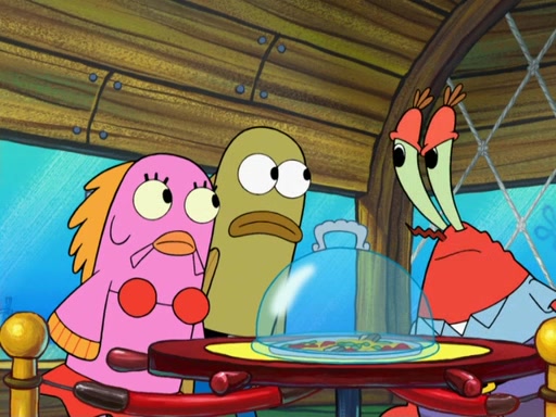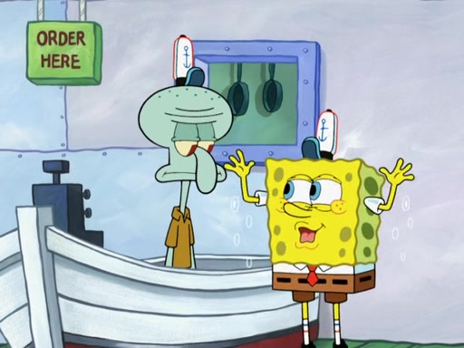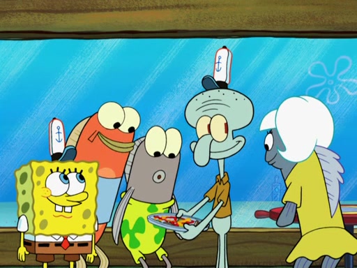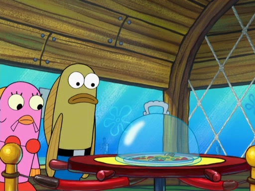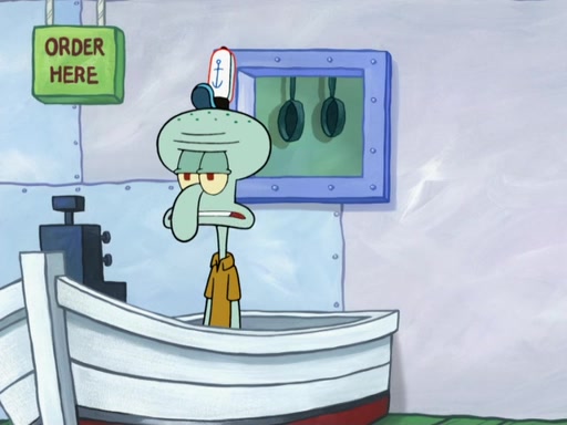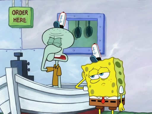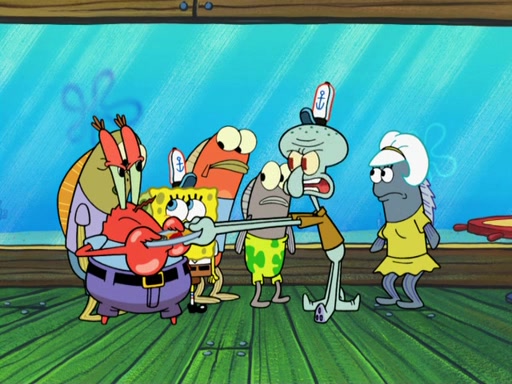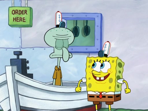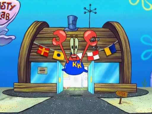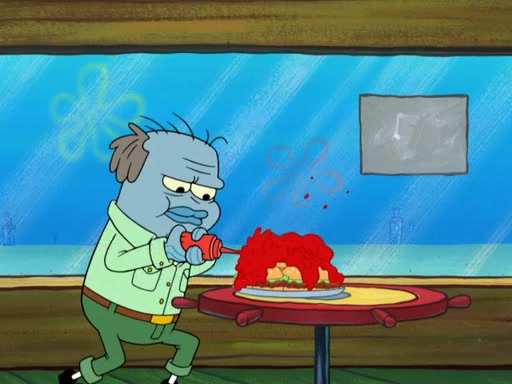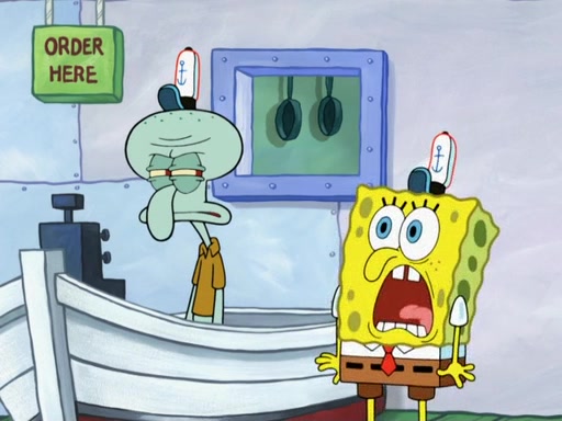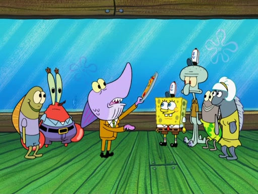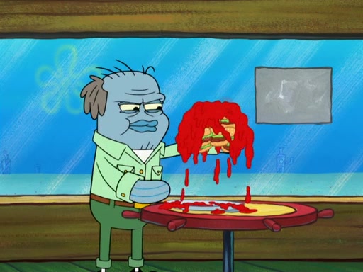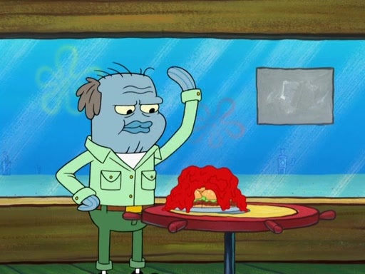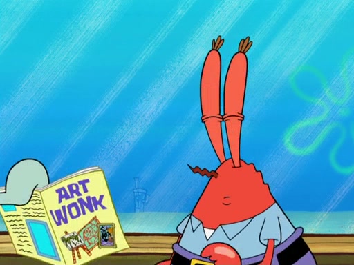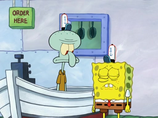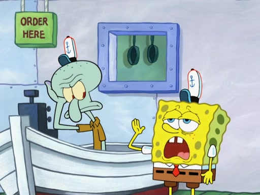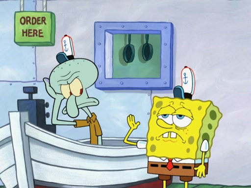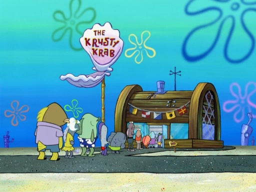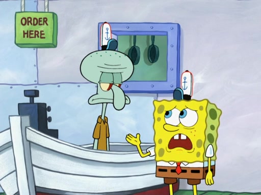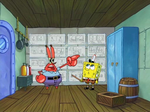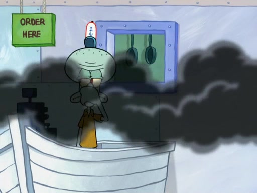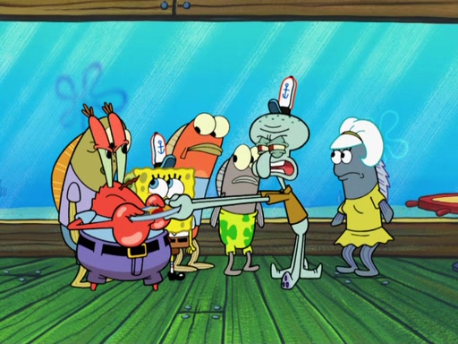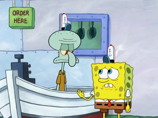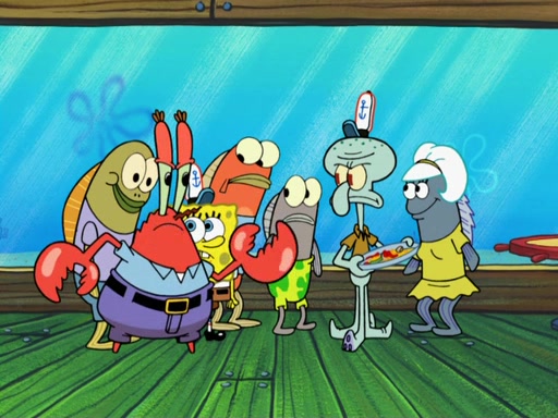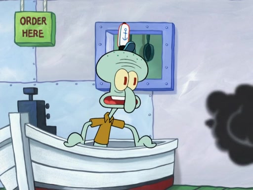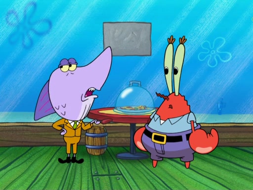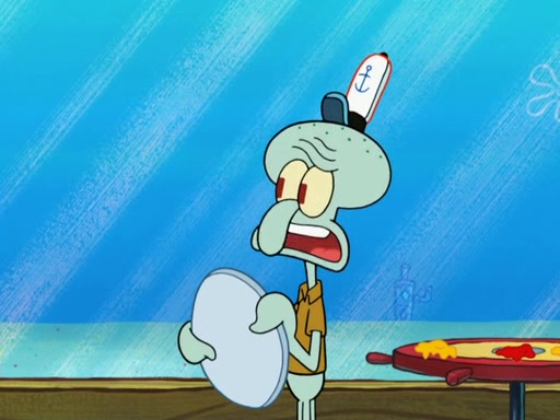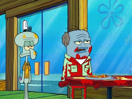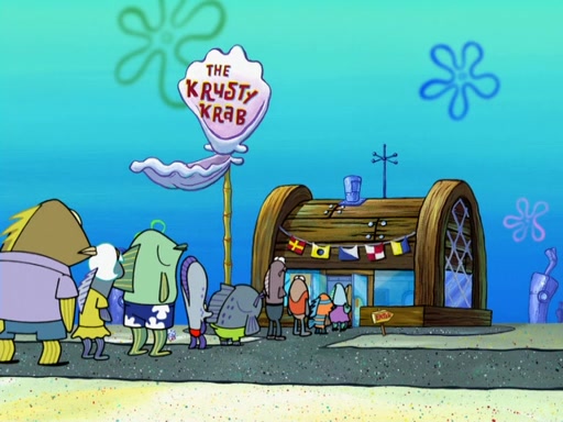 The scene opens up with Patrick, dressed in a business suit, asking where he can get something to eat. Squidward walks in, and tells him the answer is before him: the Krusty Krab. Mr. Krabs, dressed in a leotard, jumps out of the Krusty Krab, and SpongeBob slides down a rainbow to his side, and Squidward, who rides a dolphin while holding a plate with Krabby Patties, which Patrick eats. Suddenly, SpongeBob describes Patrick's actions, then the scene turns to him and Mr. Krabs in front of a storyboard planned for a commercial. Mr. Krabs asks why he is in a leotard, and he says it is because he is the mascot. Mr. Krabs does not like this, so he tears up the storyboard, telling him he needs a "masterpiece". Sad, SpongeBob walks to Squidward's counter, sighing. When Squidward ignores him, he sighs repeatedly, each sigh more drawn-out than the one before, until Squidward gets so annoyed that he asks what is troubling him. He tells him about his problems, but Squidward does not care. As he walks into the dining area, Squidward notices a patron squirting ketchup onto a pile of Krabby Patties.