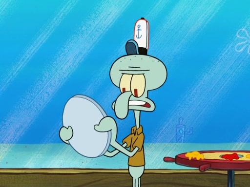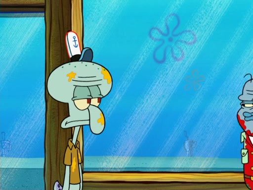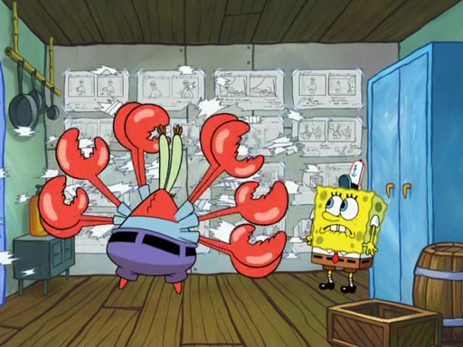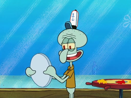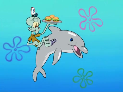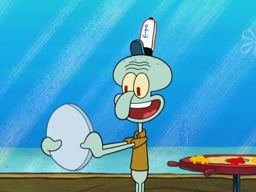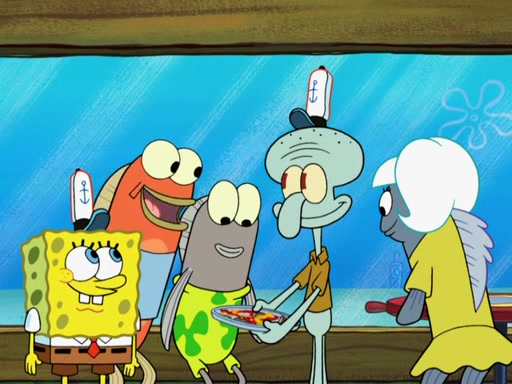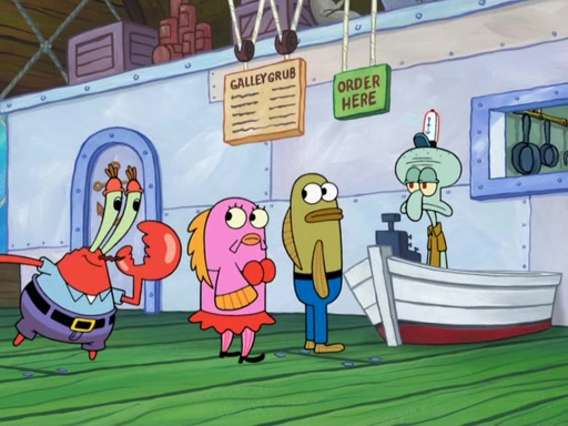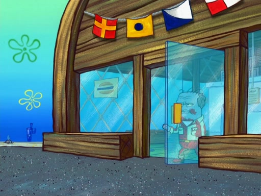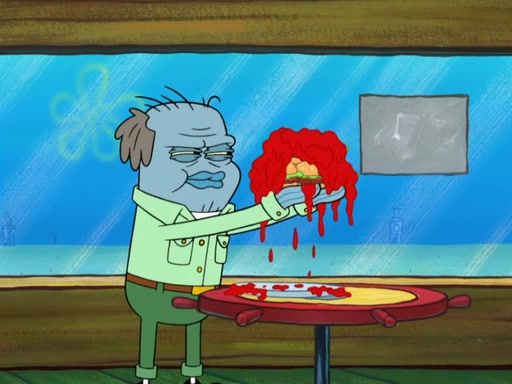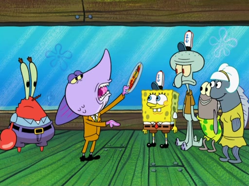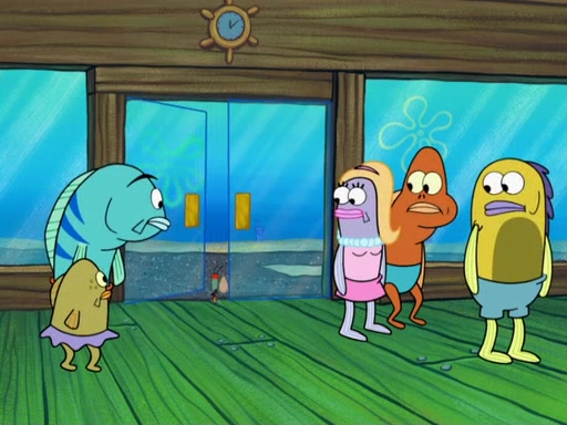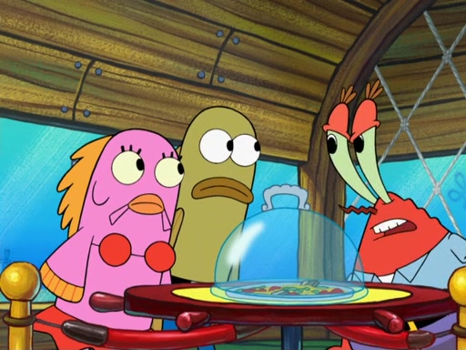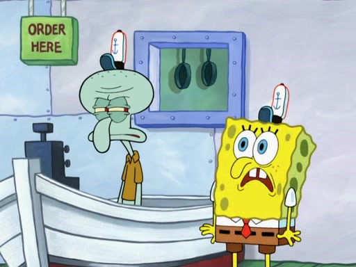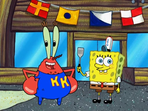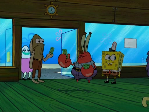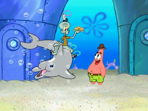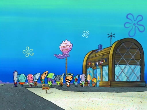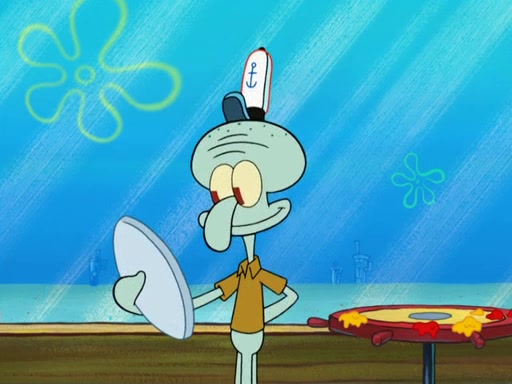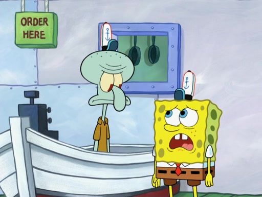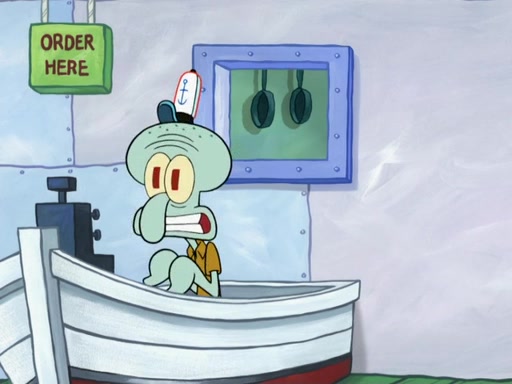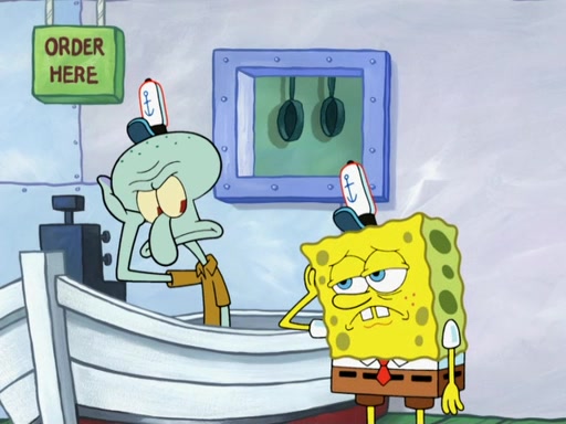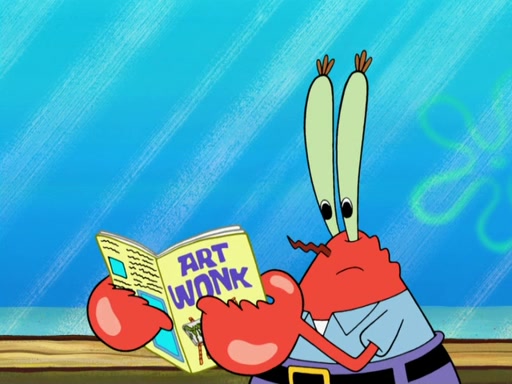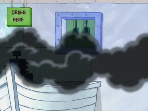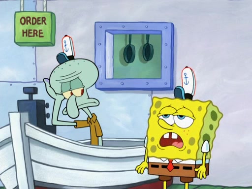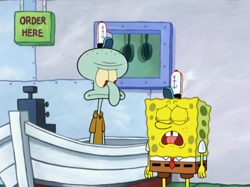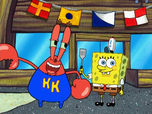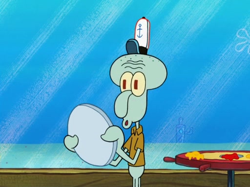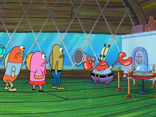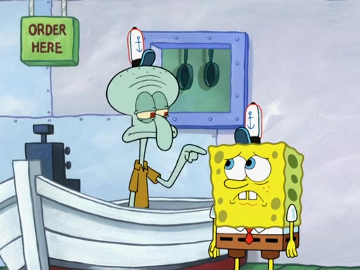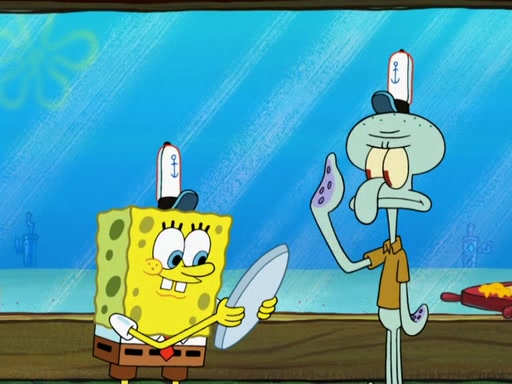 The scene opens up with Patrick, dressed in a business suit, asking where he can get something to eat. Squidward walks in, and tells him the answer is before him: the Krusty Krab. Mr. Krabs, dressed in a leotard, jumps out of the Krusty Krab, and SpongeBob slides down a rainbow to his side, and Squidward, who rides a dolphin while holding a plate with Krabby Patties, which Patrick eats. Suddenly, SpongeBob describes Patrick's actions, then the scene turns to him and Mr. Krabs in front of a storyboard planned for a commercial. Mr. Krabs asks why he is in a leotard, and he says it is because he is the mascot. Mr. Krabs does not like this, so he tears up the storyboard, telling him he needs a "masterpiece". Sad, SpongeBob walks to Squidward's counter, sighing. When Squidward ignores him, he sighs repeatedly, each sigh more drawn-out than the one before, until Squidward gets so annoyed that he asks what is troubling him. He tells him about his problems, but Squidward does not care. As he walks into the dining area, Squidward notices a patron squirting ketchup onto a pile of Krabby Patties.