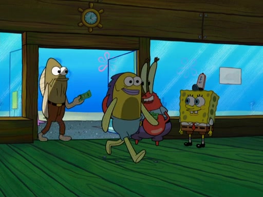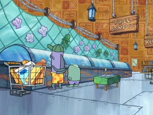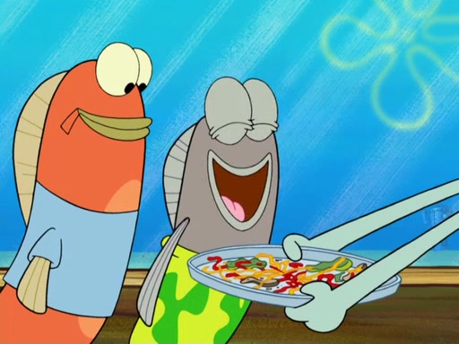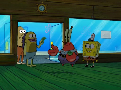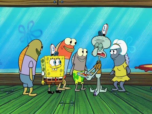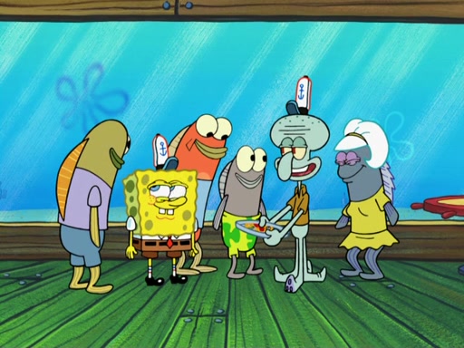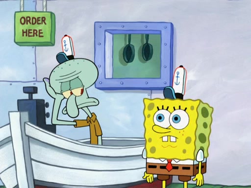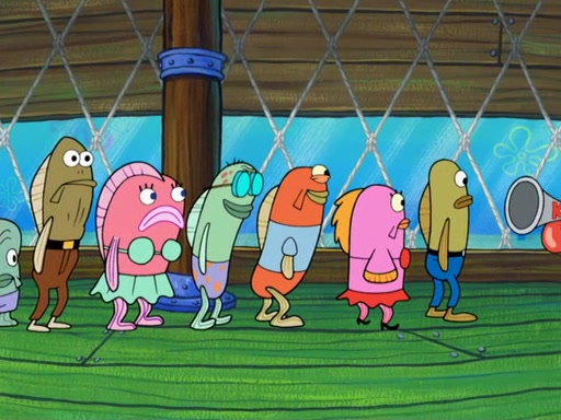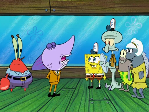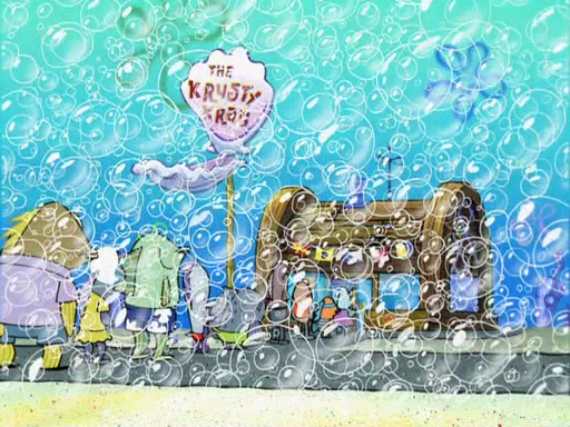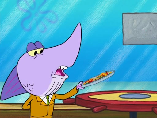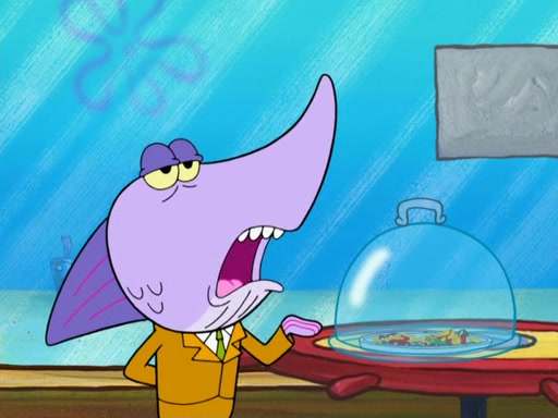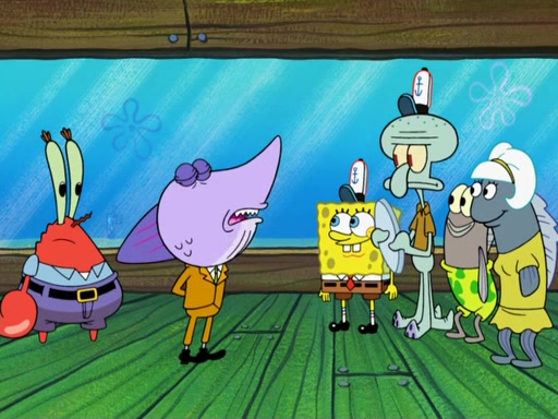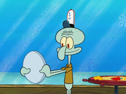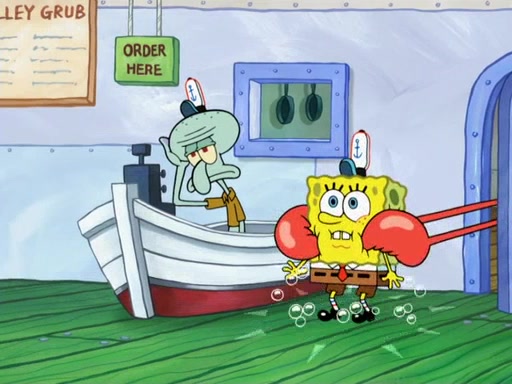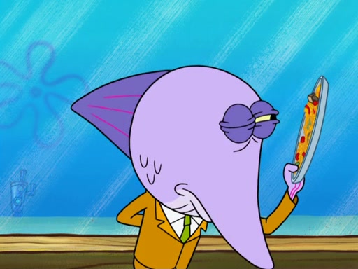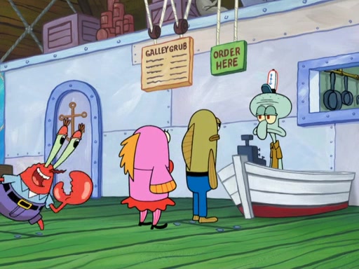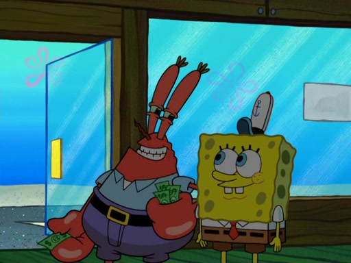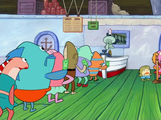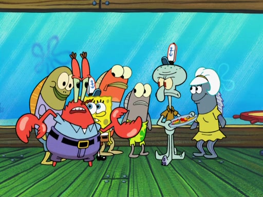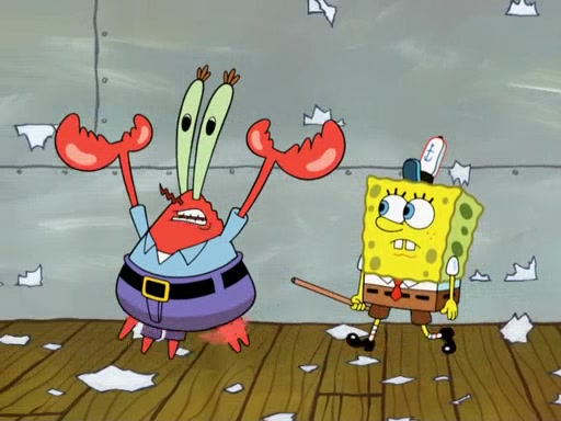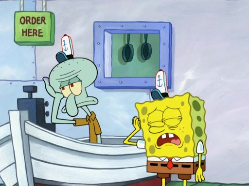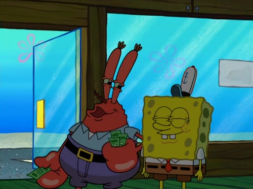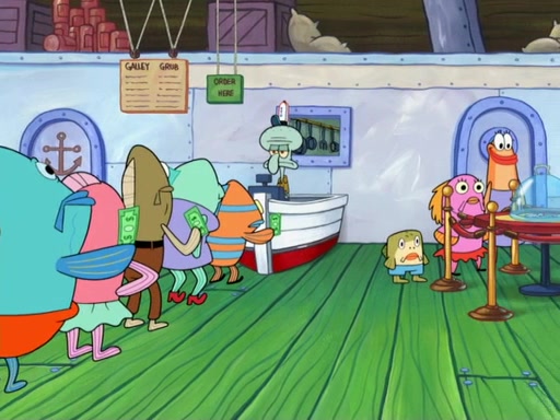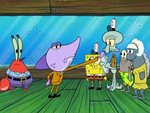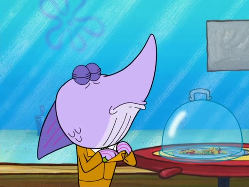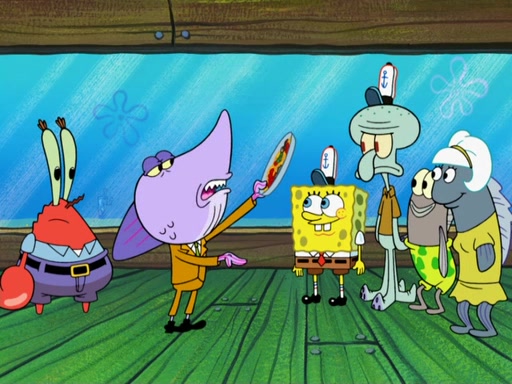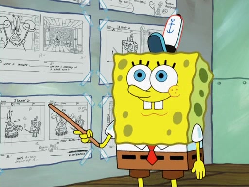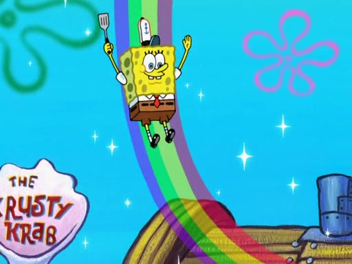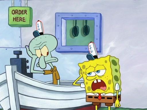 The scene opens up with Patrick, dressed in a business suit, asking where he can get something to eat. Squidward walks in, and tells him the answer is before him: the Krusty Krab. Mr. Krabs, dressed in a leotard, jumps out of the Krusty Krab, and SpongeBob slides down a rainbow to his side, and Squidward, who rides a dolphin while holding a plate with Krabby Patties, which Patrick eats. Suddenly, SpongeBob describes Patrick's actions, then the scene turns to him and Mr. Krabs in front of a storyboard planned for a commercial. Mr. Krabs asks why he is in a leotard, and he says it is because he is the mascot. Mr. Krabs does not like this, so he tears up the storyboard, telling him he needs a "masterpiece". Sad, SpongeBob walks to Squidward's counter, sighing. When Squidward ignores him, he sighs repeatedly, each sigh more drawn-out than the one before, until Squidward gets so annoyed that he asks what is troubling him. He tells him about his problems, but Squidward does not care. As he walks into the dining area, Squidward notices a patron squirting ketchup onto a pile of Krabby Patties.