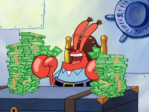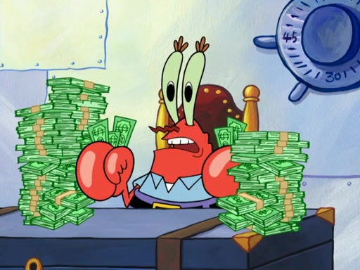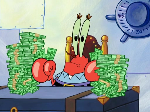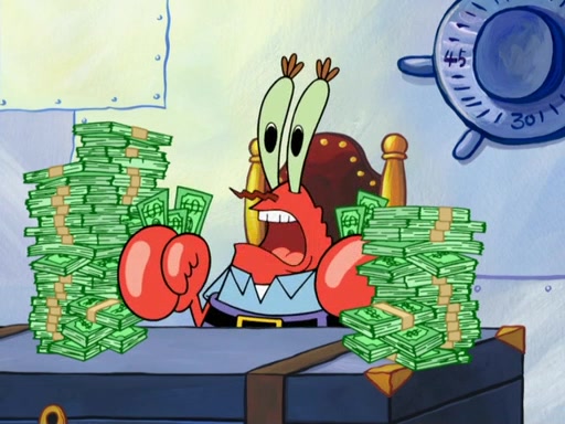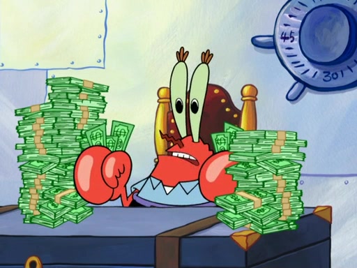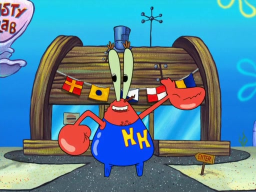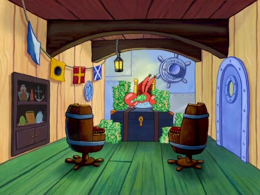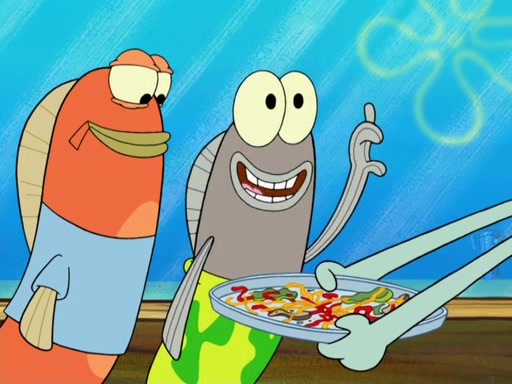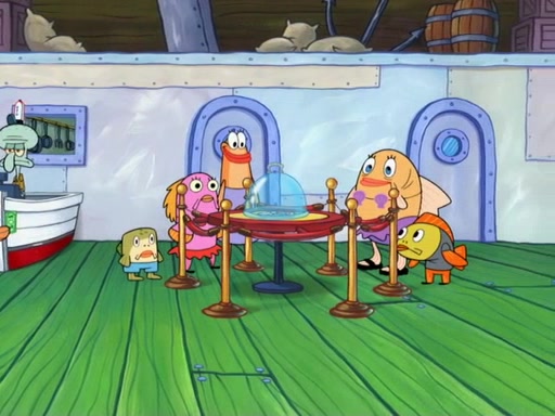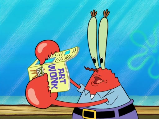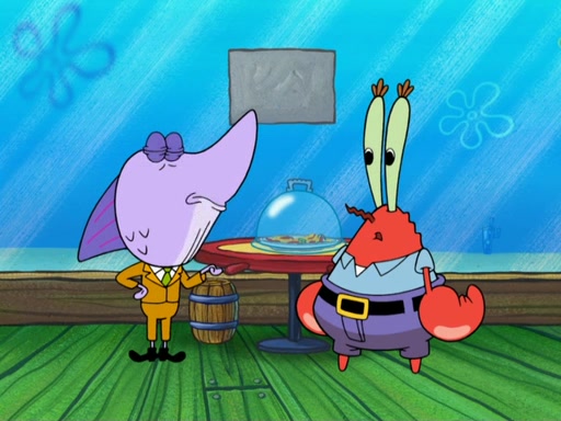 The patron slaps the Krabby Patties off the plate. He asks Squidward for mustard, which he squirts onto a plate. When the patron leaves, Squidward looks at the plate and recognizes it as the art style of Fiasco. Mr. Krabs is about to throw it away when Squidward tells him it is actually a masterpiece. He exclaims: ' This is an authentic Fiasco!', and people run over to him, offering to buy it, but Mr. Krabs, seeing an opportunity to make money, tries to take the artwork from Squidward, and they argue over who really owns it. Just then, Farfel Bainbridge, an art evaluator, comes in and declares the work to be authentic, and thereby a national treasure, thus meaning neither Mr. Krabs nor Squidward own it. Mr. Krabs will allow people to view it in his restaurant free, provided they buy Krabby Patties (2 each).
