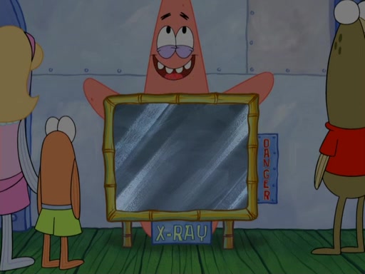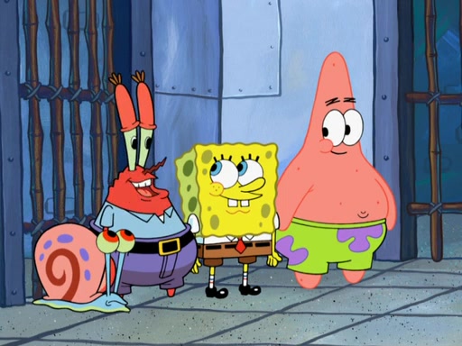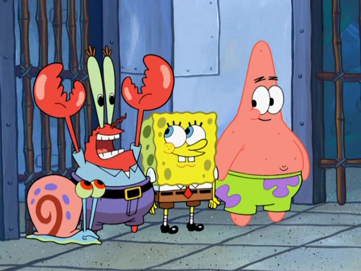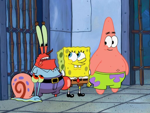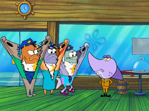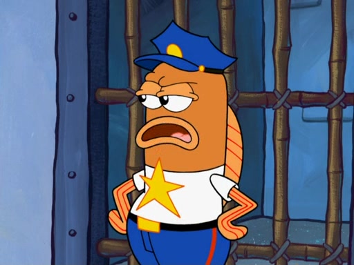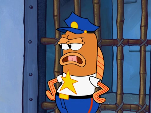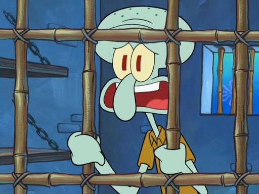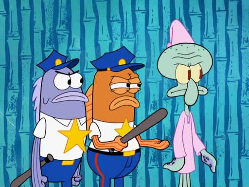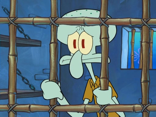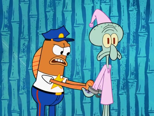SpongeBob asks what it is that Patrick ate, and Patrick reveals it was the artwork, which he mistook for hors d'oeuvres. Plankton declares him an accomplice as well. Suddenly, Squidward bursts in with the police, then lied to them about all of the noise. When they see Plankton, they immediately arrest him, along with Squidward (for lying to them) & everyone until they can figure this whole situation out. At the police station, Plankton is locked away. Gary, Patrick, and SpongeBob are free since Mr. Krabs explains they were not involved with the theft. However, since the artwork is now in Patrick's stomach, Mr. Krabs has him stand behind an X-Ray machine, which shows the artwork inside him. Fiasco is moved by Patrick's style, stating 'I will never paint again!'. The scene changes to show Squidward, behind bars, asking about his phone call.